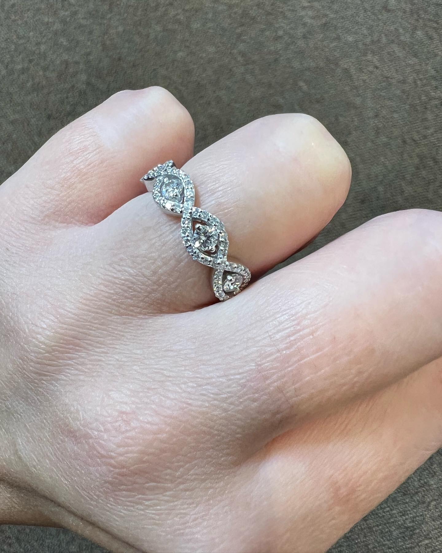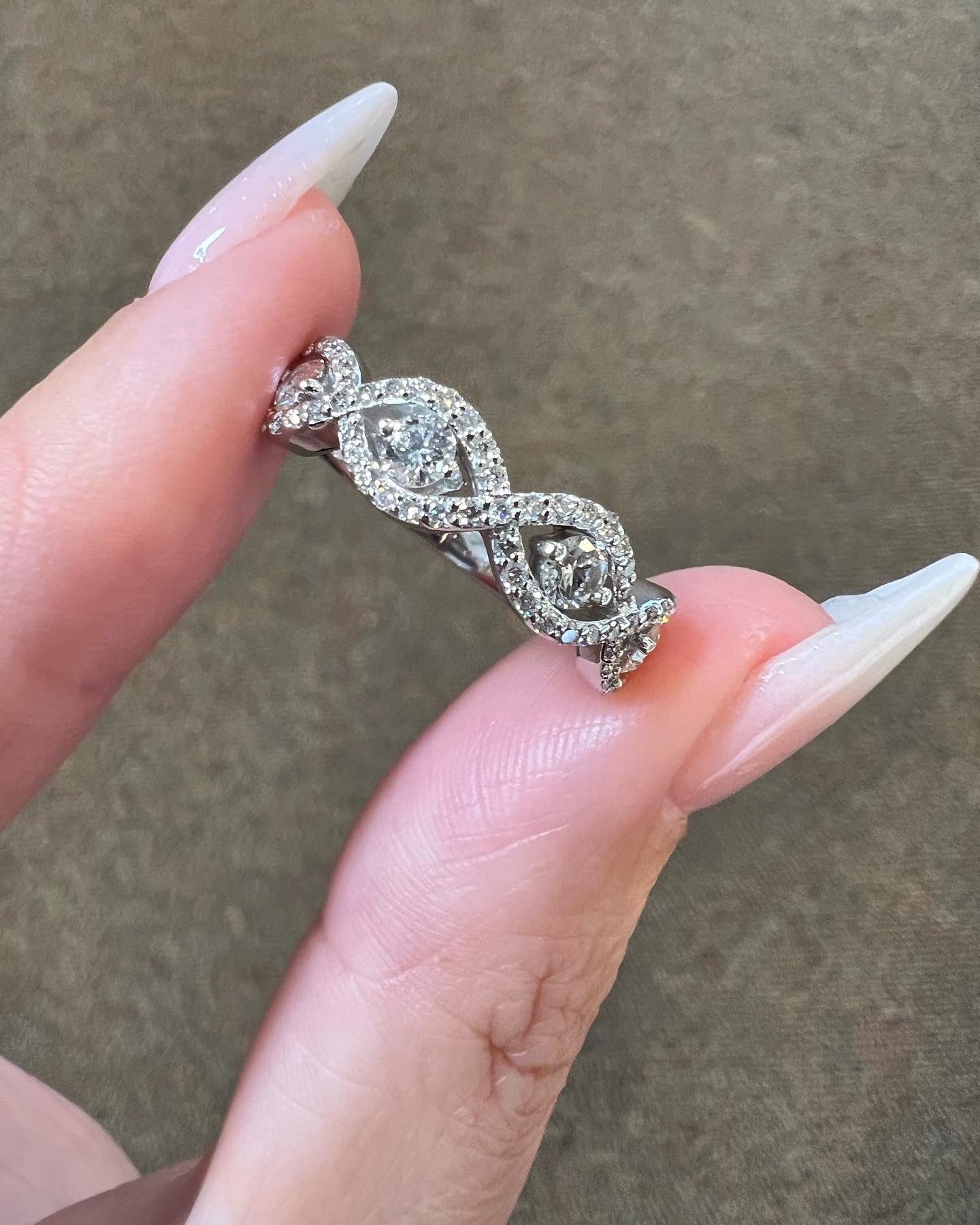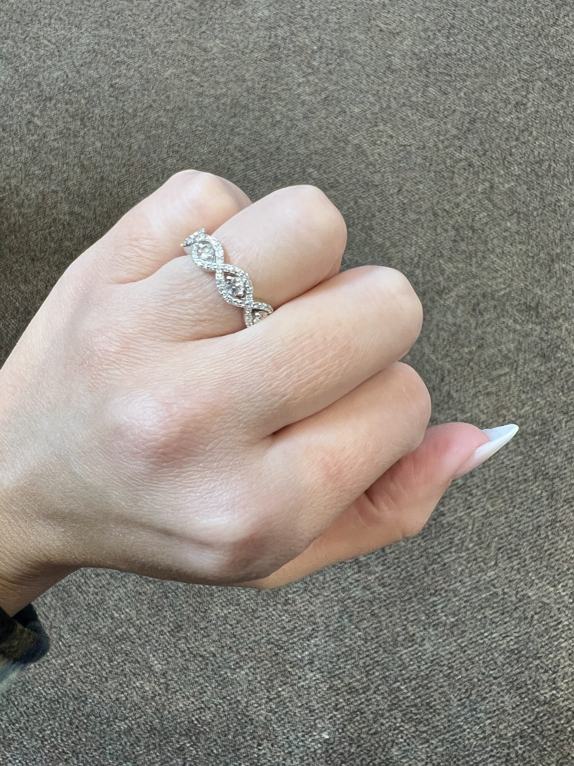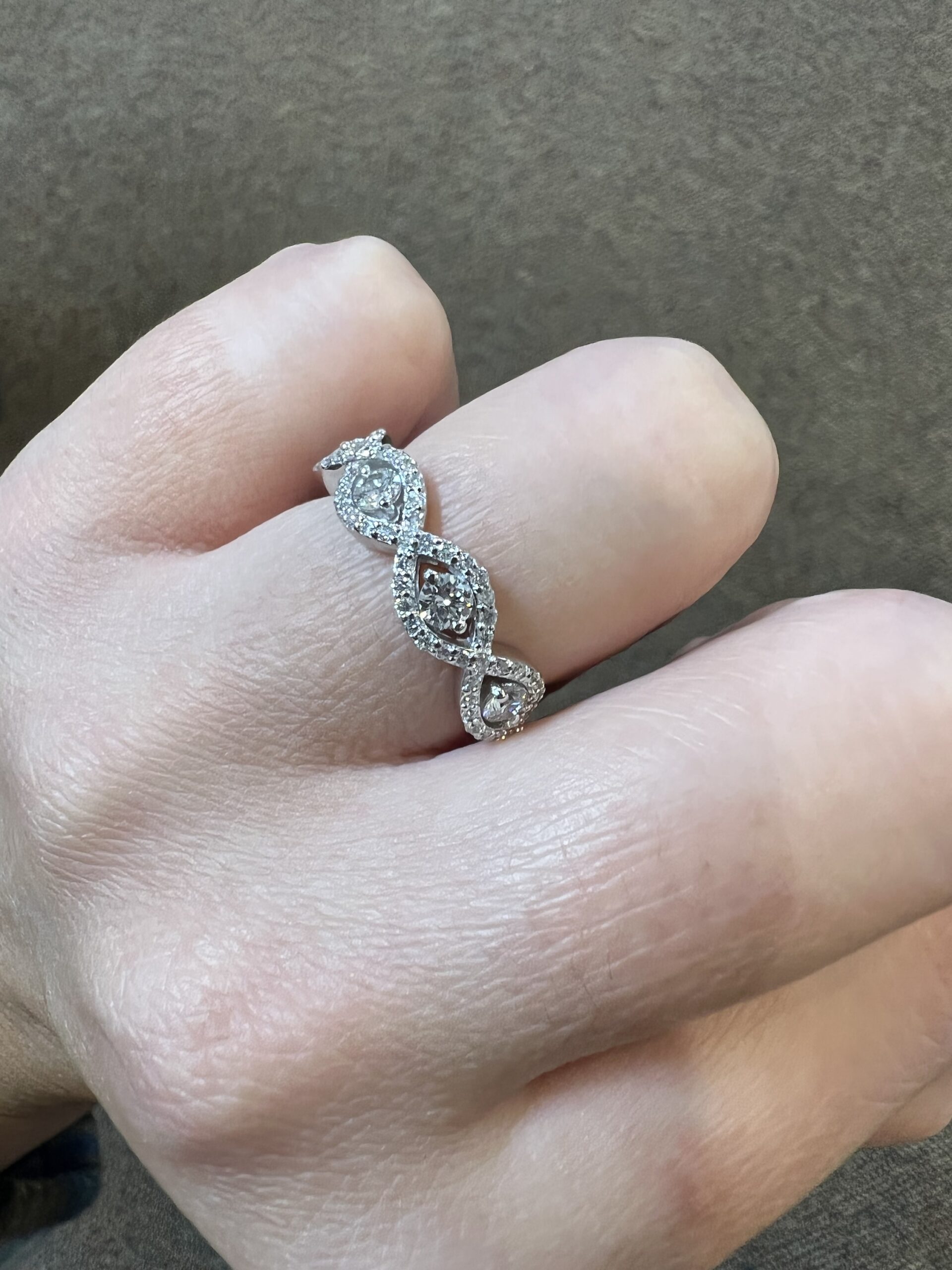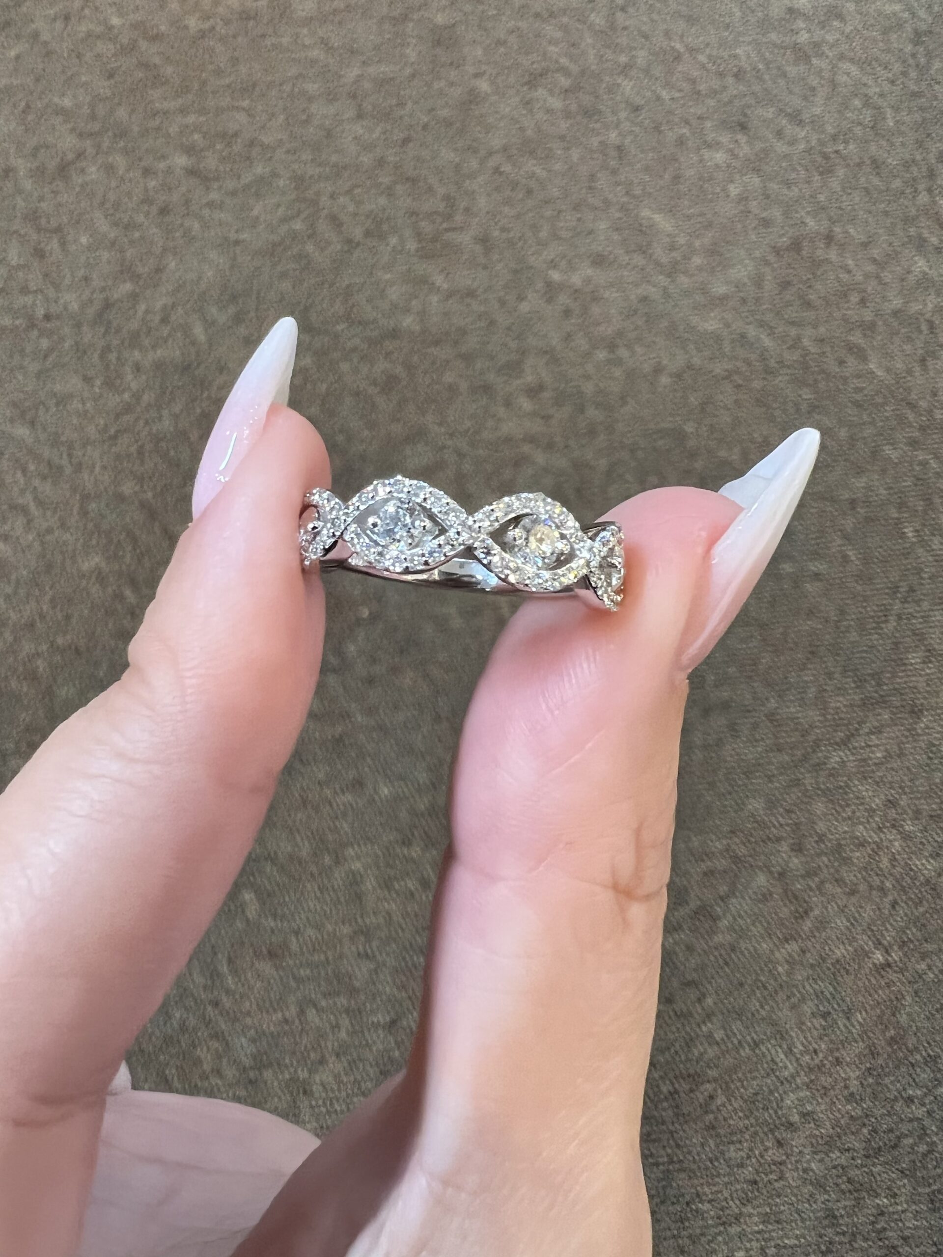 14k white gold genuine 63 stone genuine .74 cttw Round Brilliant Cut diamond swirl band. These diamonds average G-H in color and SI1 in clarity. These diamonds are nicely proportioned and well finished. This ring is a finger size 6 3/4, but it can be reasonably sized. Please make note of the size preference in the comments section at checkout.