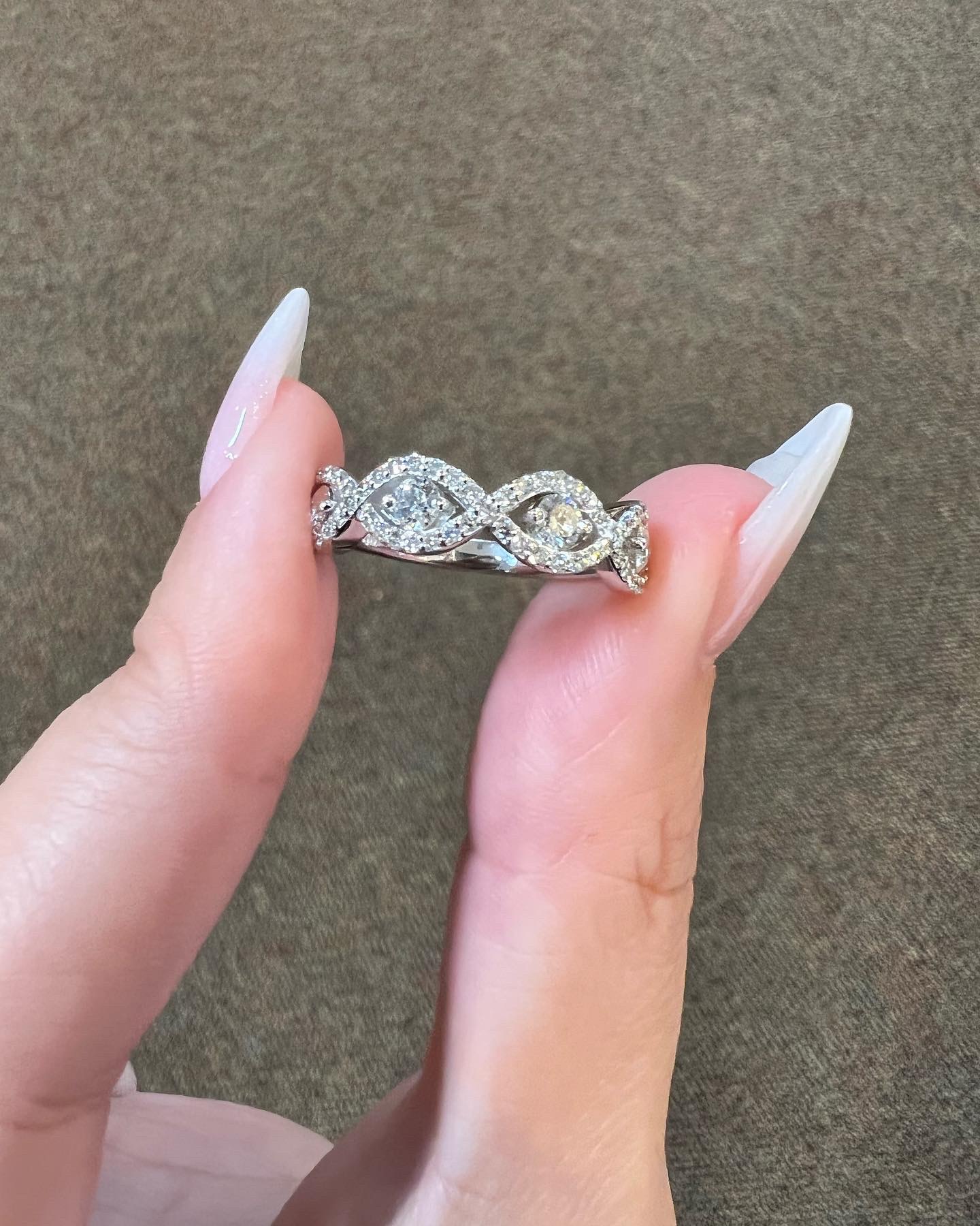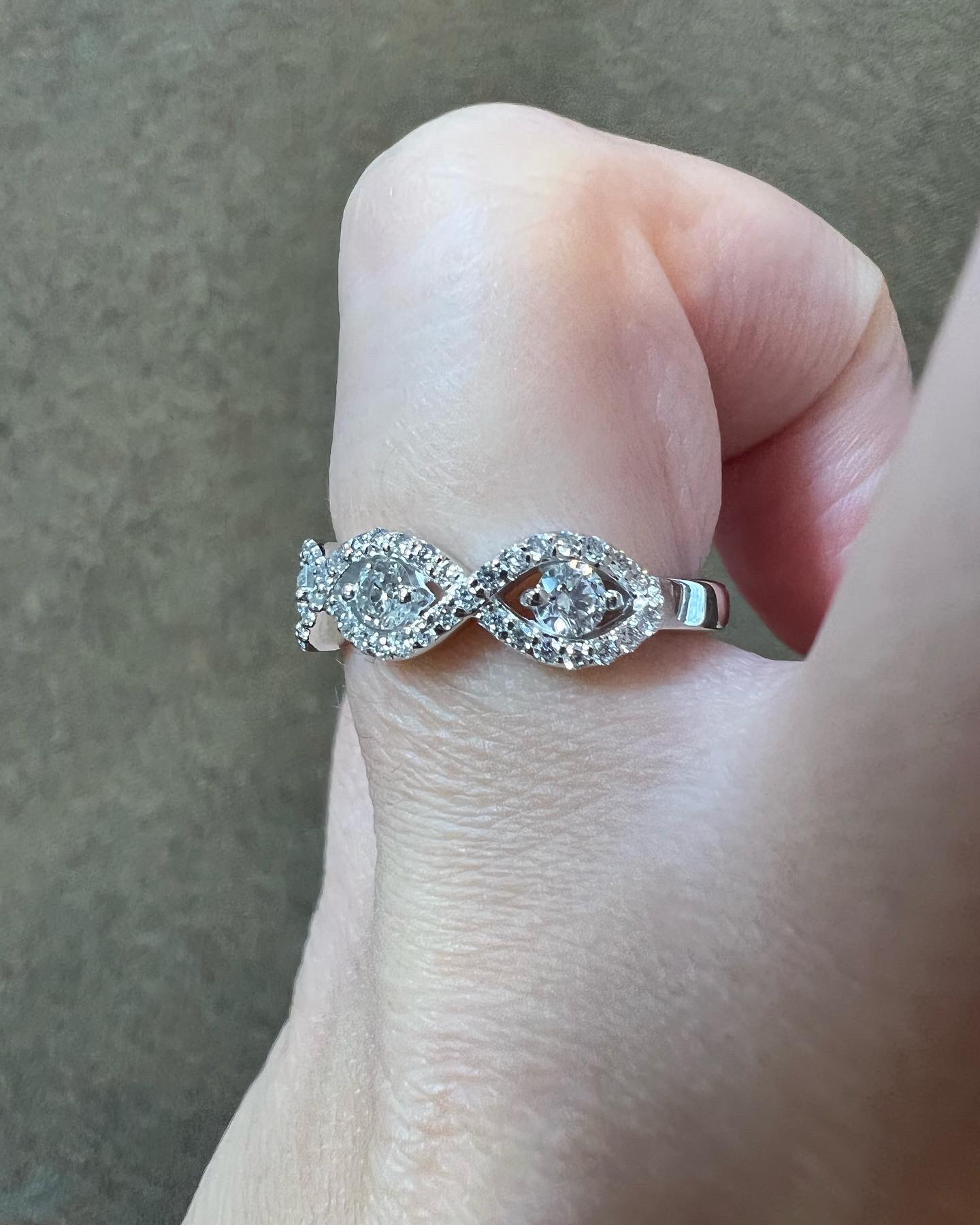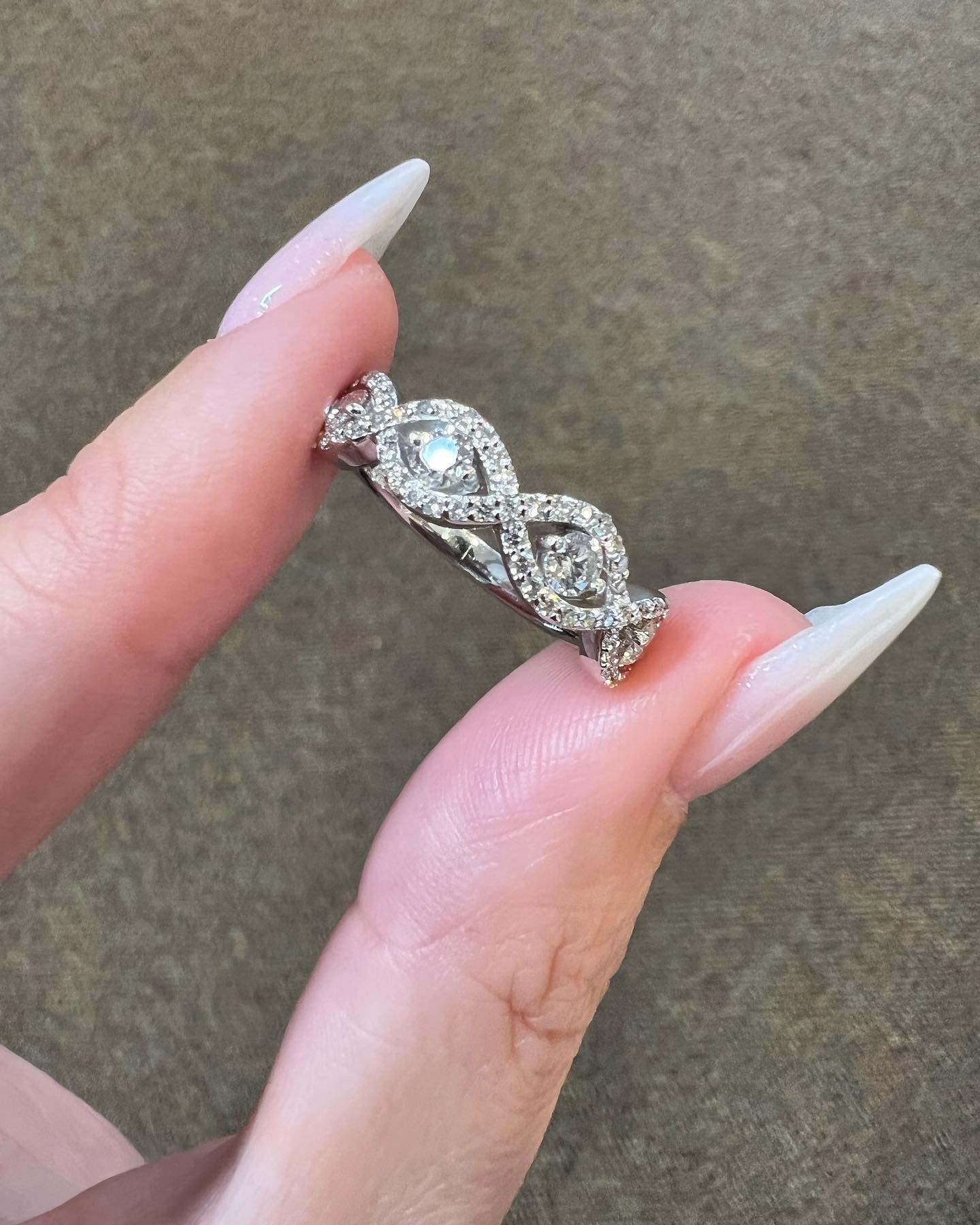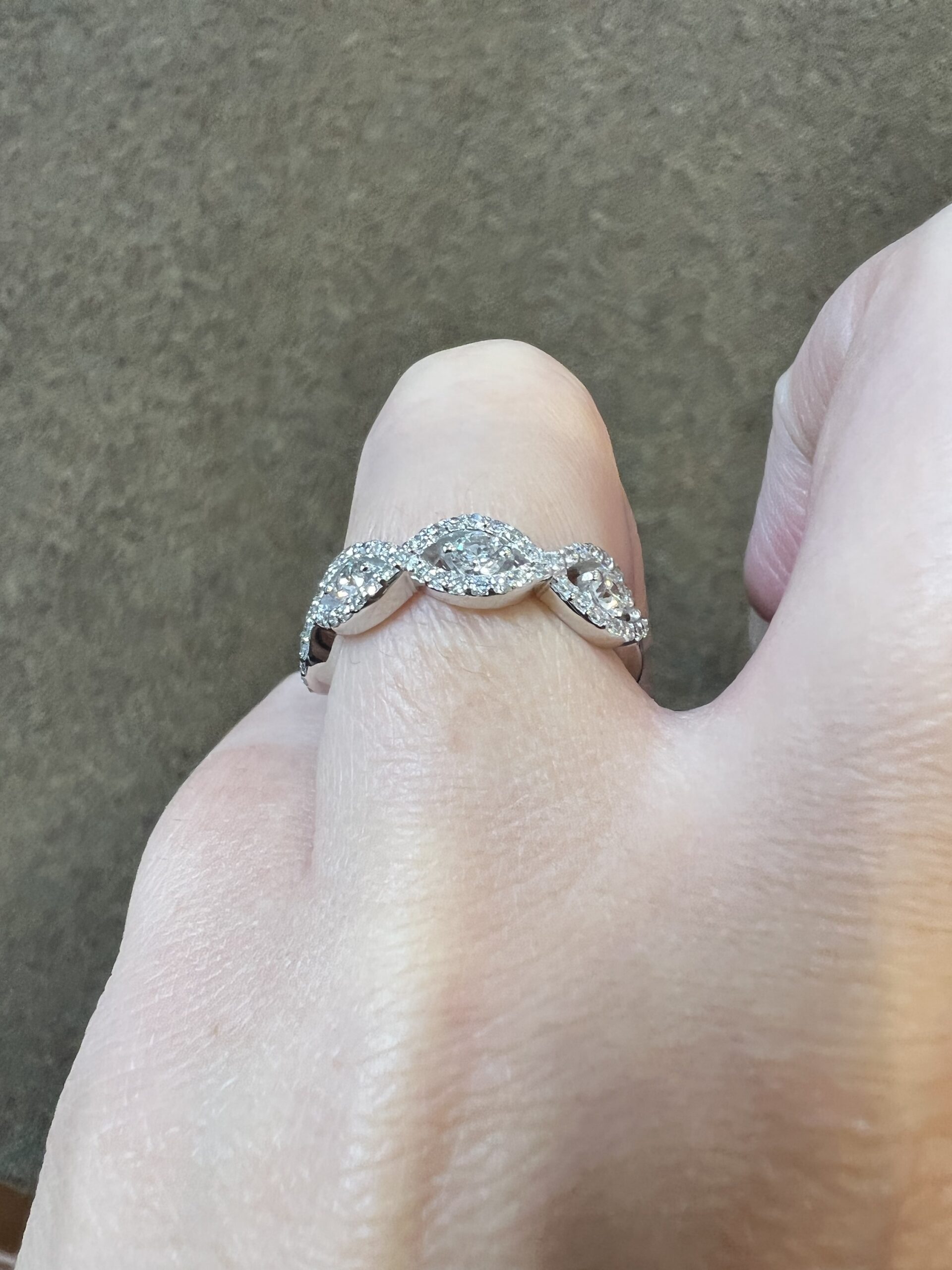 14k white gold genuine 63 stone genuine .74 cttw Round Brilliant Cut diamond swirl band. These diamonds average G-H in color and SI1 in clarity. These diamonds are nicely proportioned and well finished. This ring is a finger size 6 3/4, but it can be reasonably sized. Please make note of the size preference in the comments section at checkout.