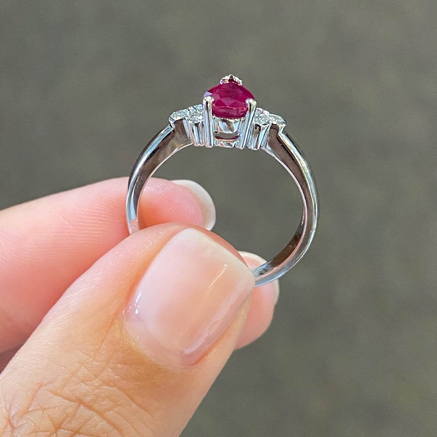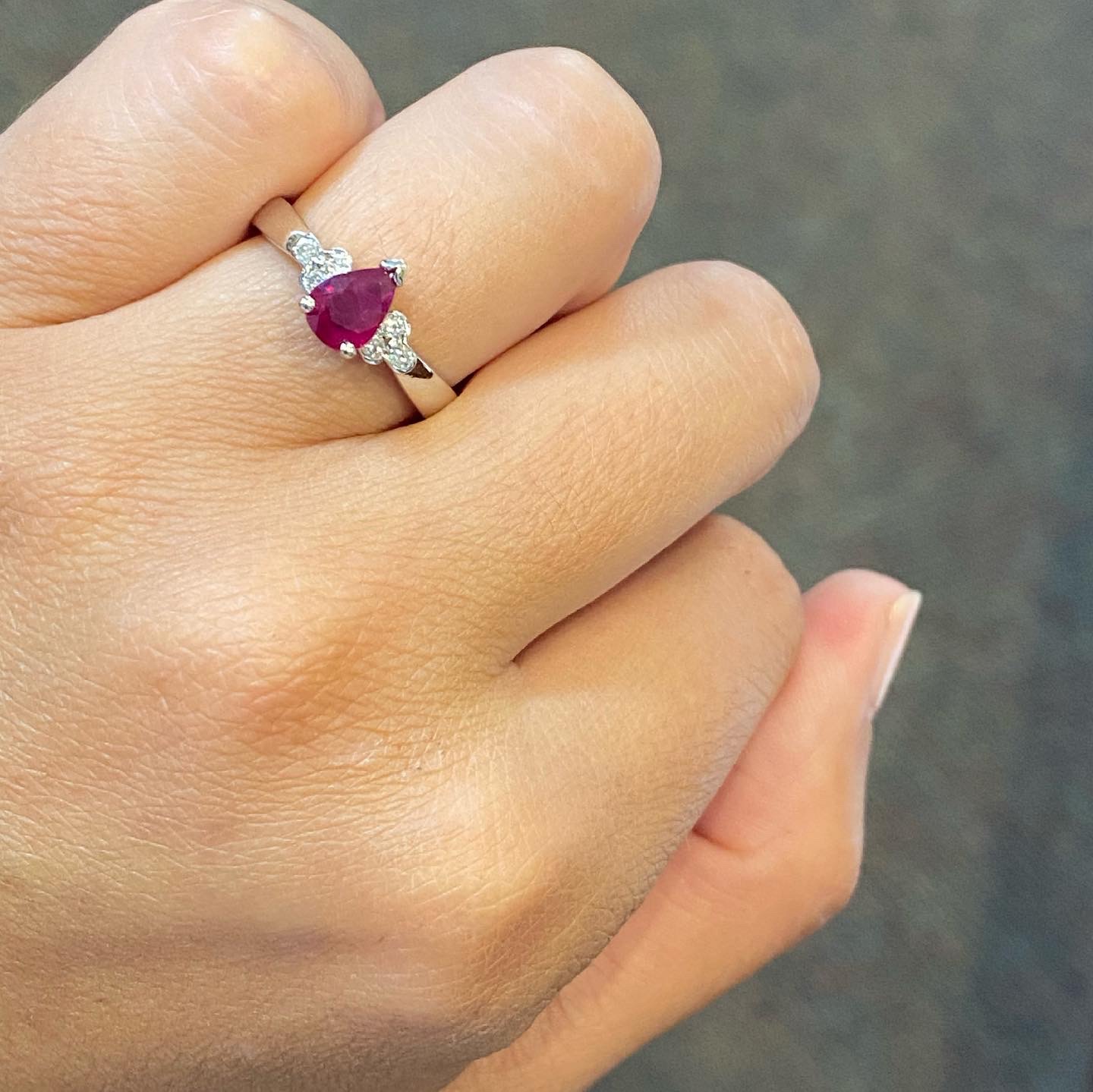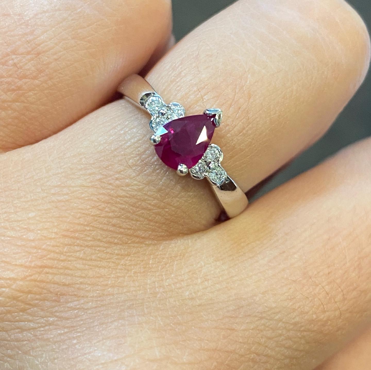 14k white gold genuine .82 carat pear shaped Ruby & 6 stone, bezel set .12 cttw genuine Round Brilliant Cut diamond ring. This ring has an entire weight of 3.4 grams. This ring is a finger size 7, but it can be reasonably sized at no additional charge. If you require a specific size please make note in the comments section at checkout.