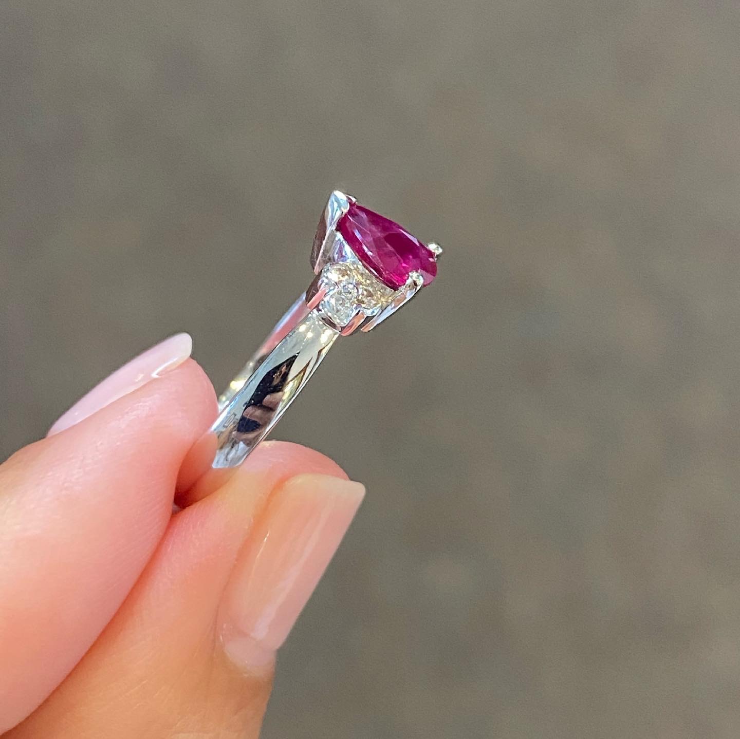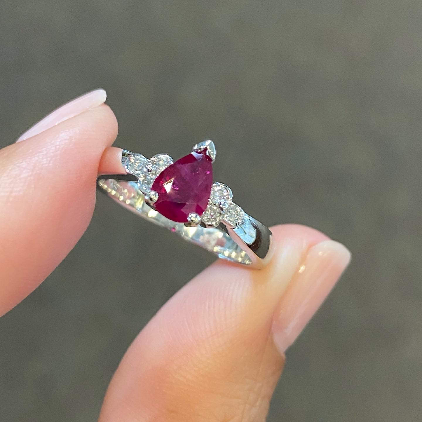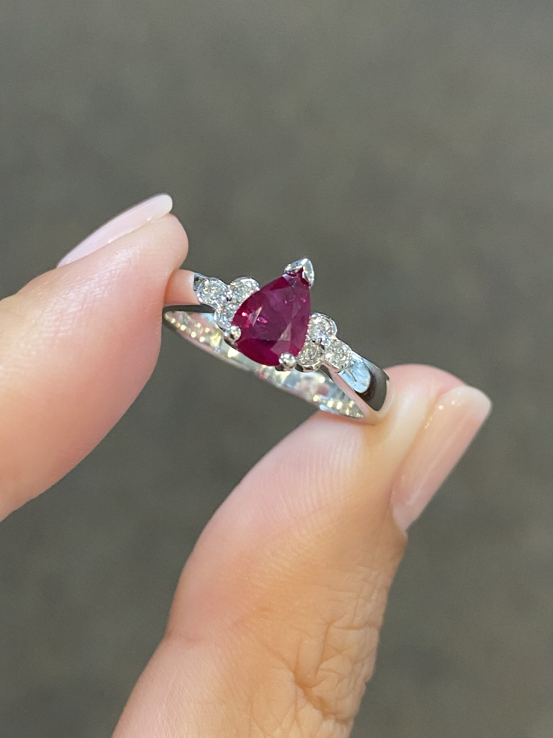 14k white gold genuine .82 carat pear shaped Ruby & 6 stone, bezel set .12 cttw genuine Round Brilliant Cut diamond ring. This ring has an entire weight of 3.4 grams. This ring is a finger size 7, but it can be reasonably sized at no additional charge. If you require a specific size please make note in the comments section at checkout.