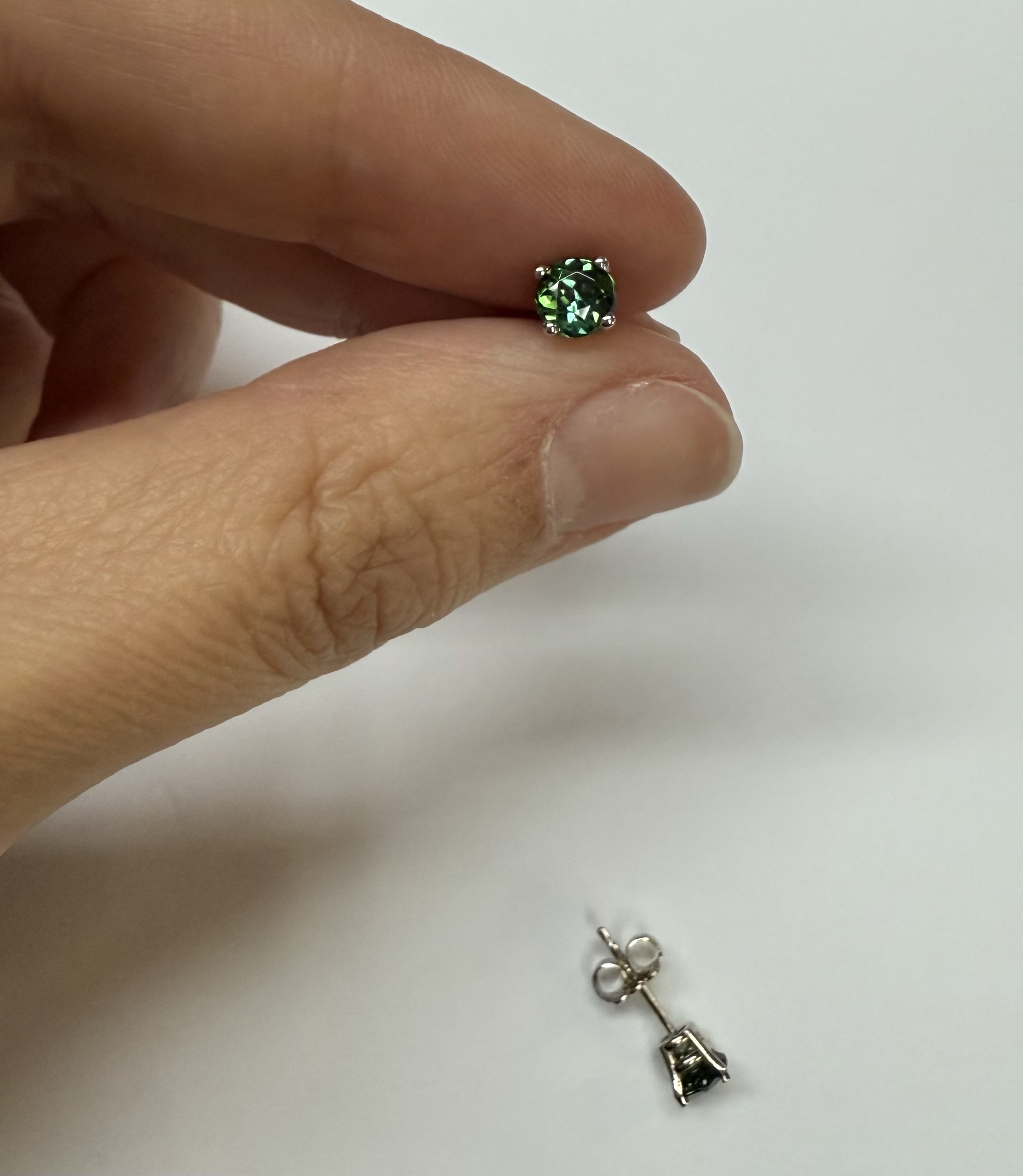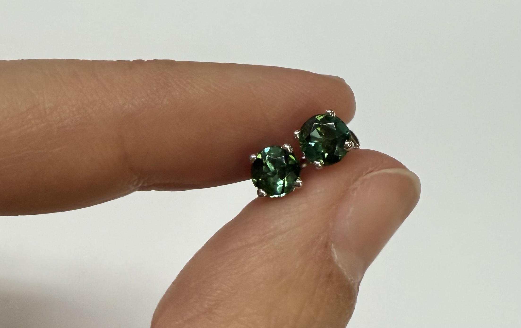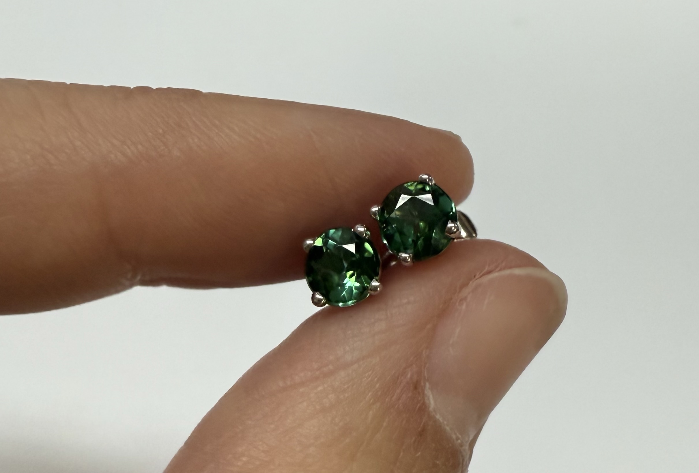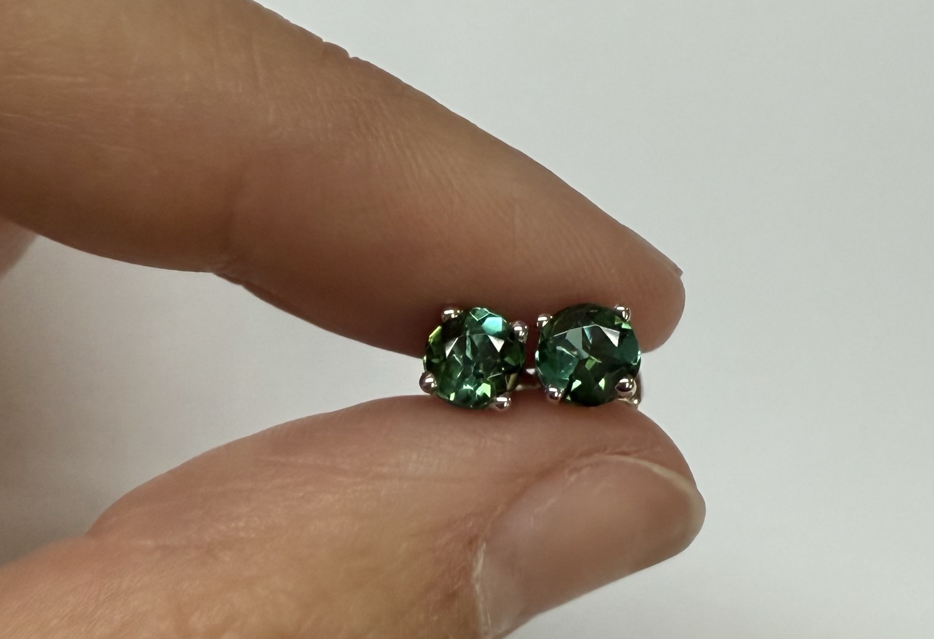 14k white gold genuine round, faceted .87 cttw Green Tourmaline basket set stud earrings. These earrings have an entire weight of 1.0 grams.