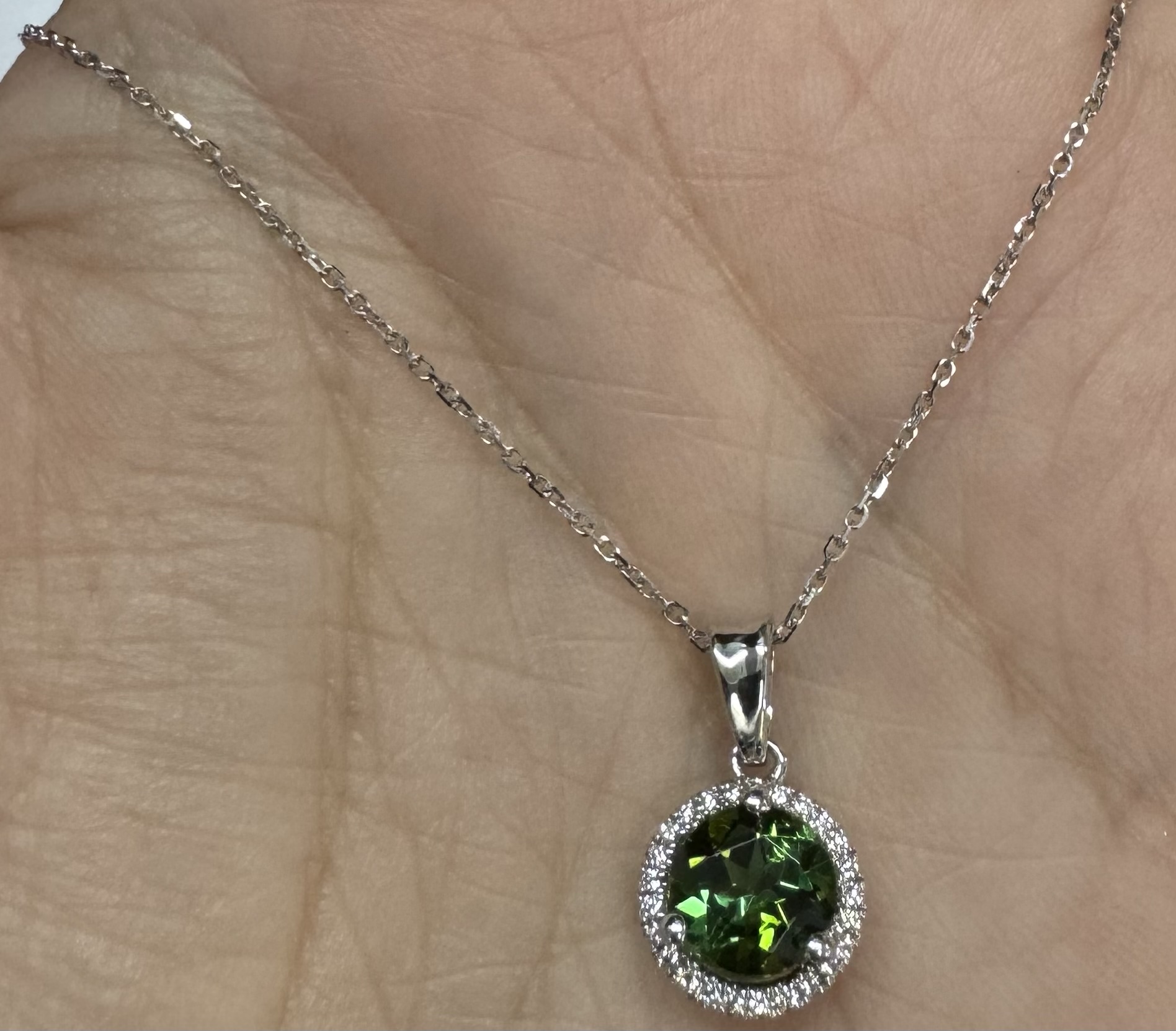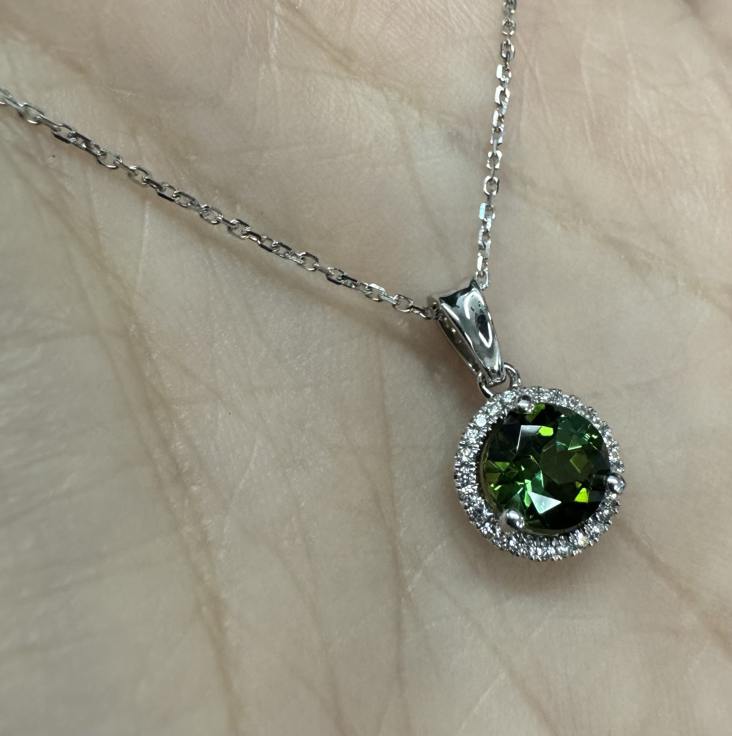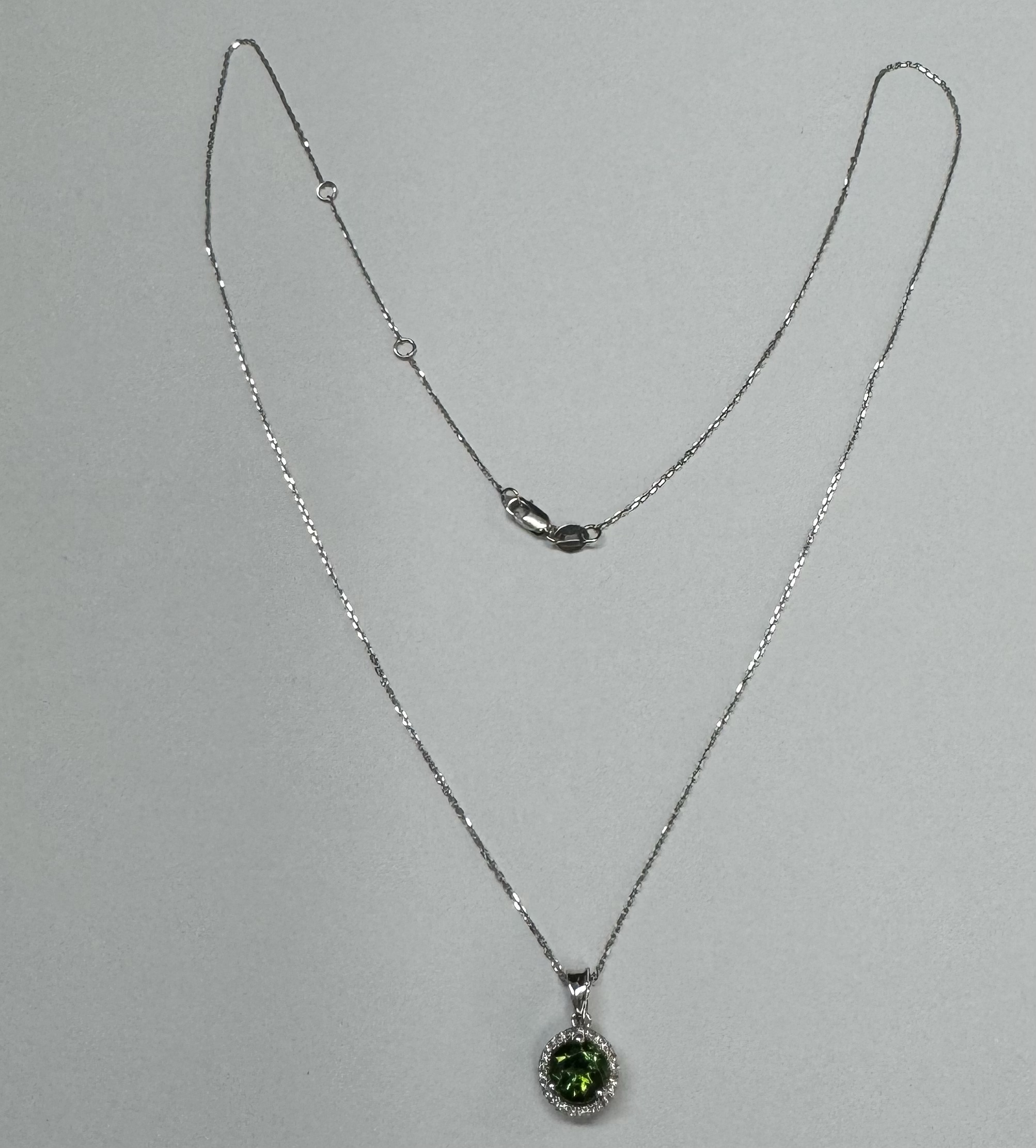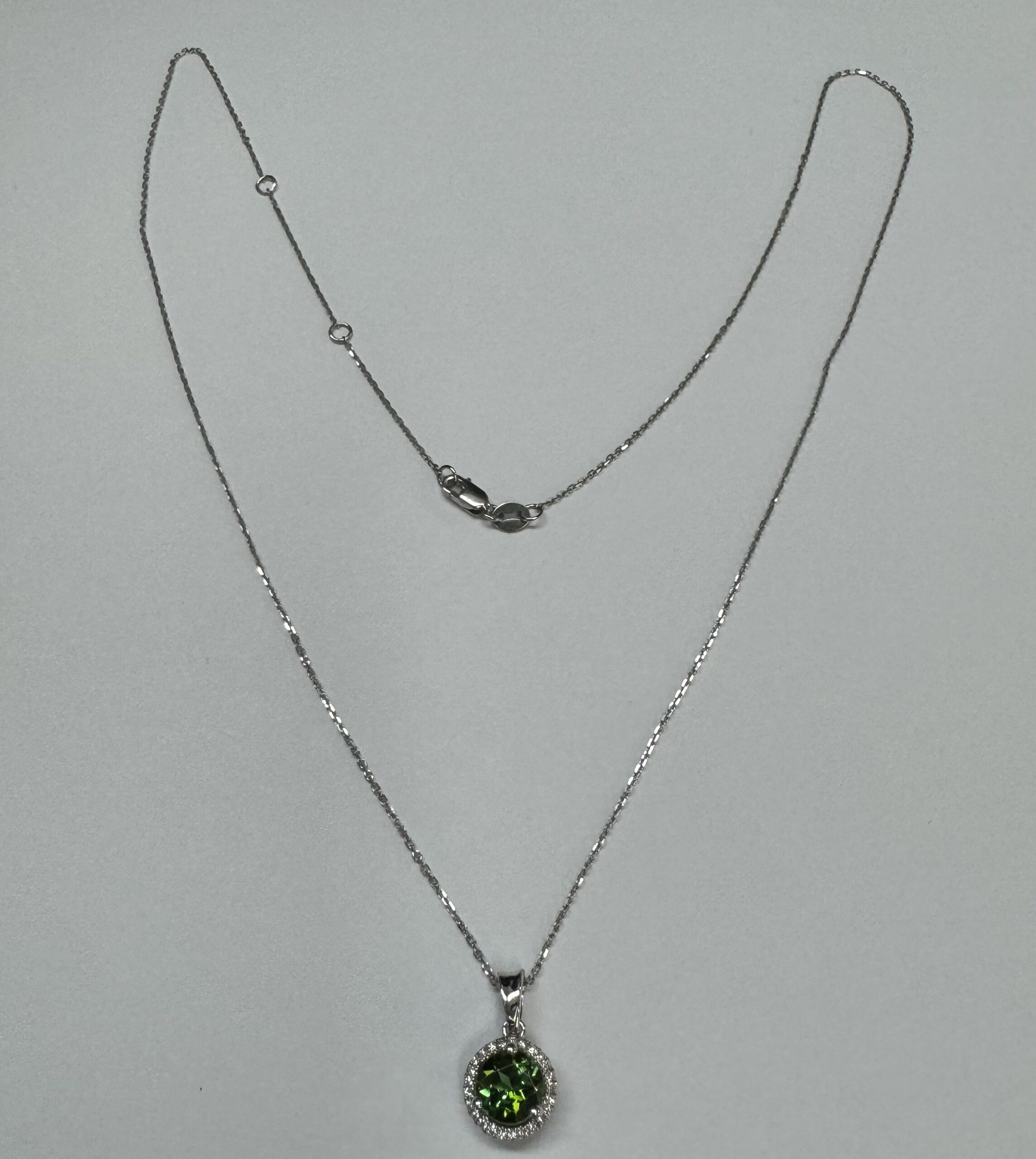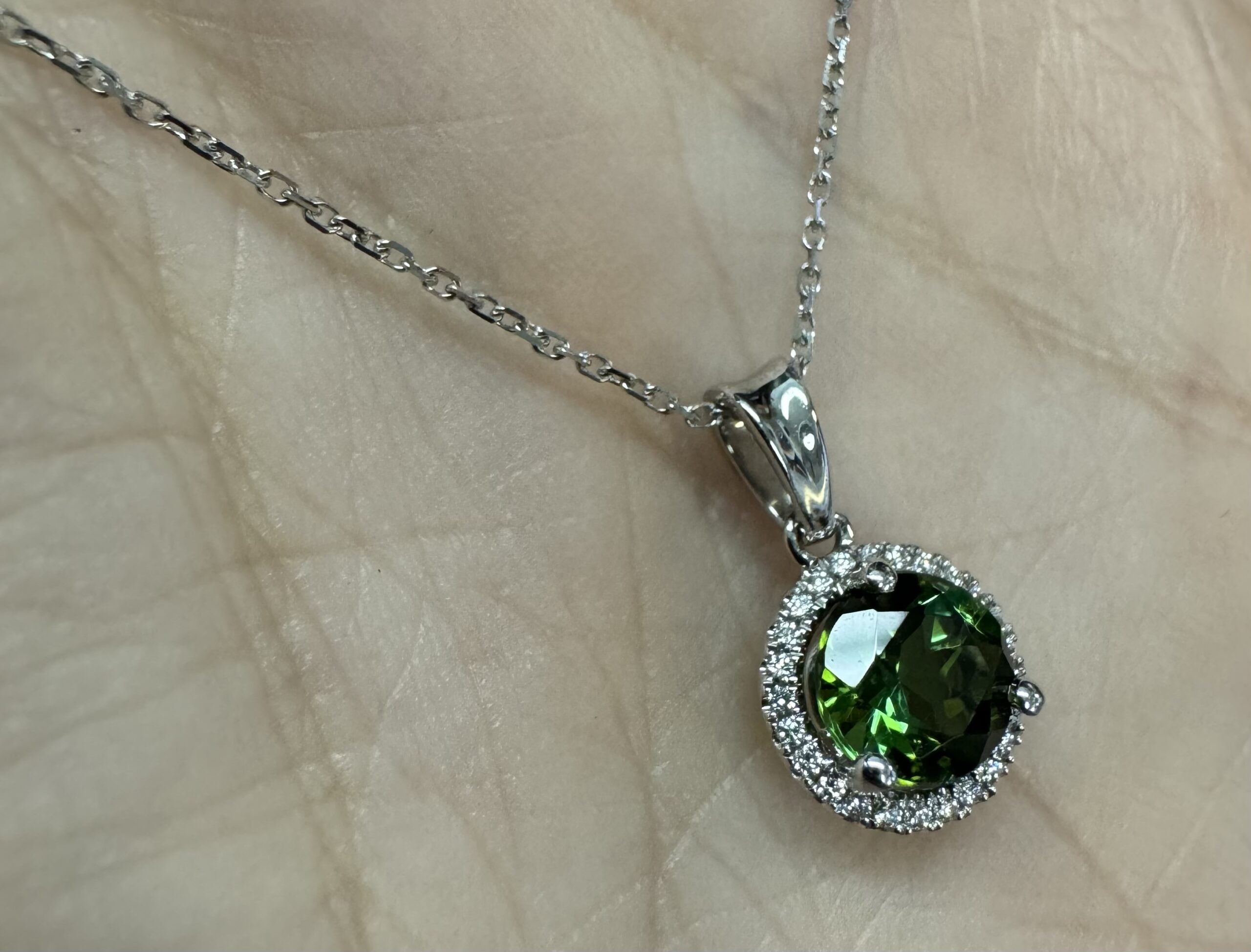14k white gold genuine round, faceted .90 cttw Green Tourmaline and genuine .06/100-ct. Round Brilliant Cut diamond halo pendant. These diamonds average G-H in color and SI1 in clarity. These gemstones are nicely proportioned and well finished. This pendant is suspended from a 14k white gold forzantina chain which is adjustable 16-17-18″, and terminated by a lobster claw clasp. This pendant has an entire weight of 2.1 grams.
