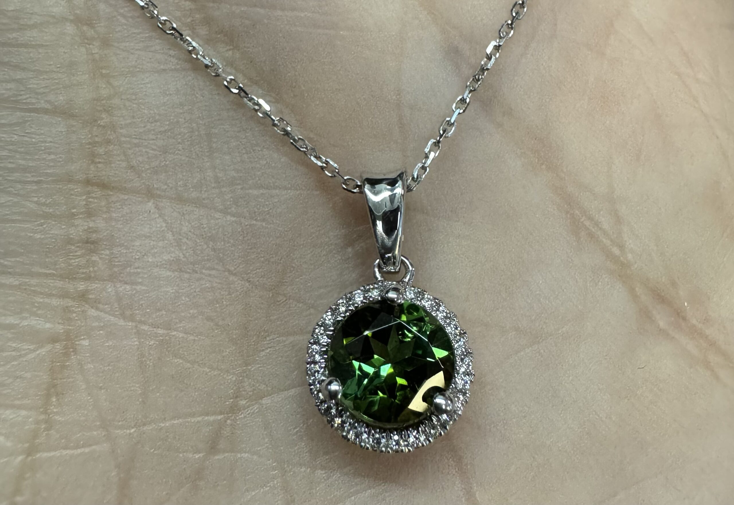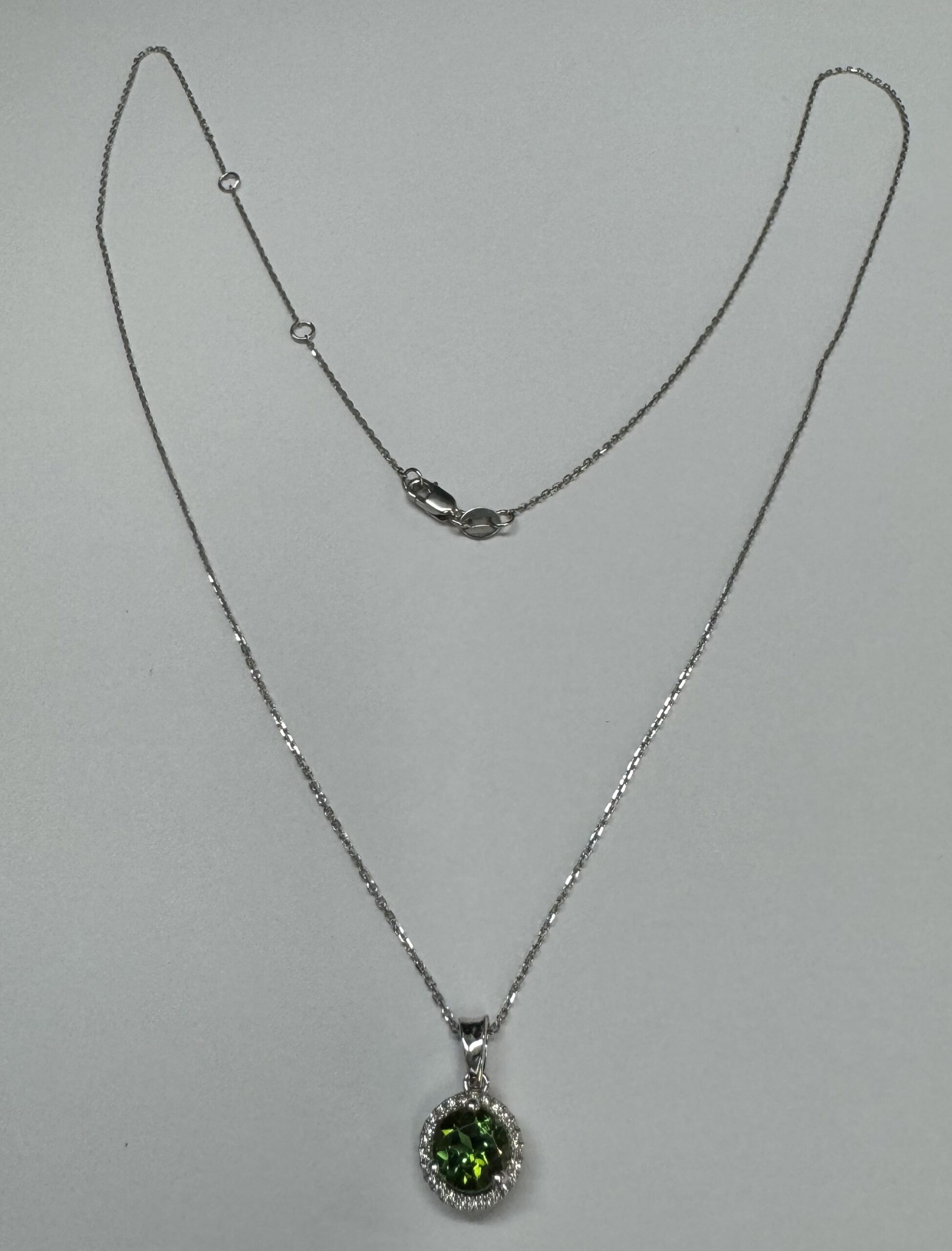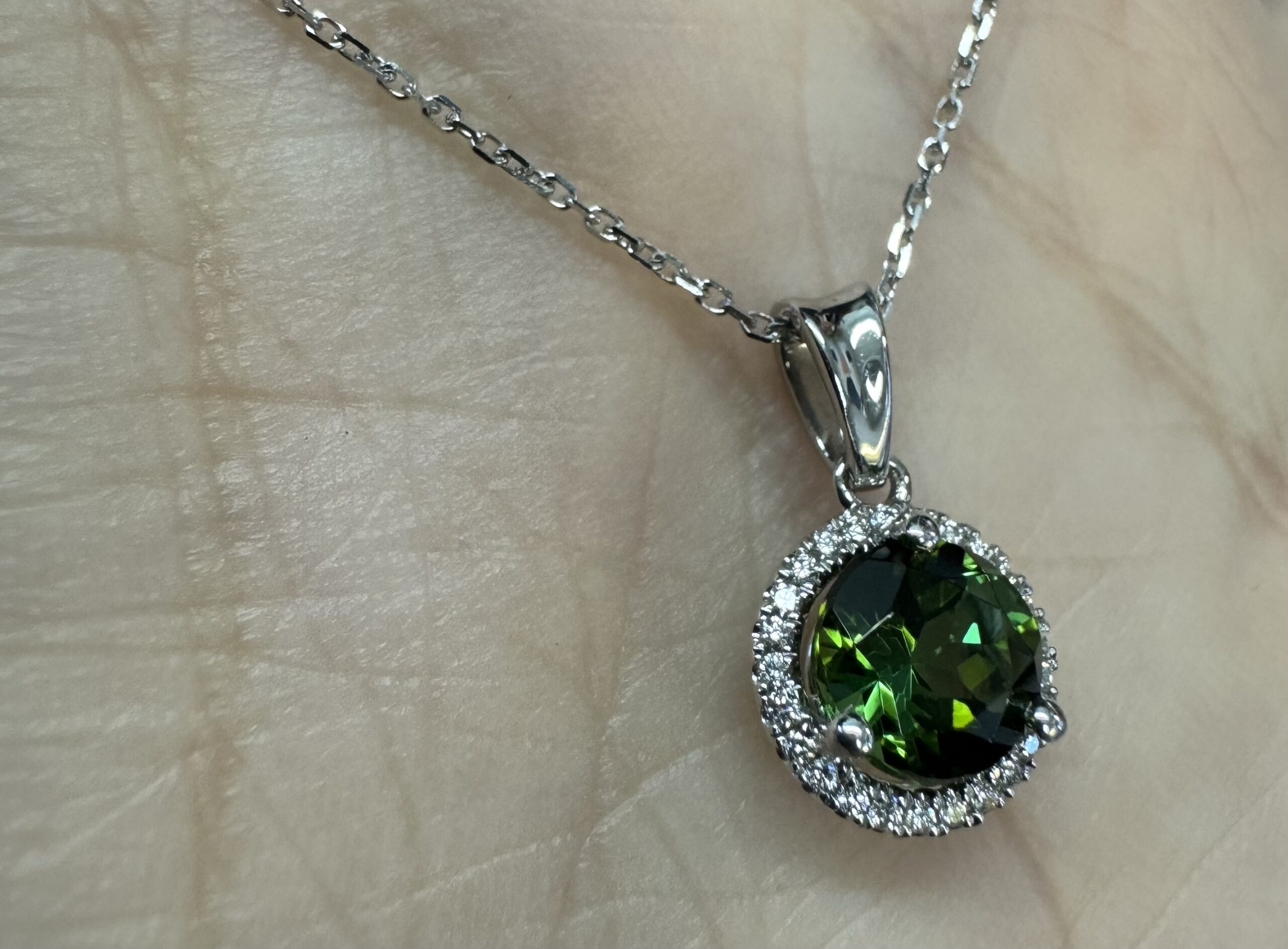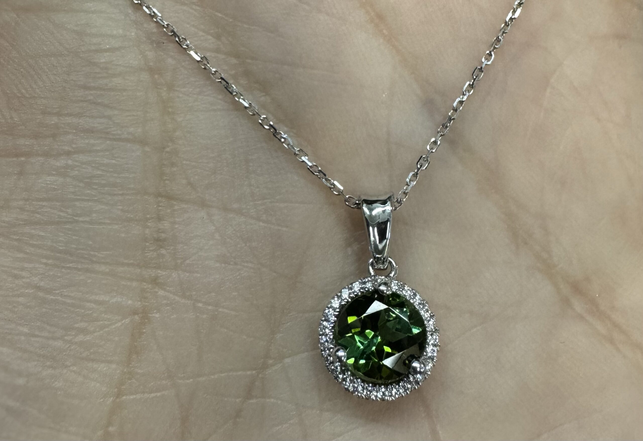 14k white gold genuine round, faceted .90 cttw Green Tourmaline and genuine .06/100-ct. Round Brilliant Cut diamond halo pendant. These diamonds average G-H in color and SI1 in clarity. These gemstones are nicely proportioned and well finished. This pendant is suspended from a 14k white gold forzantina chain which is adjustable 16-17-18″, and terminated by a lobster claw clasp. This pendant has an entire weight of 2.1 grams.