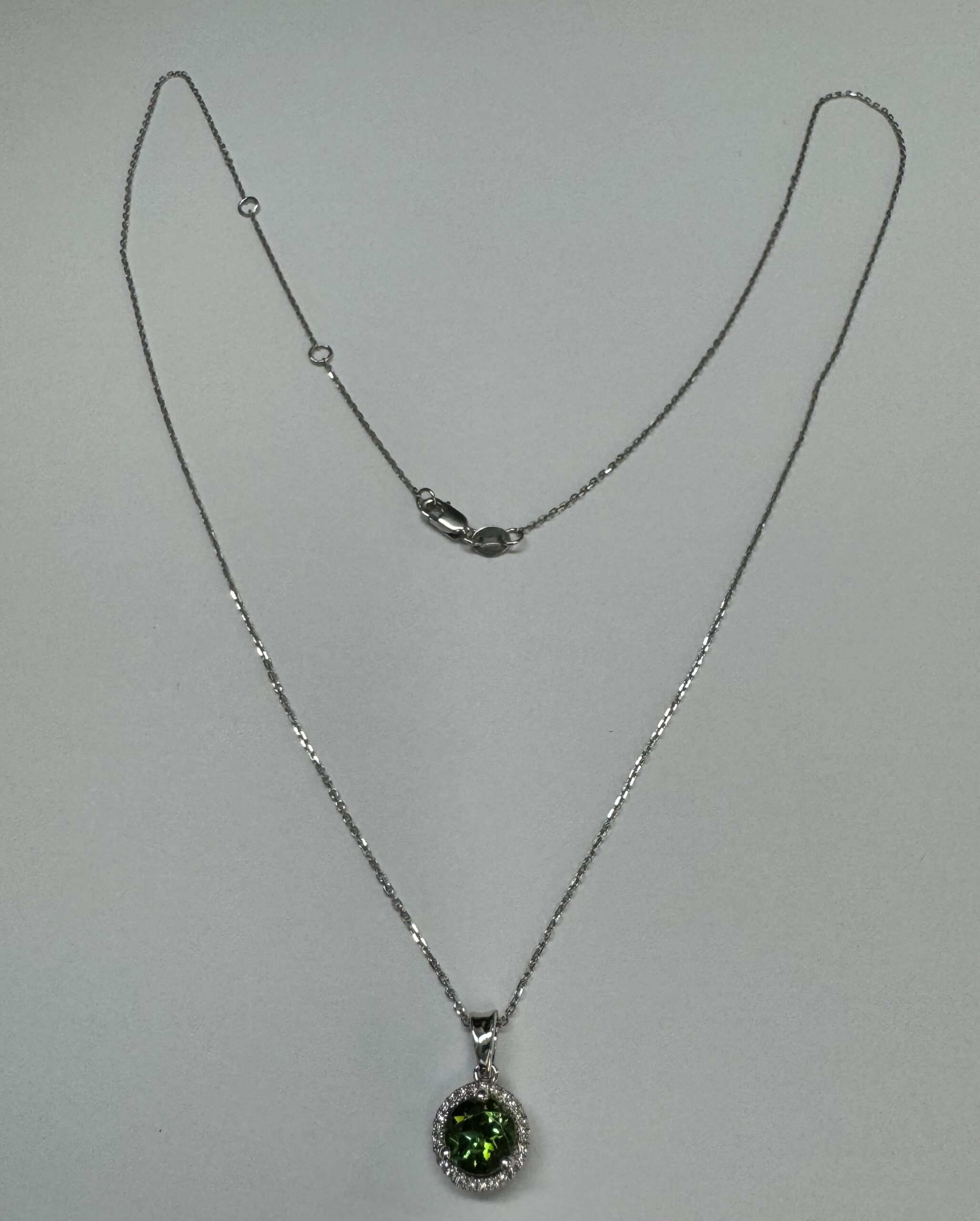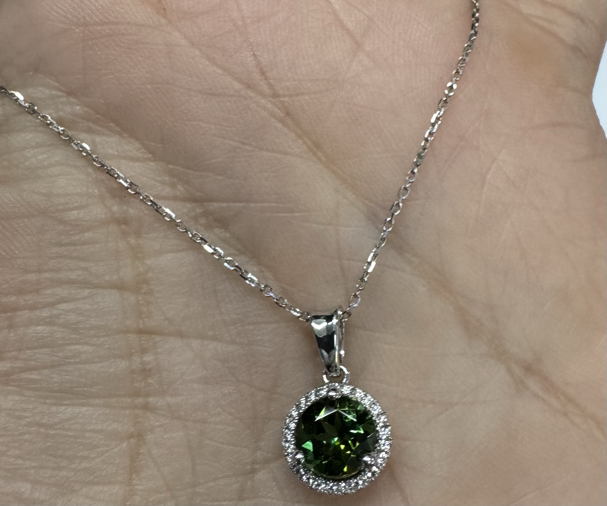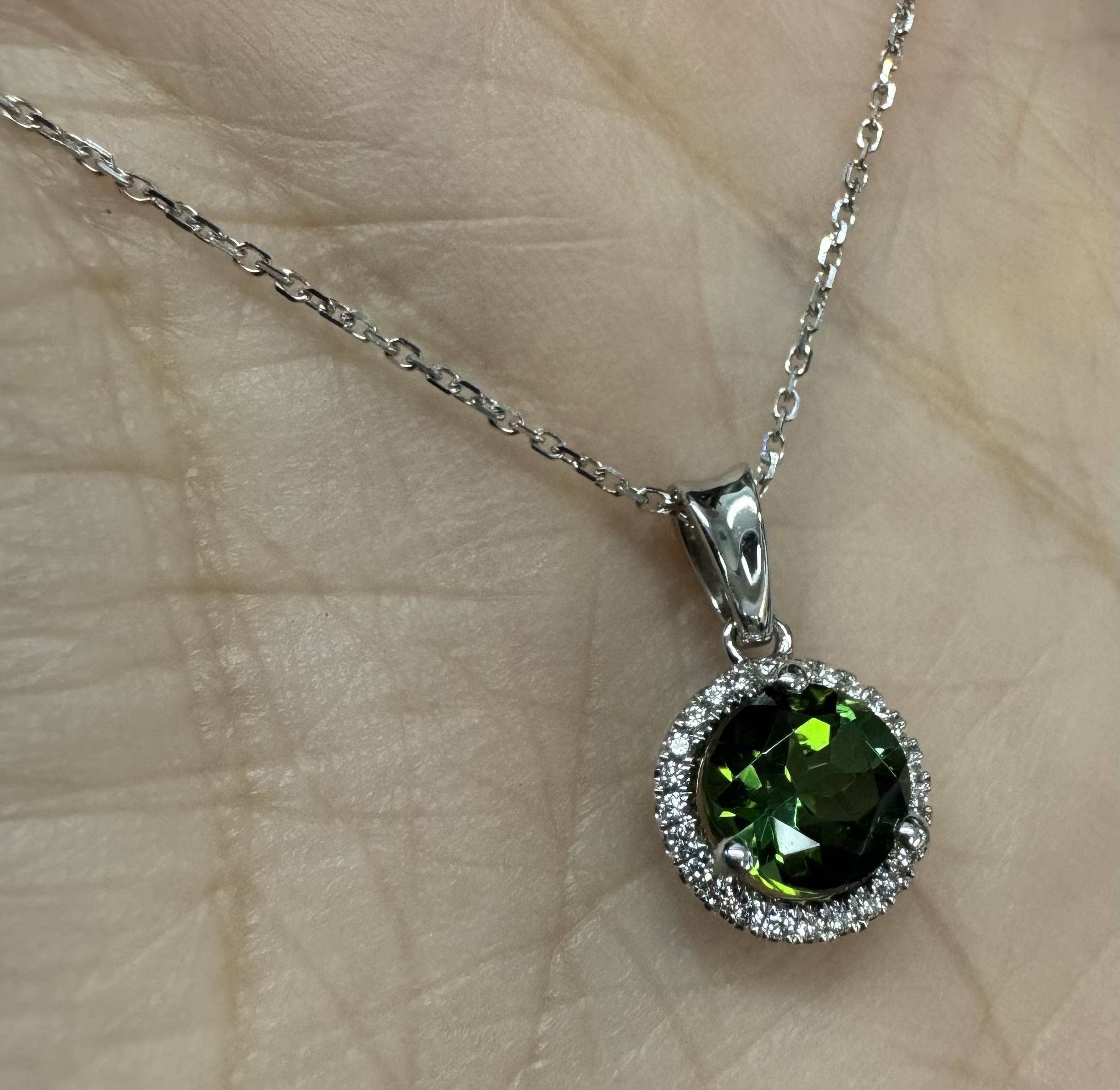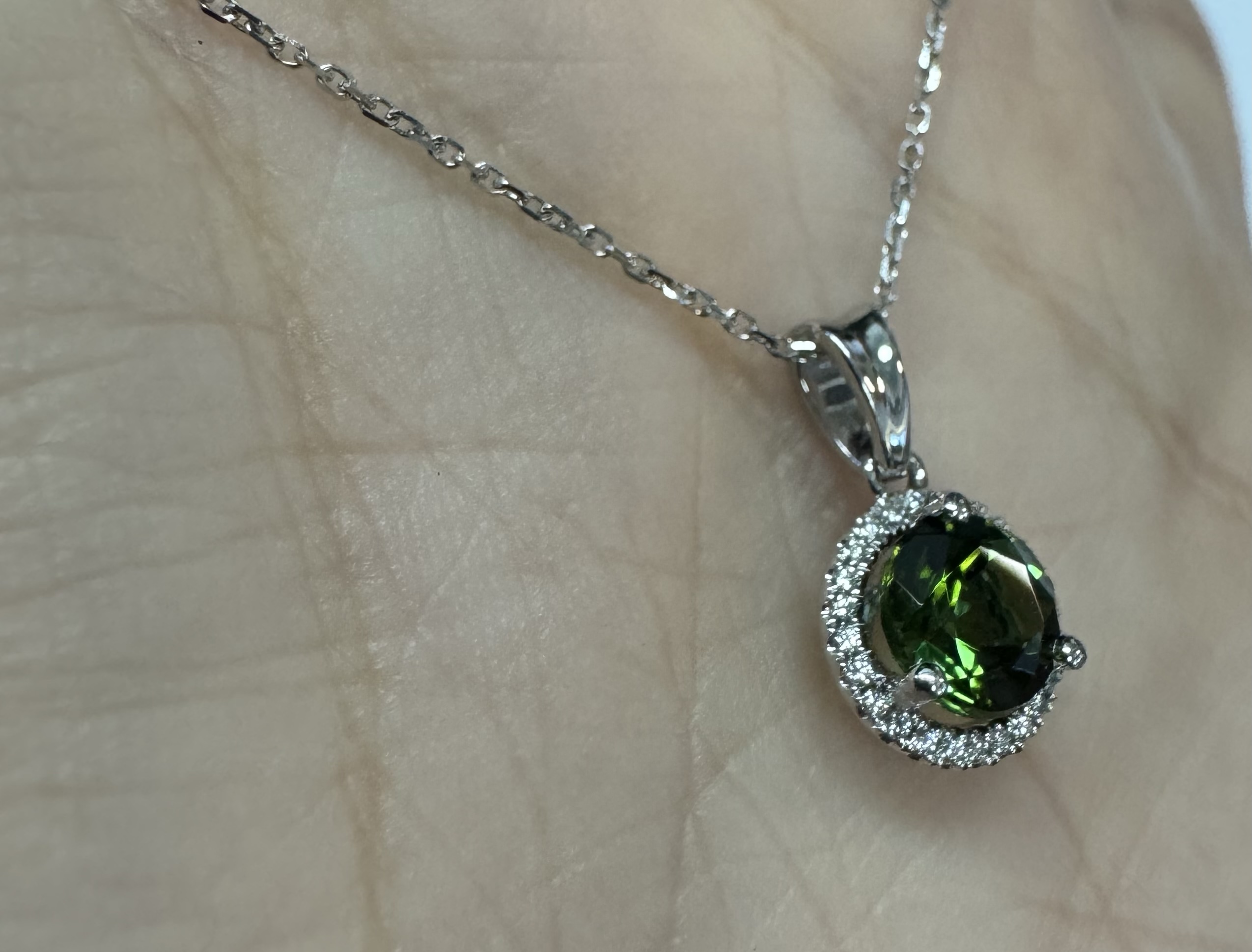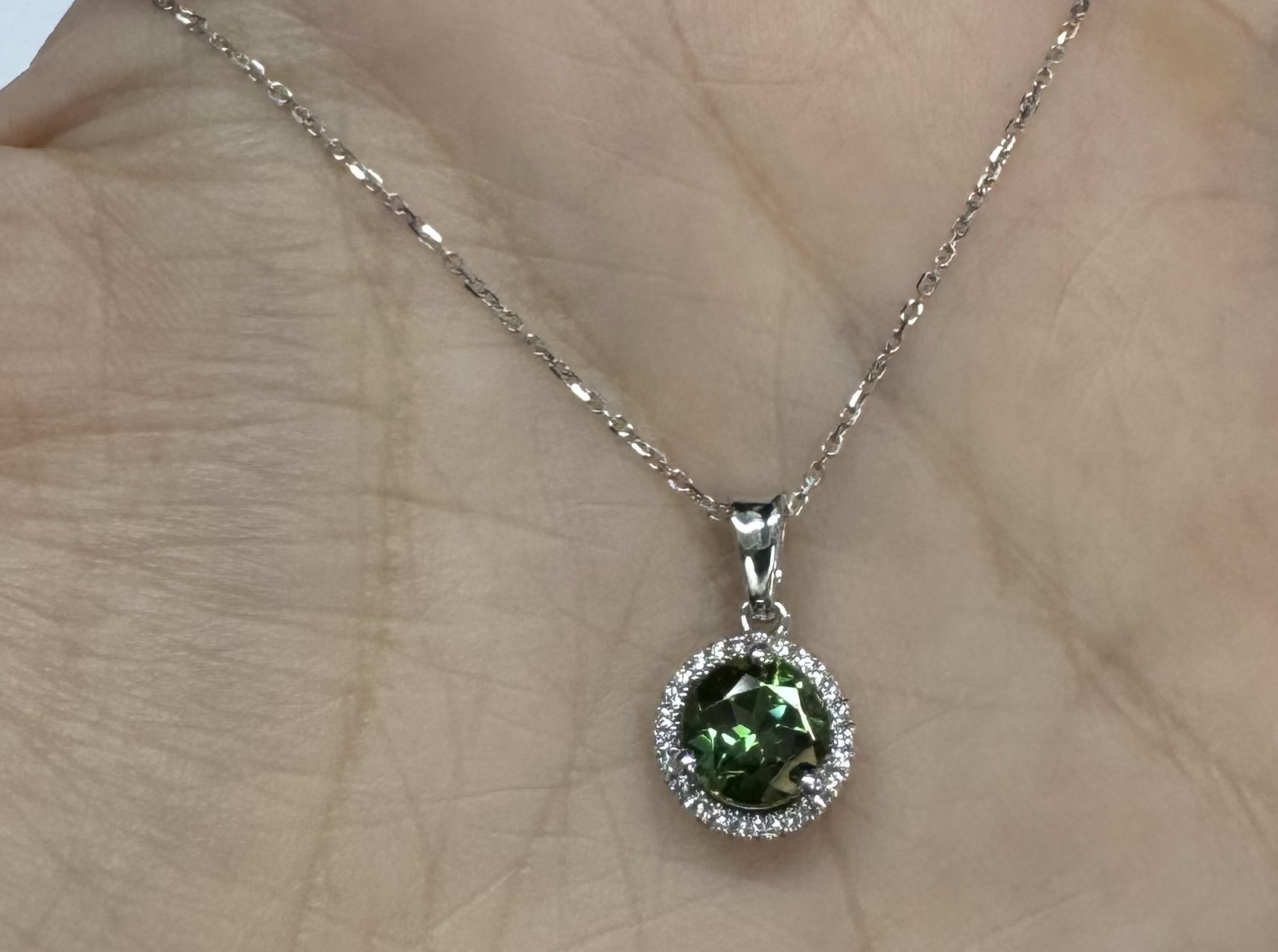 14k white gold genuine round, faceted .90 cttw Green Tourmaline and genuine .06/100-ct. Round Brilliant Cut diamond halo pendant. These diamonds average G-H in color and SI1 in clarity. These gemstones are nicely proportioned and well finished. This pendant is suspended from a 14k white gold forzantina chain which is adjustable 16-17-18″, and terminated by a lobster claw clasp. This pendant has an entire weight of 2.1 grams.