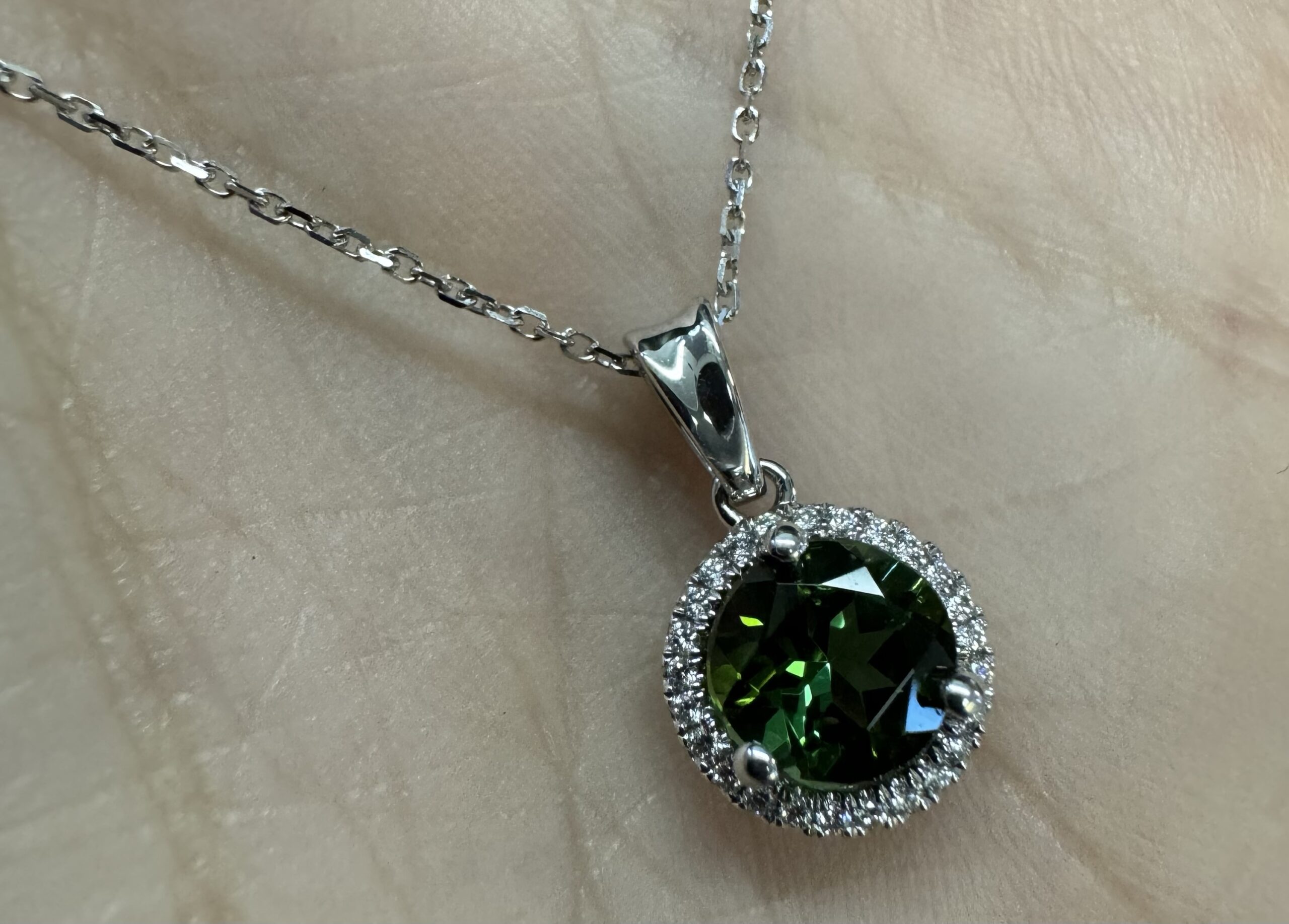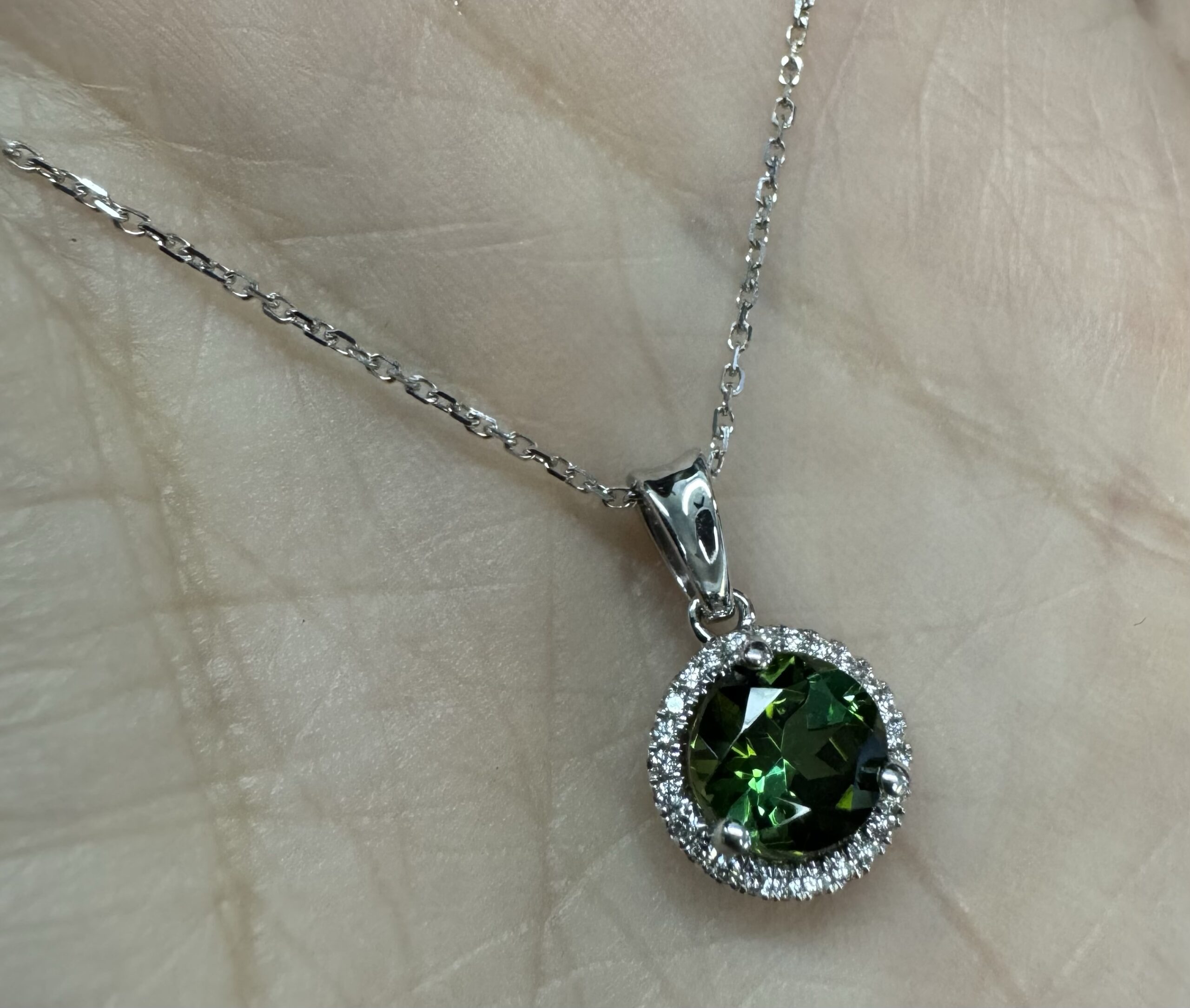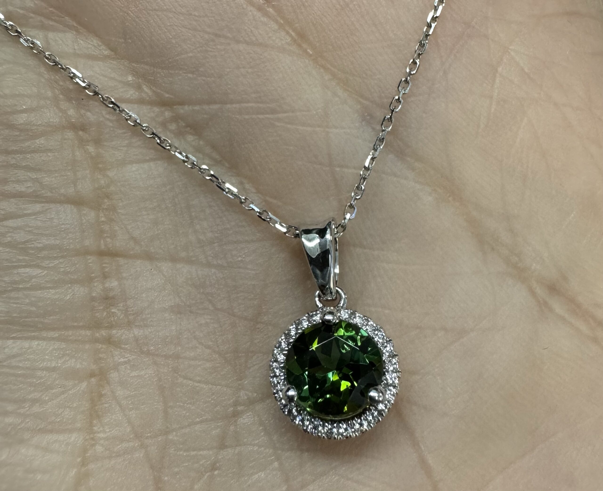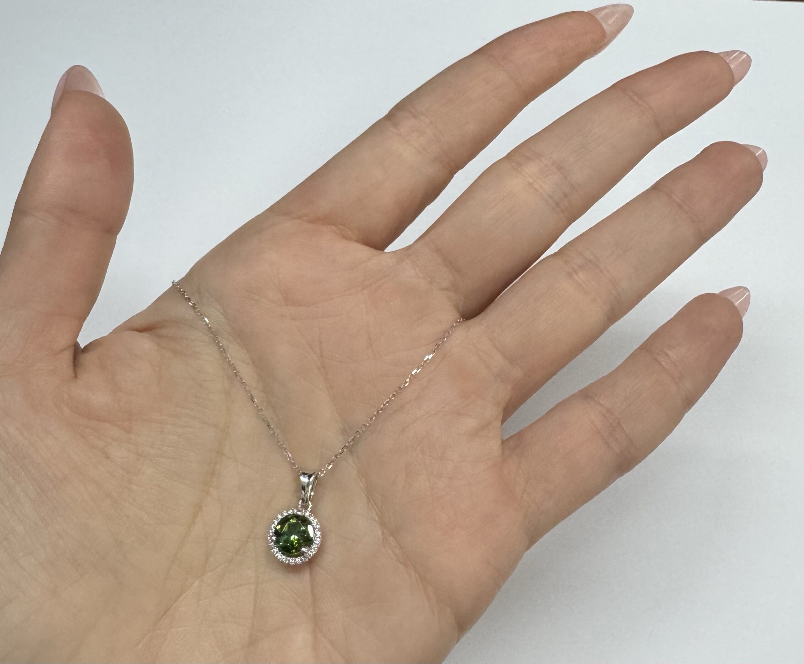 14k white gold genuine round, faceted .90 cttw Green Tourmaline and genuine .06/100-ct. Round Brilliant Cut diamond halo pendant. These diamonds average G-H in color and SI1 in clarity. These gemstones are nicely proportioned and well finished. This pendant is suspended from a 14k white gold forzantina chain which is adjustable 16-17-18″, and terminated by a lobster claw clasp. This pendant has an entire weight of 2.1 grams.