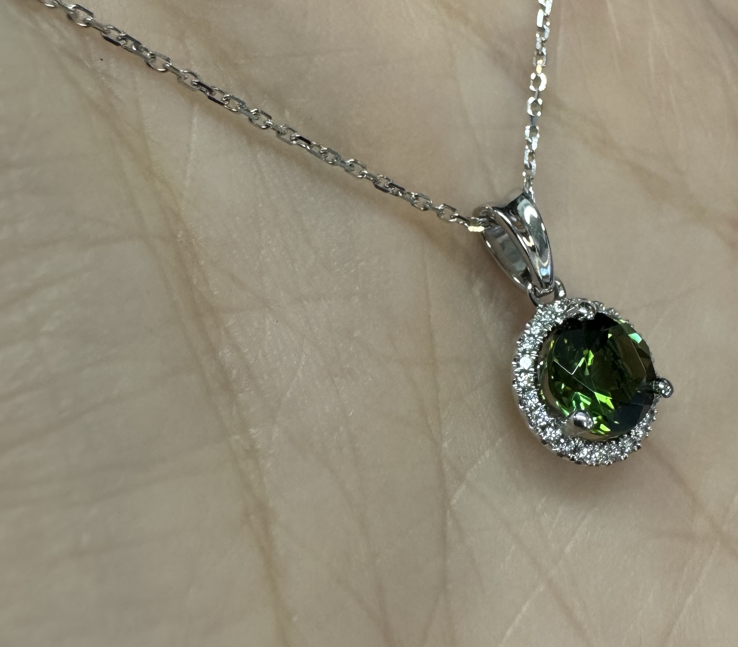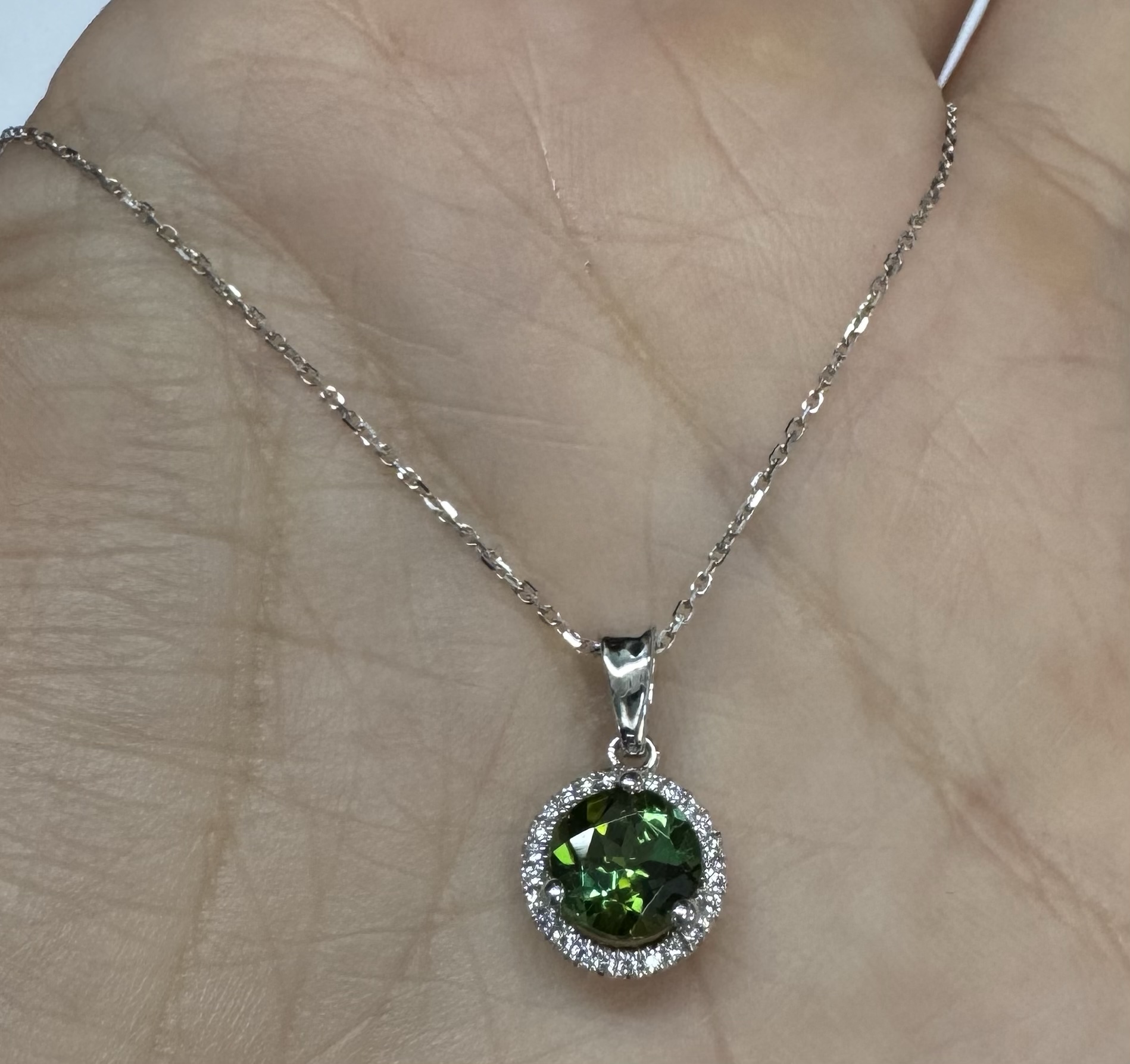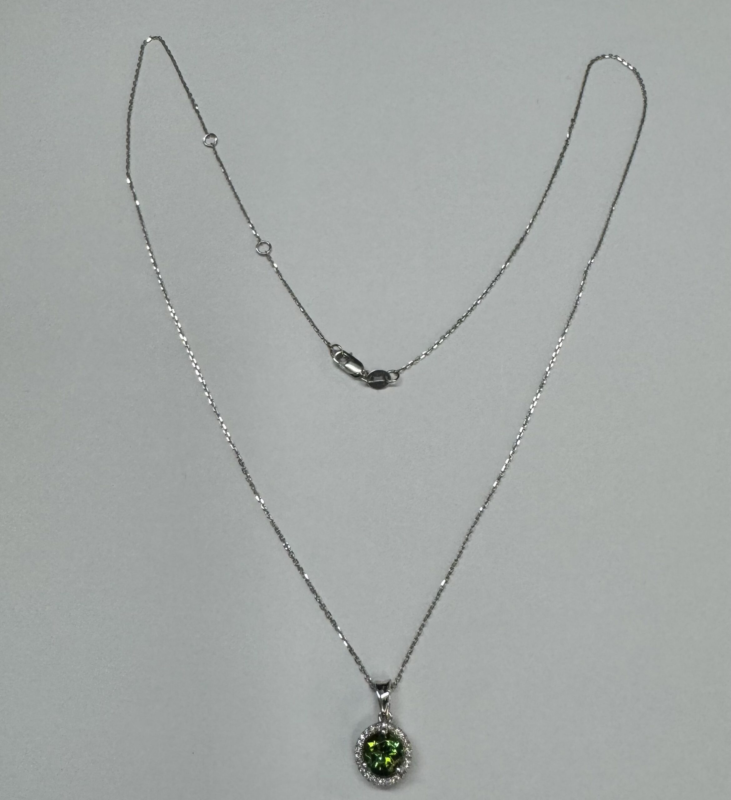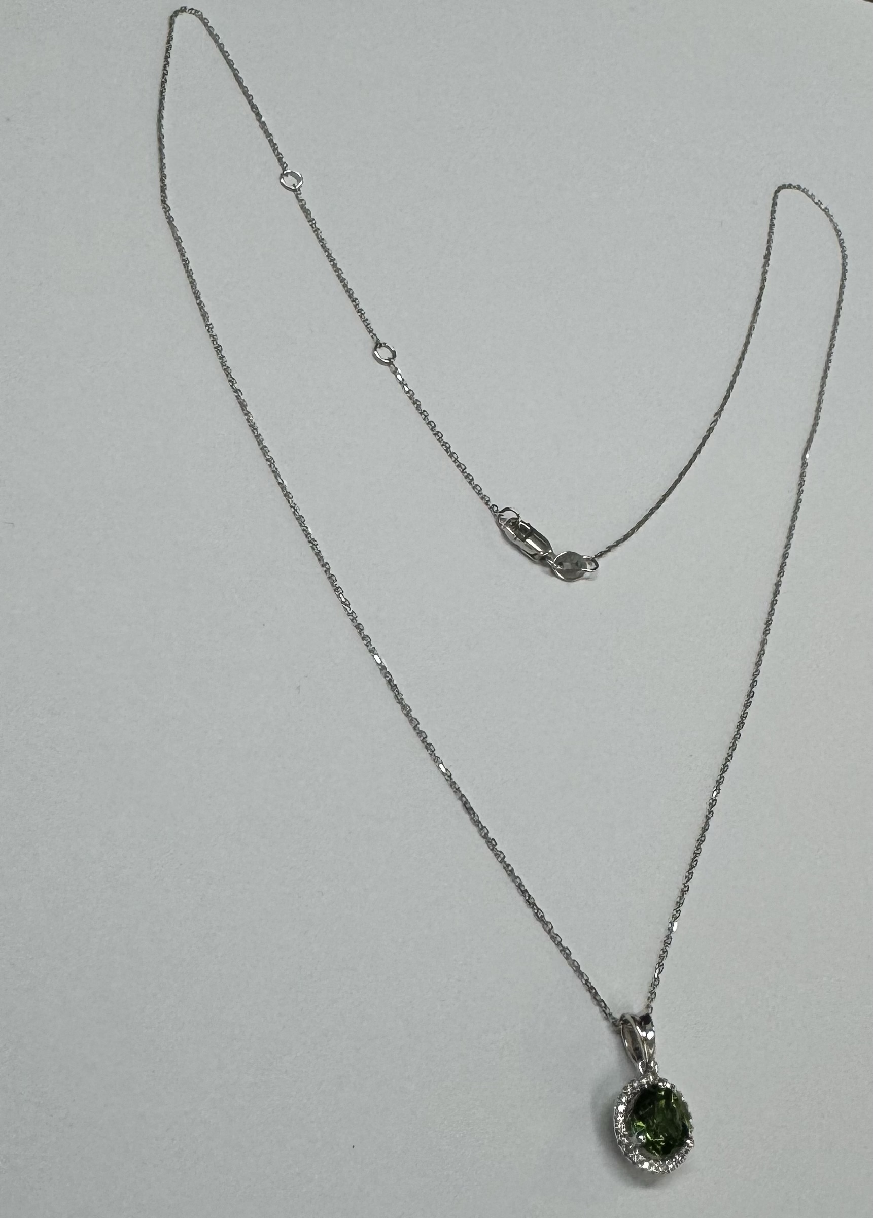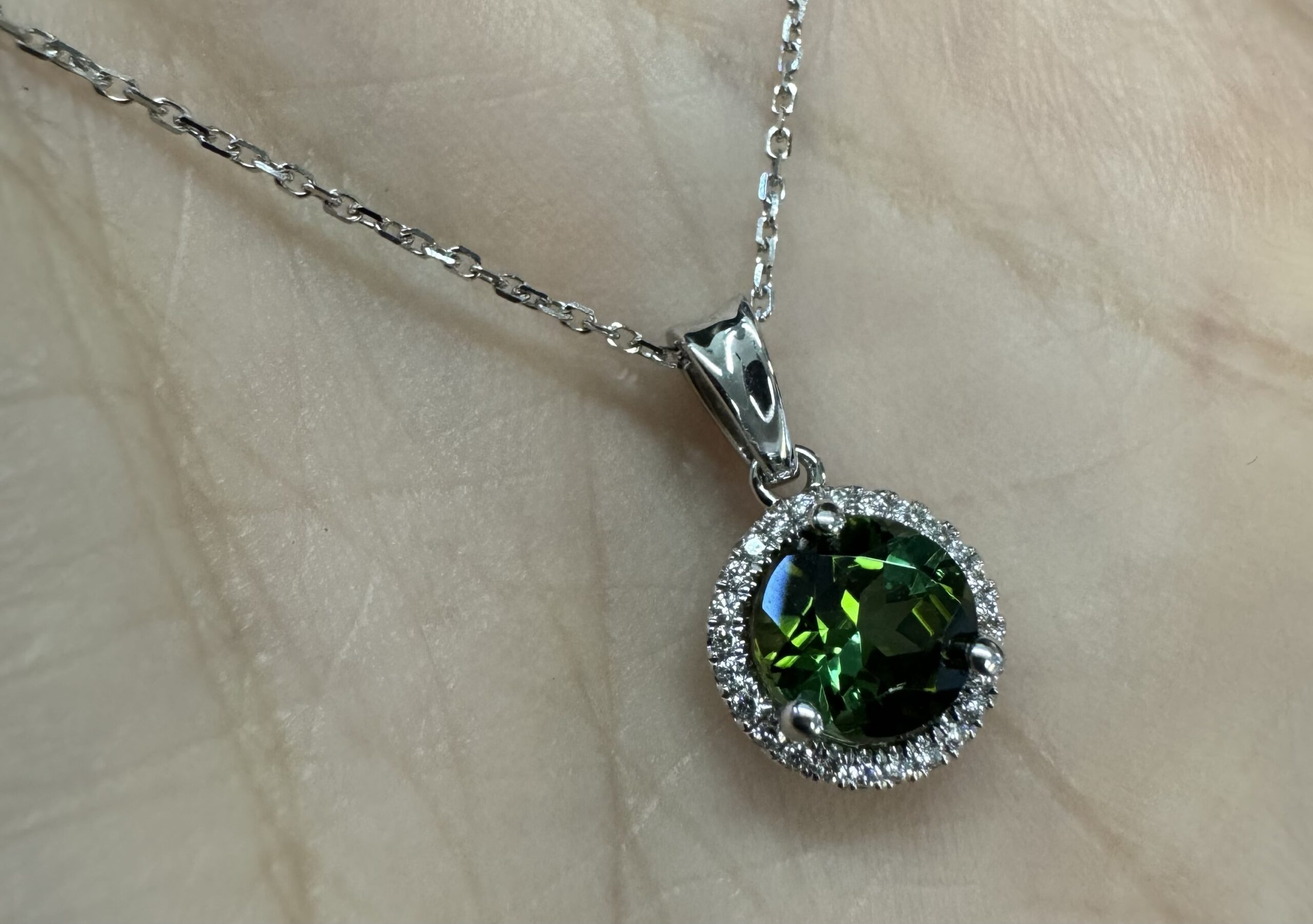 14k white gold genuine round, faceted .90 cttw Green Tourmaline and genuine .06/100-ct. Round Brilliant Cut diamond halo pendant. These diamonds average G-H in color and SI1 in clarity. These gemstones are nicely proportioned and well finished. This pendant is suspended from a 14k white gold forzantina chain which is adjustable 16-17-18″, and terminated by a lobster claw clasp. This pendant has an entire weight of 2.1 grams.