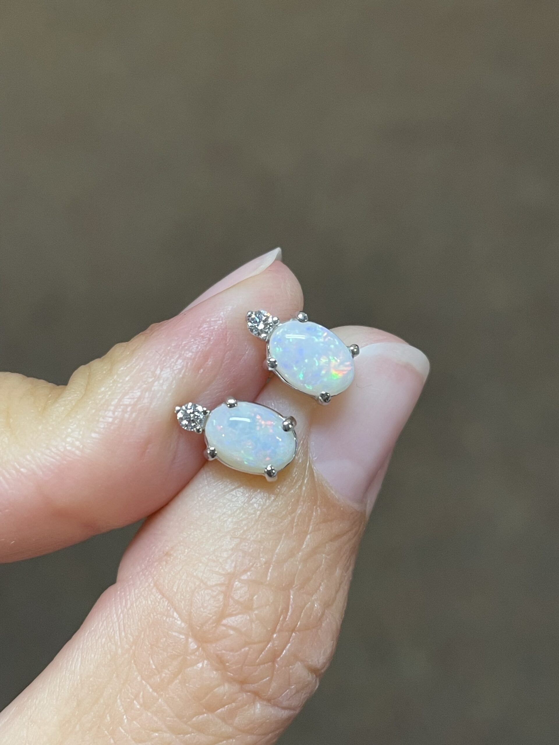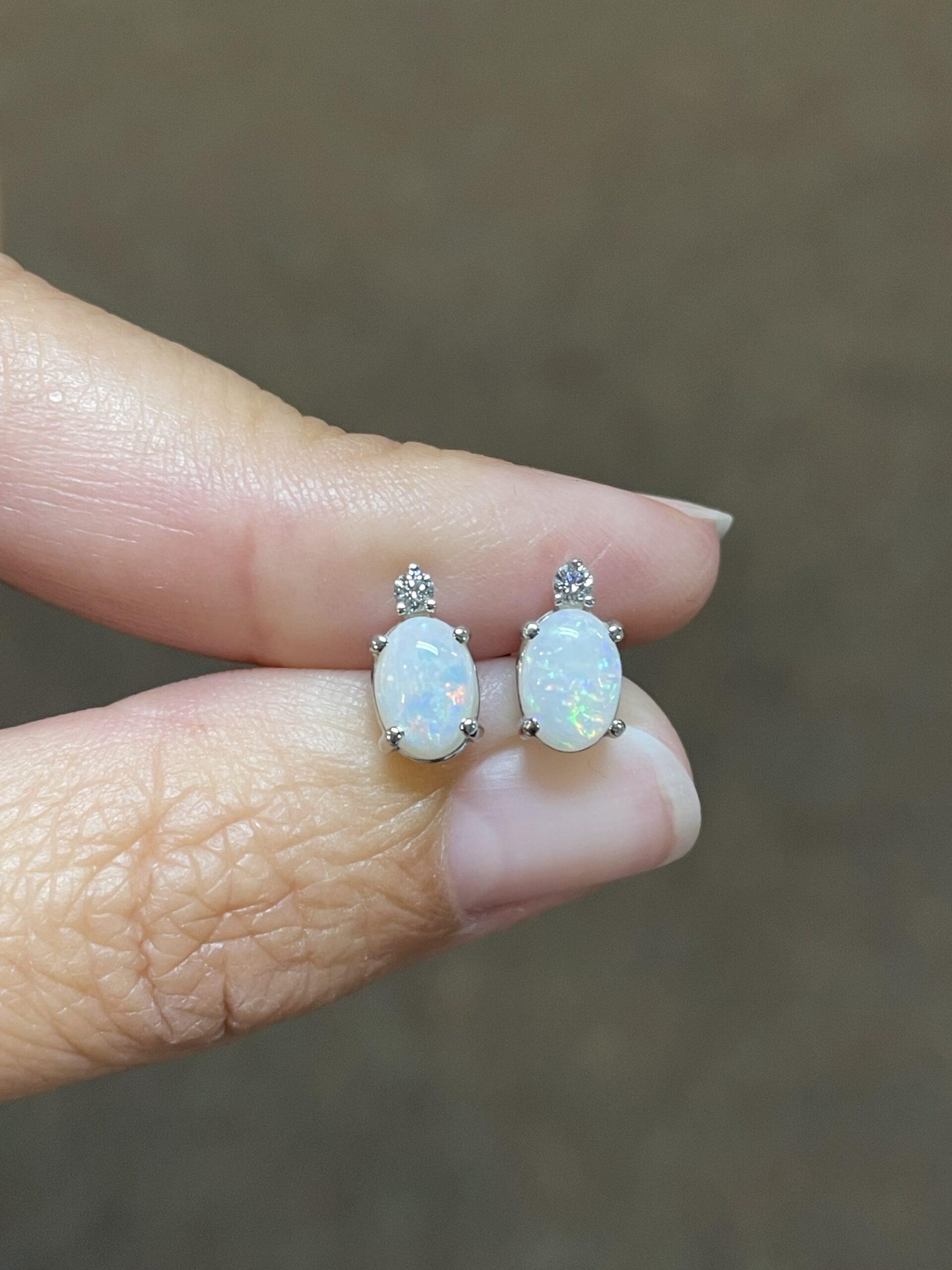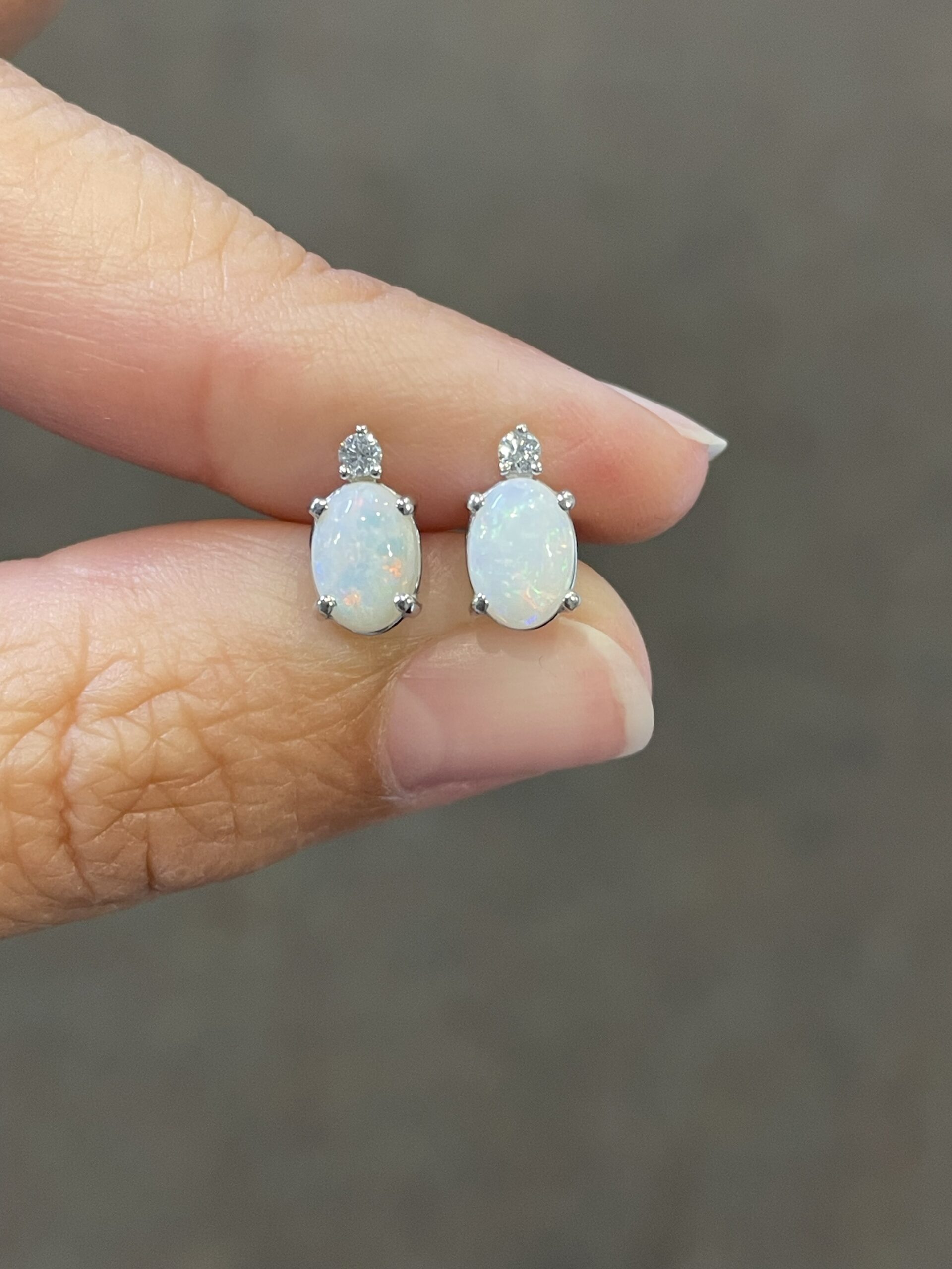 14k white gold basket set genuine oval shaped .94 cttw Opal (October birthstone) & .06 cttw Round Brilliant Cut diamond stud earrings. These earrings have an entire weight of 1.2 grams. These earrings measure 9 x 5 mm in size.