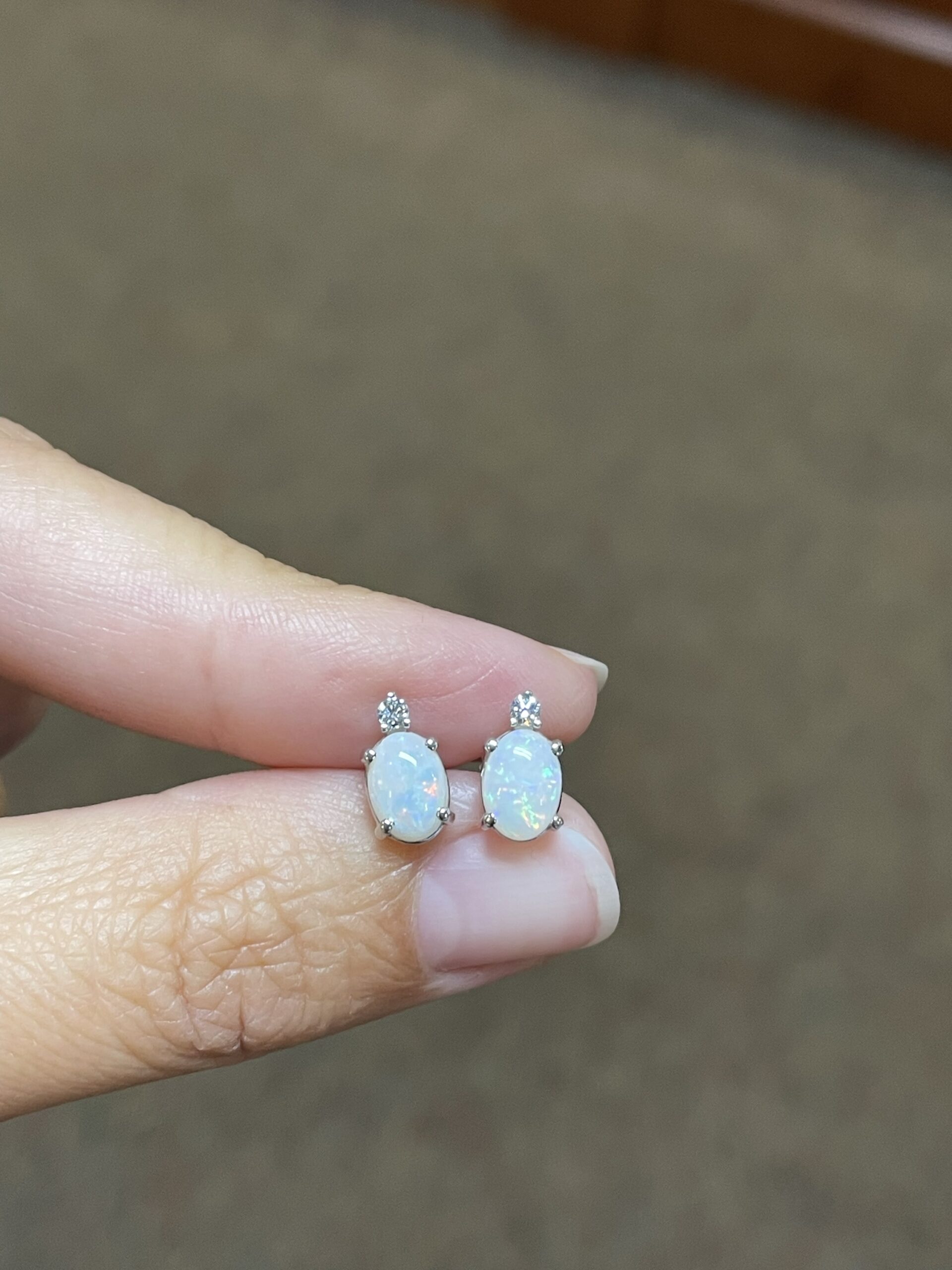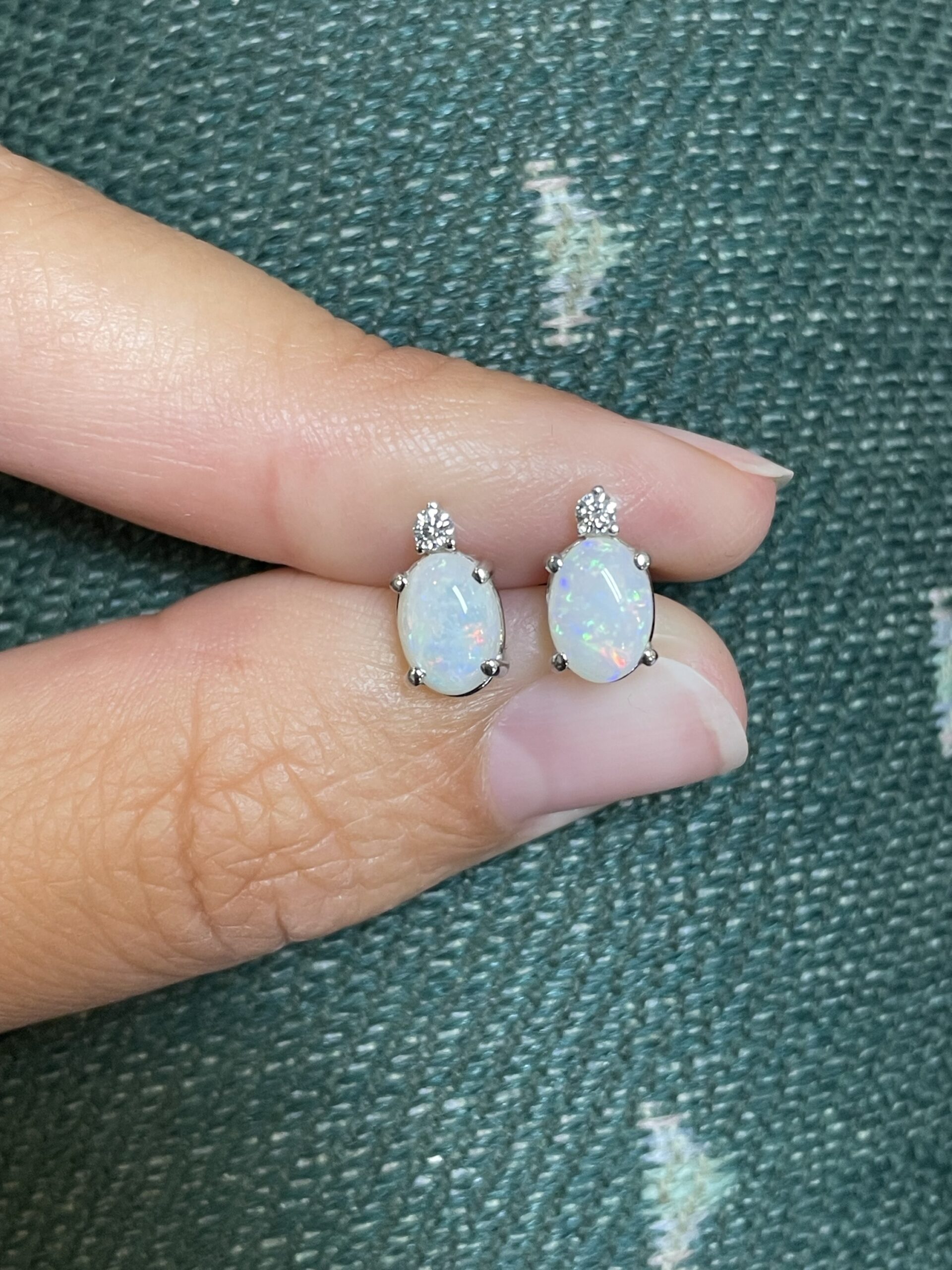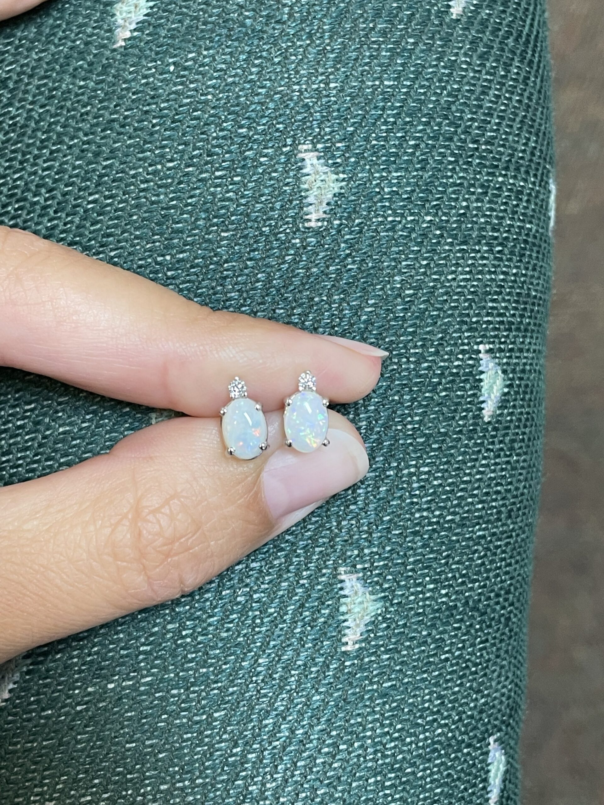 14k white gold basket set genuine oval shaped .94 cttw Opal (October birthstone) & .06 cttw Round Brilliant Cut diamond stud earrings. These earrings have an entire weight of 1.2 grams. These earrings measure 9 x 5 mm in size.