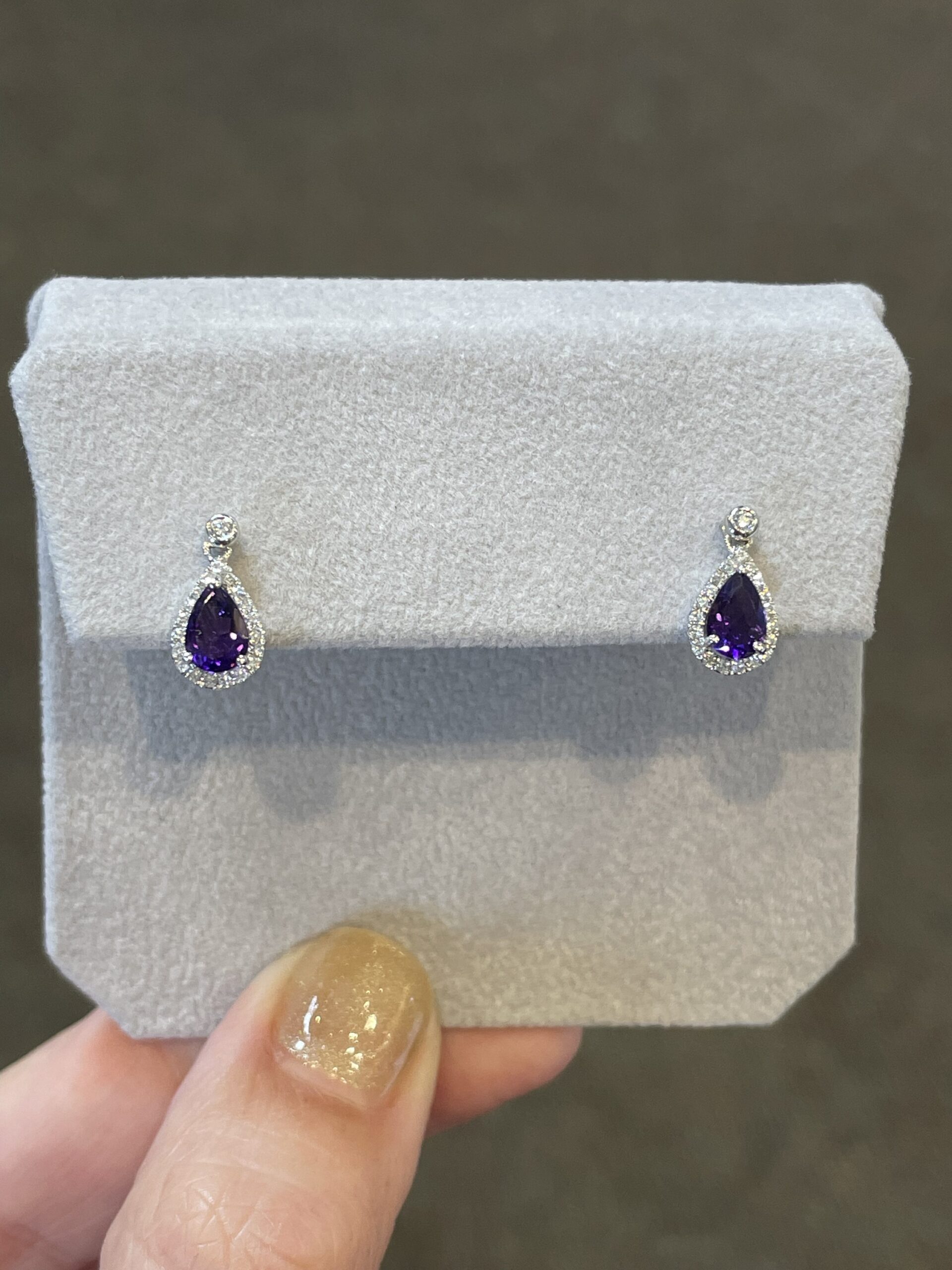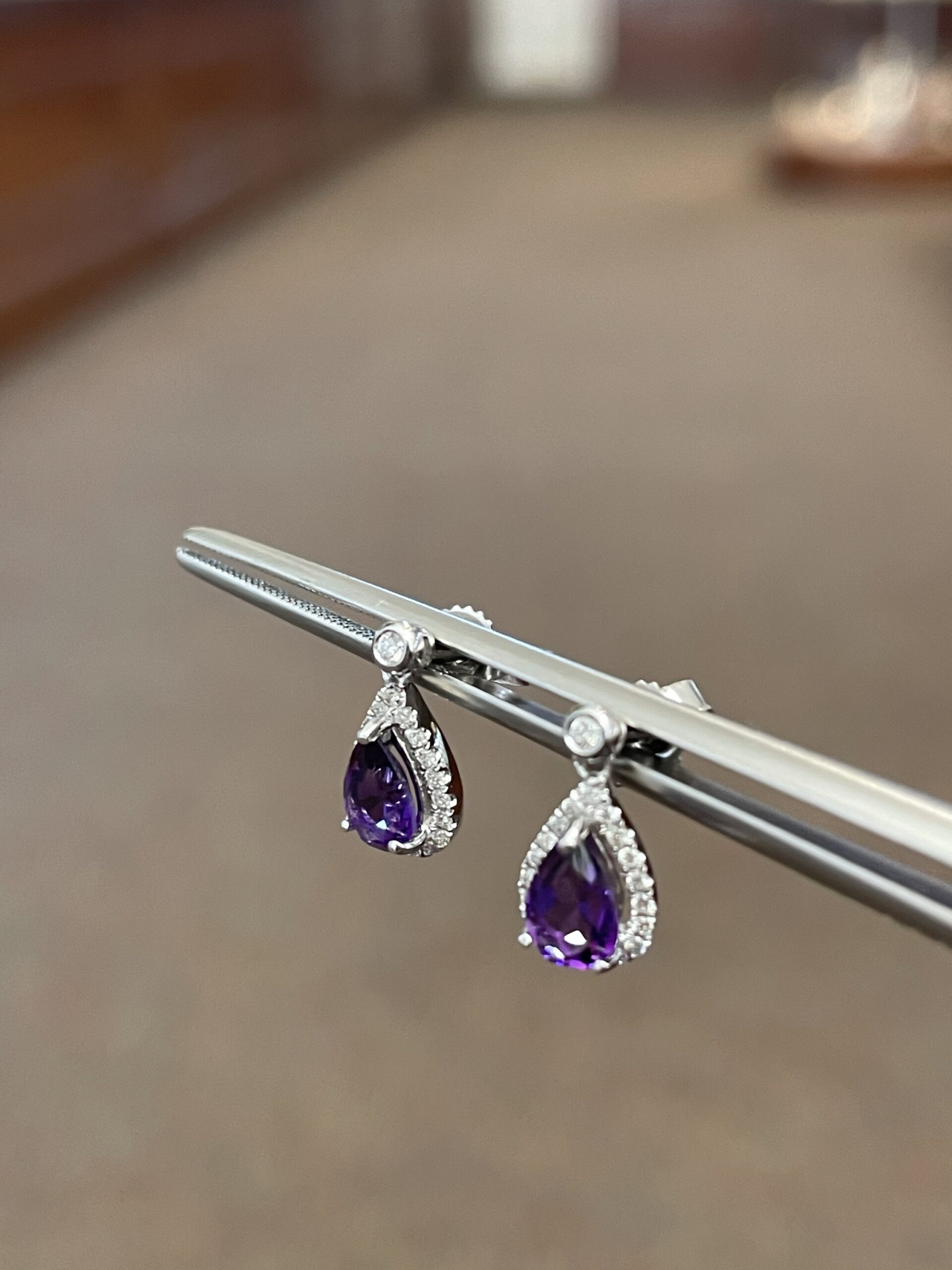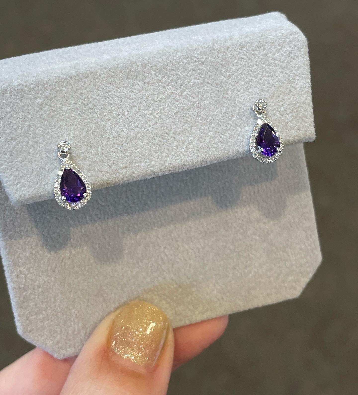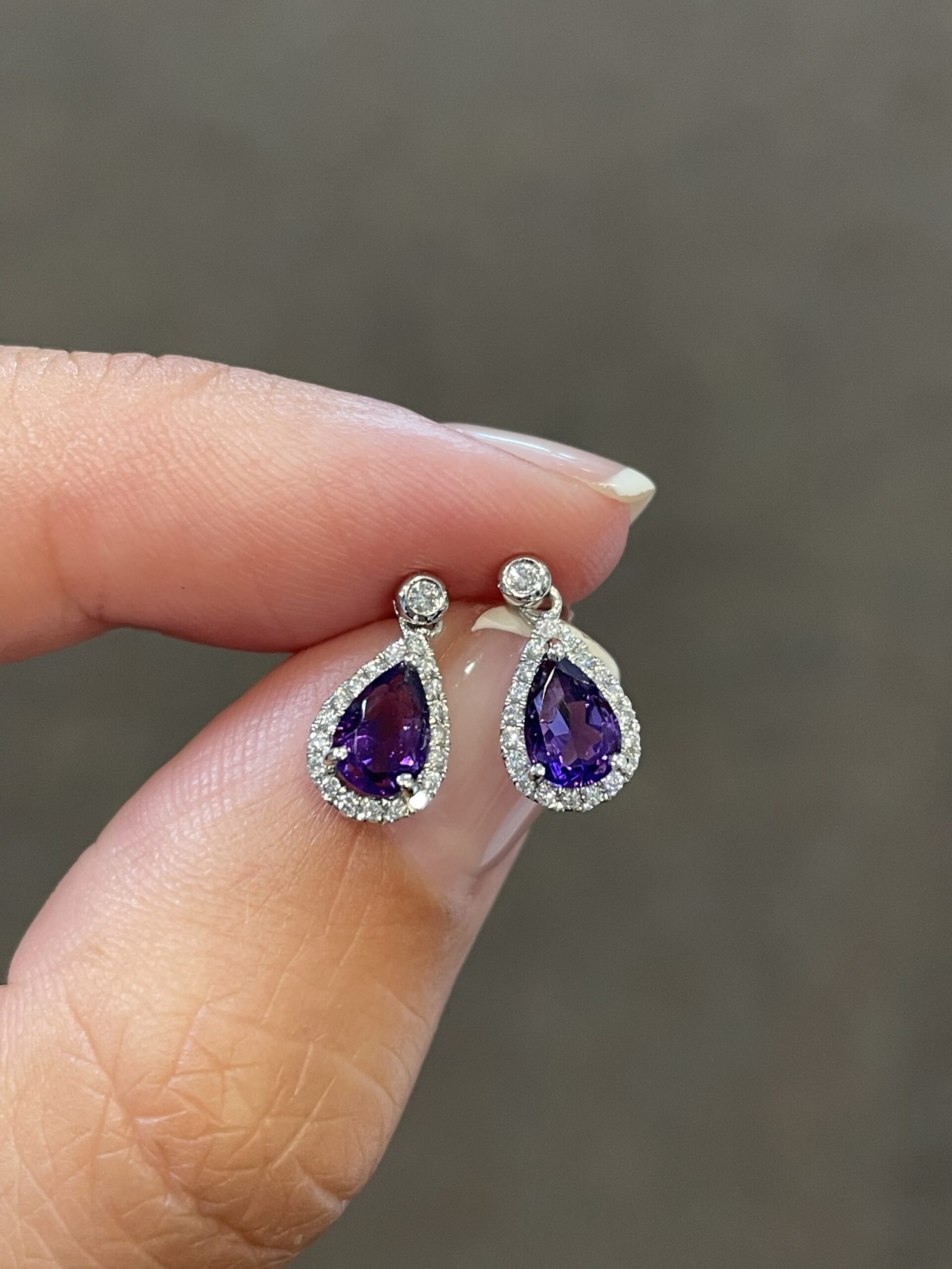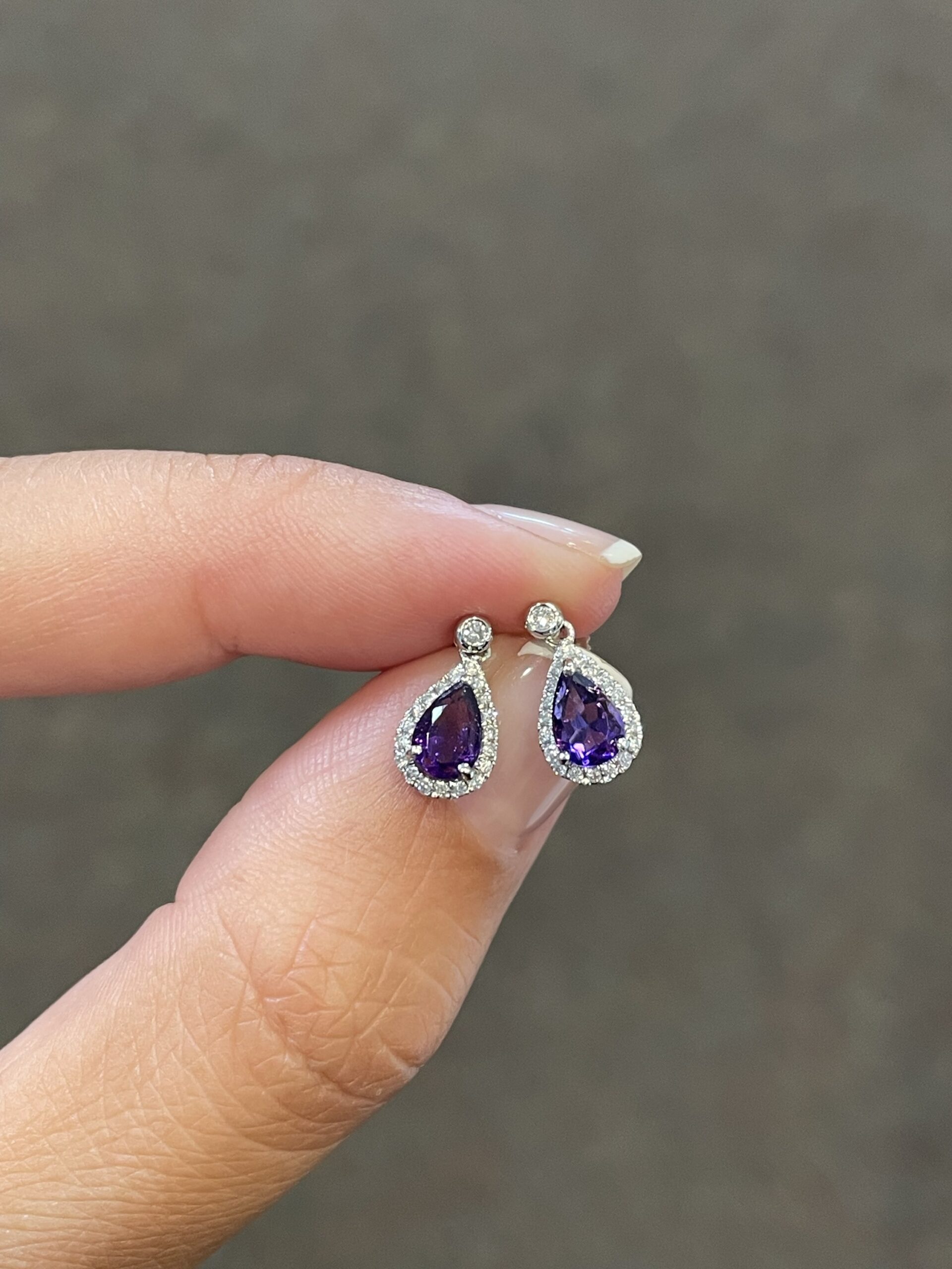 14k white gold genuine pear shaped Amethyst & .14 Cttw genuine Round Brilliant Cut diamond halo dangle stud earrings. These diamonds average H in color, and SI in clarity. These diamonds are nicely proportioned and well finished.
