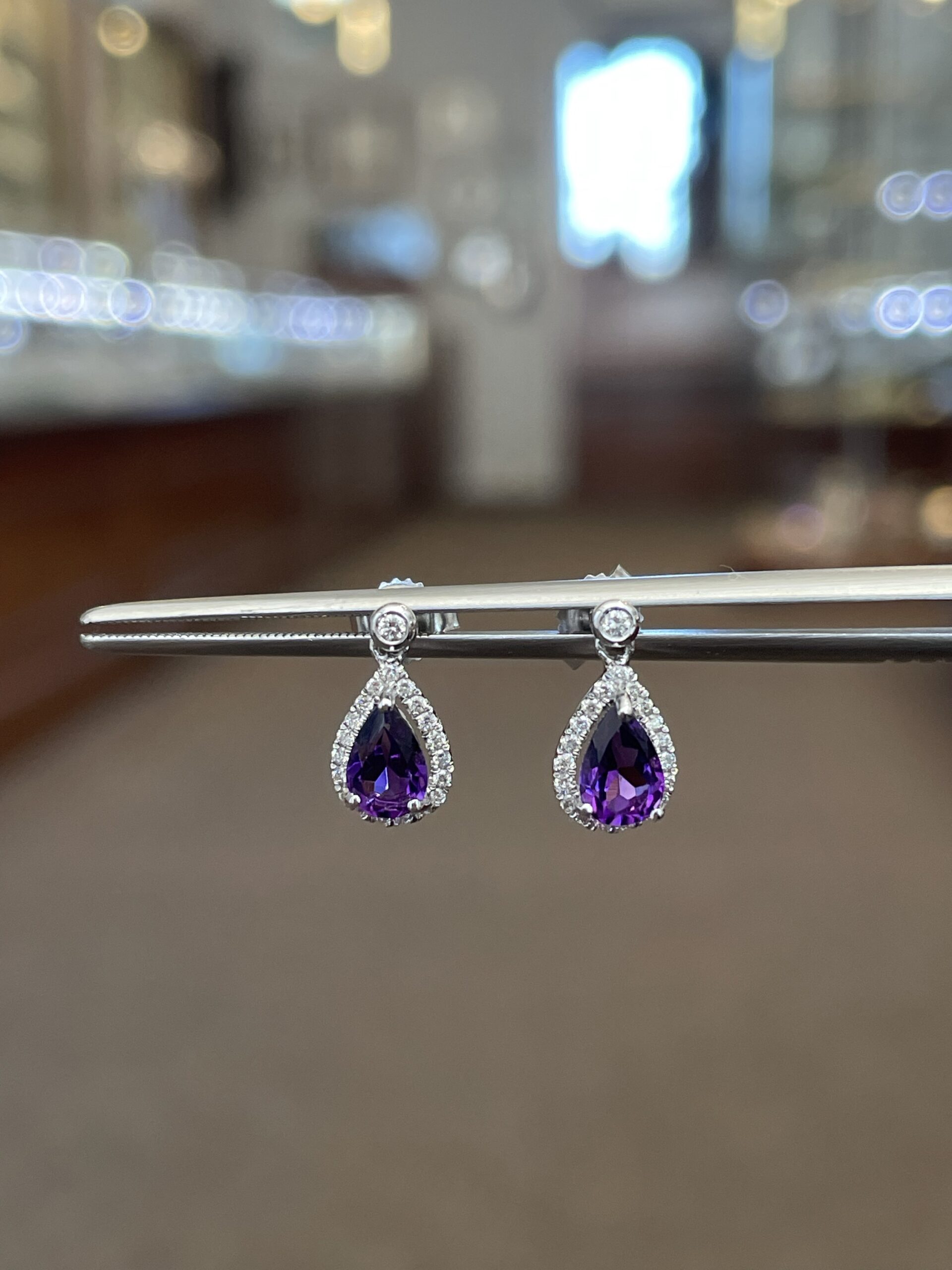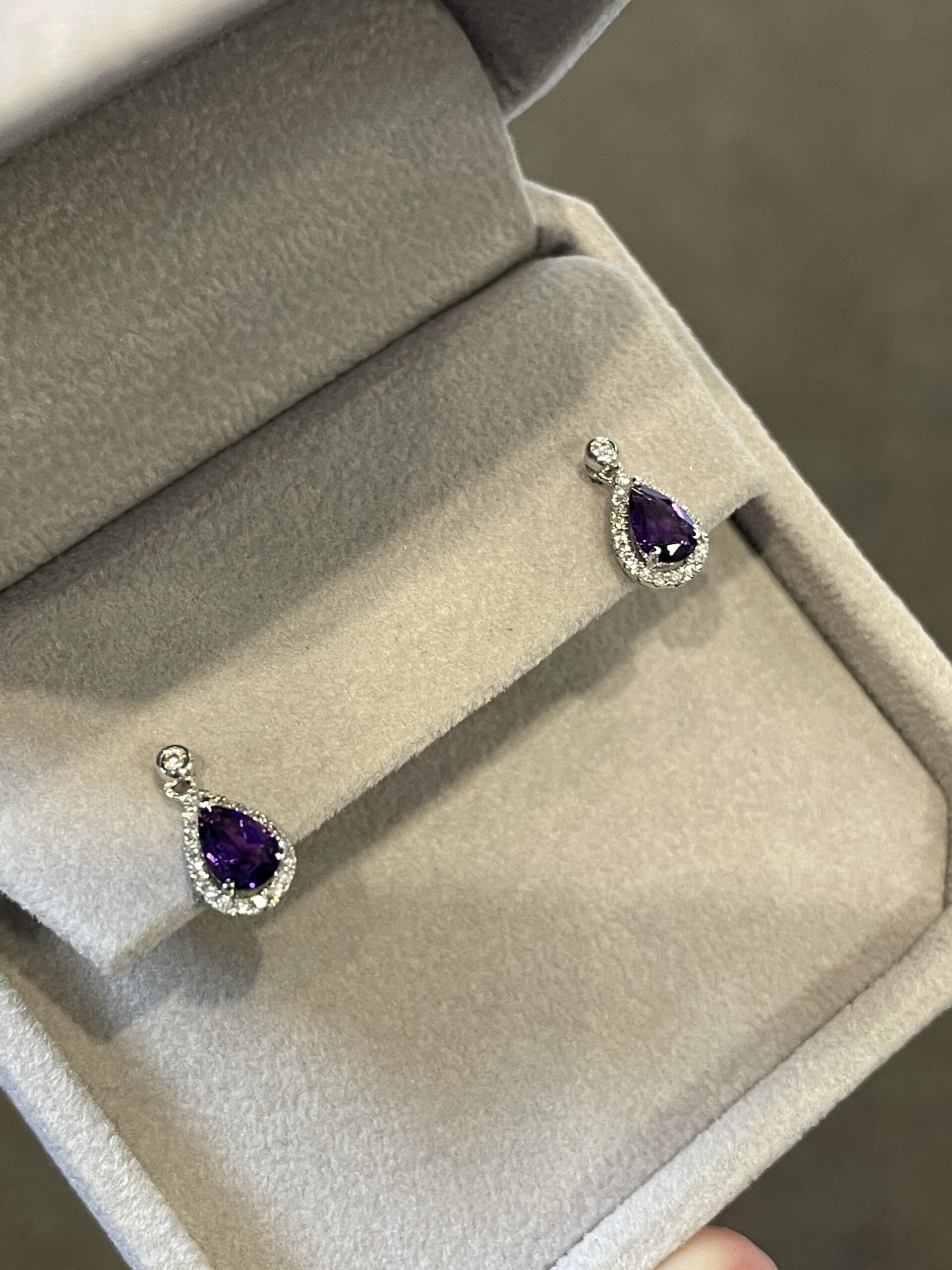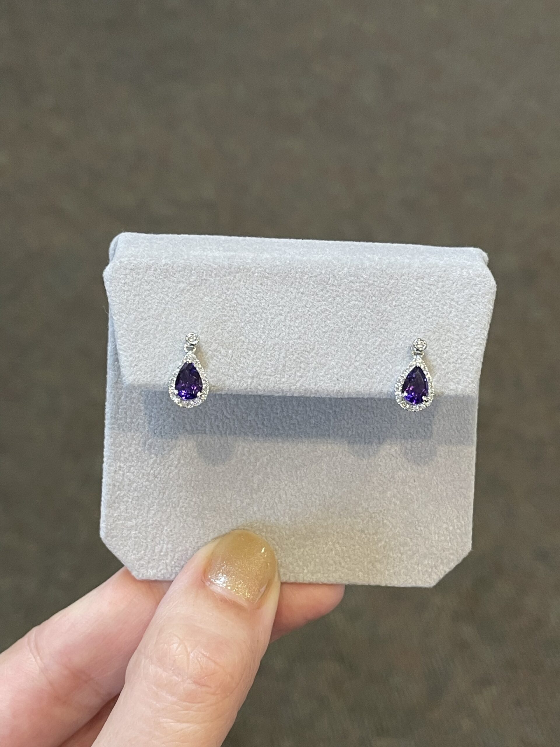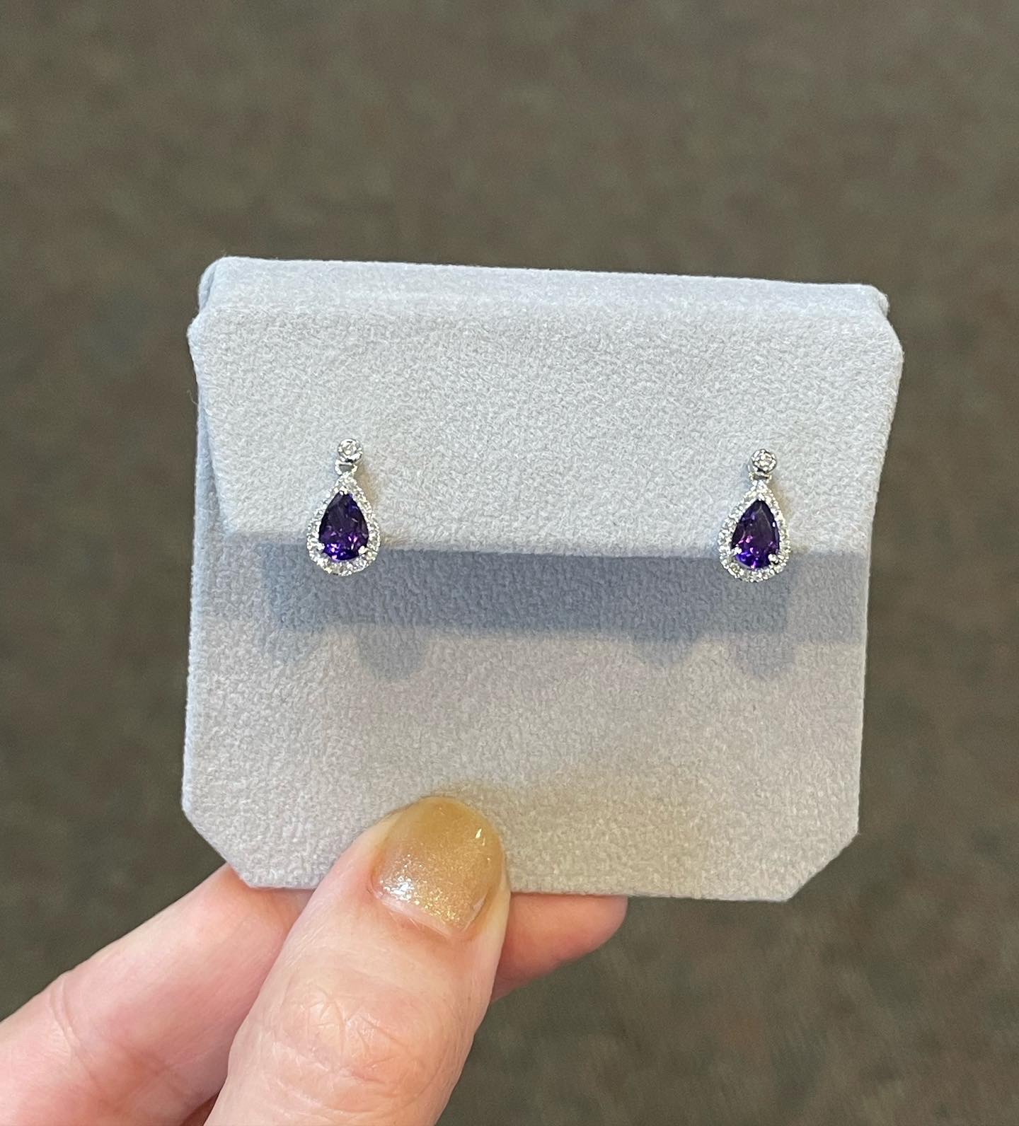 14k white gold genuine pear shaped Amethyst & .14 Cttw genuine Round Brilliant Cut diamond halo dangle stud earrings. These diamonds average H in color, and SI in clarity. These diamonds are nicely proportioned and well finished.