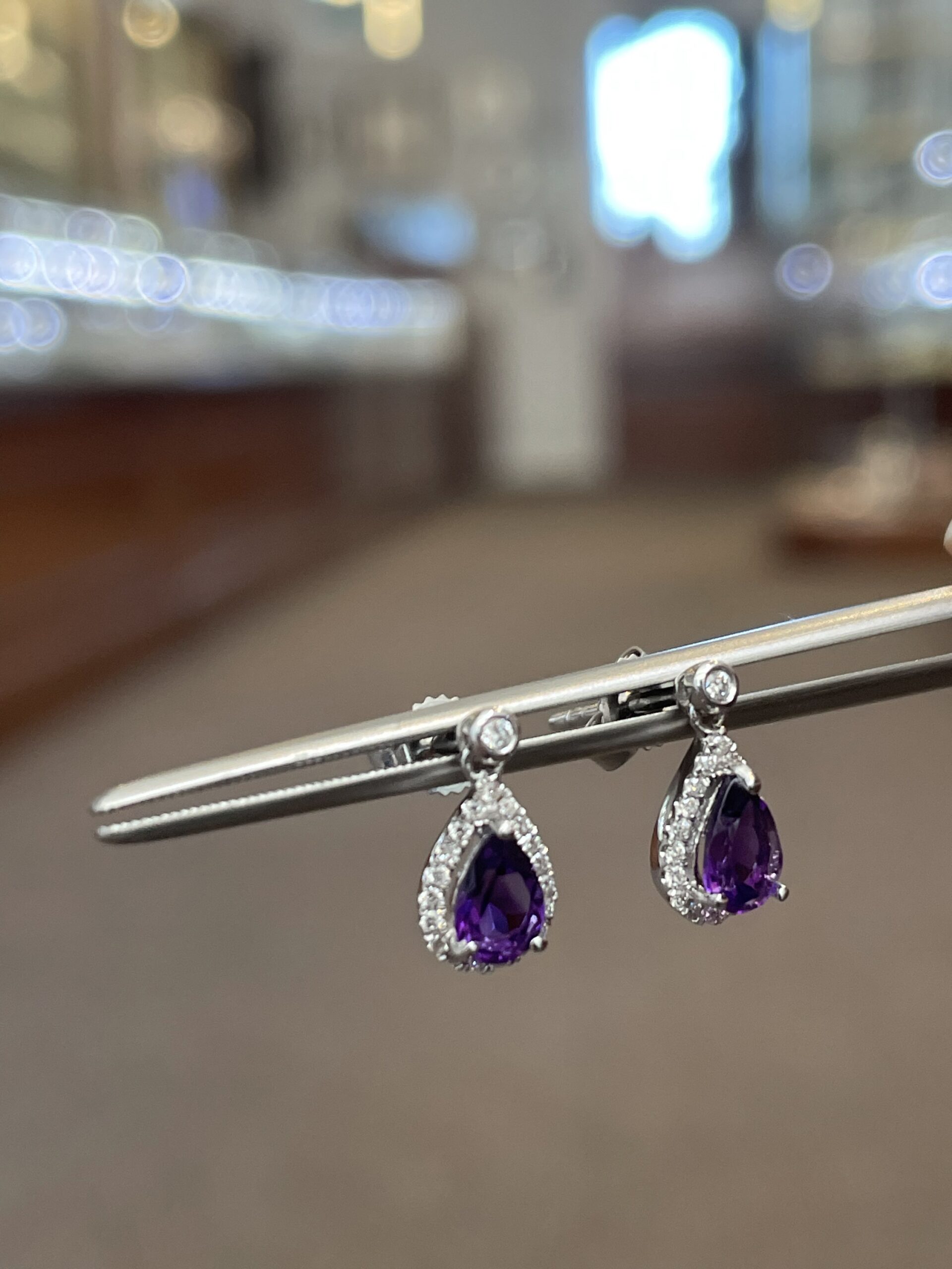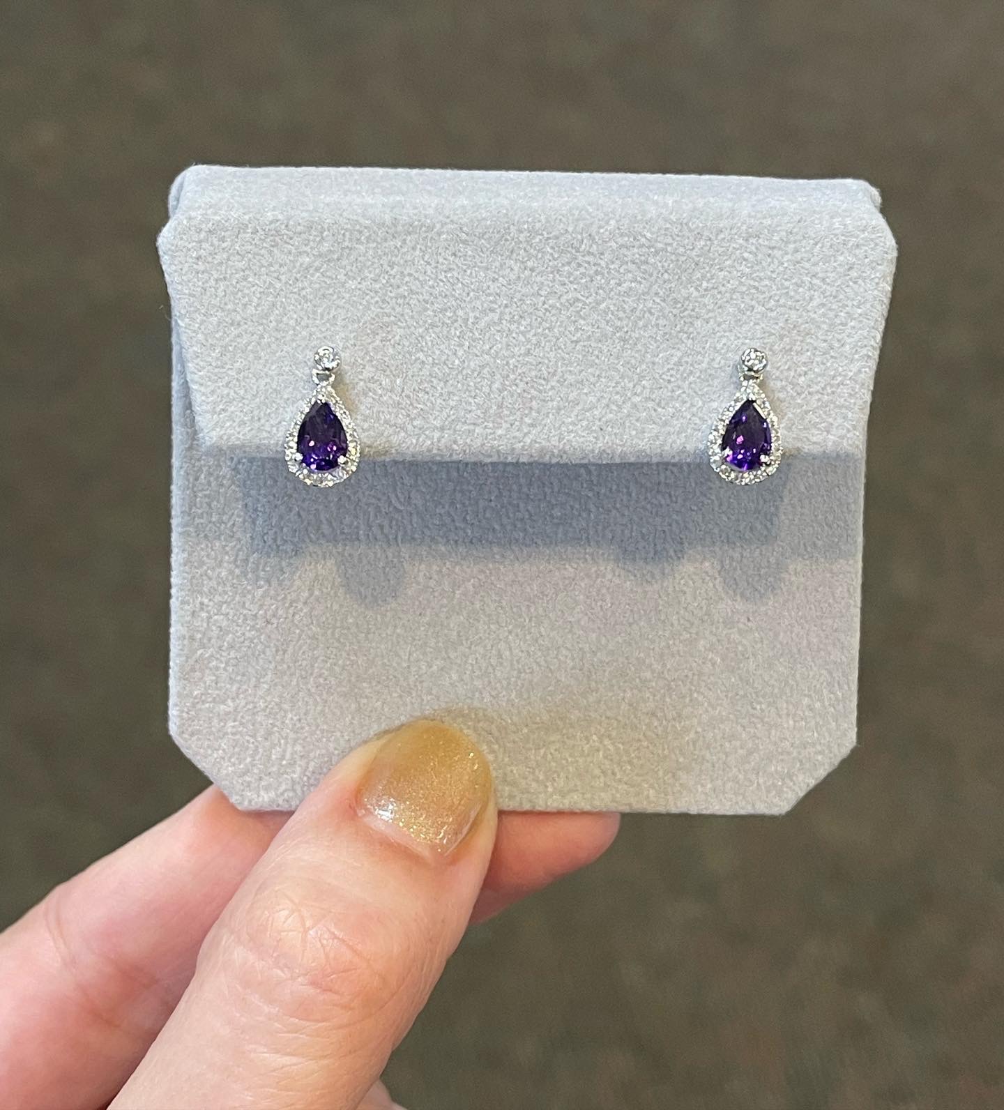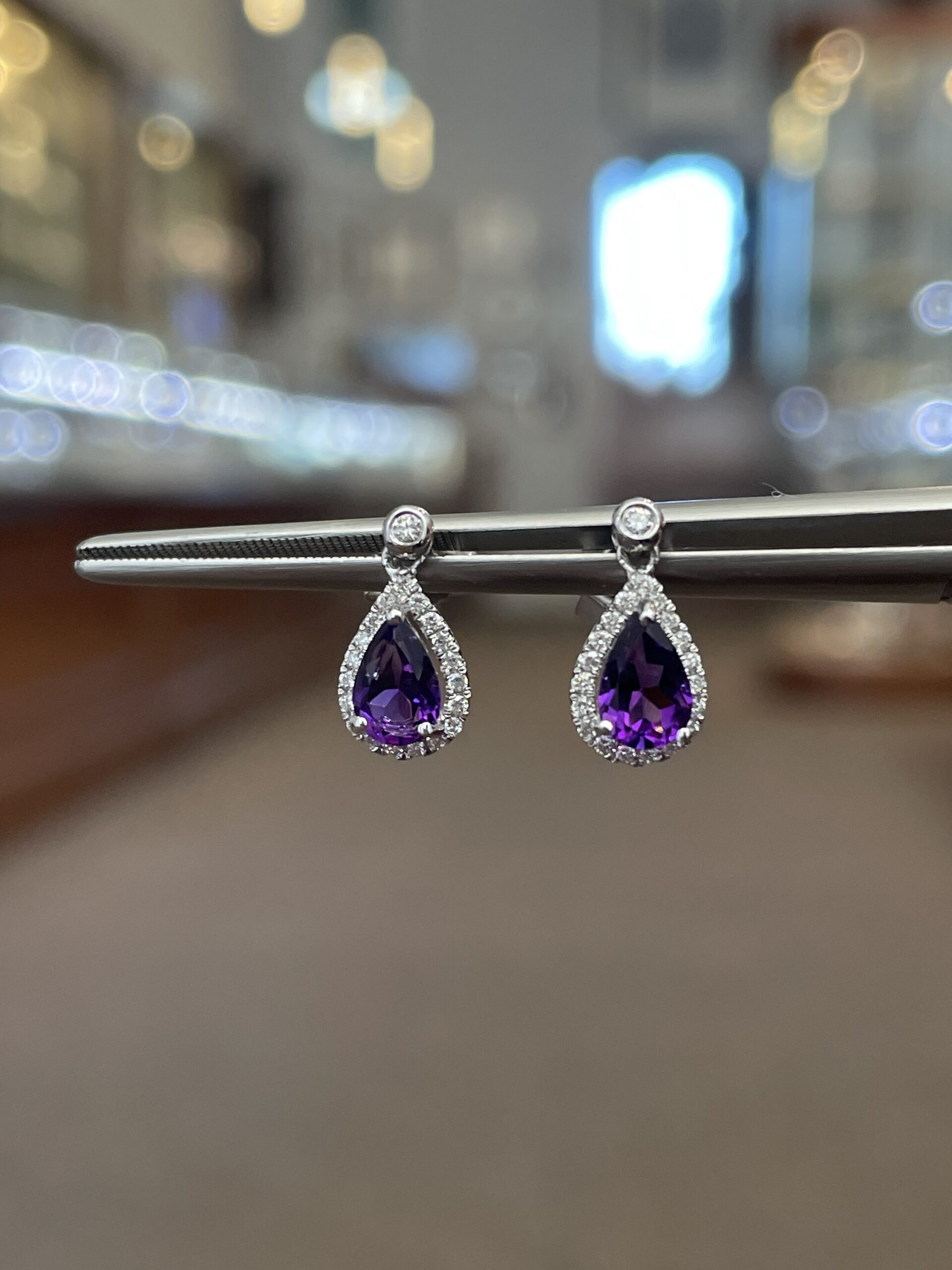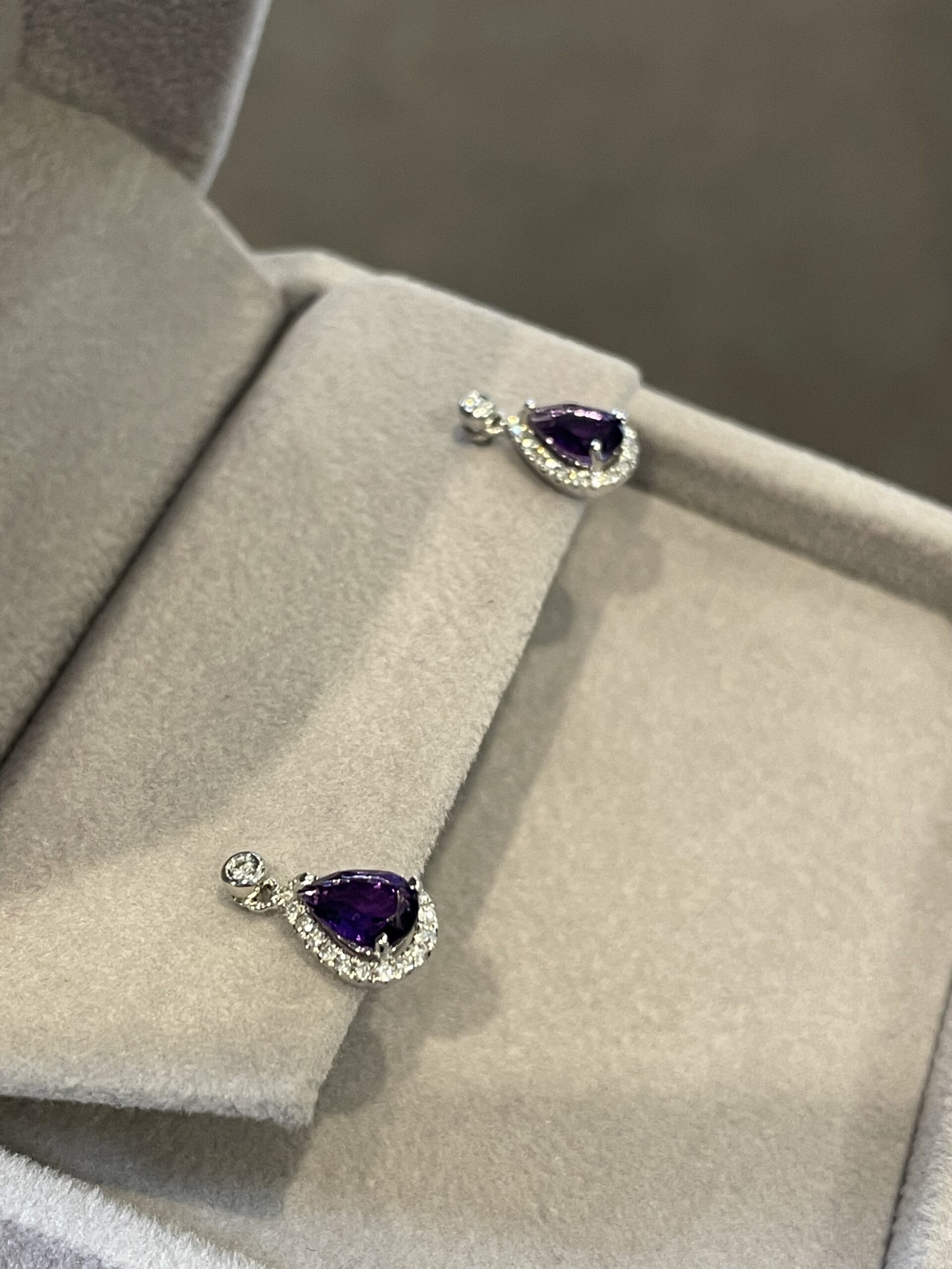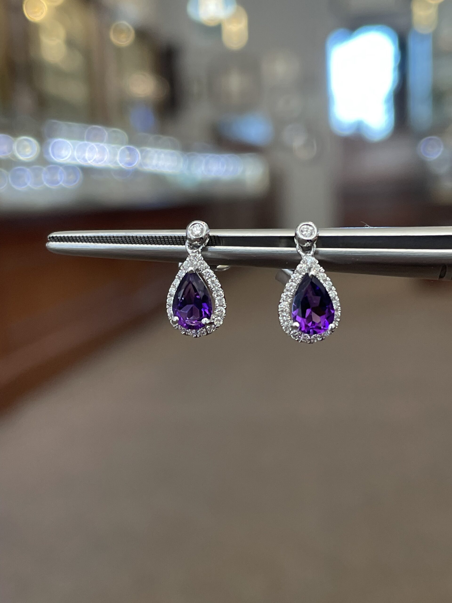 14k white gold genuine pear shaped Amethyst & .14 Cttw genuine Round Brilliant Cut diamond halo dangle stud earrings. These diamonds average H in color, and SI in clarity. These diamonds are nicely proportioned and well finished.