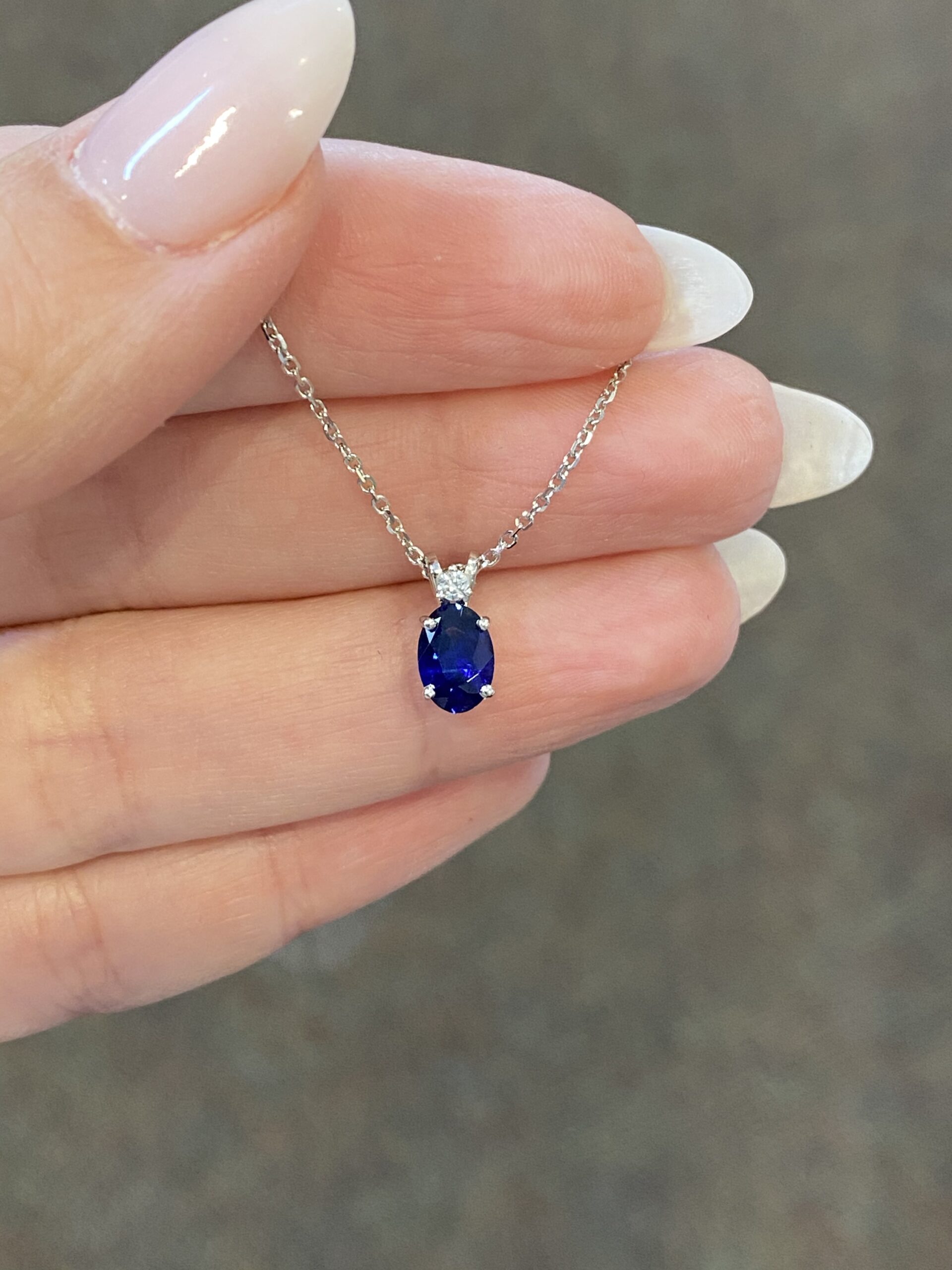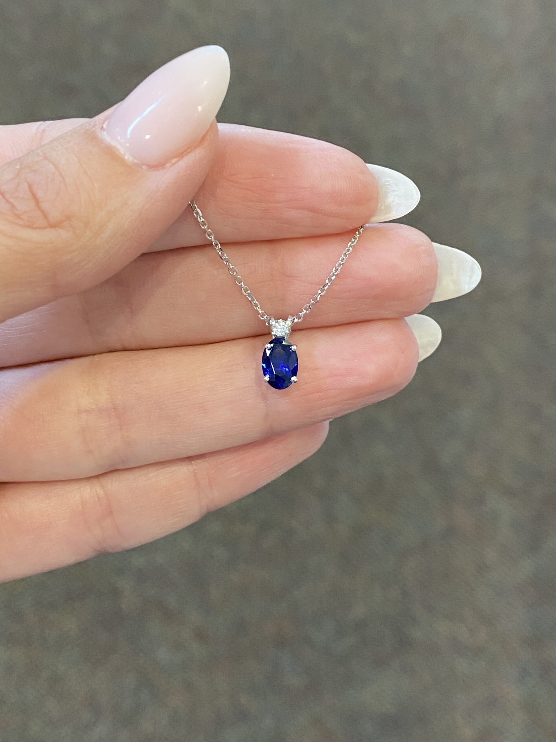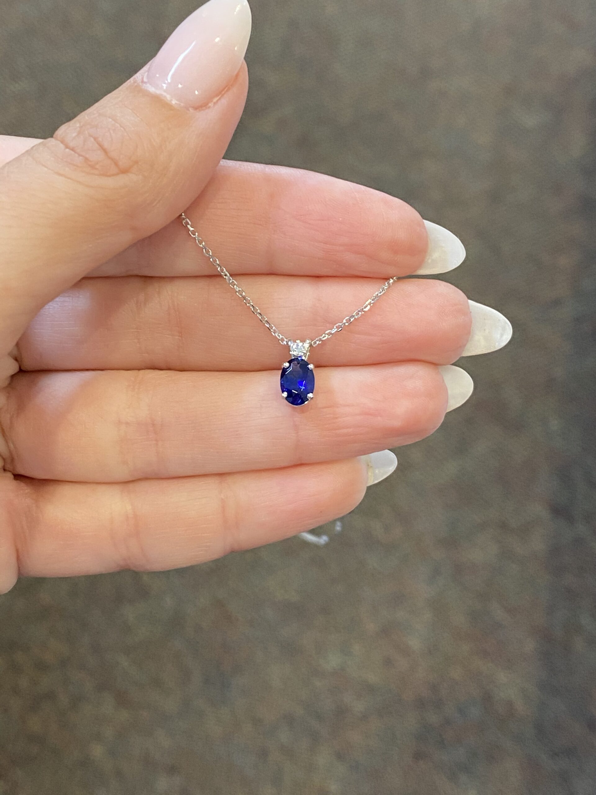 14k white gold genuine .75 cttw oval shaped, vacated Ceylon Sapphire pendant with a genuine .03 cttw diamond accent on an adjustable 16-18” 14k white gold forzantina chain.