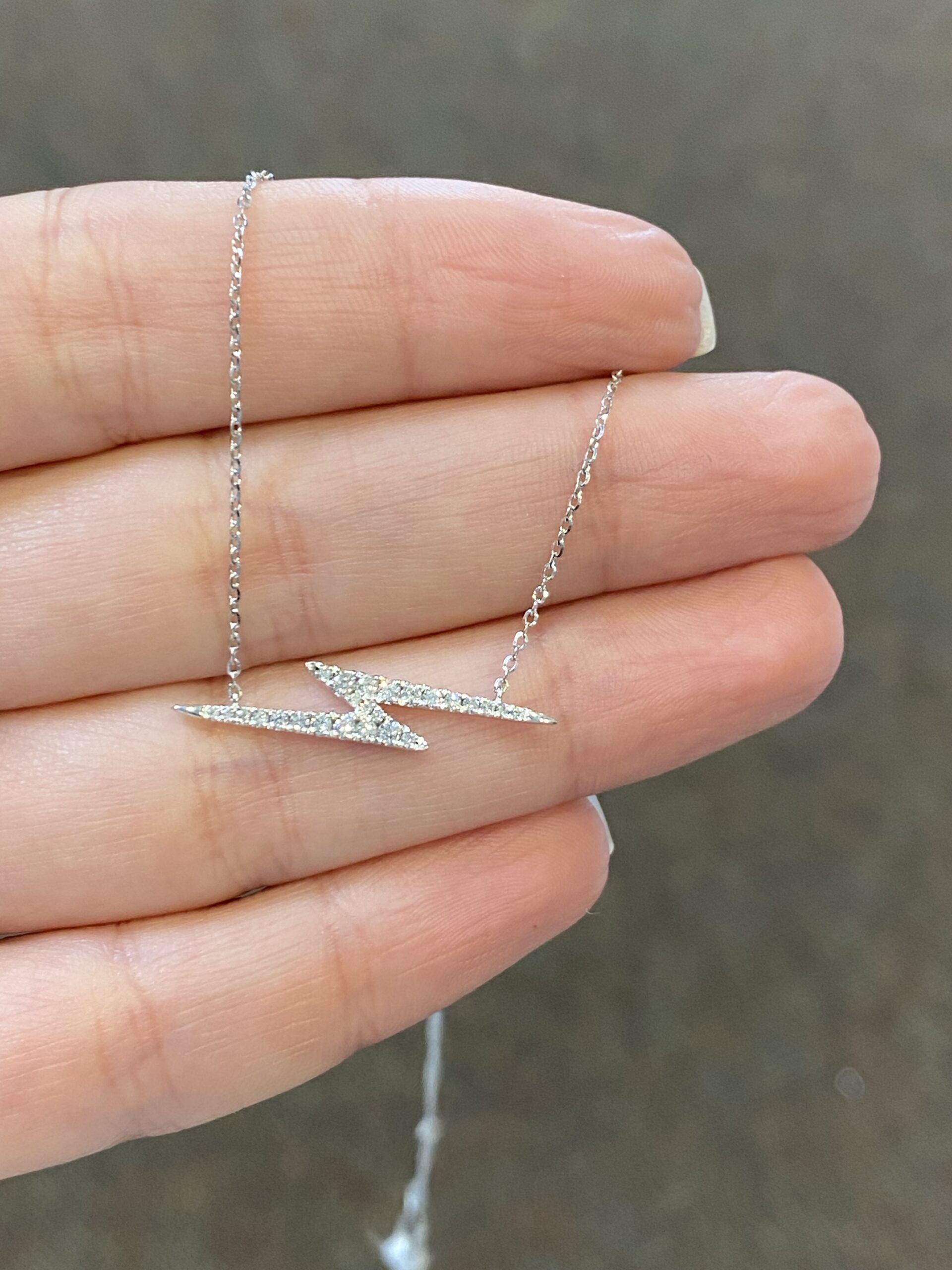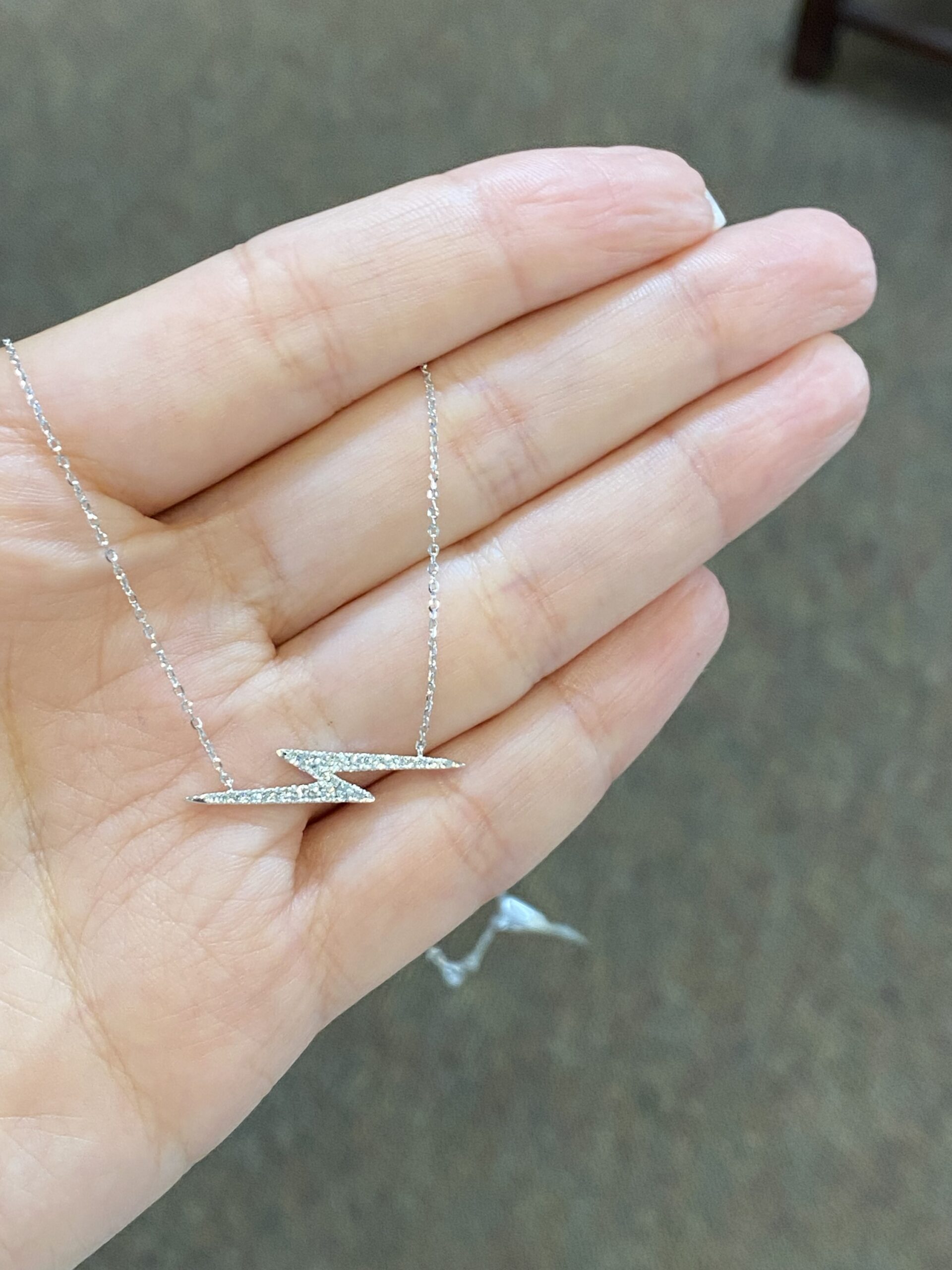14k white gold genuine .19 cttw Round Brilliant Cut diamond lightening bolt pendant. These diamonds average H-I in color, and SI in clarity. This pendant is adjustable 16-18”. This piece has an entire weight of 1.7 grams.
