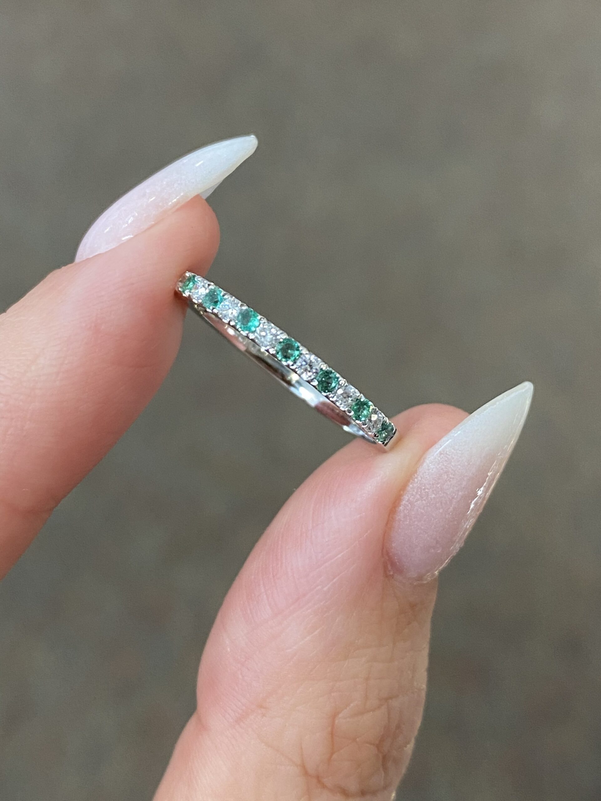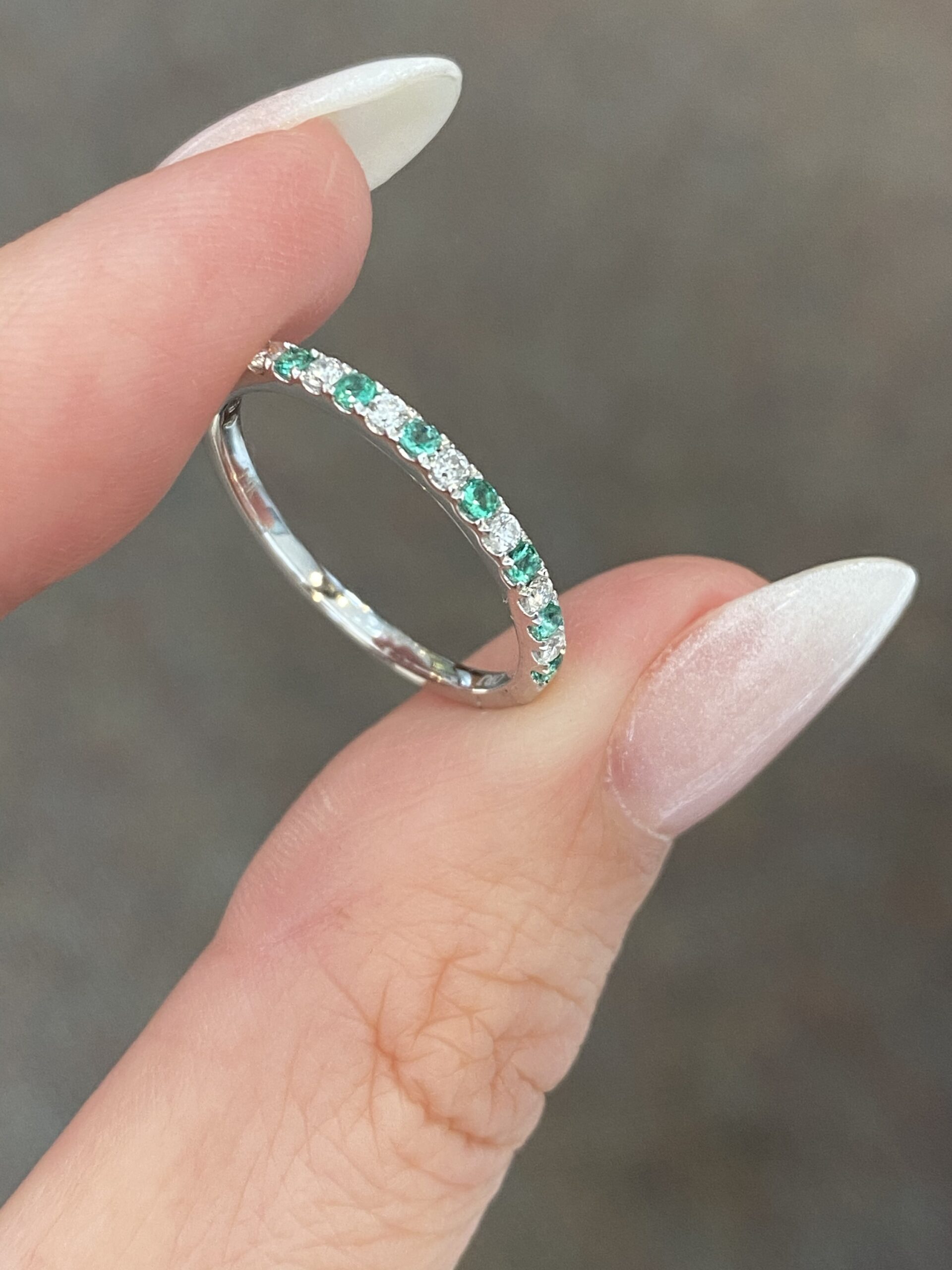 14k white gold stackable, delicate, low-profile genuine Emerald and diamond band. This band consists of 11 genuine round, faceted Emeralds, which have a total combined weight of .16/100-ct. These Emeralds have light to medium green color and very good clarity. These Emeralds are set alternately with 10 genuine Round Brilliant Cut diamonds, which have a total combined weight of .15/100-ct. These diamonds average (G-H) in color, and SI1 in clarity. This band measures 2 mm in width, and it has an entire weight of 1.4 grams. This ring is a finger size 6 3/4, but it can be reasonably sized at no charge. If you require a specific size please make note in the comments section at checkout.