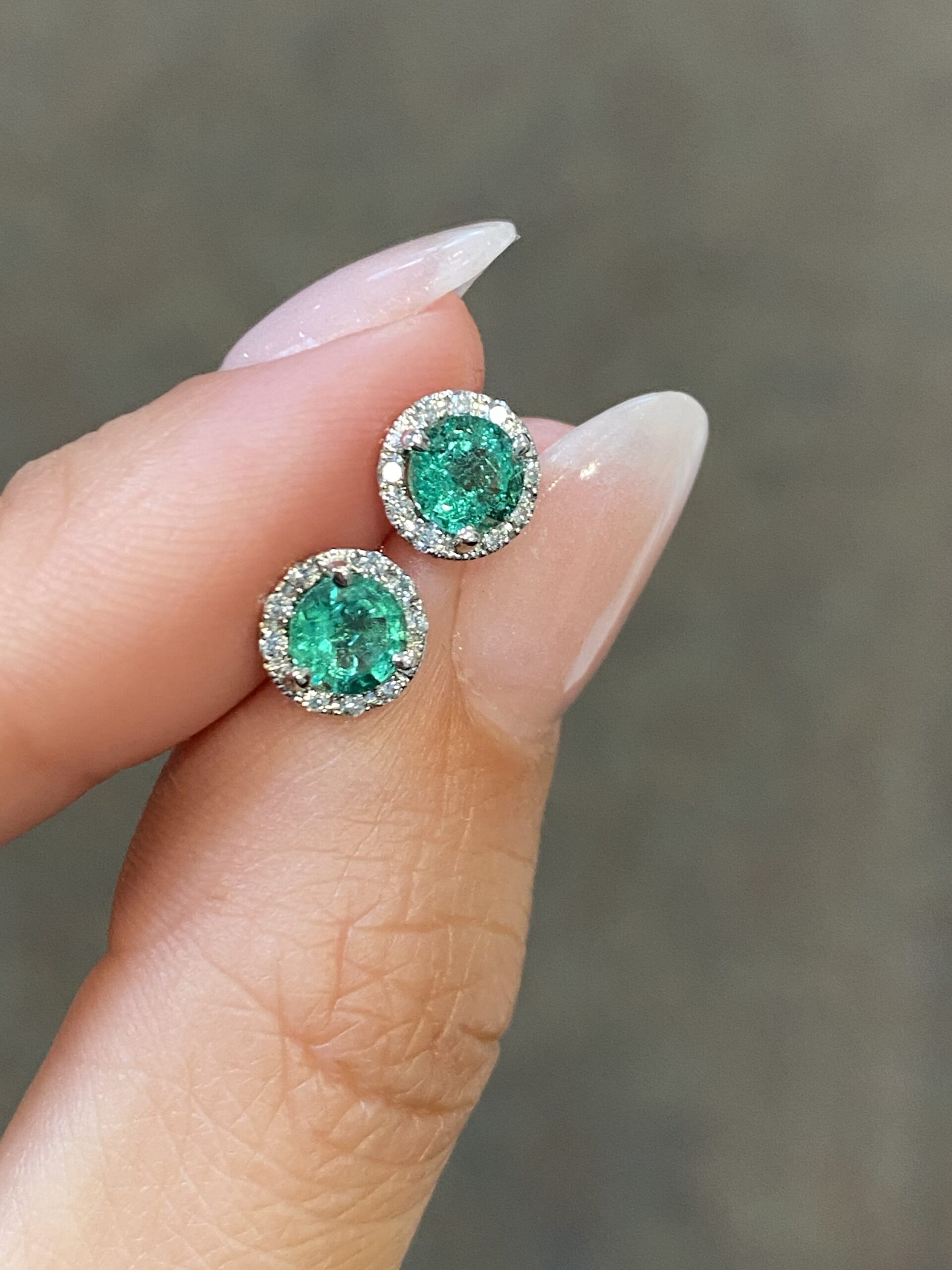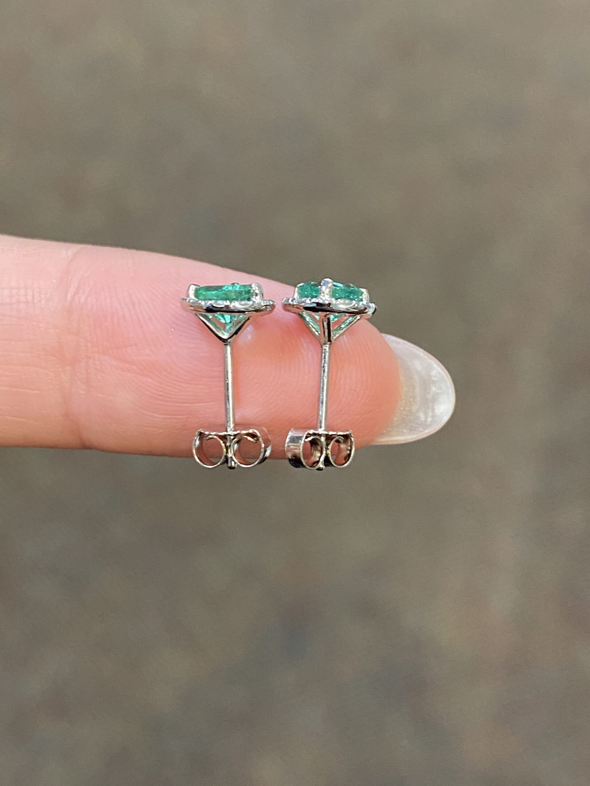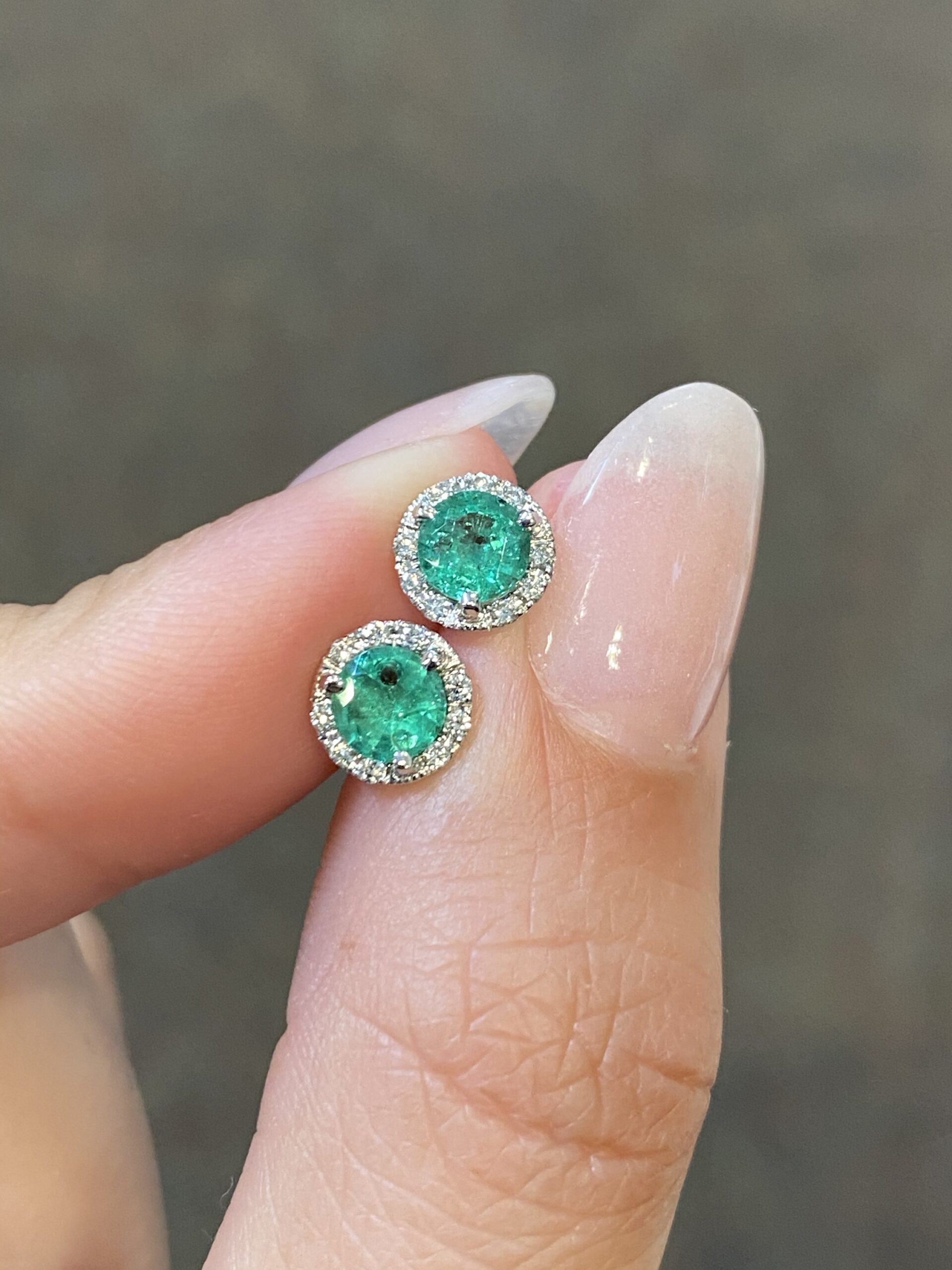 14k white gold genuine round, faceted, .94 cttw Emerald (May birthstone) & .11 cttw Round Brilliant Cut diamond halo stud earrings. These diamonds average G-H in color, and SI1 in clarity. These earrings have an entire weight of 1.0 gram. The earrings measure 7 mm in size.