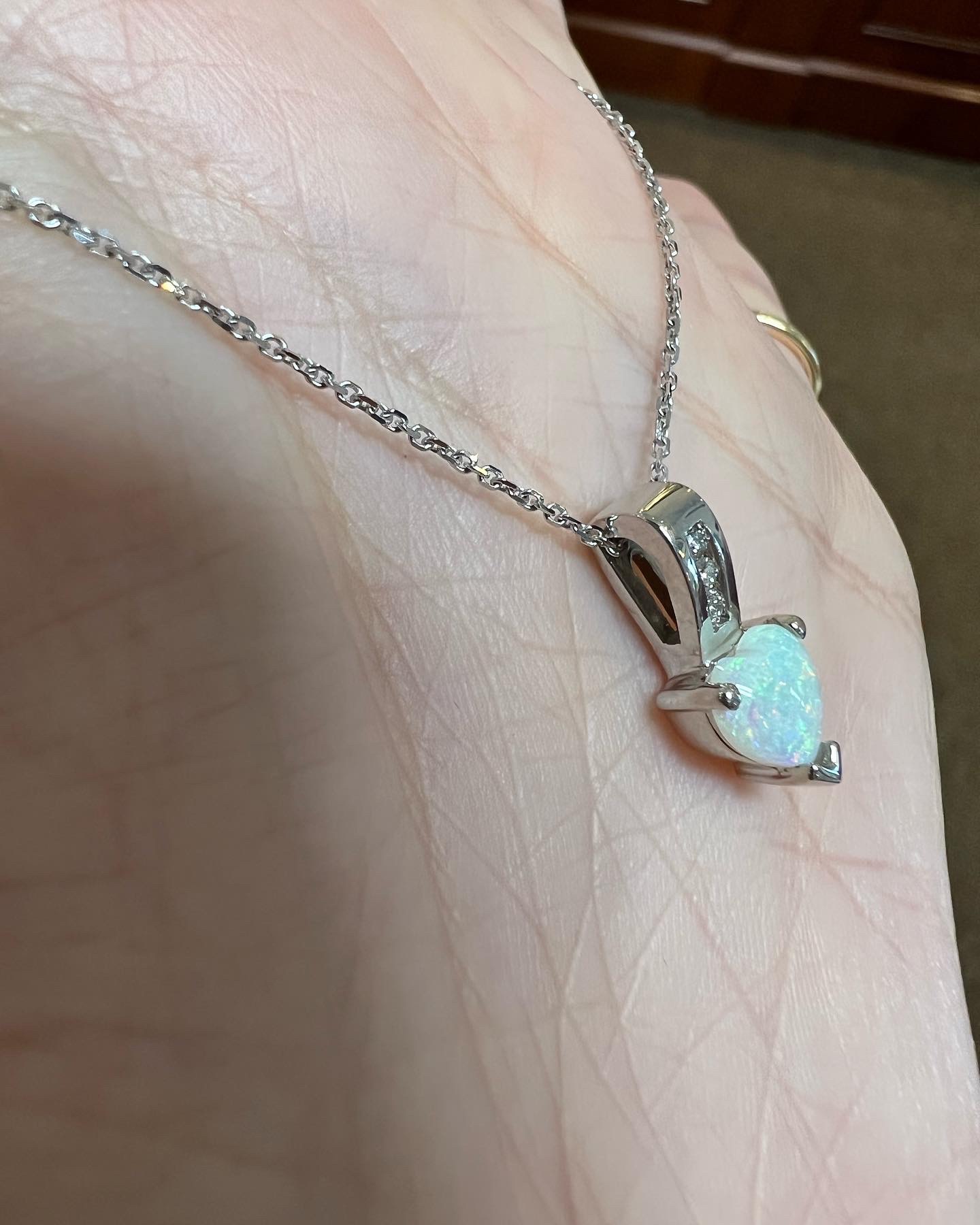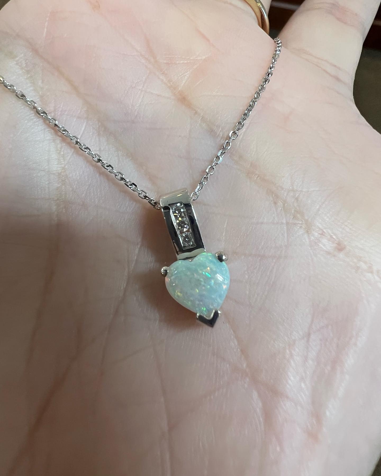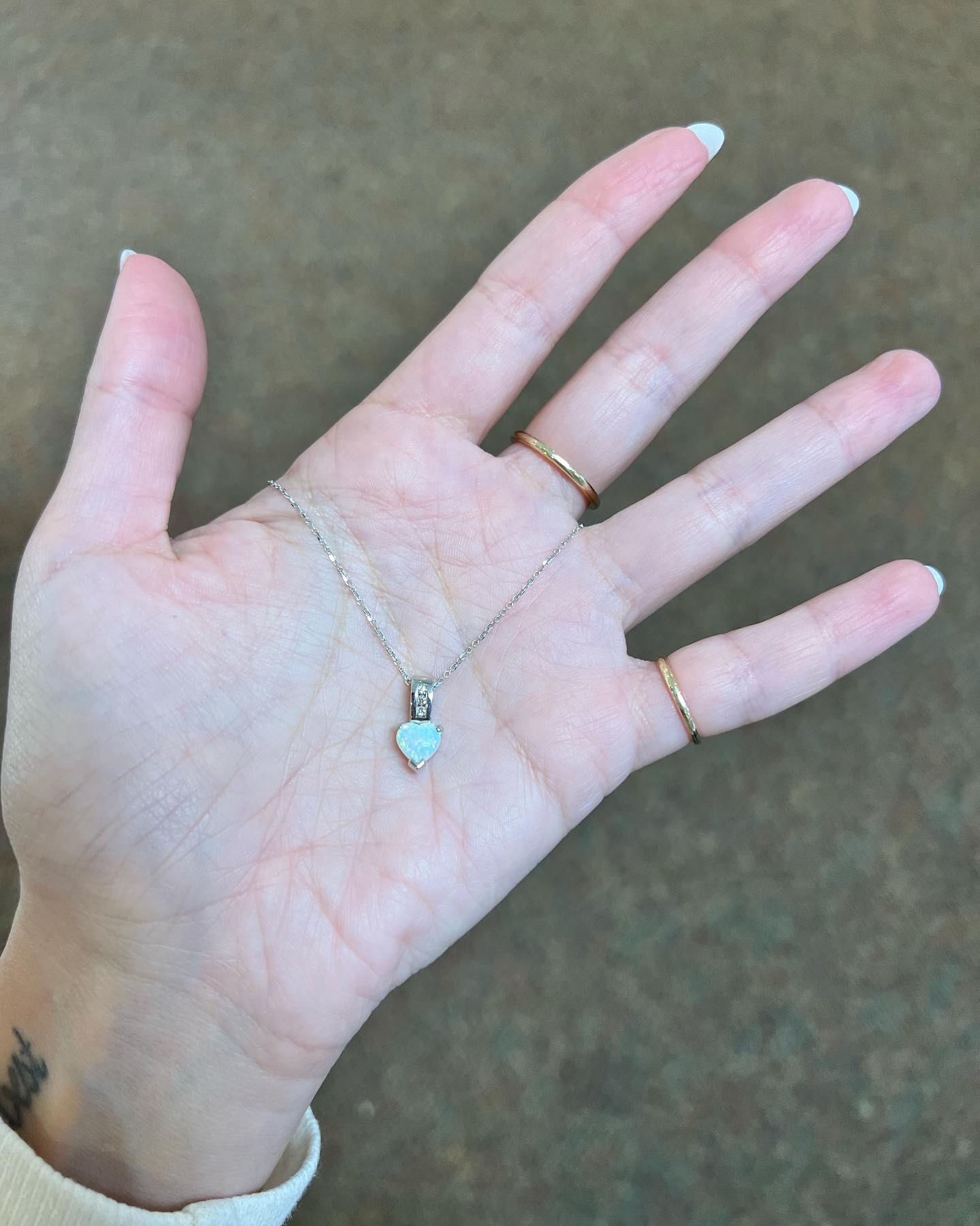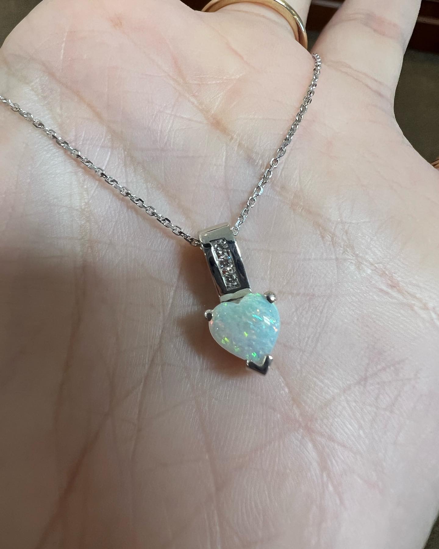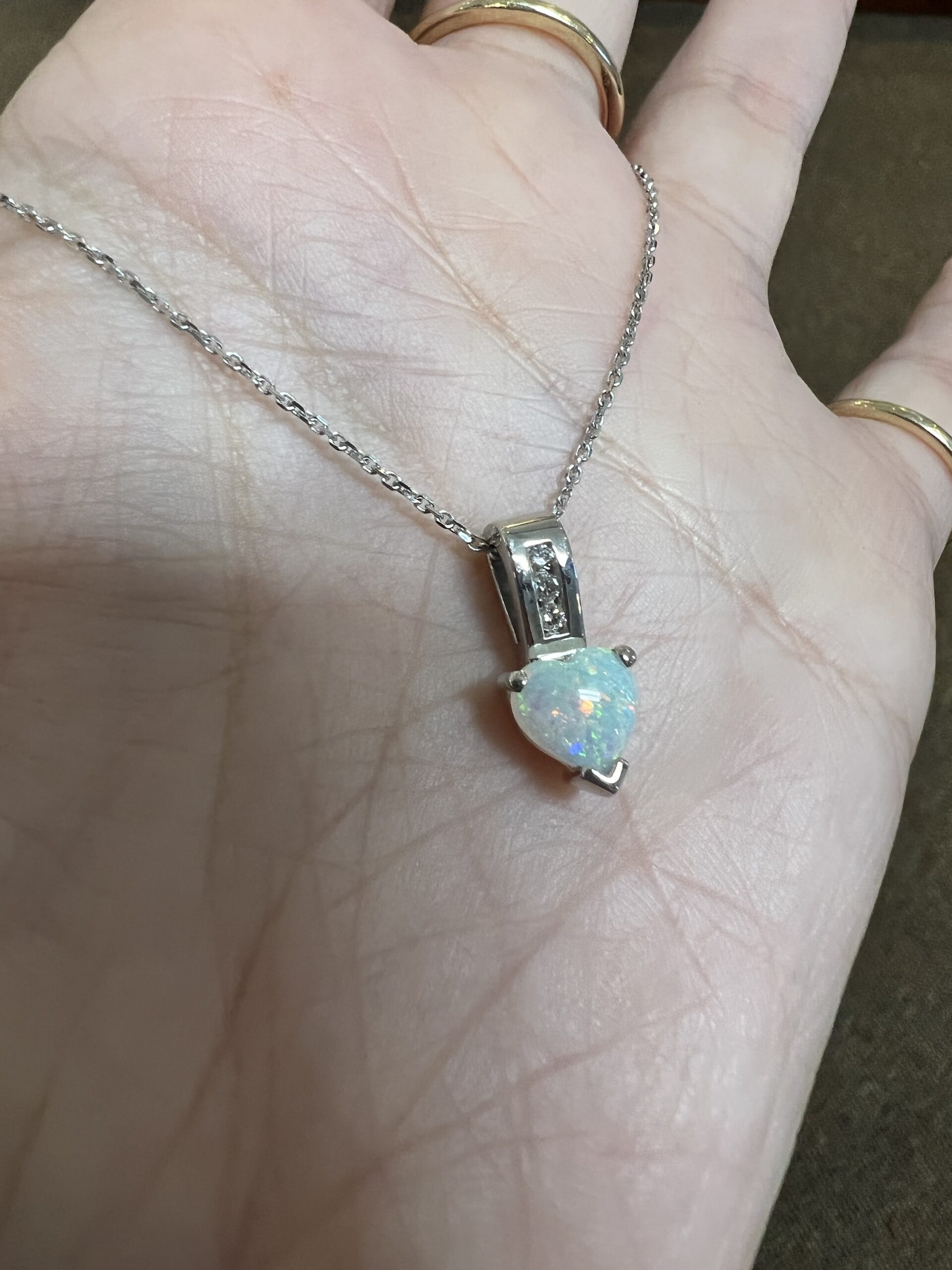 This cutie is perfect for anyone with an October birthday! 14k white gold genuine heart shaped Opal & .06 Cttw genuine Round Brilliant Cut diamond pendant, measuring 18” in total length. (Only one like this available!)