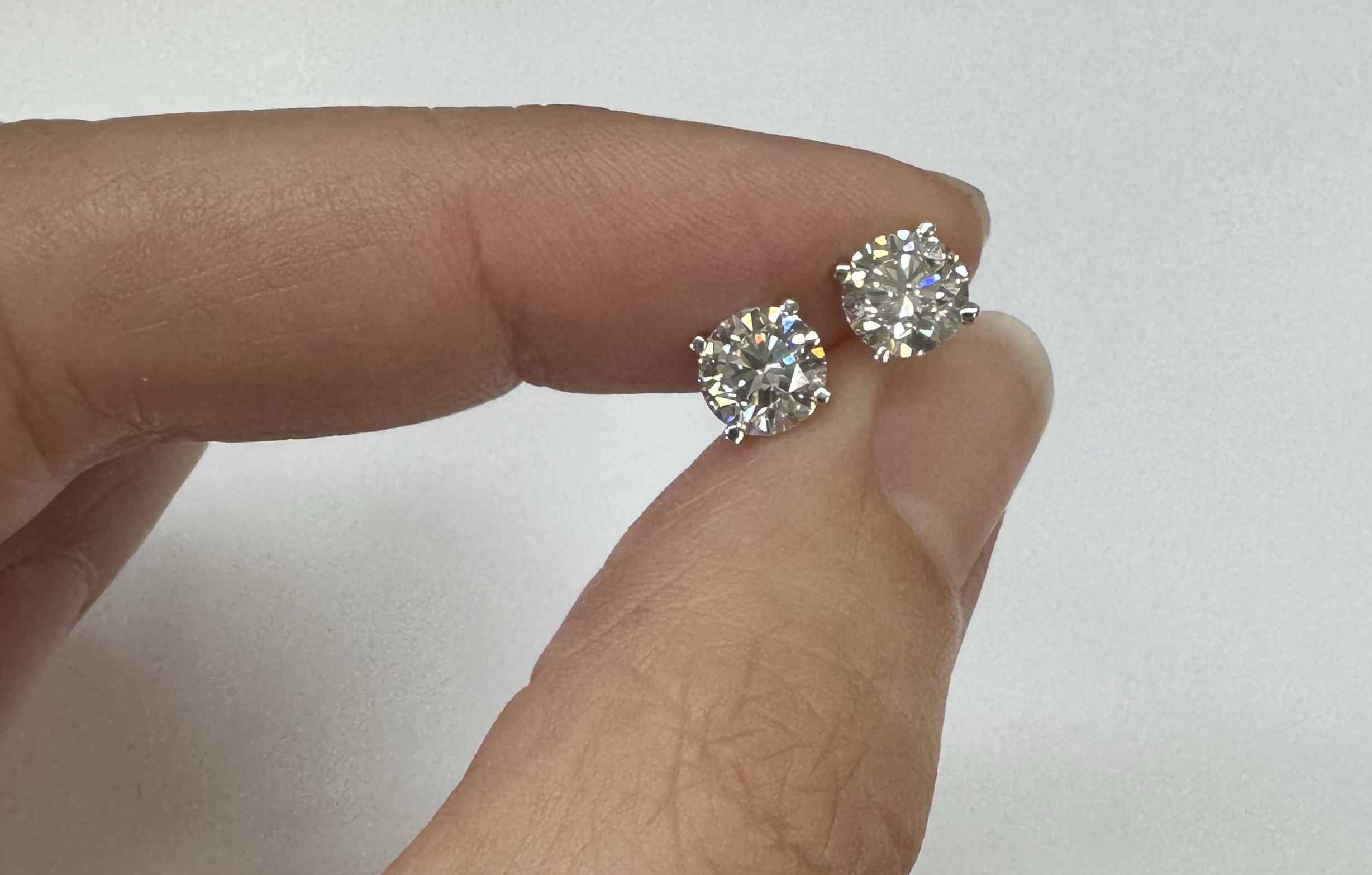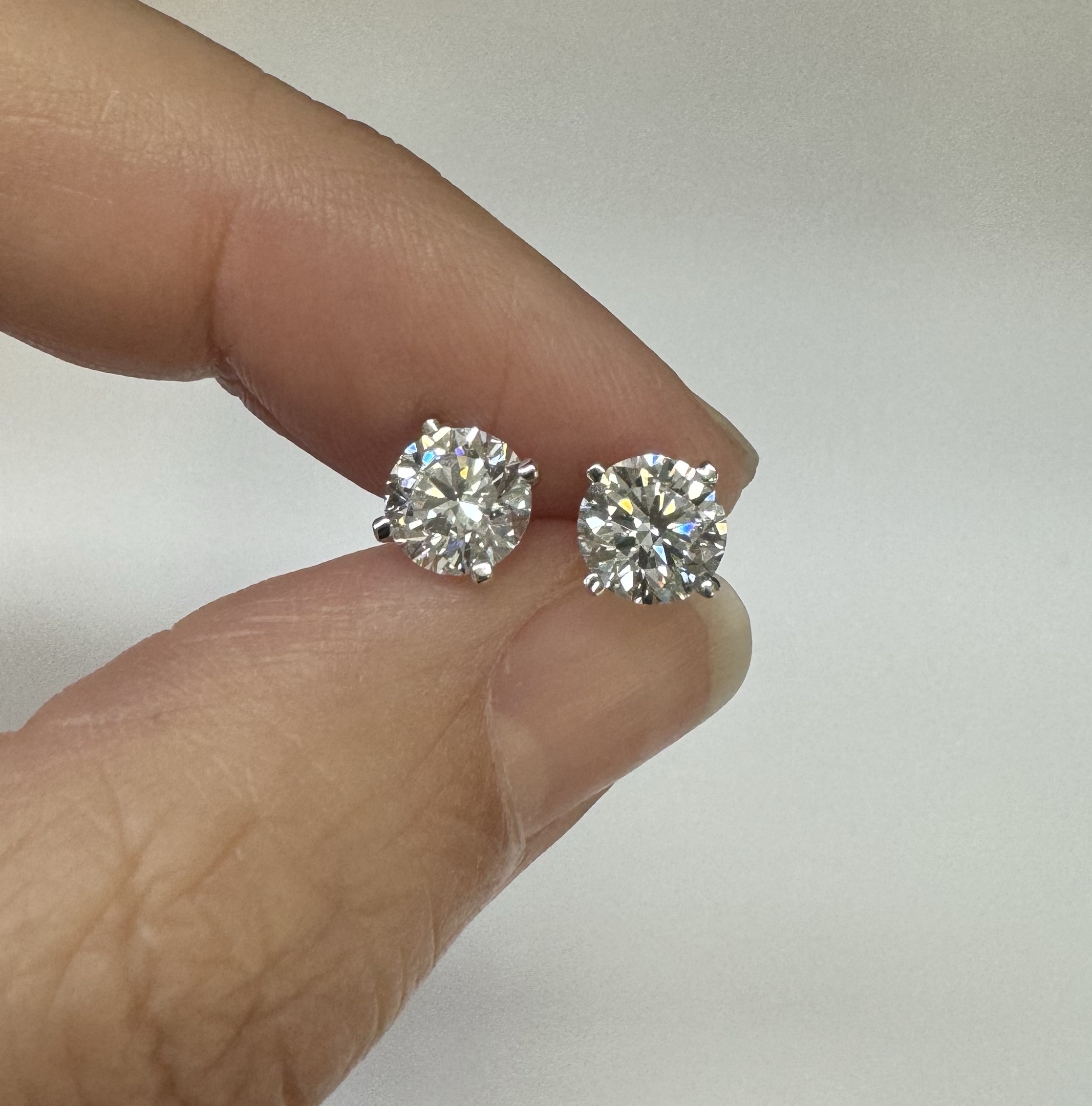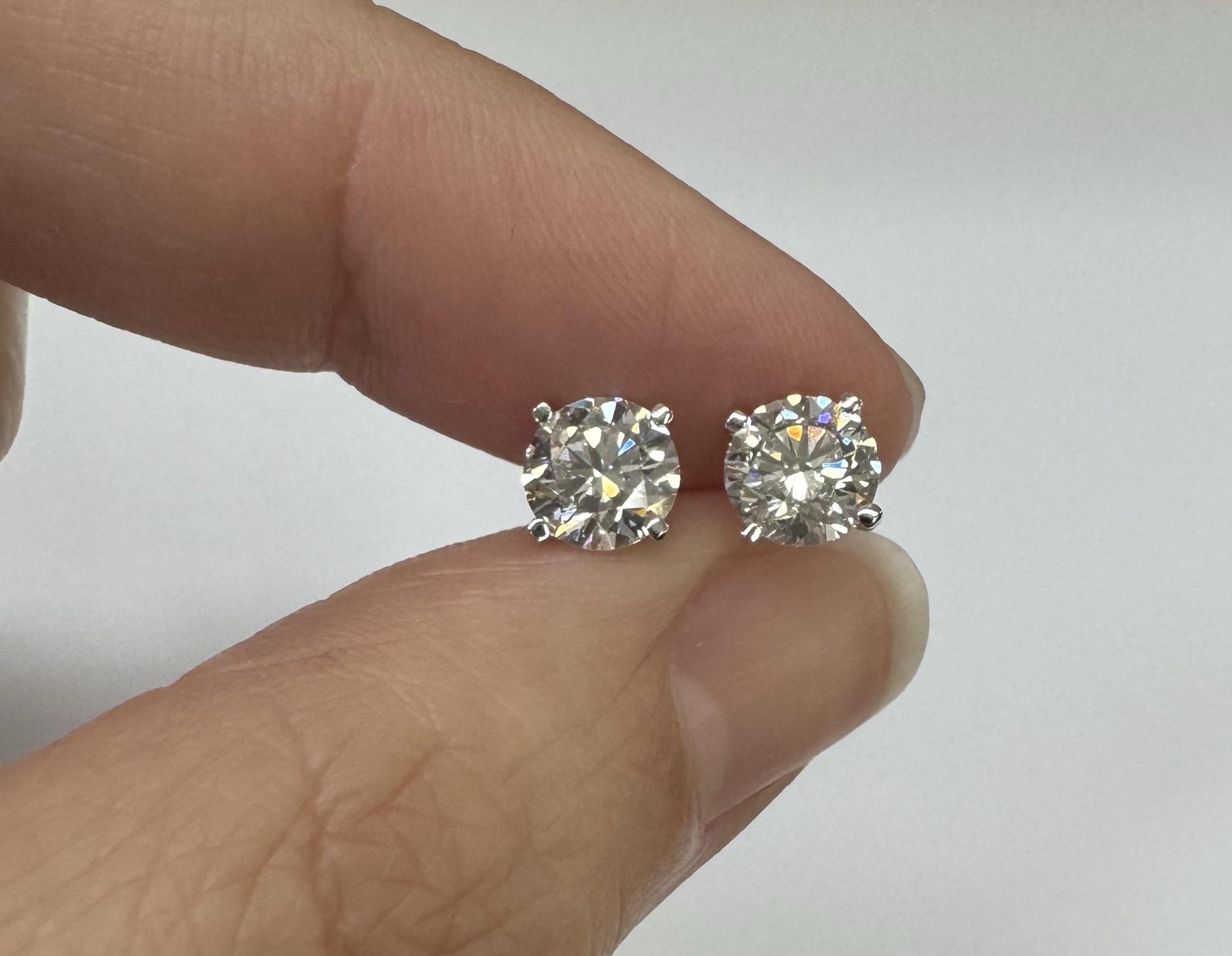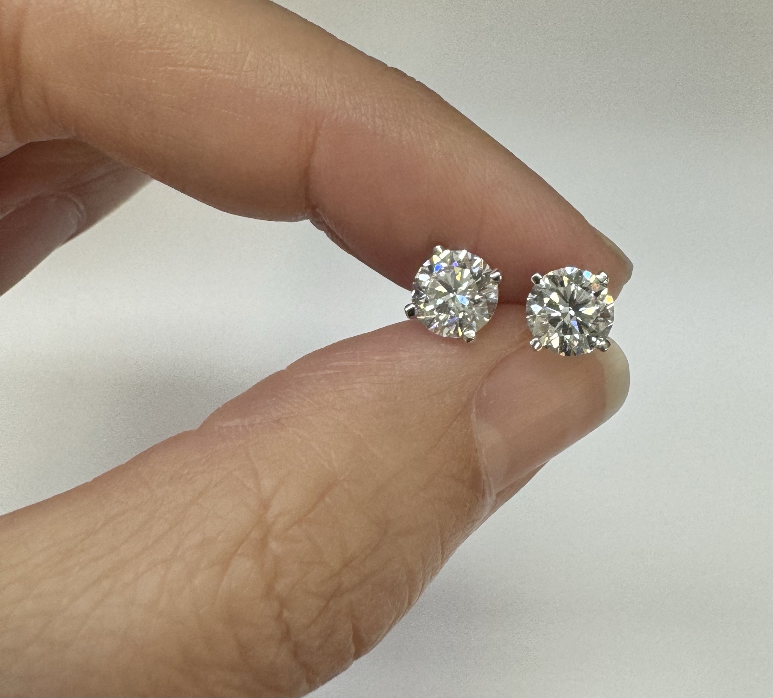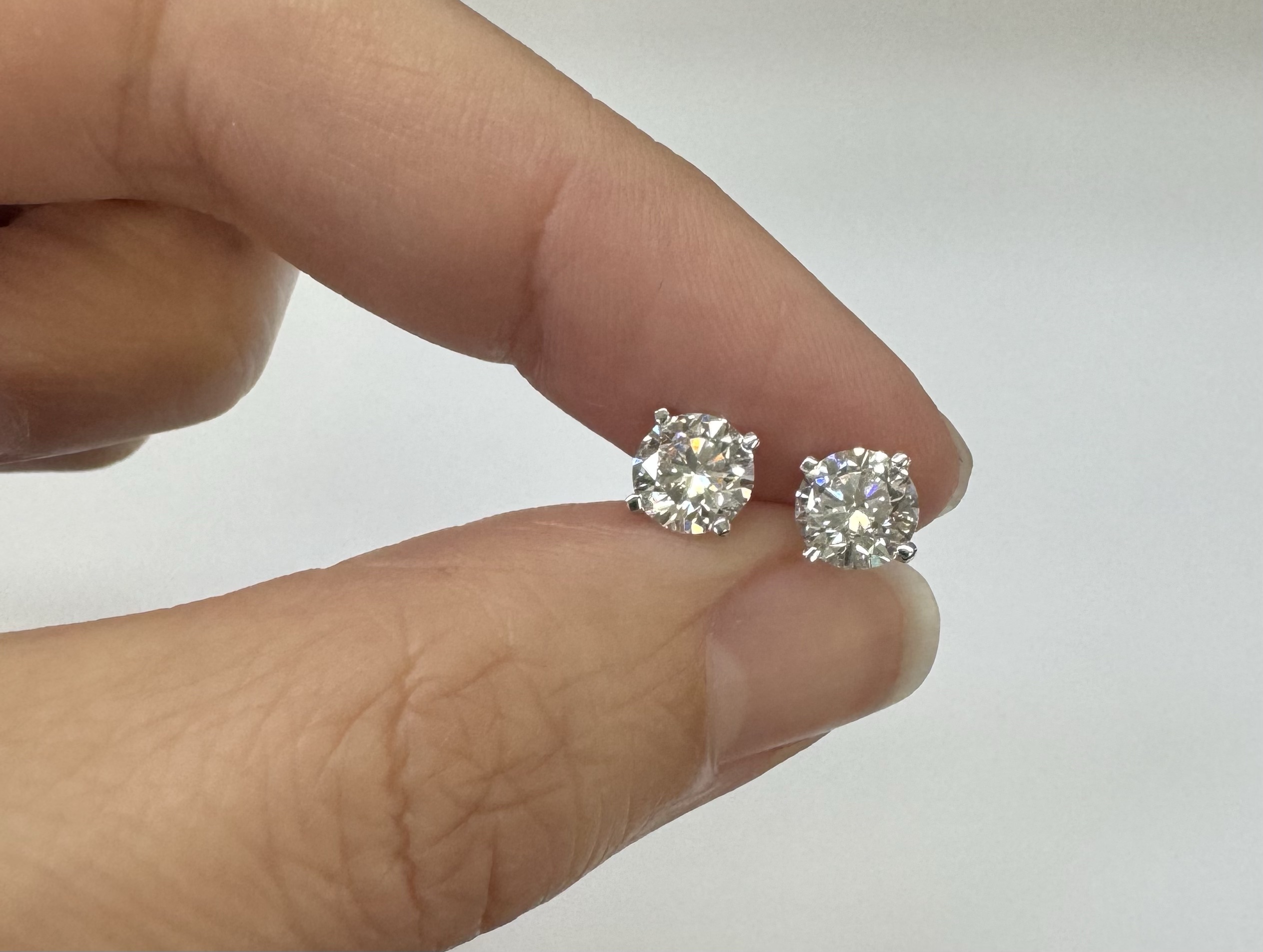 14k white gold genuine 1.50 cttw Lab Grown Round Brilliant Cut diamond 4 prong basket basket set stud earrings. These diamonds average F in color, and VS2 in clarity. These diamonds have excellent cut, excellent symmetry, excellent polish, and no fluorescence. These earrings have an entire weight of 1.1.