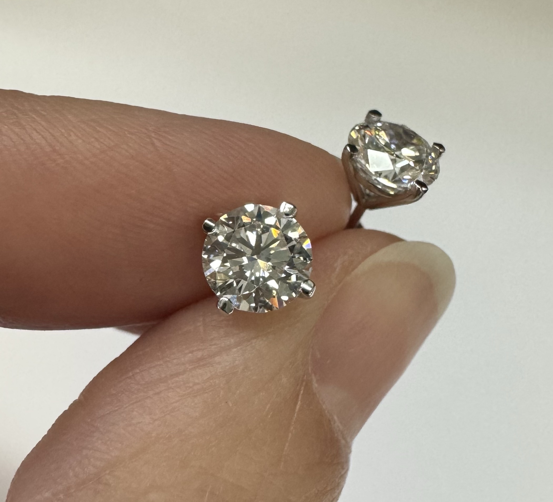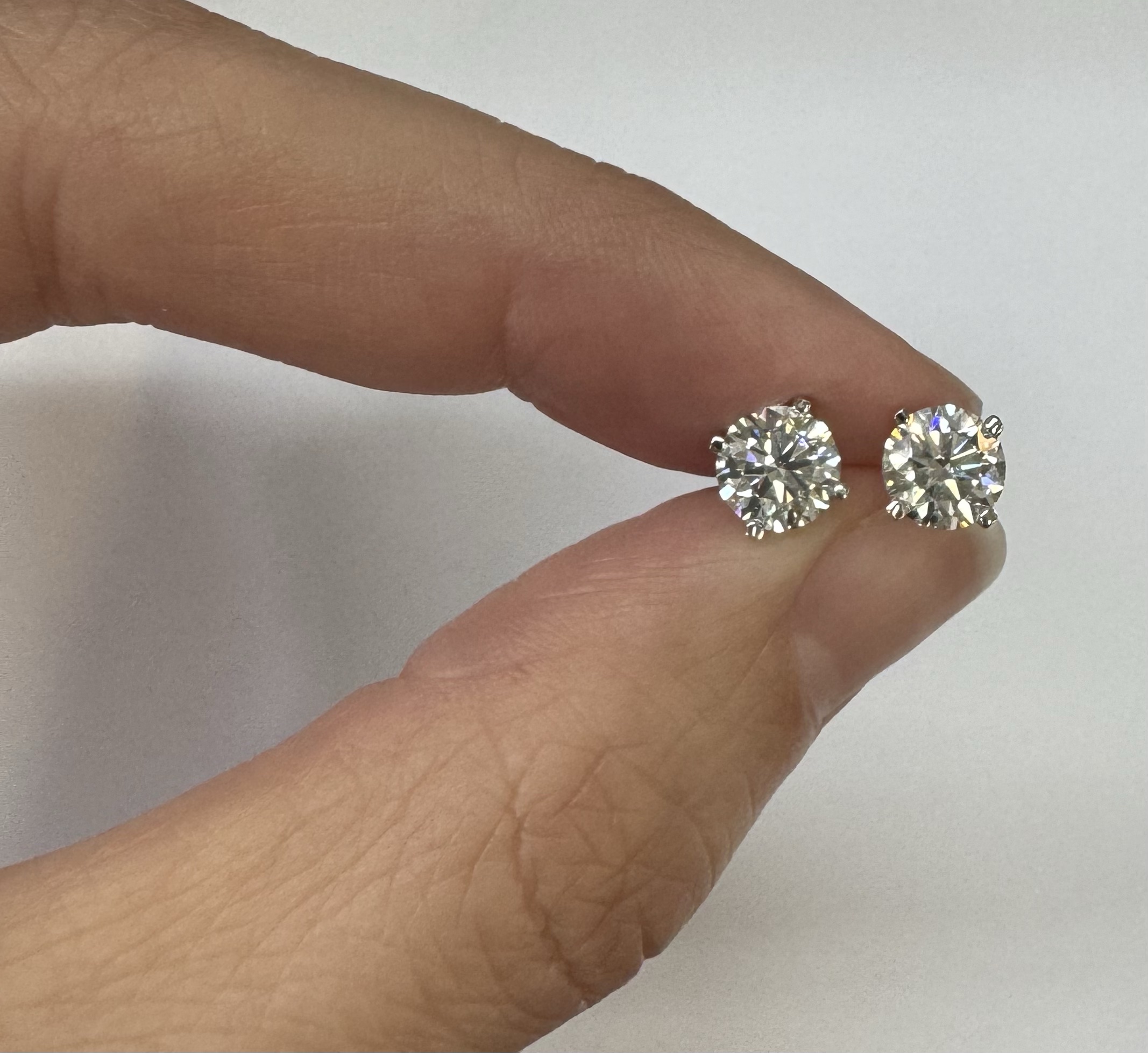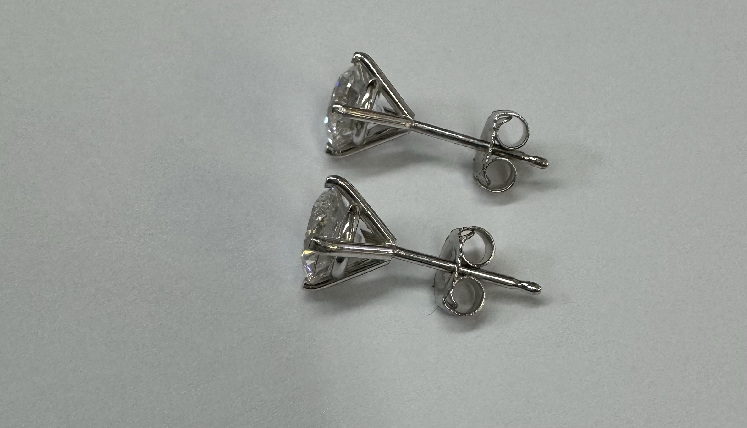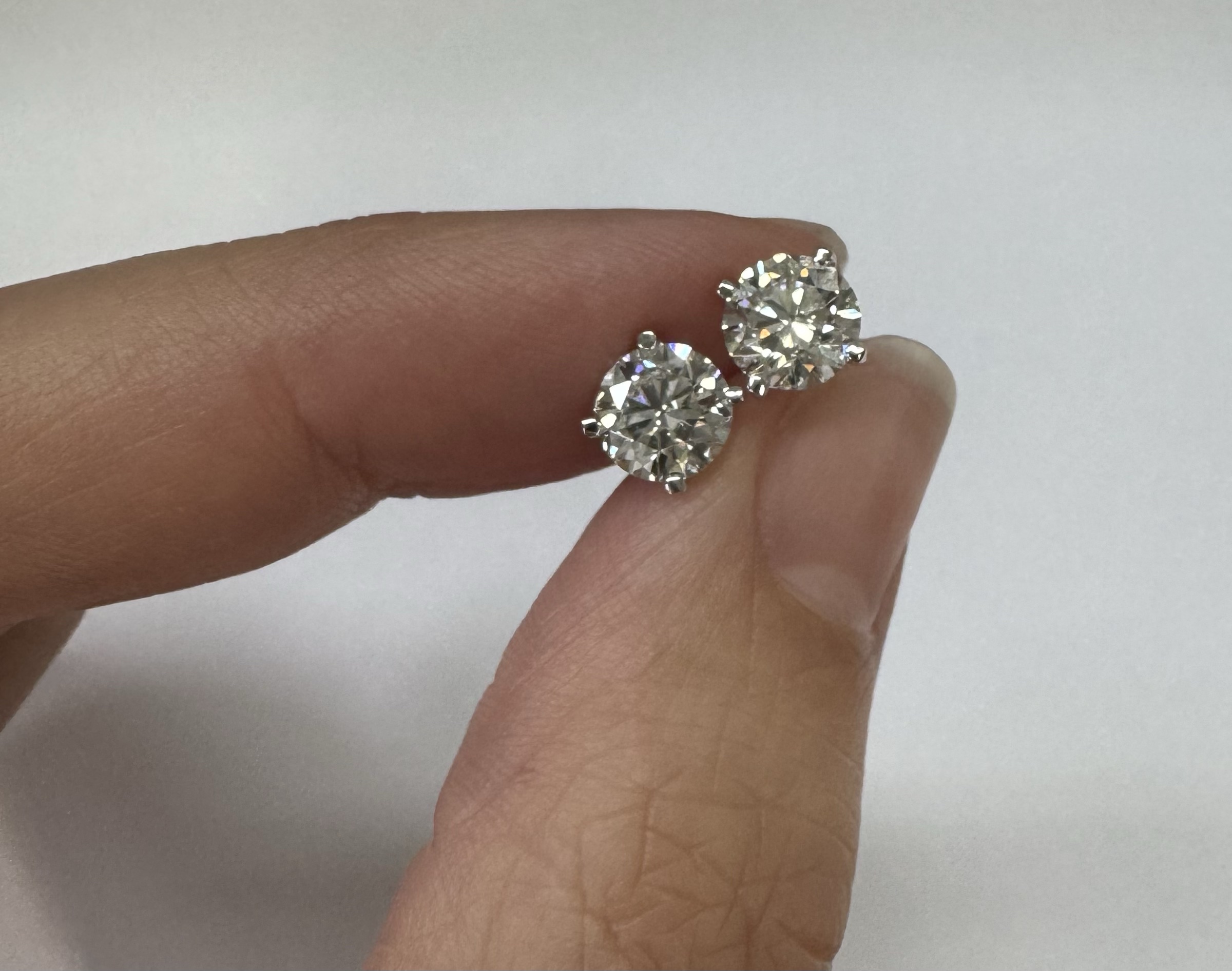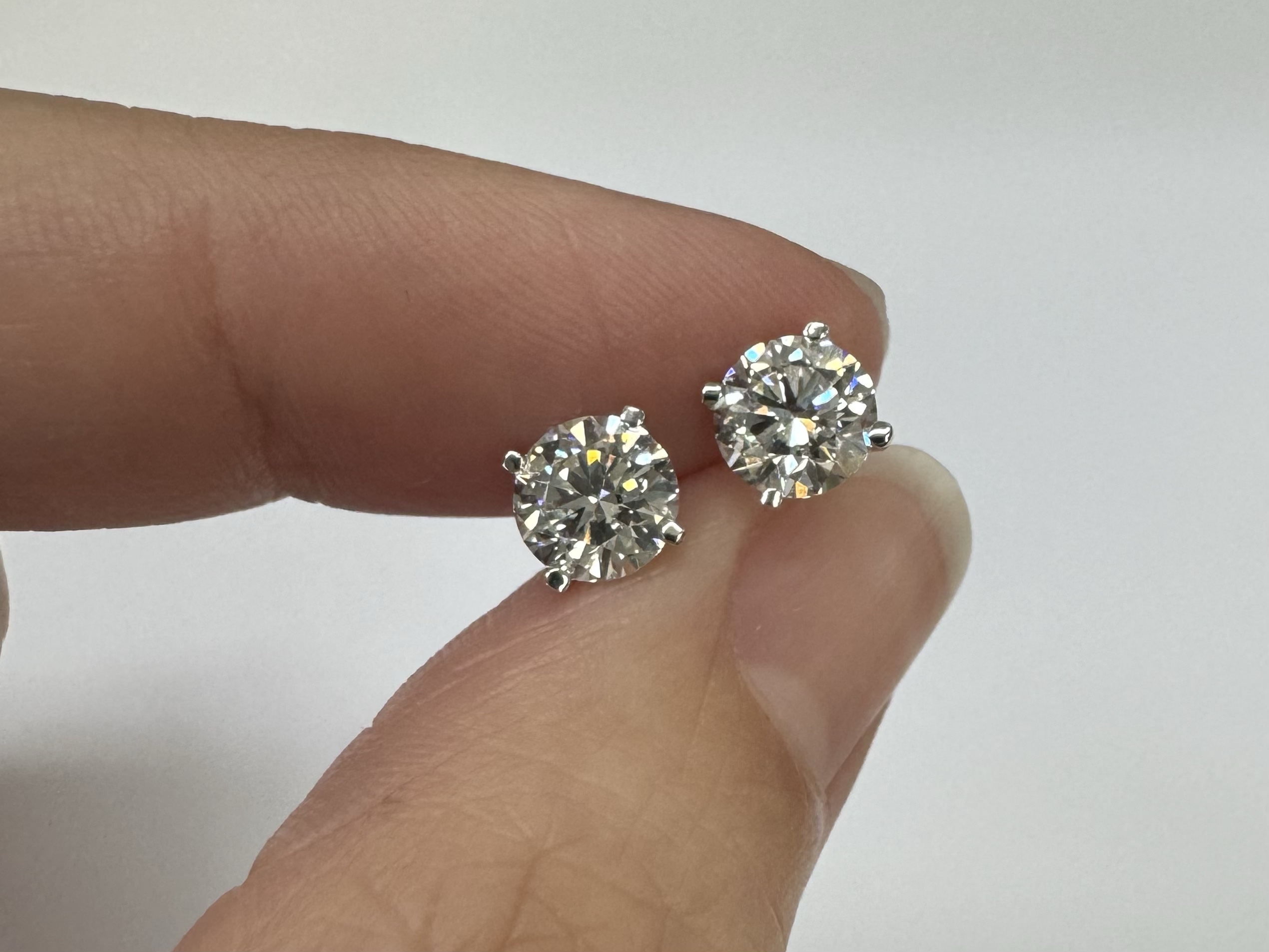 14k white gold genuine 1.50 cttw Lab Grown Round Brilliant Cut diamond 4 prong basket basket set stud earrings. These diamonds average F in color, and VS2 in clarity. These diamonds have excellent cut, excellent symmetry, excellent polish, and no fluorescence. These earrings have an entire weight of 1.1.