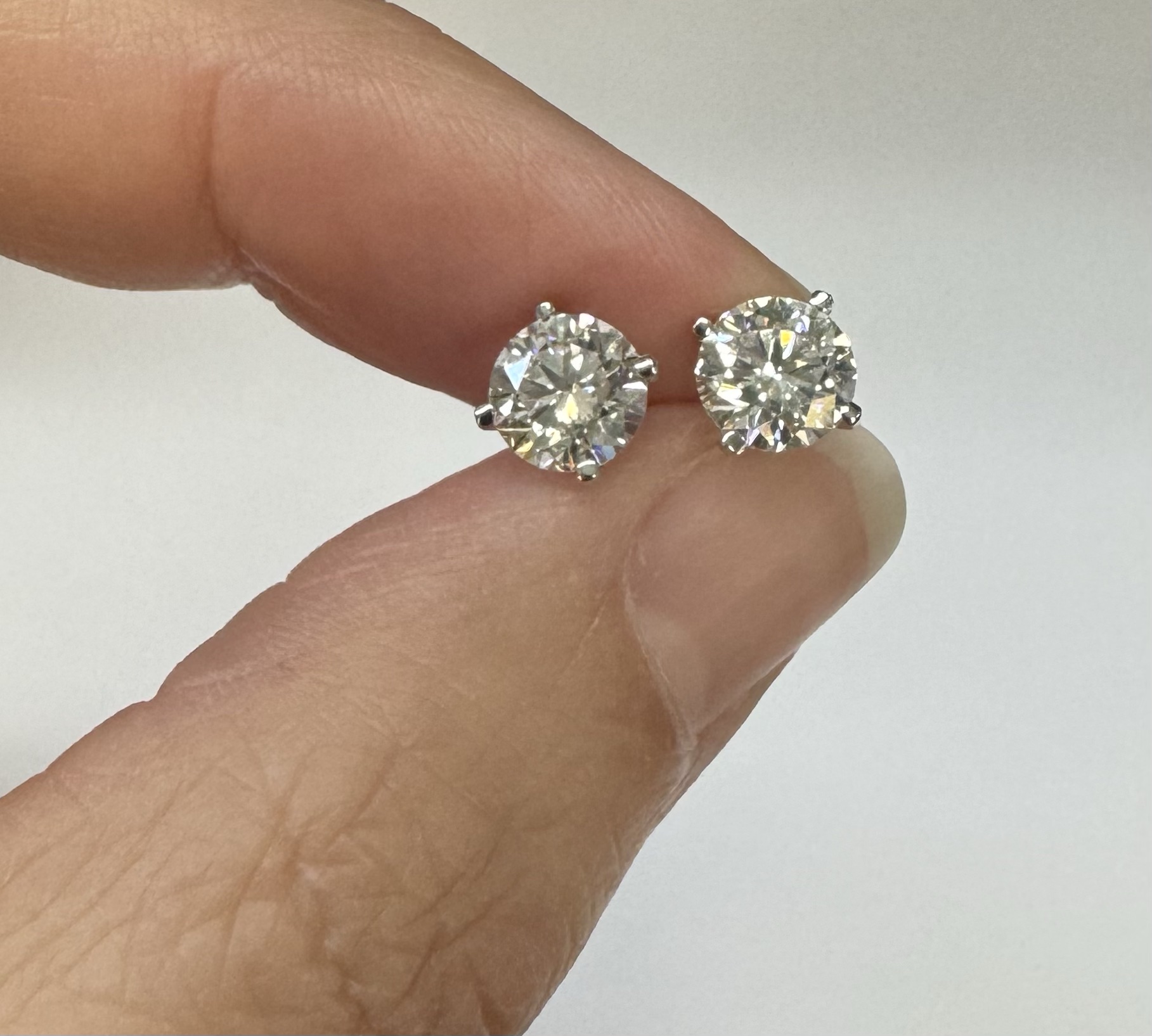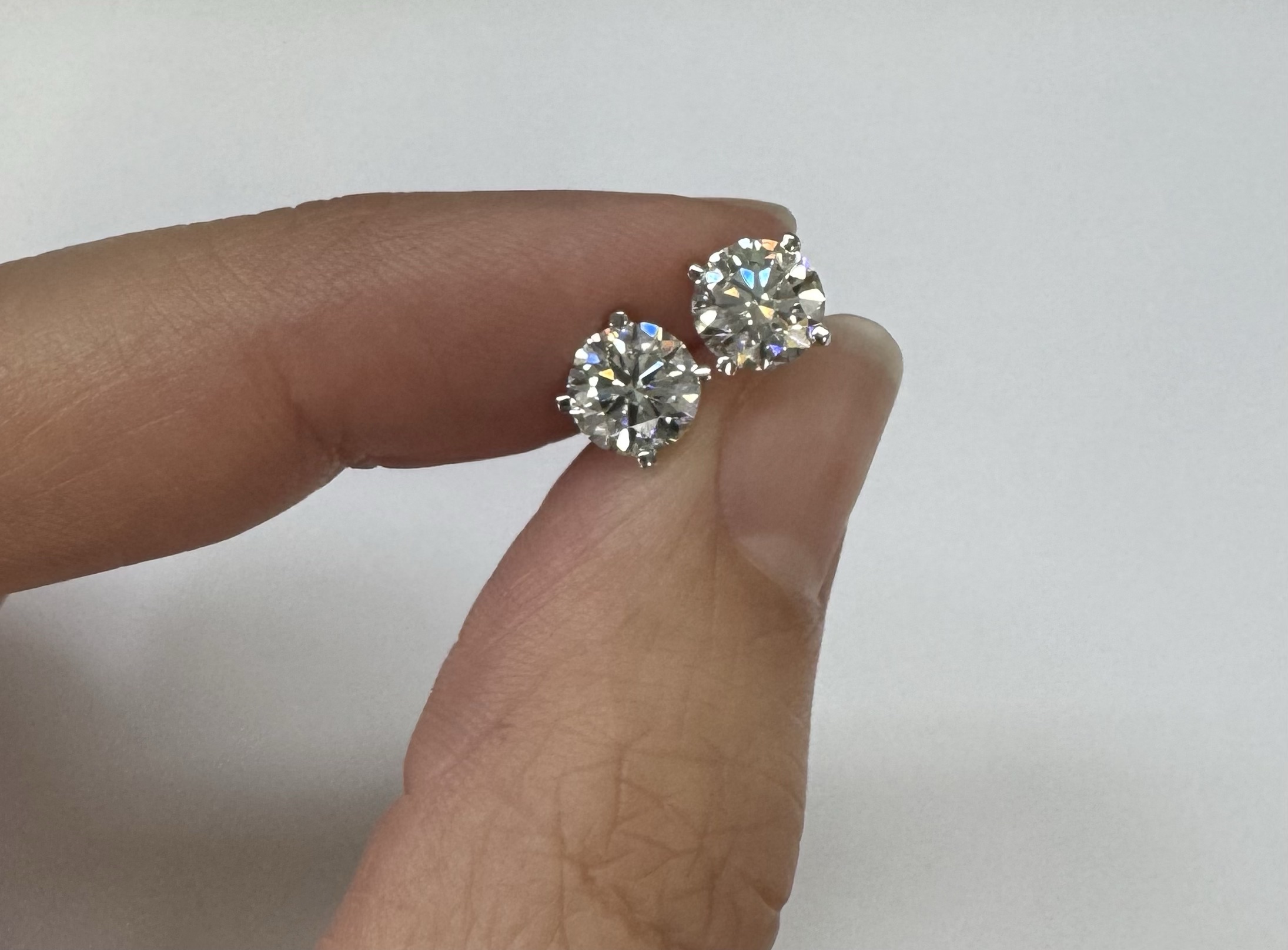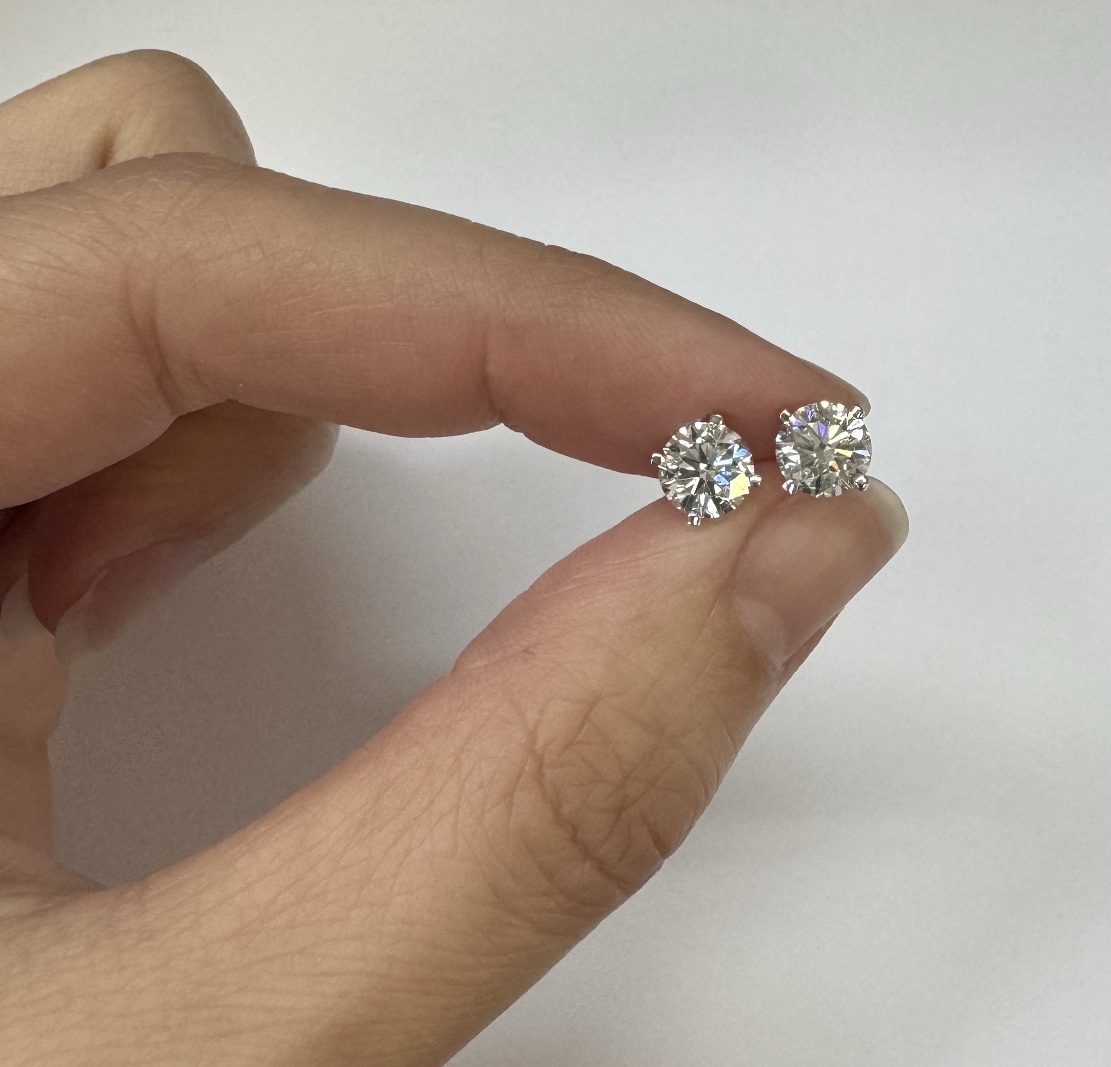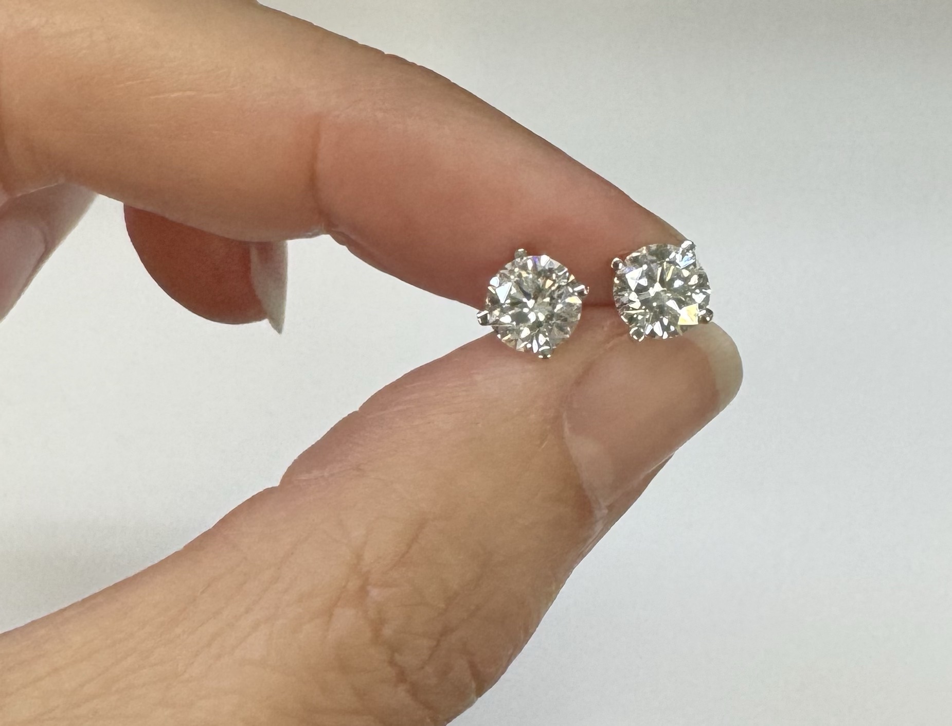 14k white gold genuine 1.50 cttw Lab Grown Round Brilliant Cut diamond 4 prong basket basket set stud earrings. These diamonds average F in color, and VS2 in clarity. These diamonds have excellent cut, excellent symmetry, excellent polish, and no fluorescence. These earrings have an entire weight of 1.1.