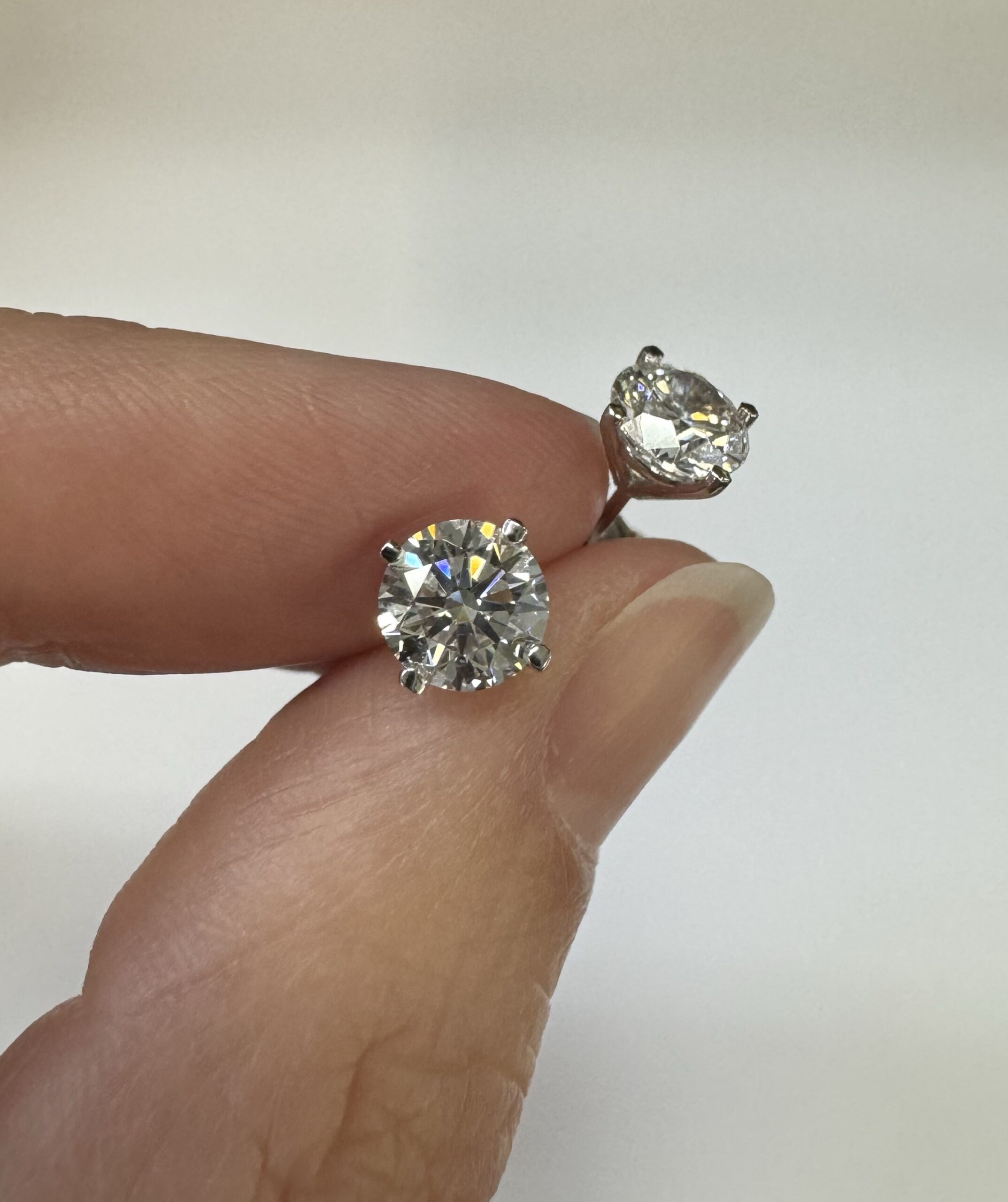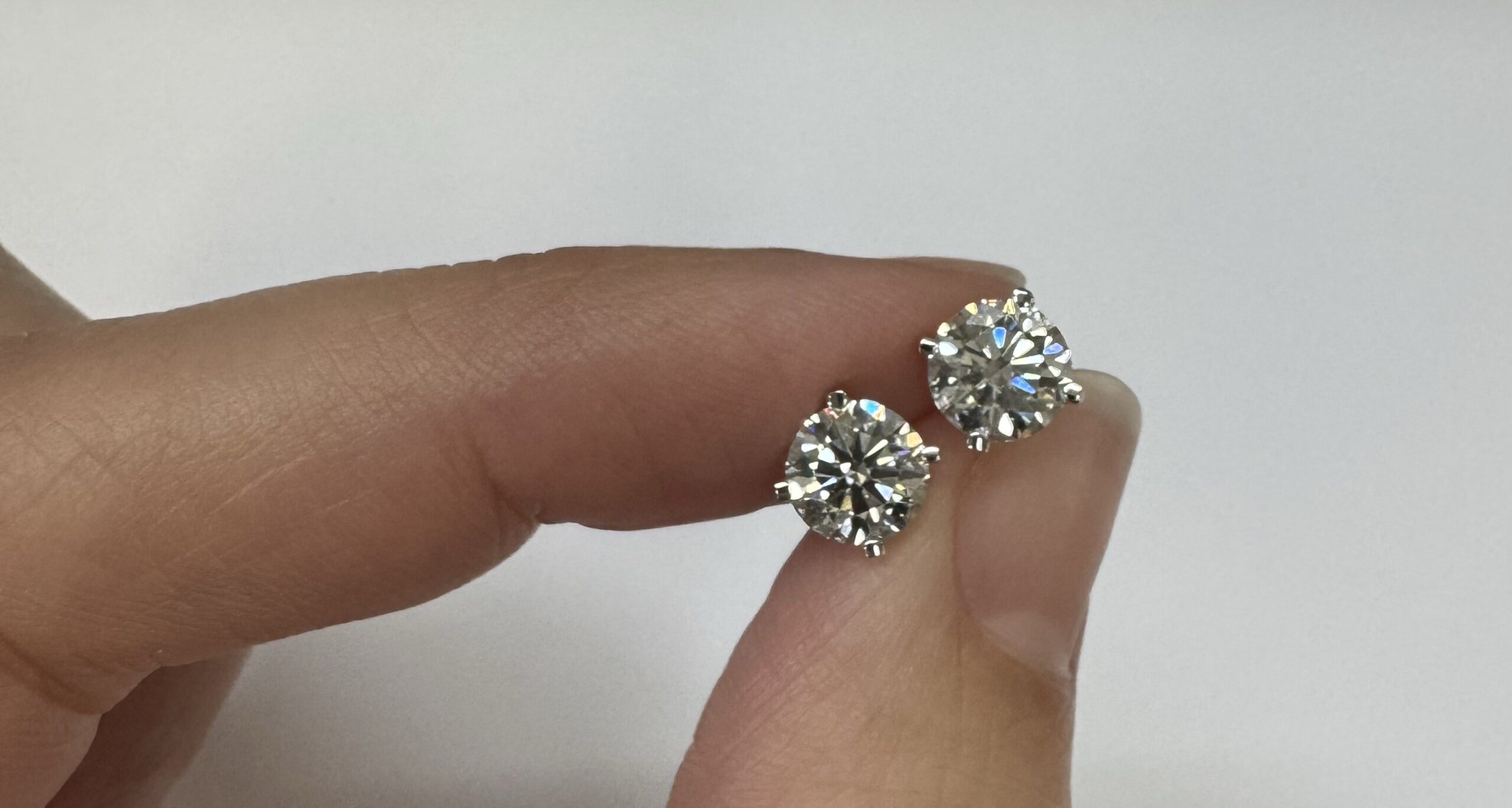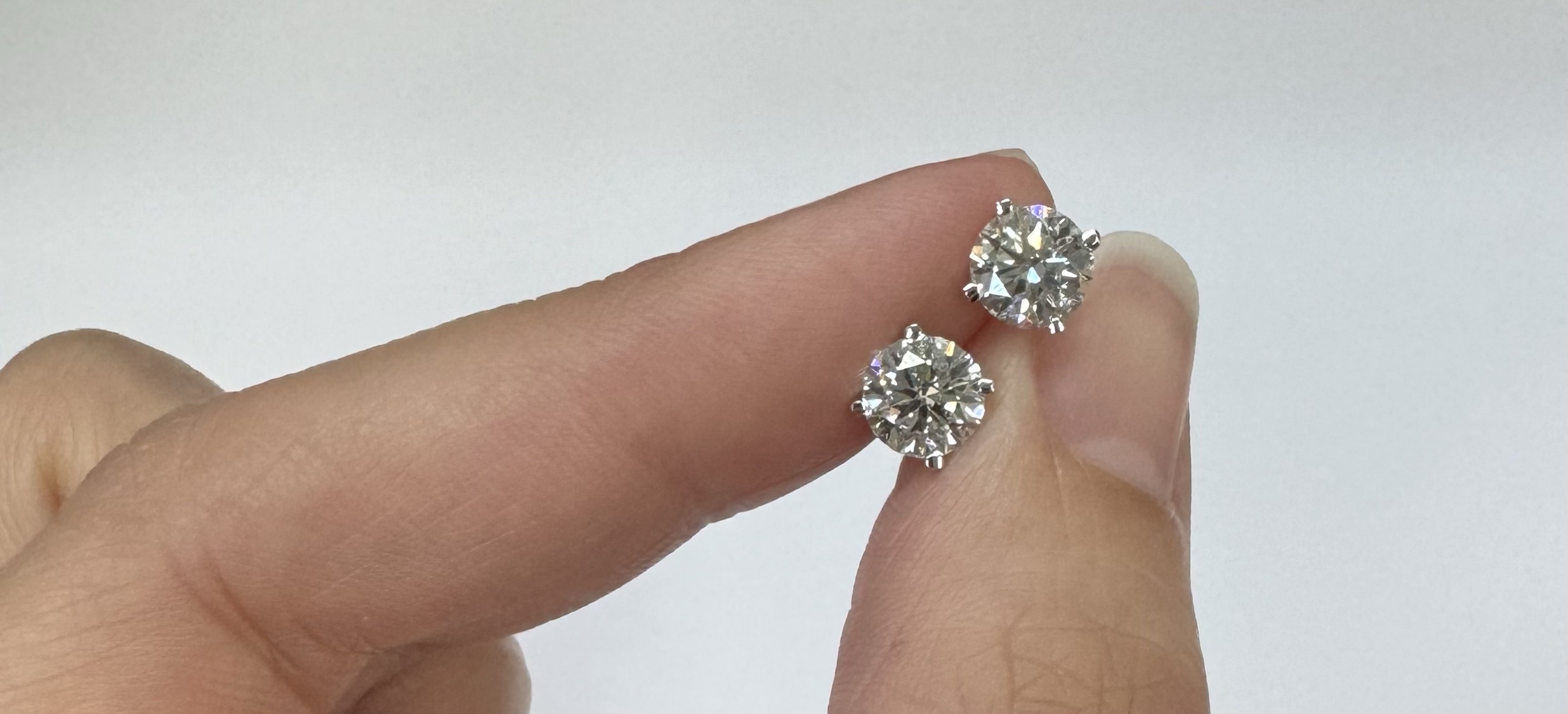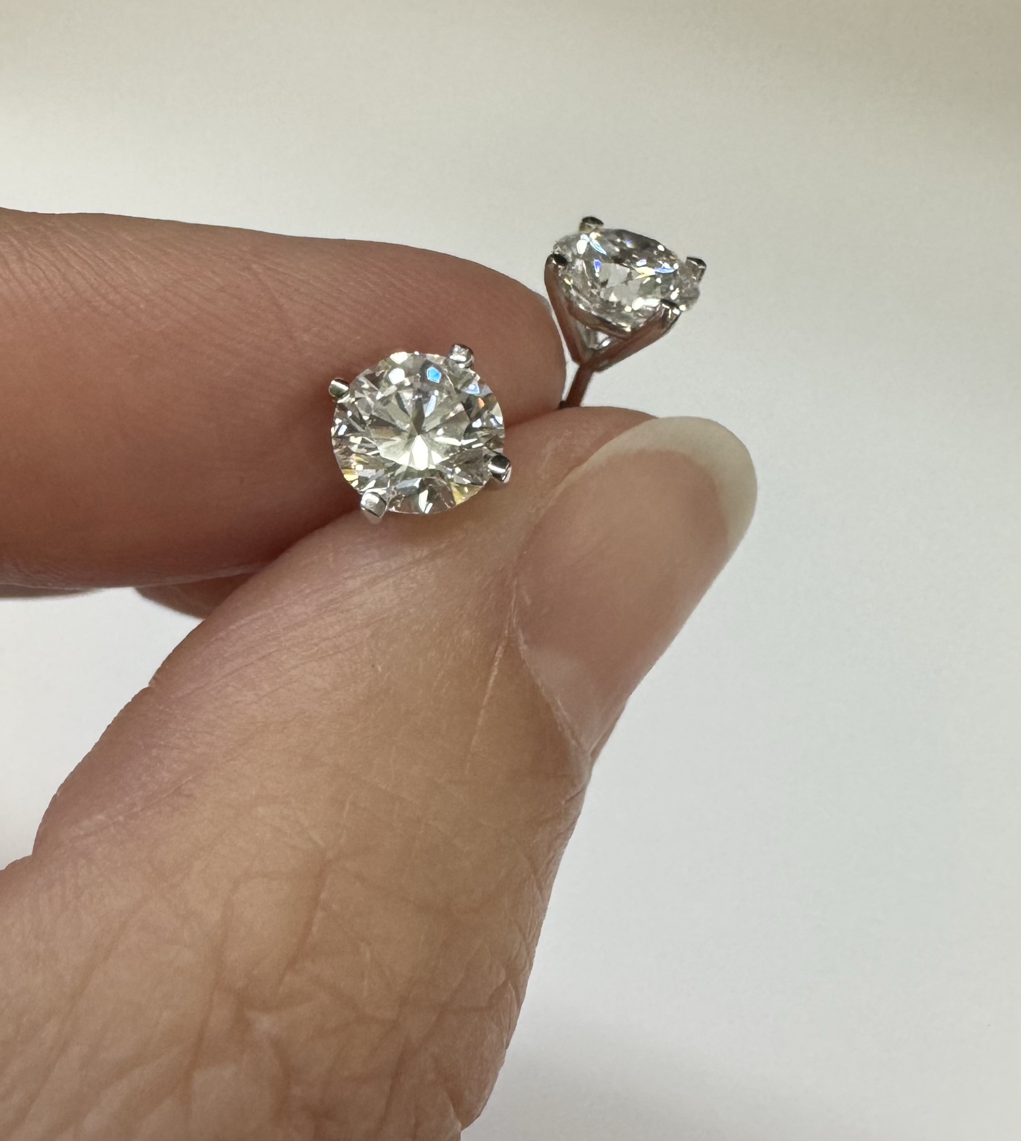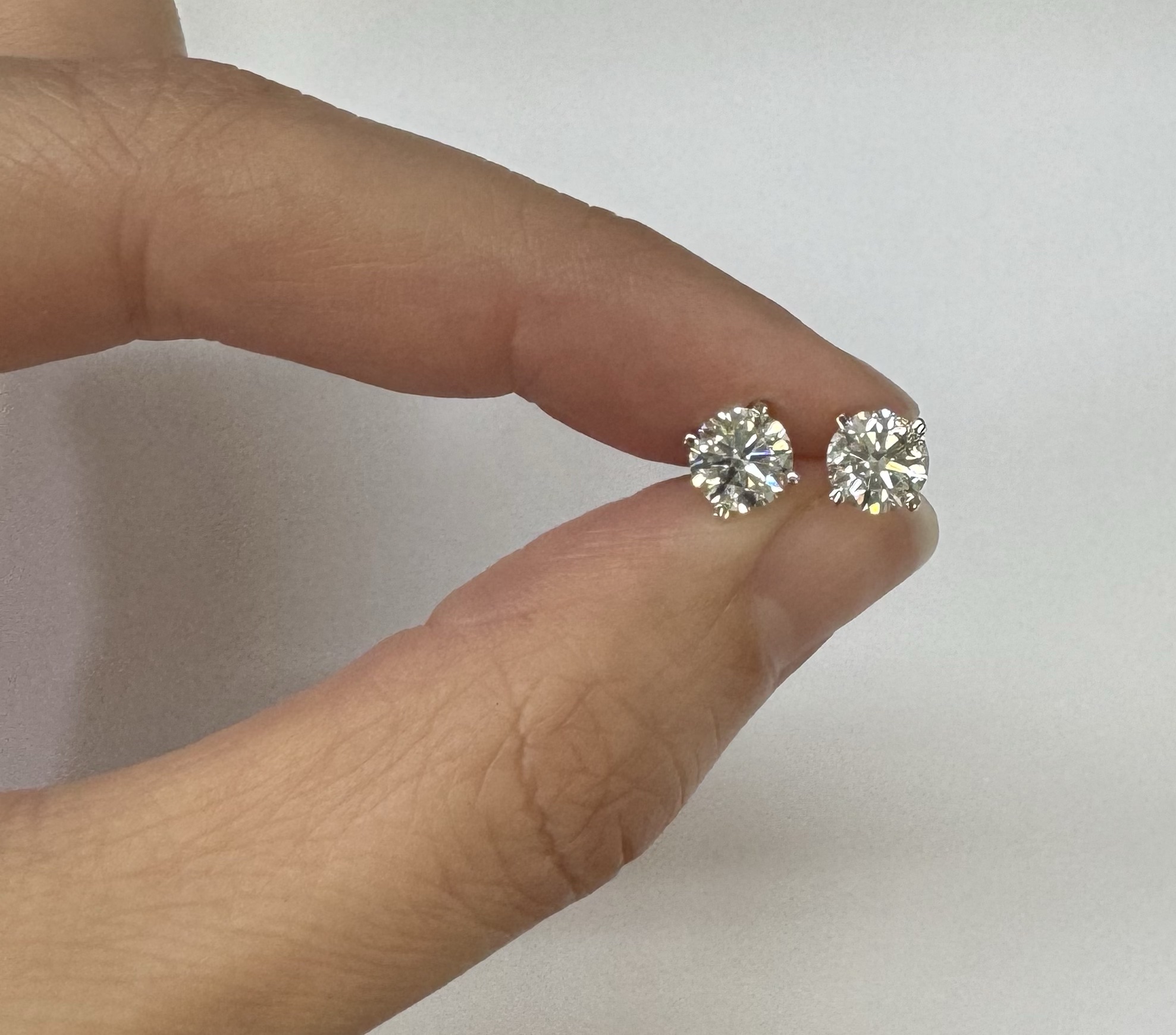 14k white gold genuine 1.50 cttw Lab Grown Round Brilliant Cut diamond 4 prong basket basket set stud earrings. These diamonds average F in color, and VS2 in clarity. These diamonds have excellent cut, excellent symmetry, excellent polish, and no fluorescence. These earrings have an entire weight of 1.1.