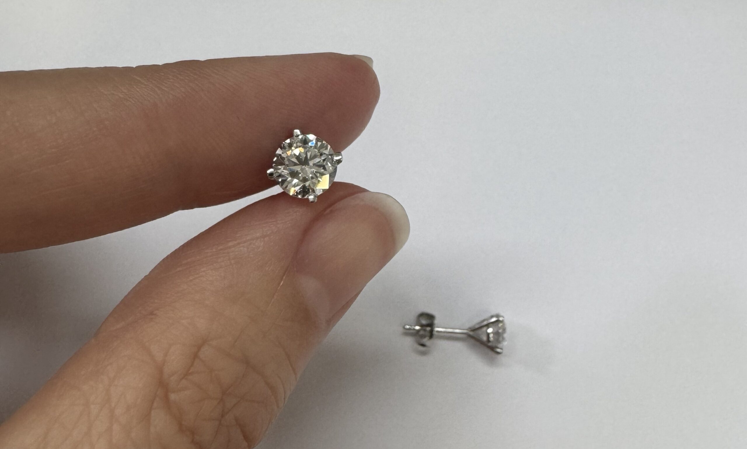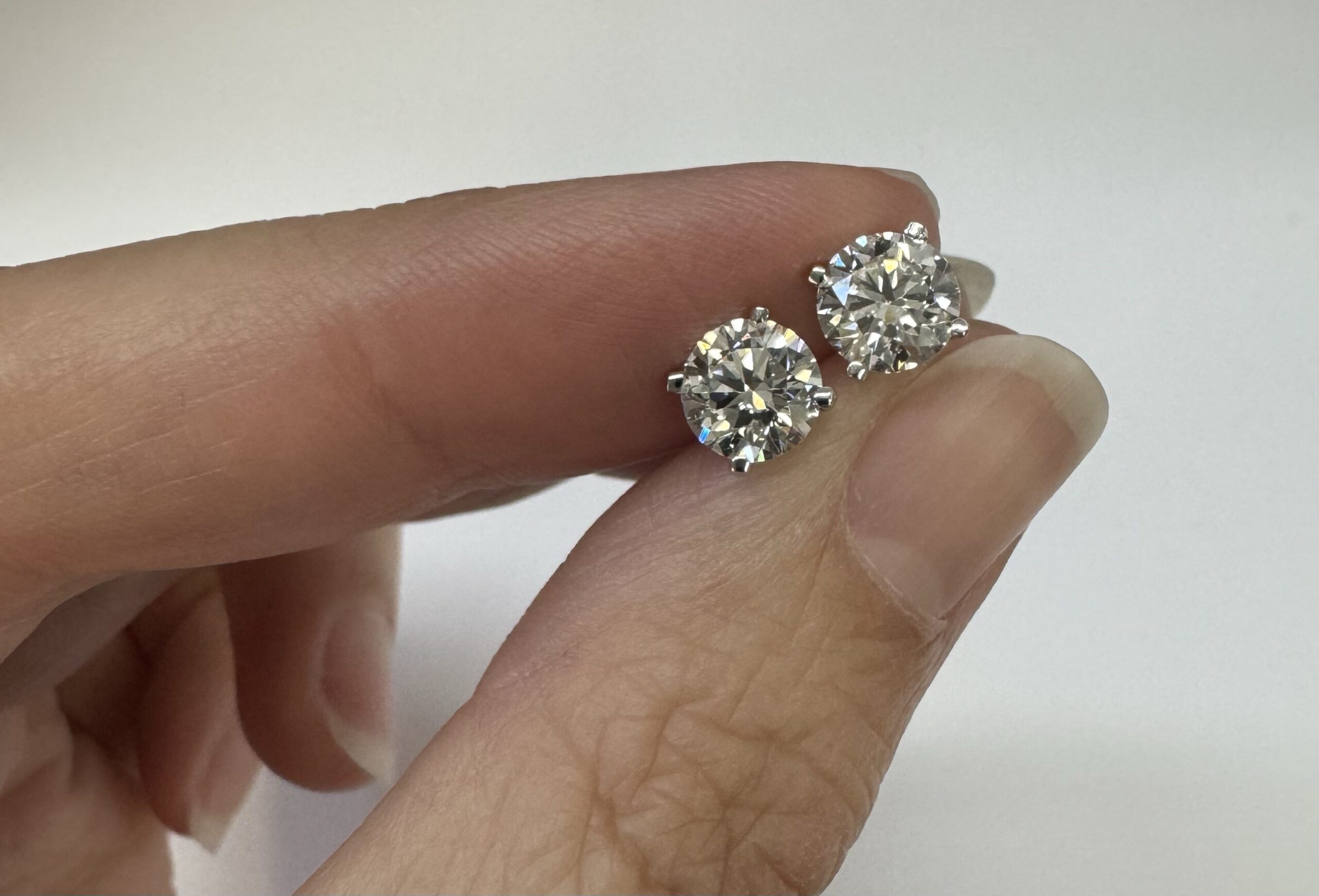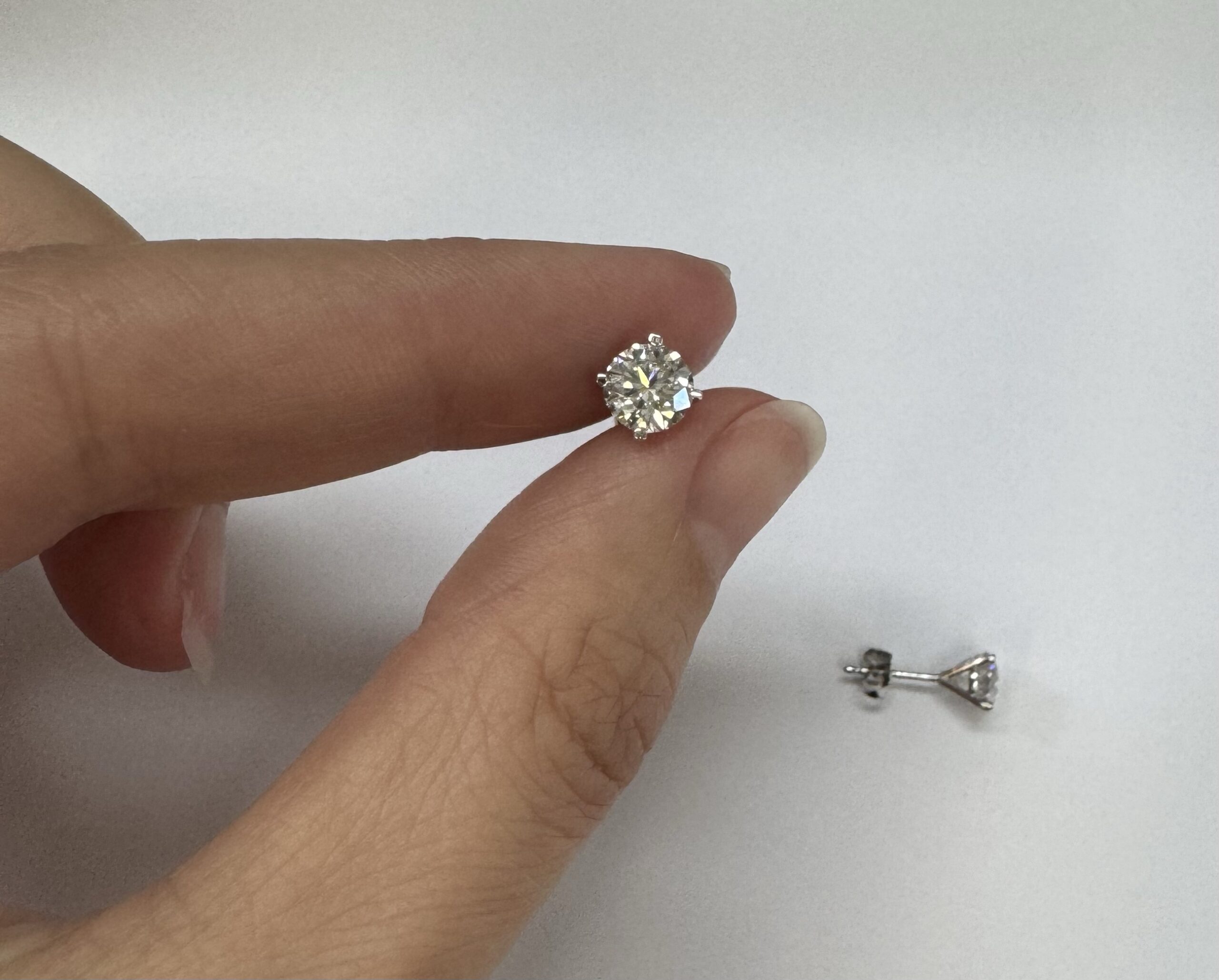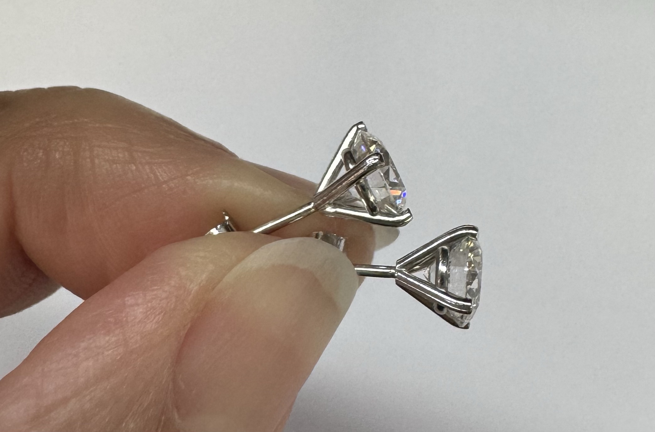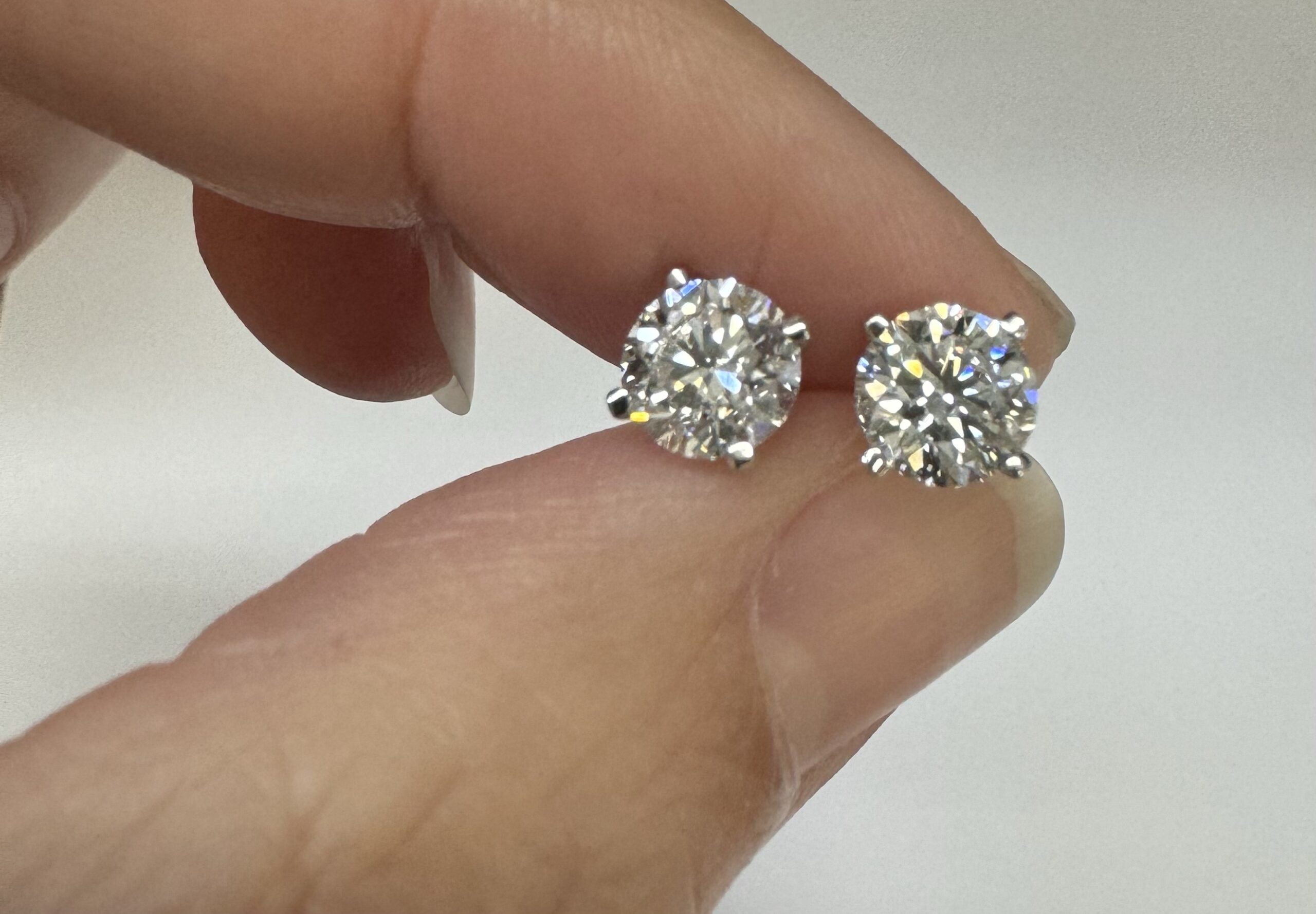 14k white gold genuine 1.50 cttw Lab Grown Round Brilliant Cut diamond 4 prong basket basket set stud earrings. These diamonds average F in color, and VS2 in clarity. These diamonds have excellent cut, excellent symmetry, excellent polish, and no fluorescence. These earrings have an entire weight of 1.1.