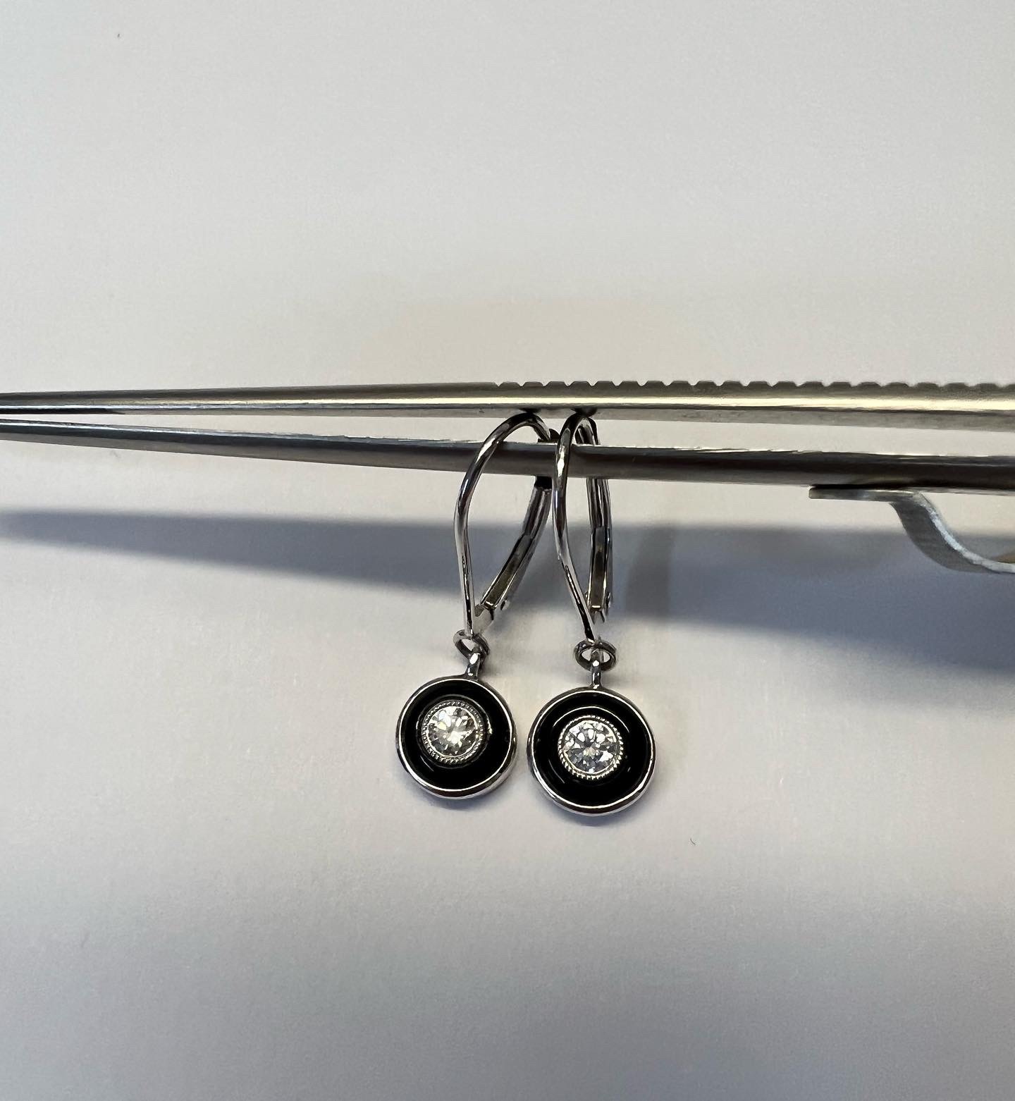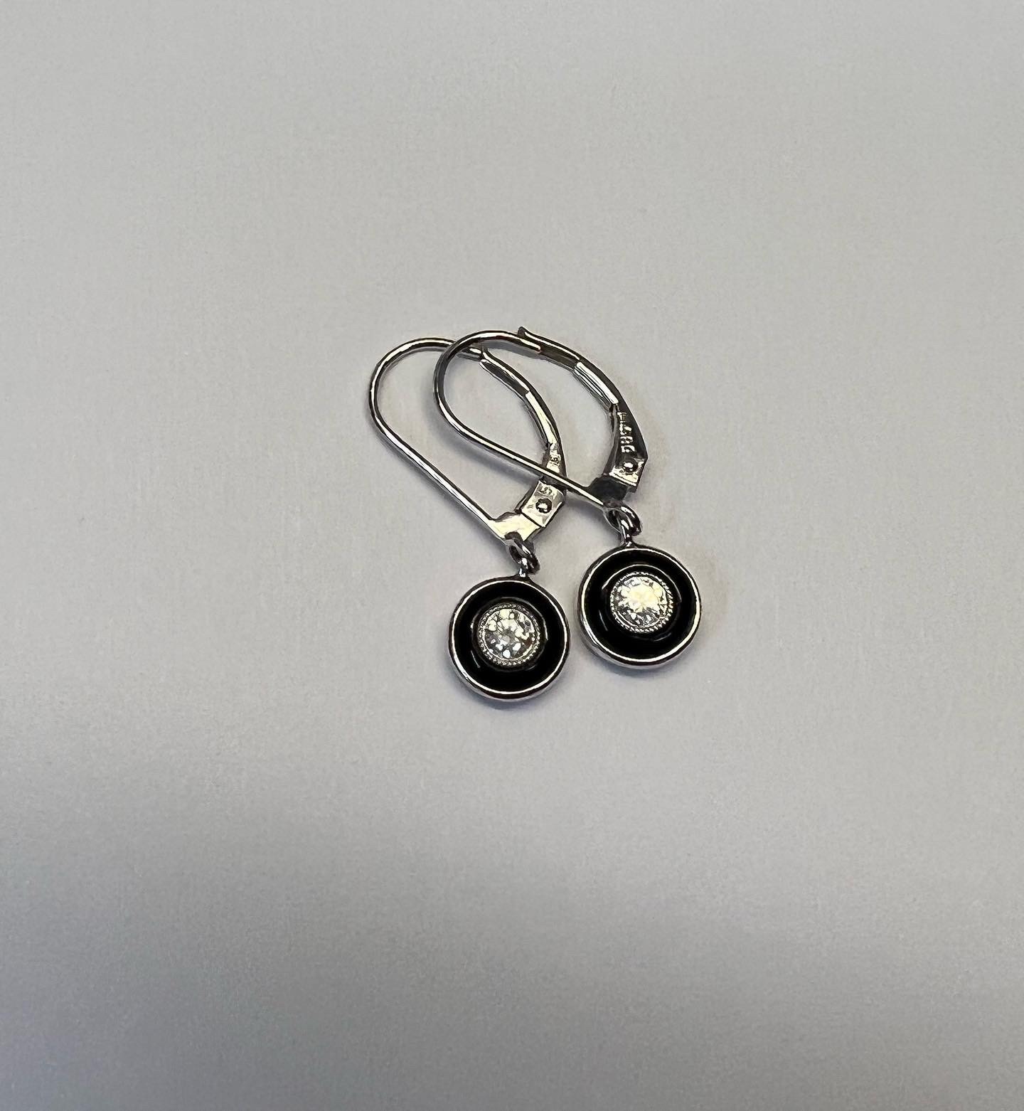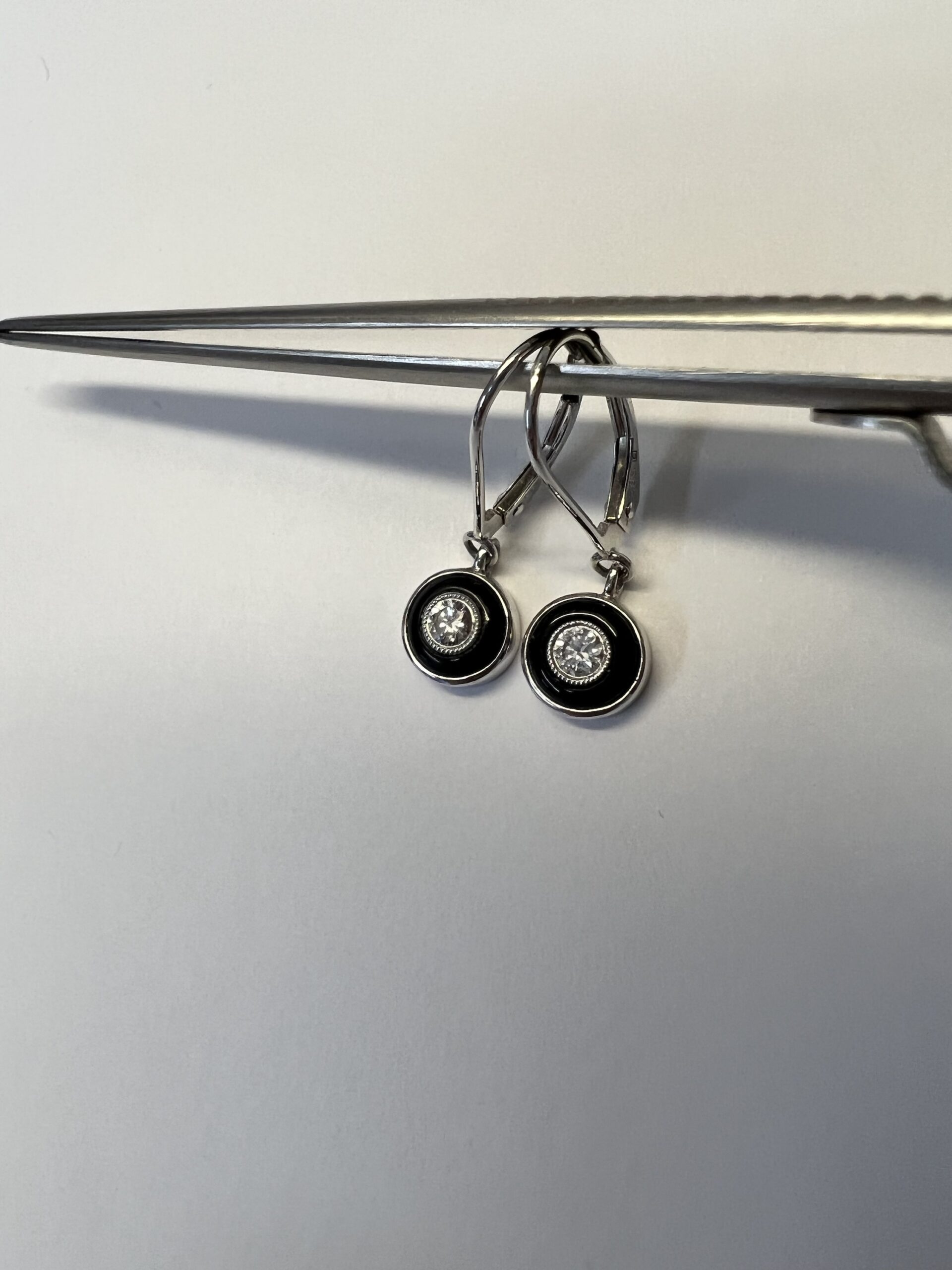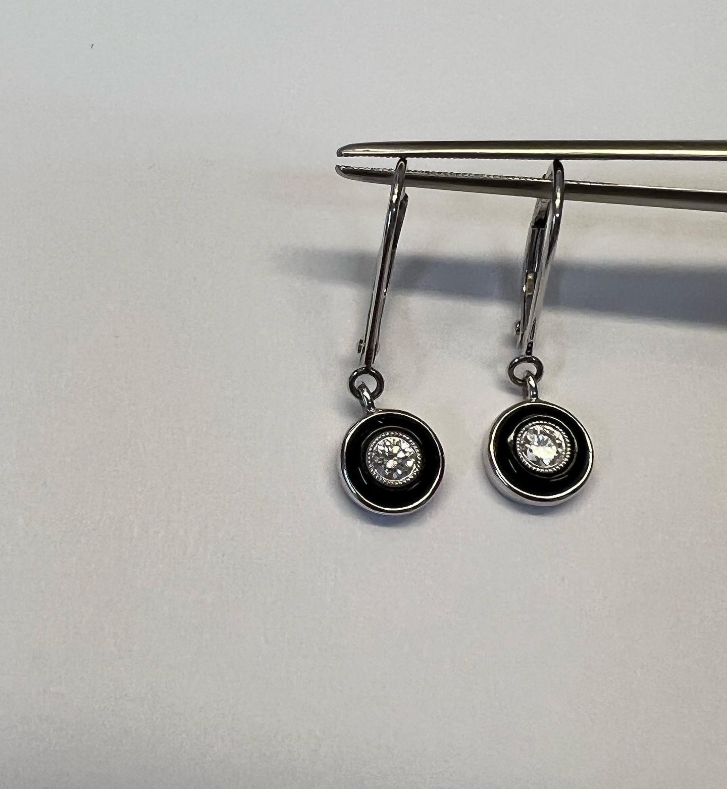 So Art Deco! 14k white gold genuine Onyx & .14 cttw genuine Round Brilliant Cut diamond bezel lever back dangle earrings. These diamonds average G-H in color, and SI in clarity. These earrings have an entire weight of 2.4 grams.