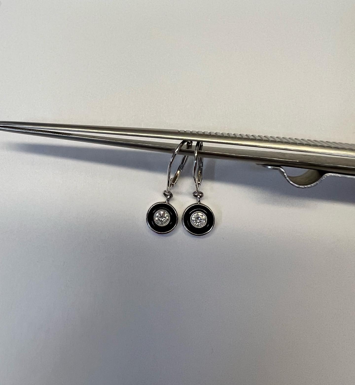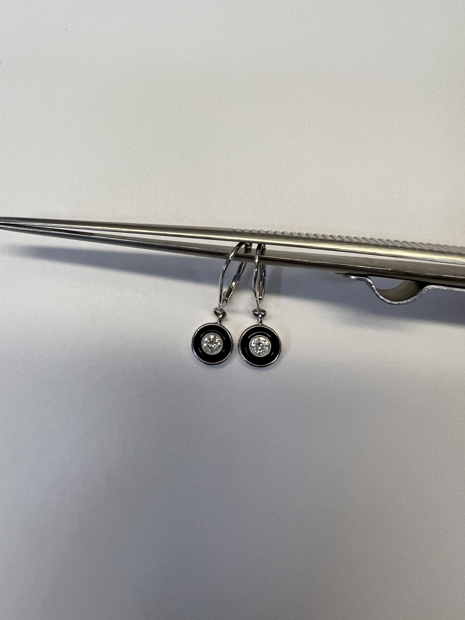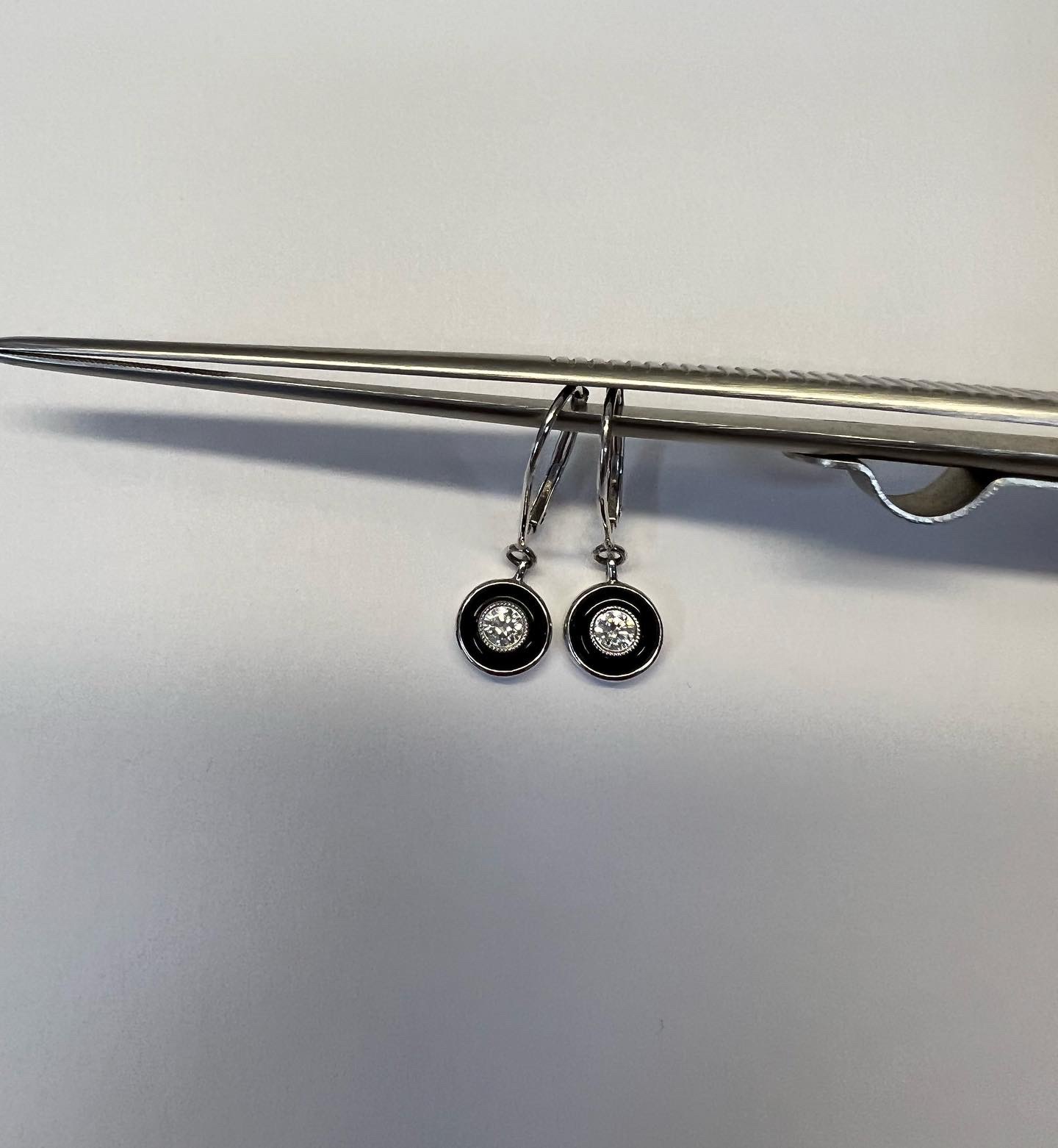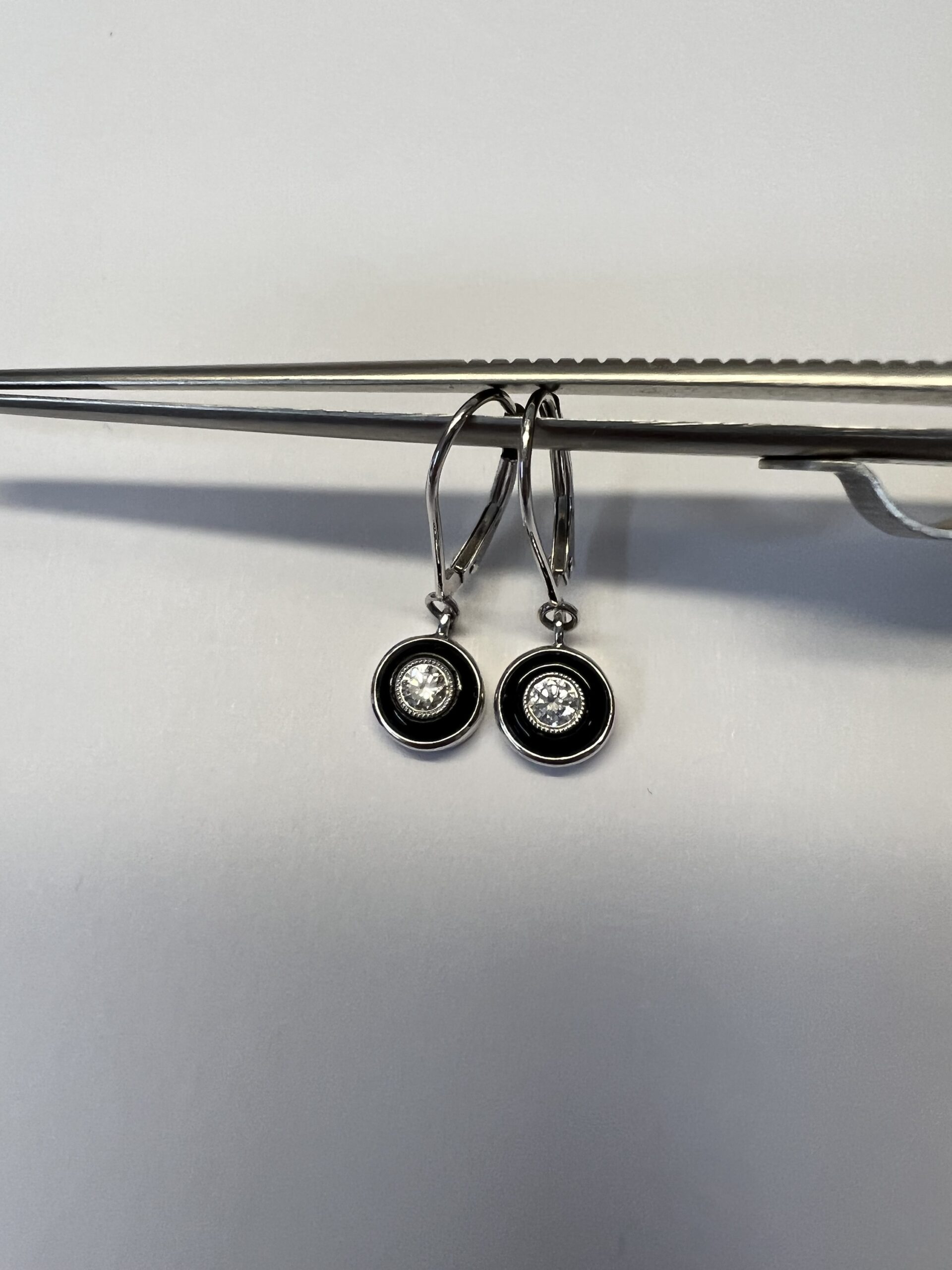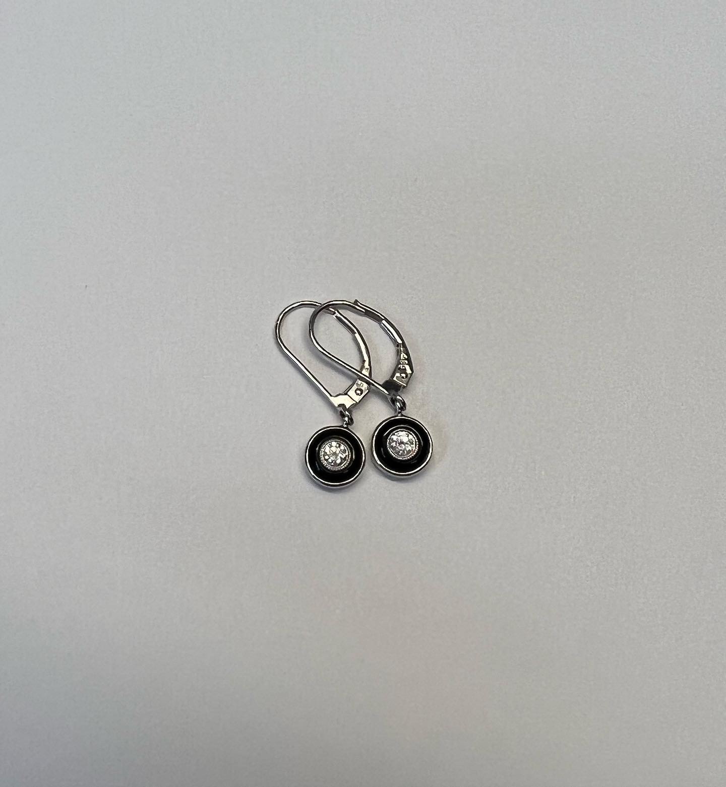 So Art Deco! 14k white gold genuine Onyx & .14 cttw genuine Round Brilliant Cut diamond bezel lever back dangle earrings. These diamonds average G-H in color, and SI in clarity. These earrings have an entire weight of 2.4 grams.