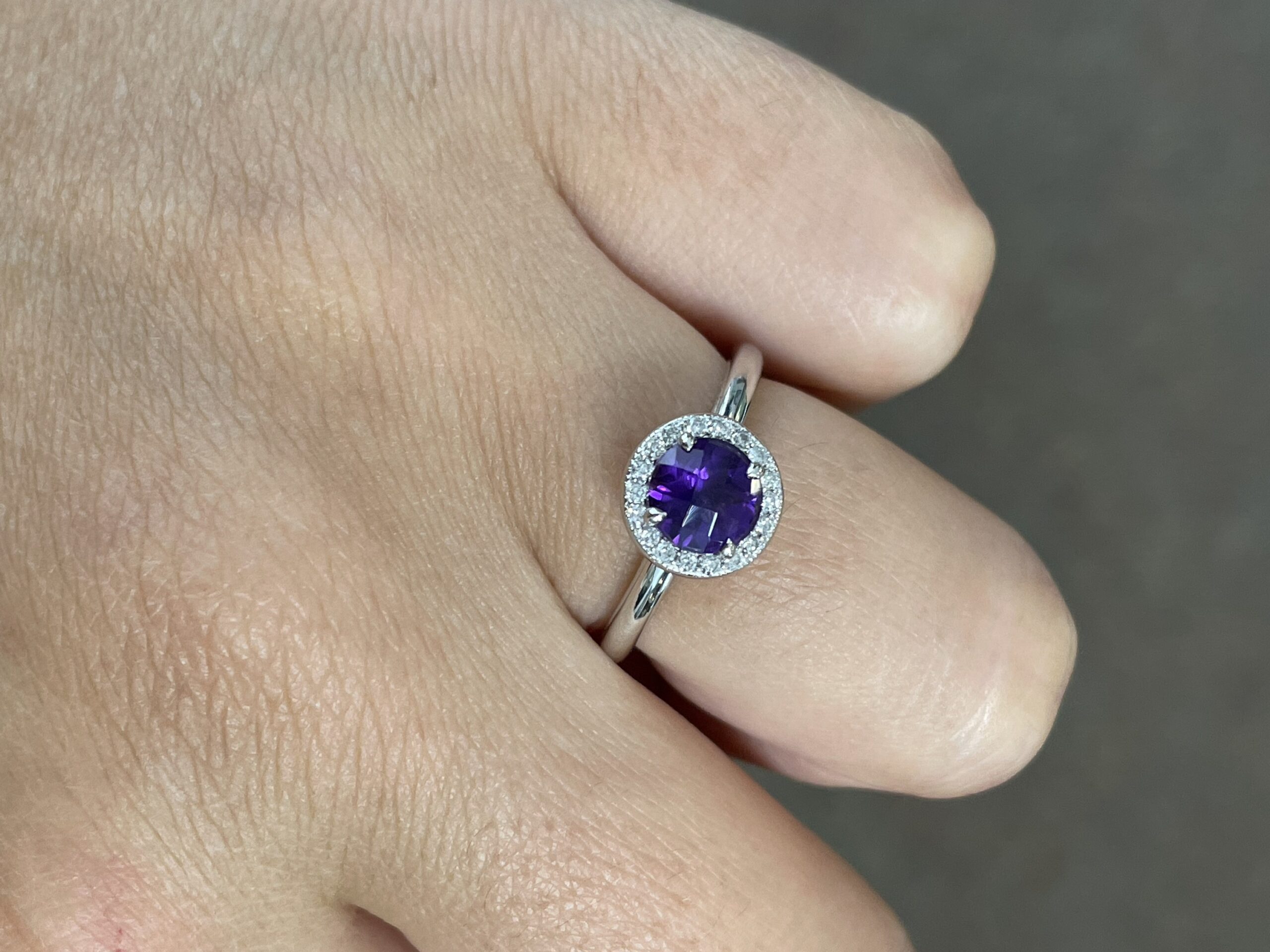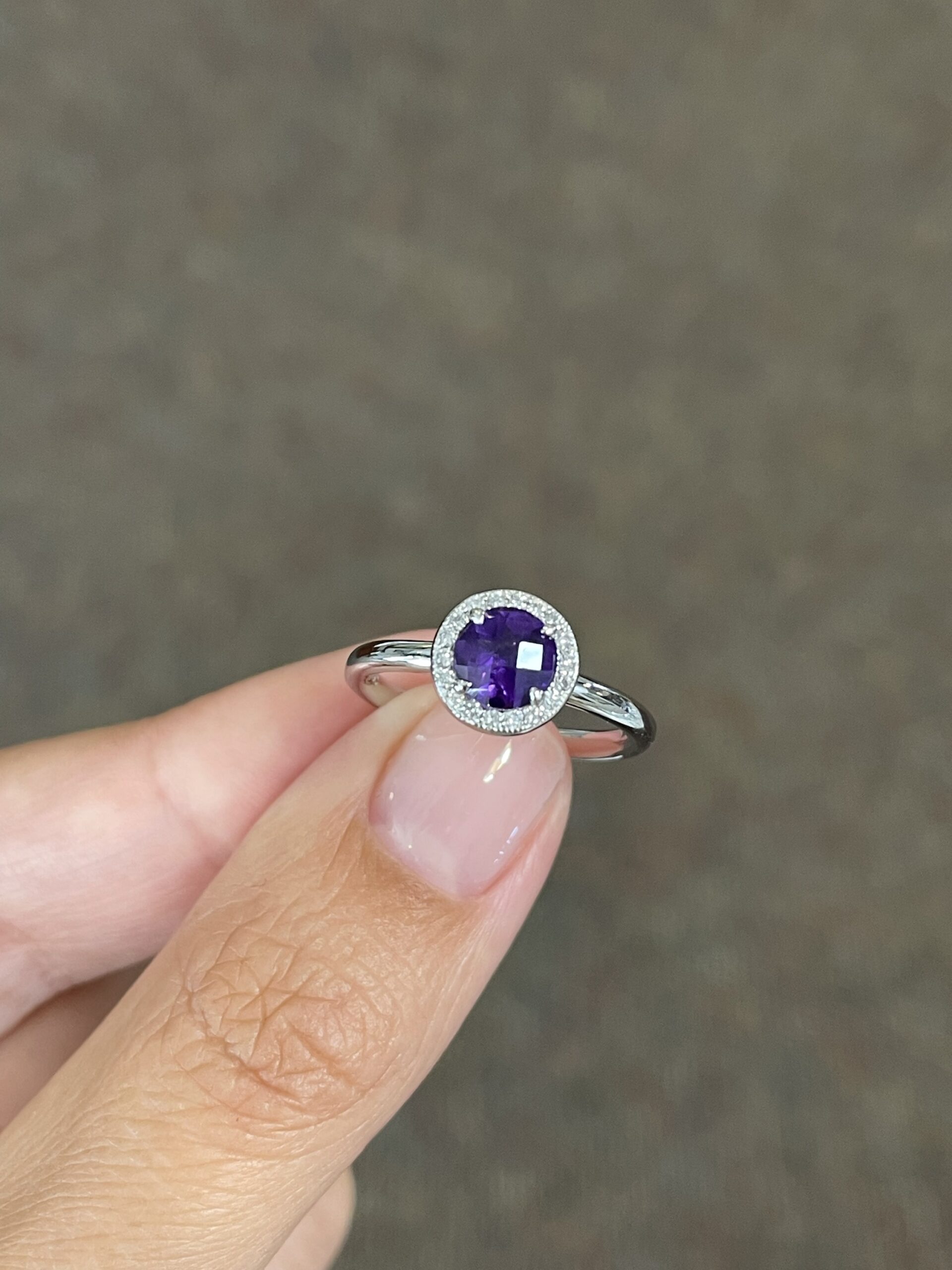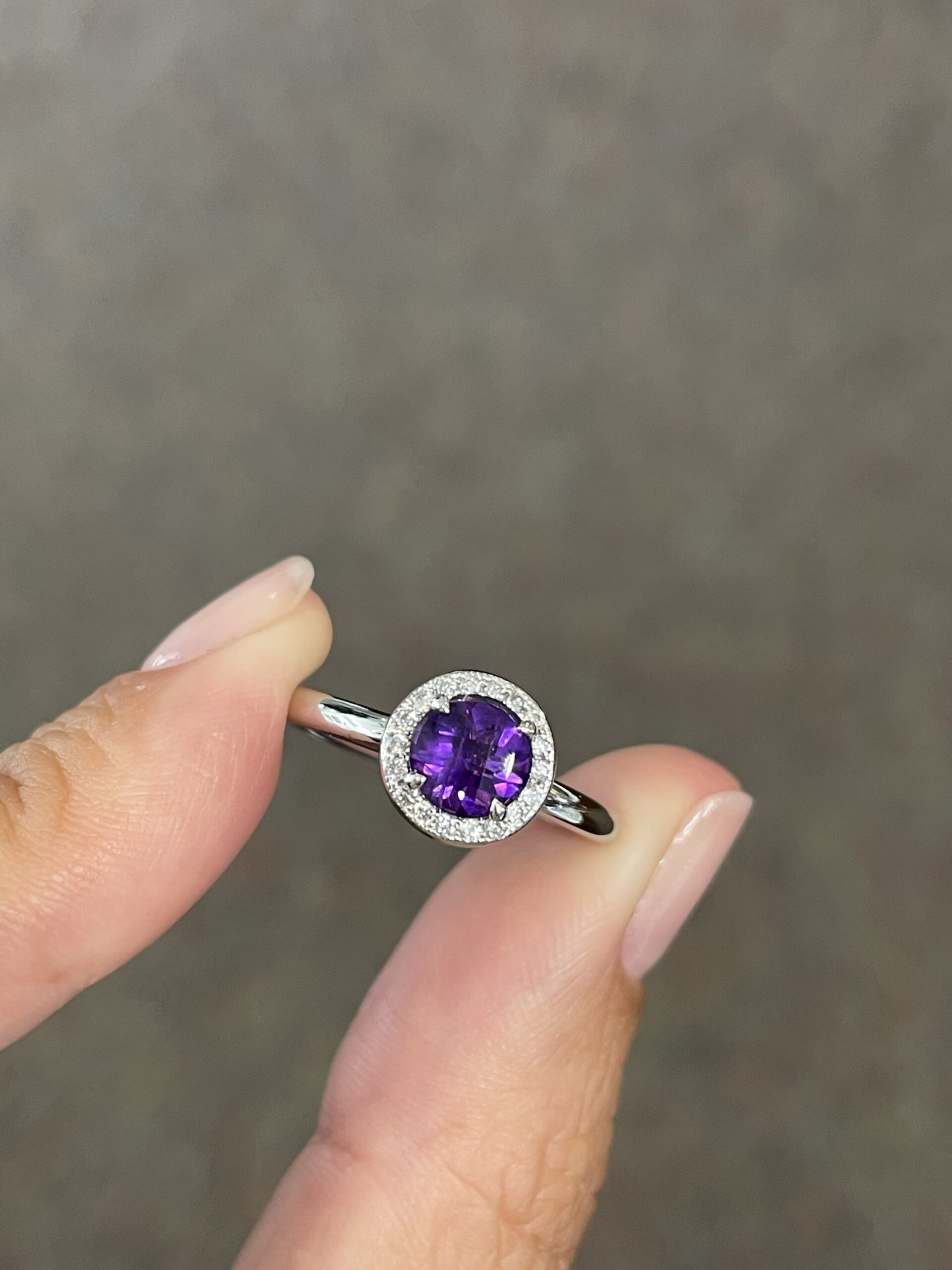 14k white gold genuine round, faceted, .78 cttw Amethyst, accented by a .11 cttw of Round Brilliant Cut diamonds. These diamonds average H-I in color, and SI1 in clarity. This ring consists of a tubular shank, and is a stock size 6-6.5, but it can be reasonably sized. Please note size preference in the comments section at checkout. This ring has an entire weight of 3.3 grams.