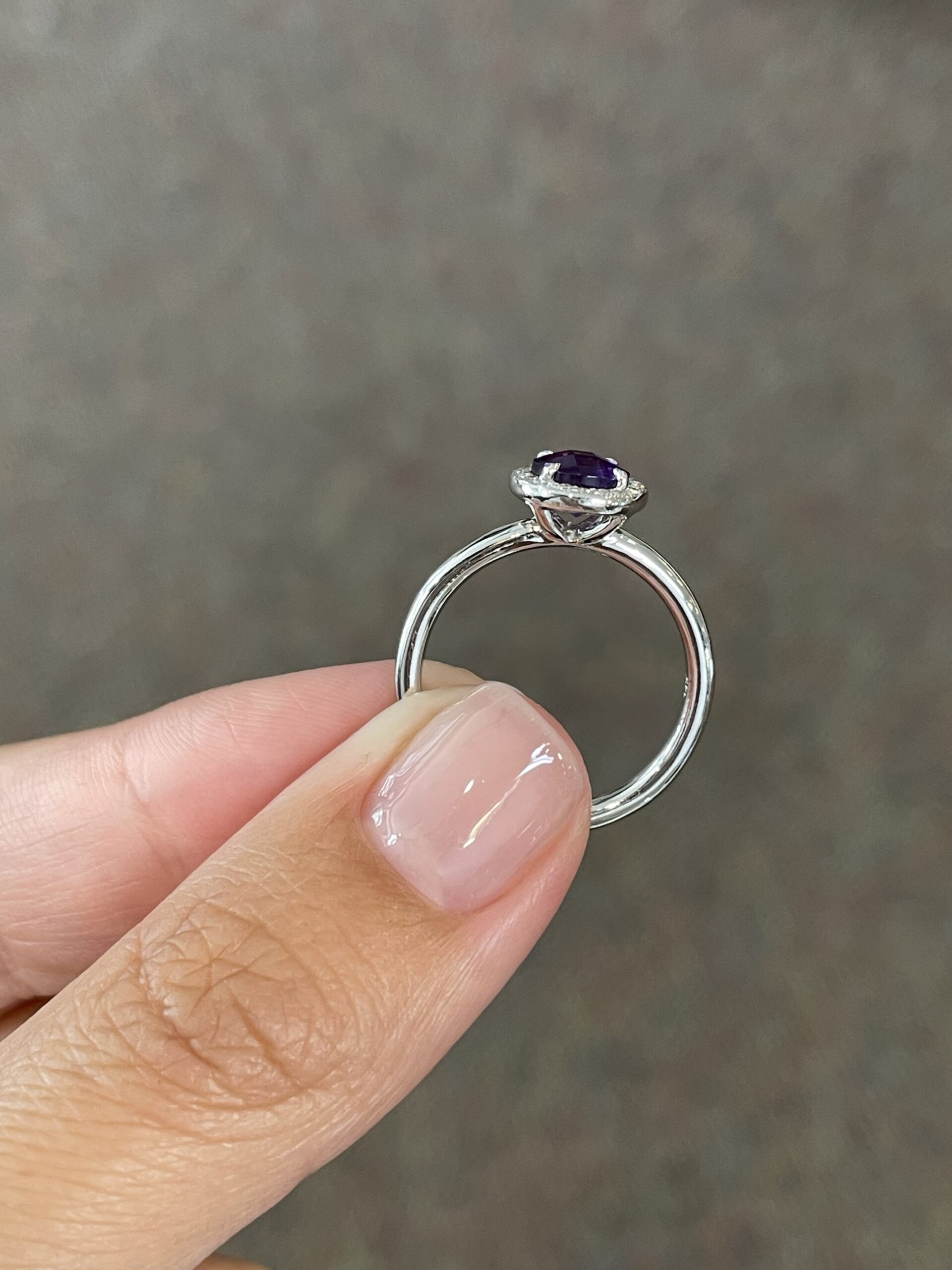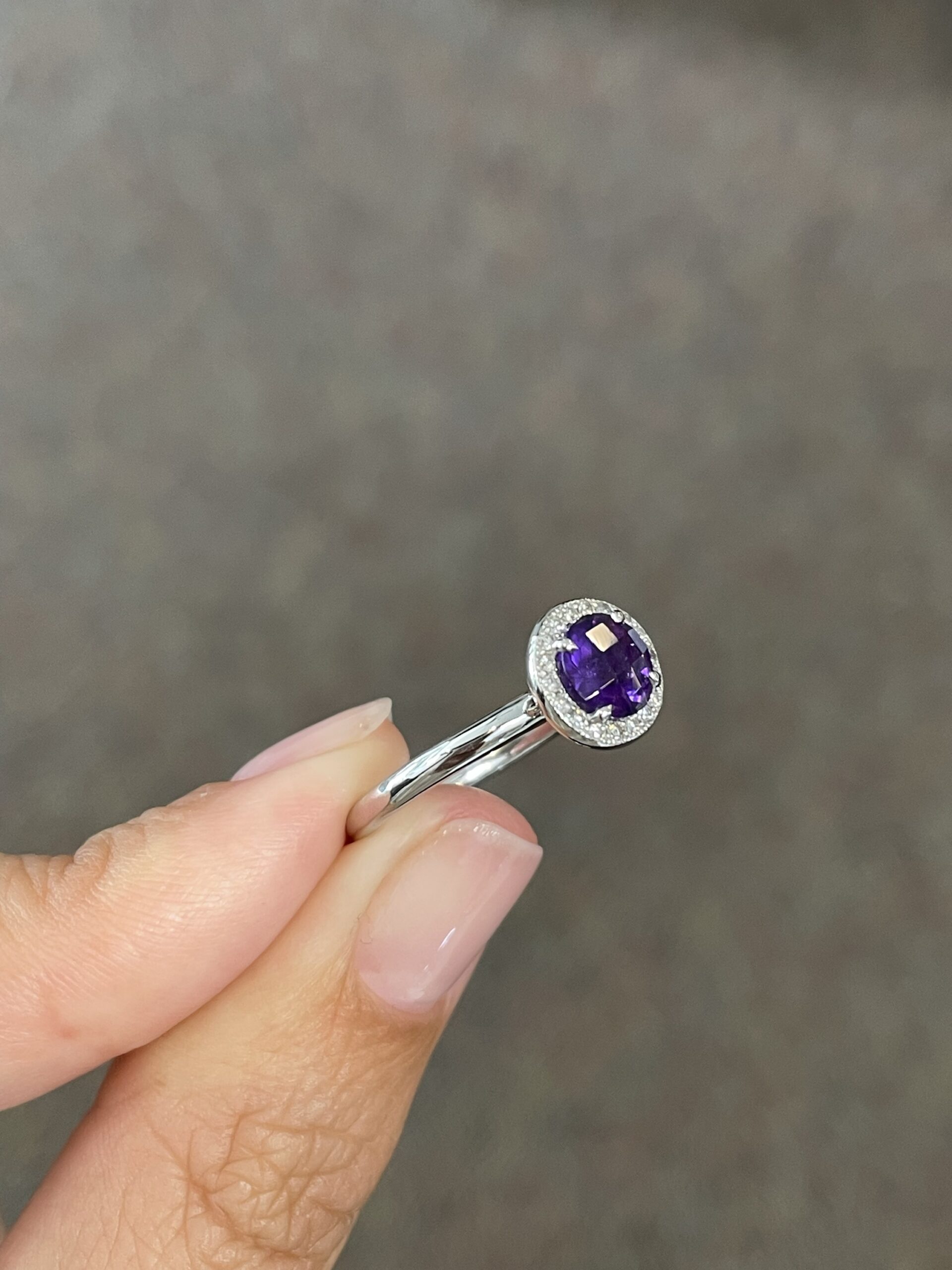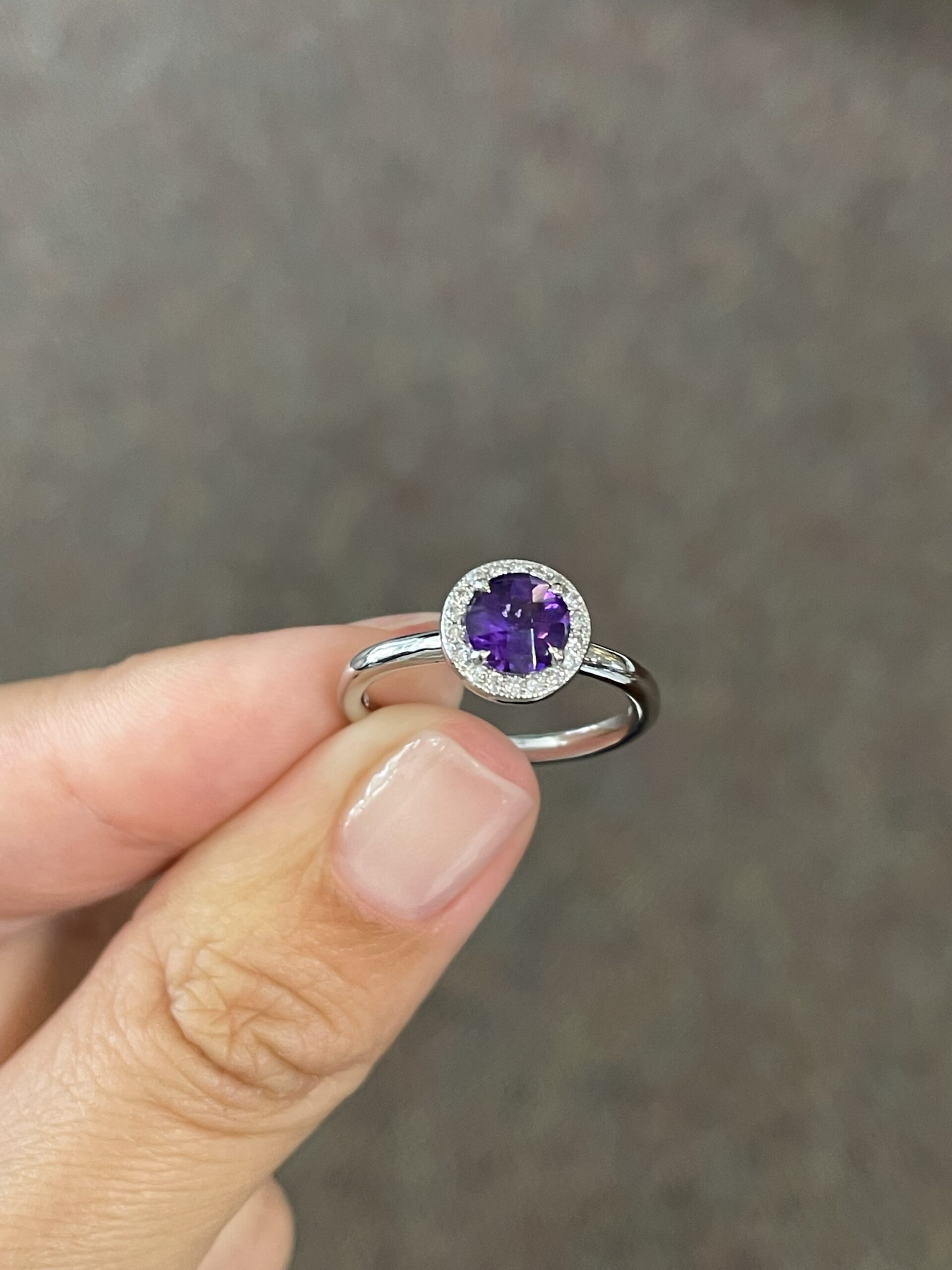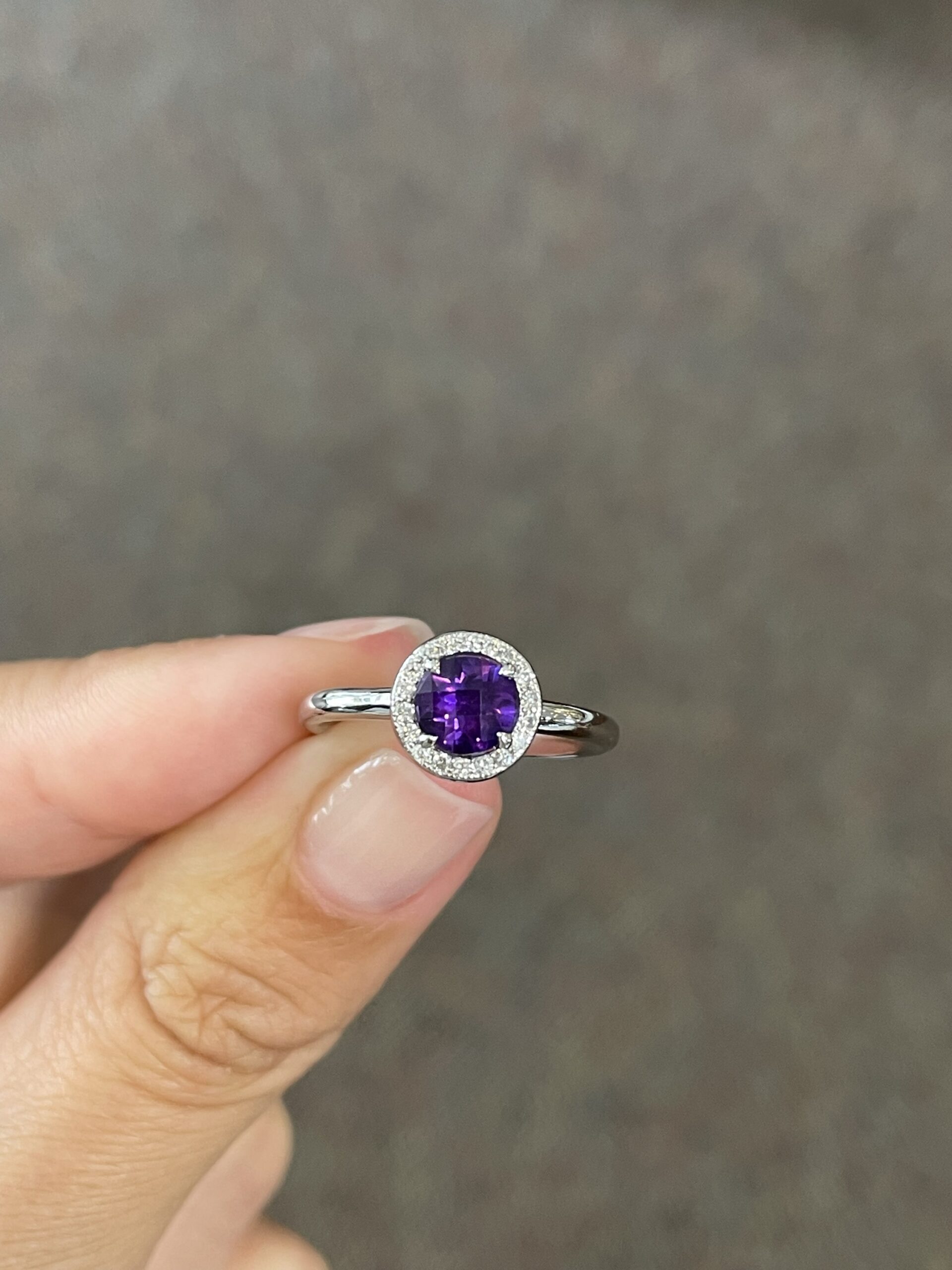 14k white gold genuine round, faceted, .78 cttw Amethyst, accented by a .11 cttw of Round Brilliant Cut diamonds. These diamonds average H-I in color, and SI1 in clarity. This ring consists of a tubular shank, and is a stock size 6-6.5, but it can be reasonably sized. Please note size preference in the comments section at checkout. This ring has an entire weight of 3.3 grams.