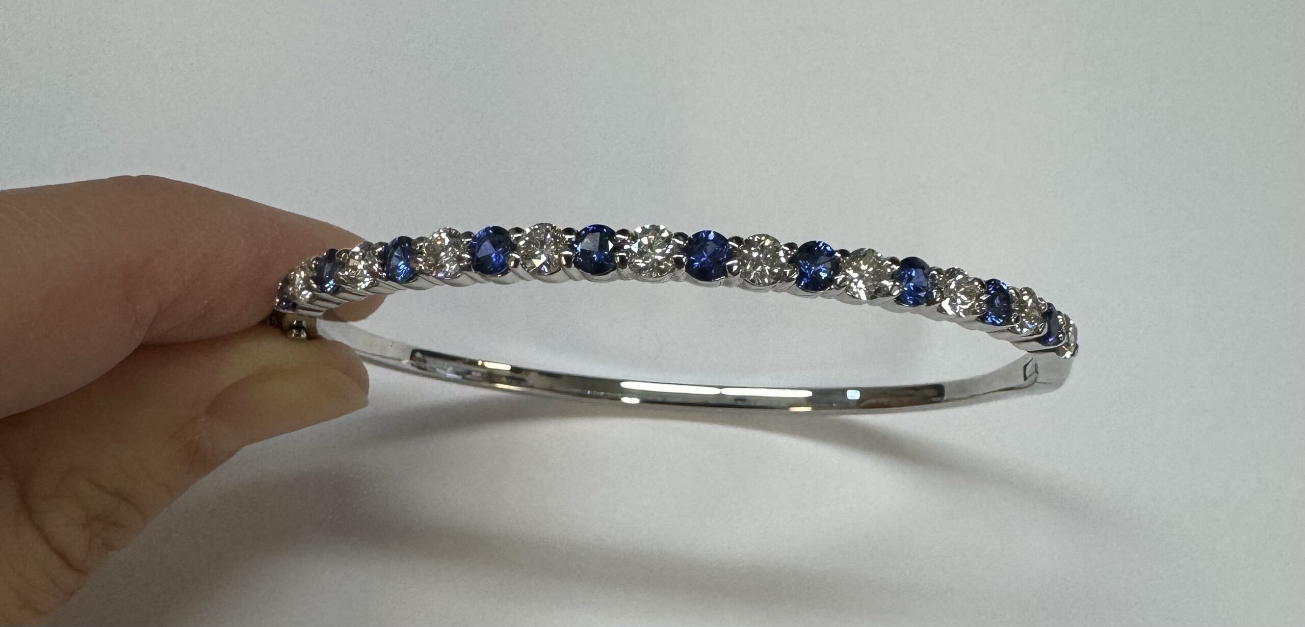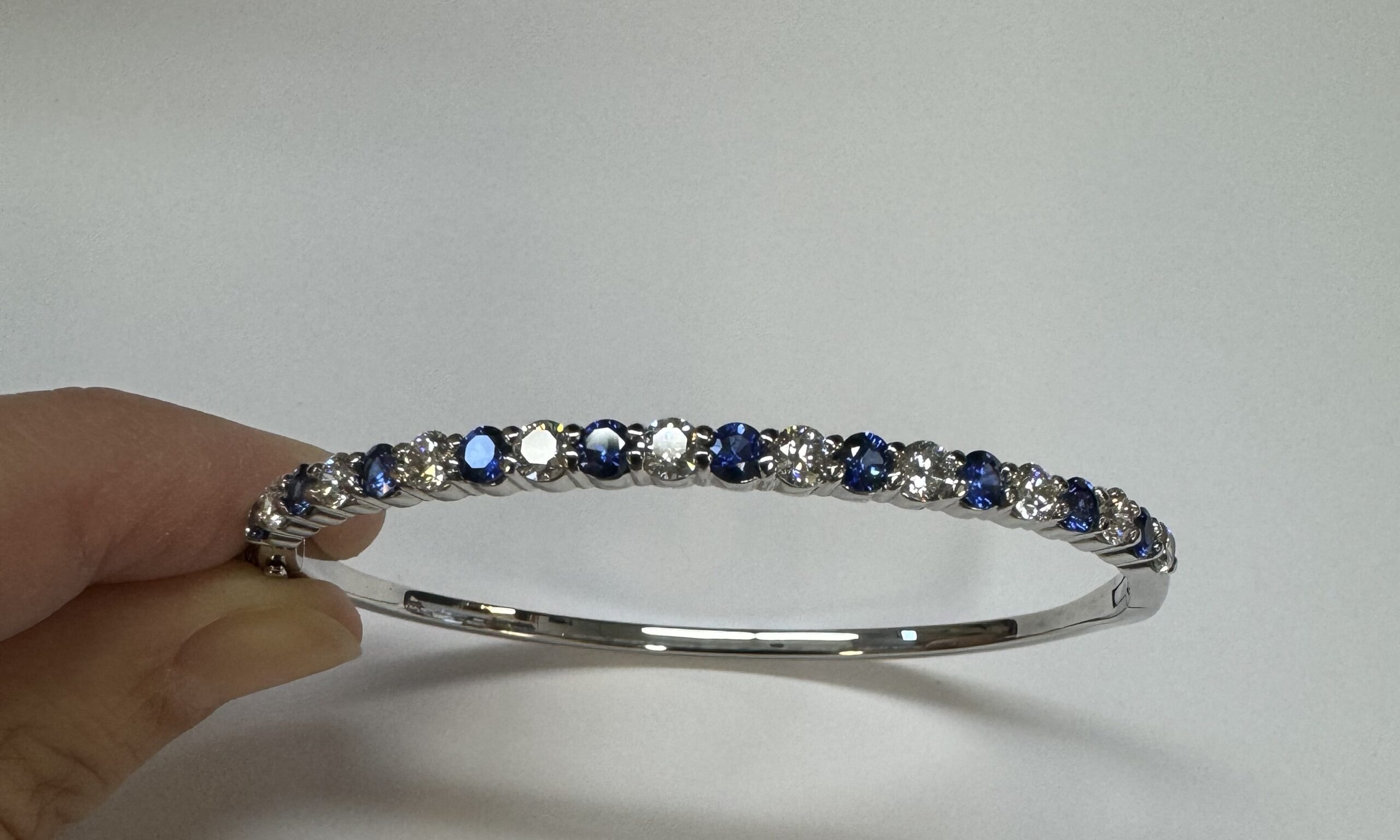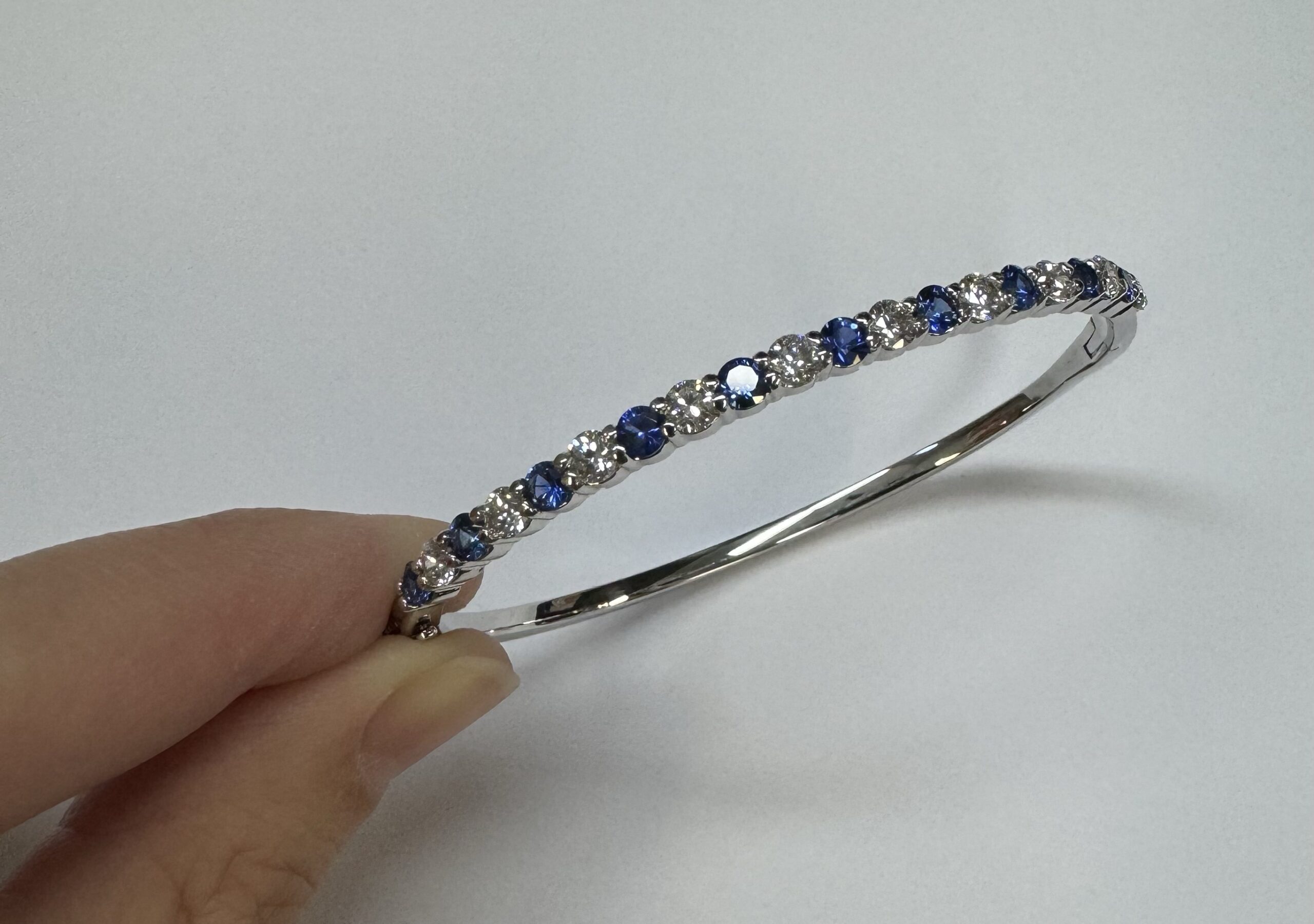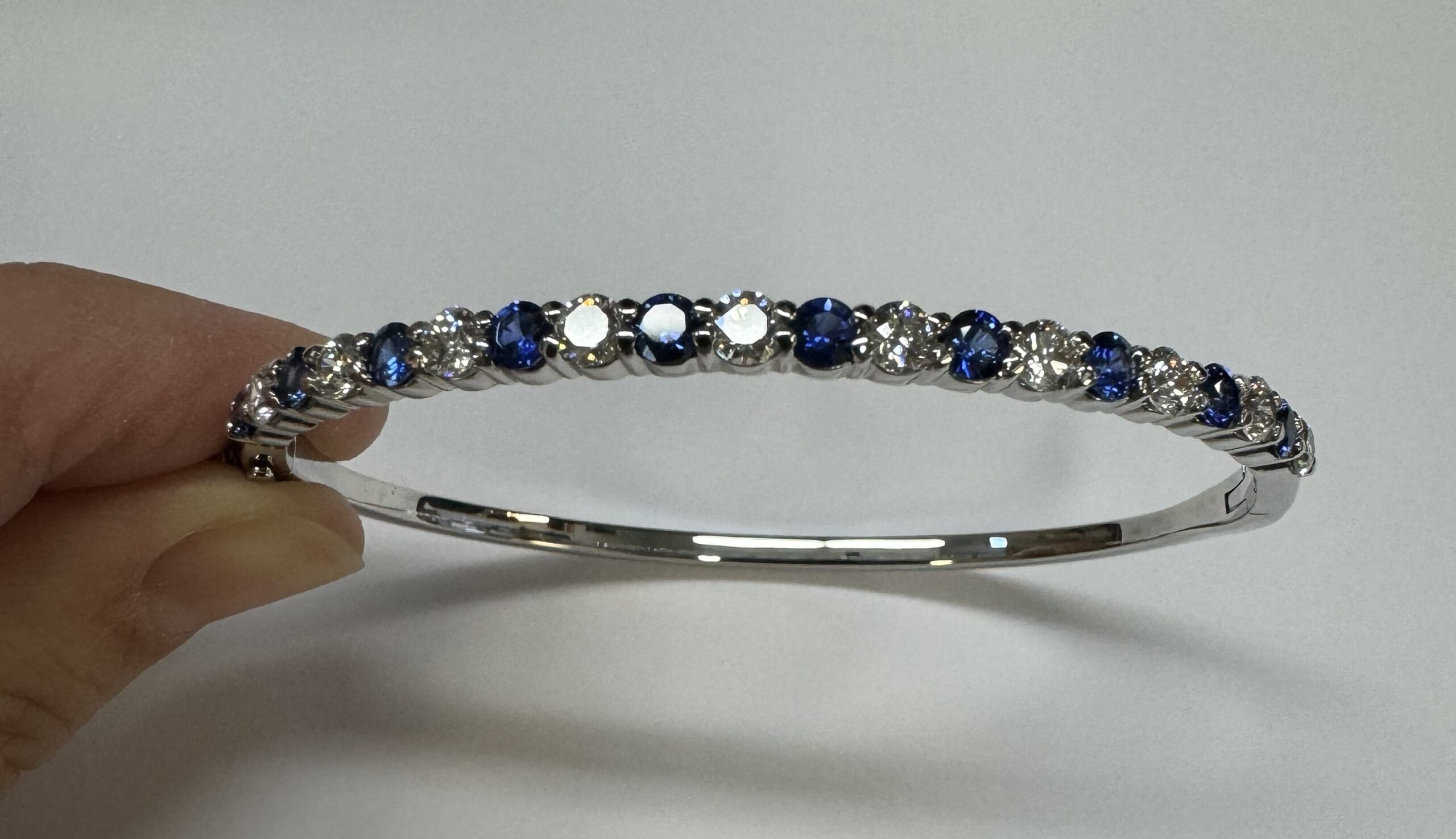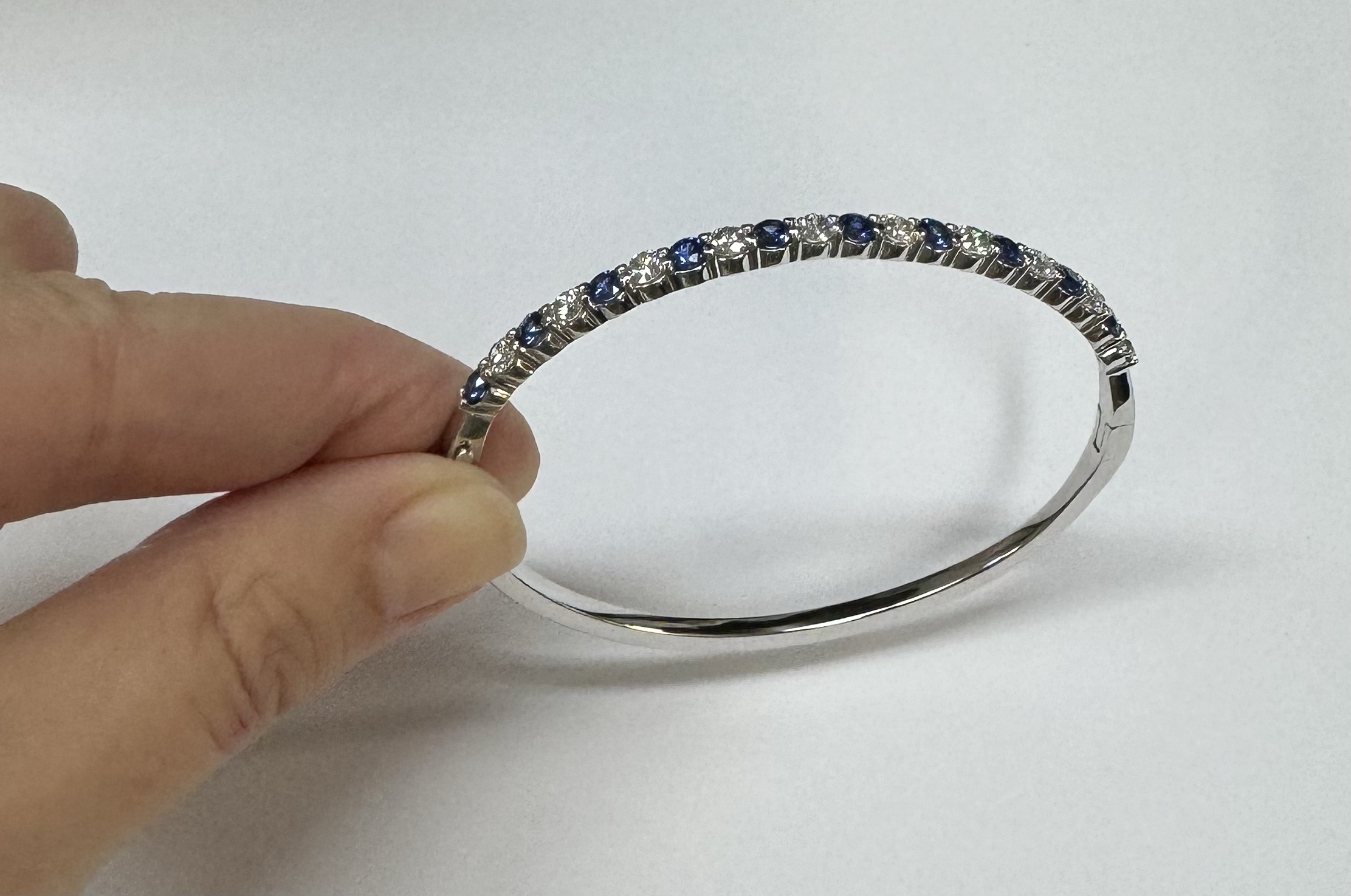 Lady’s 14k white gold oval shaped, hinged, genuine Sapphire & Diamond shared prong bangle bracelet with safety hinge. This bracelet consists of 10 genuine round, faceted Sapphires, which have a total combined weight of 1.50 carats. These Sapphires have vivid medium blue color with very good clarity. The Sapphires are set alternately with 10 genuine Round Brilliant Cut diamonds, which have a total combined weight of 1.39 carats. These diamonds average (H-I) in color, and SI1 in clarity. These diamonds are nicely proportioned and well finished. This bracelet has an entire weight of 14.6 grams, and it measures 7.5″ all of the way around the outside.