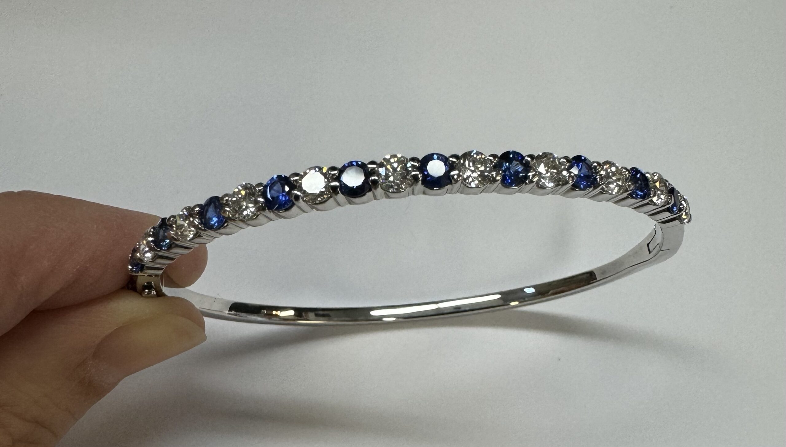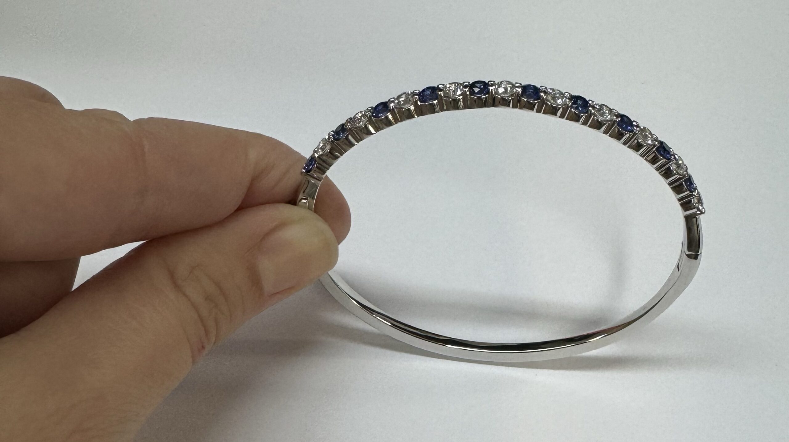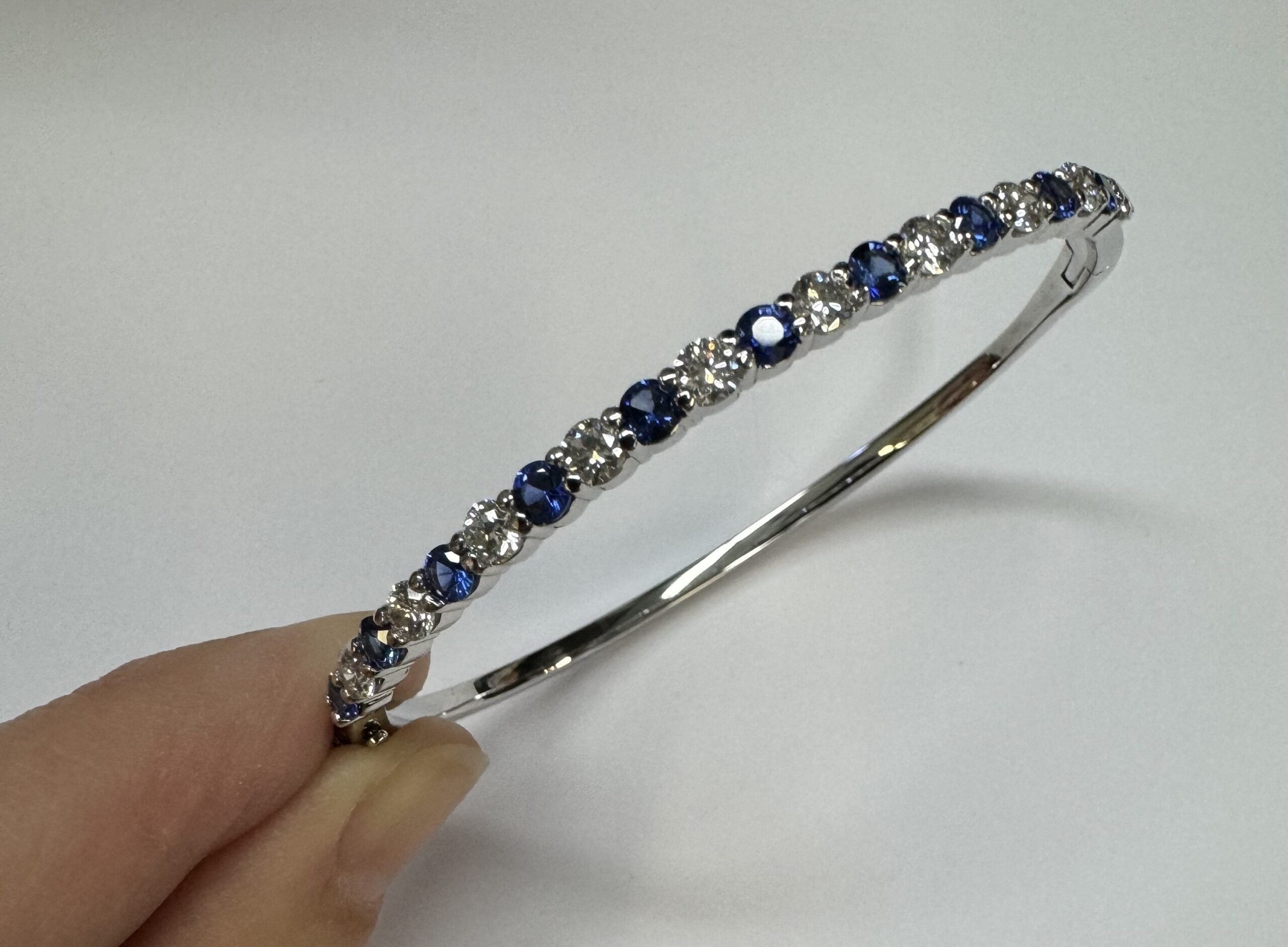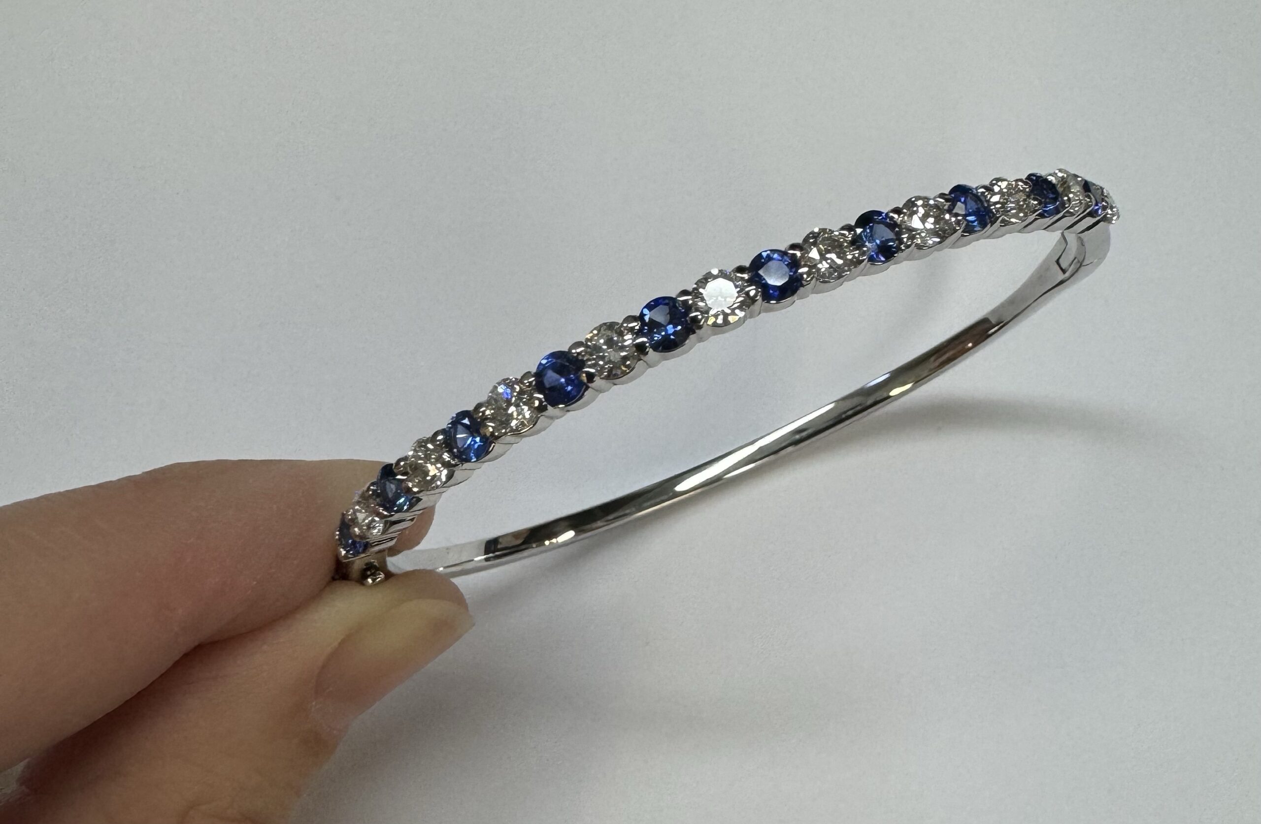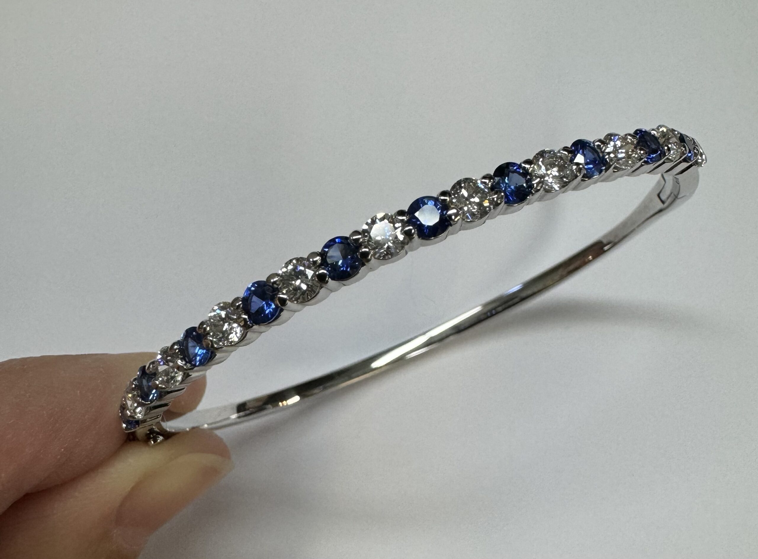Lady’s 14k white gold oval shaped, hinged, genuine Sapphire & Diamond shared prong bangle bracelet with safety hinge. This bracelet consists of 10 genuine round, faceted Sapphires, which have a total combined weight of 1.50 carats. These Sapphires have vivid medium blue color with very good clarity. The Sapphires are set alternately with 10 genuine Round Brilliant Cut diamonds, which have a total combined weight of 1.39 carats. These diamonds average (H-I) in color, and SI1 in clarity. These diamonds are nicely proportioned and well finished. This bracelet has an entire weight of 14.6 grams, and it measures 7.5″ all of the way around the outside.