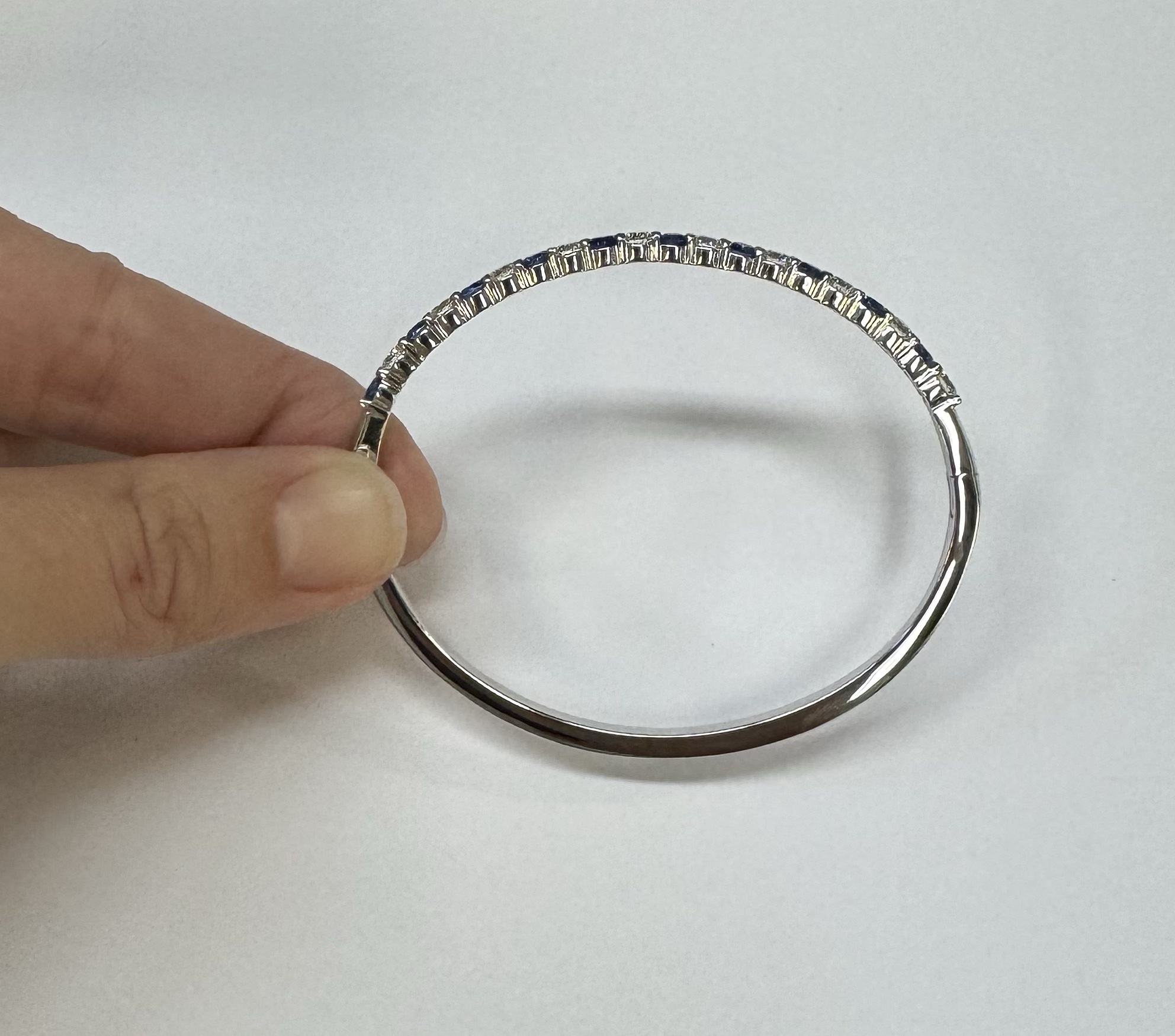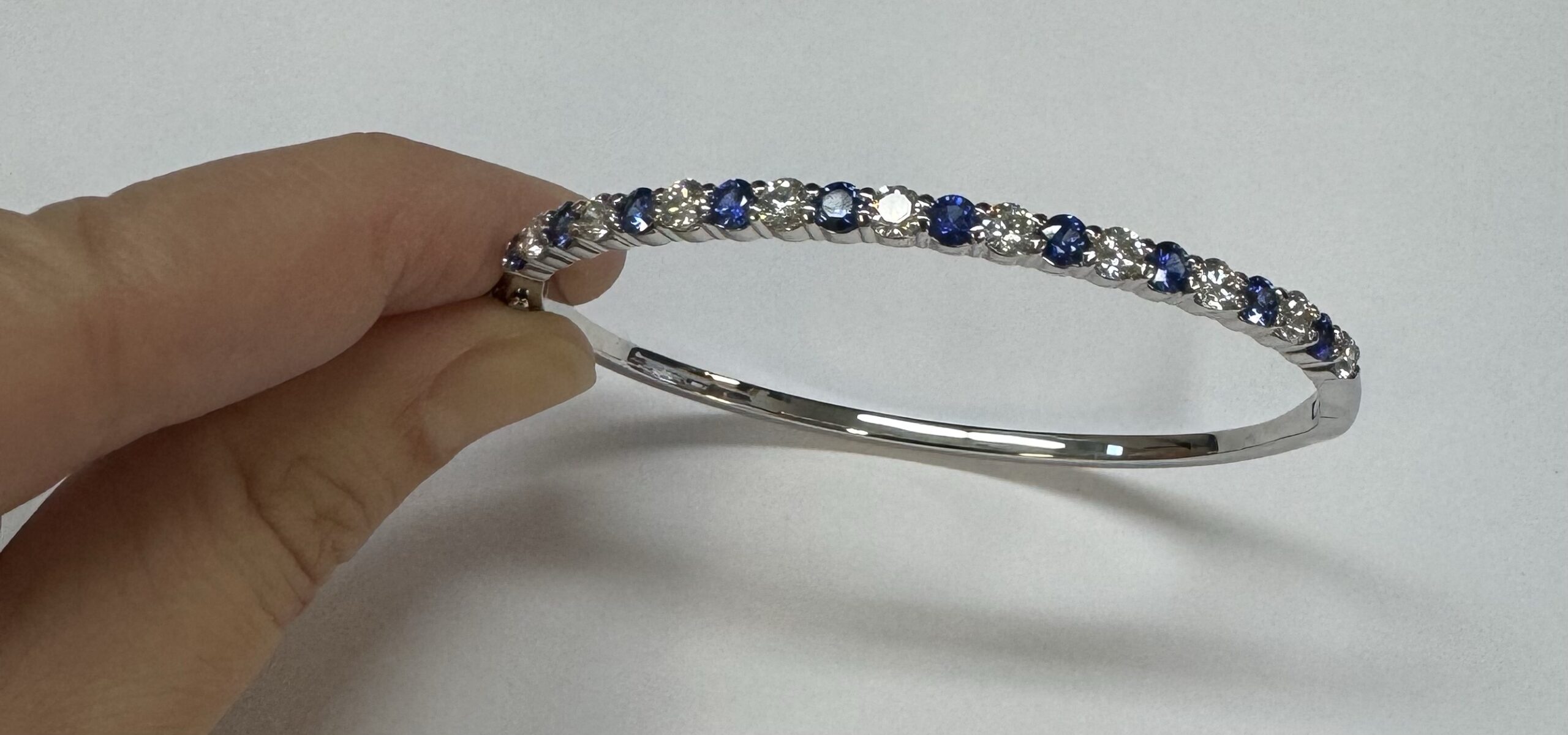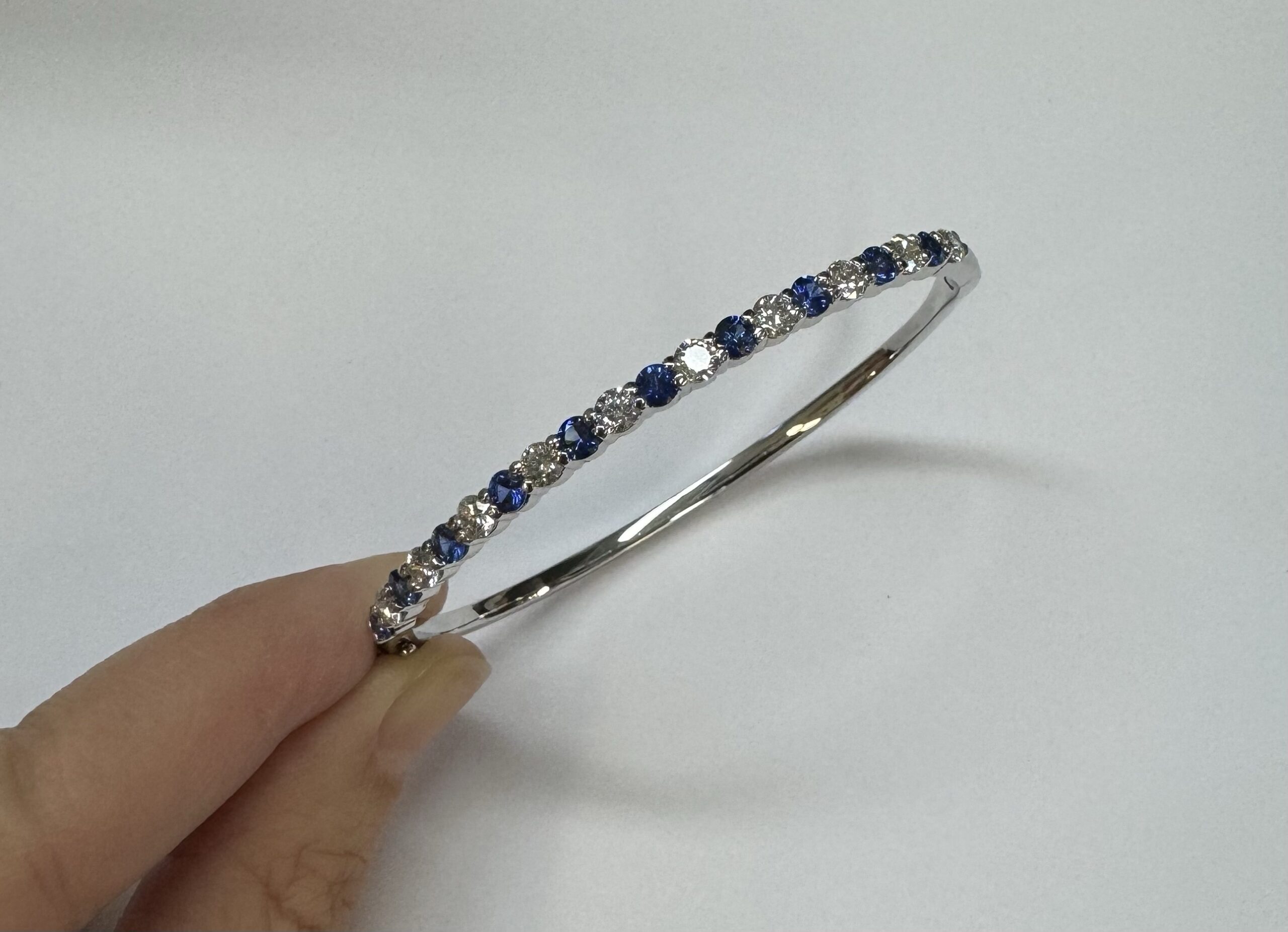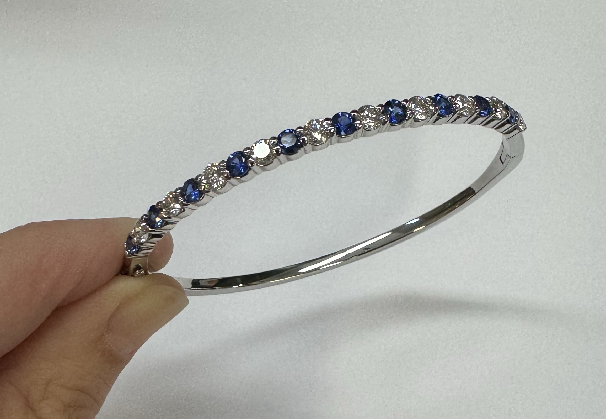 Lady’s 14k white gold oval shaped, hinged, genuine Sapphire & Diamond shared prong bangle bracelet with safety hinge. This bracelet consists of 10 genuine round, faceted Sapphires, which have a total combined weight of 1.50 carats. These Sapphires have vivid medium blue color with very good clarity. The Sapphires are set alternately with 10 genuine Round Brilliant Cut diamonds, which have a total combined weight of 1.39 carats. These diamonds average (H-I) in color, and SI1 in clarity. These diamonds are nicely proportioned and well finished. This bracelet has an entire weight of 14.6 grams, and it measures 7.5″ all of the way around the outside.
