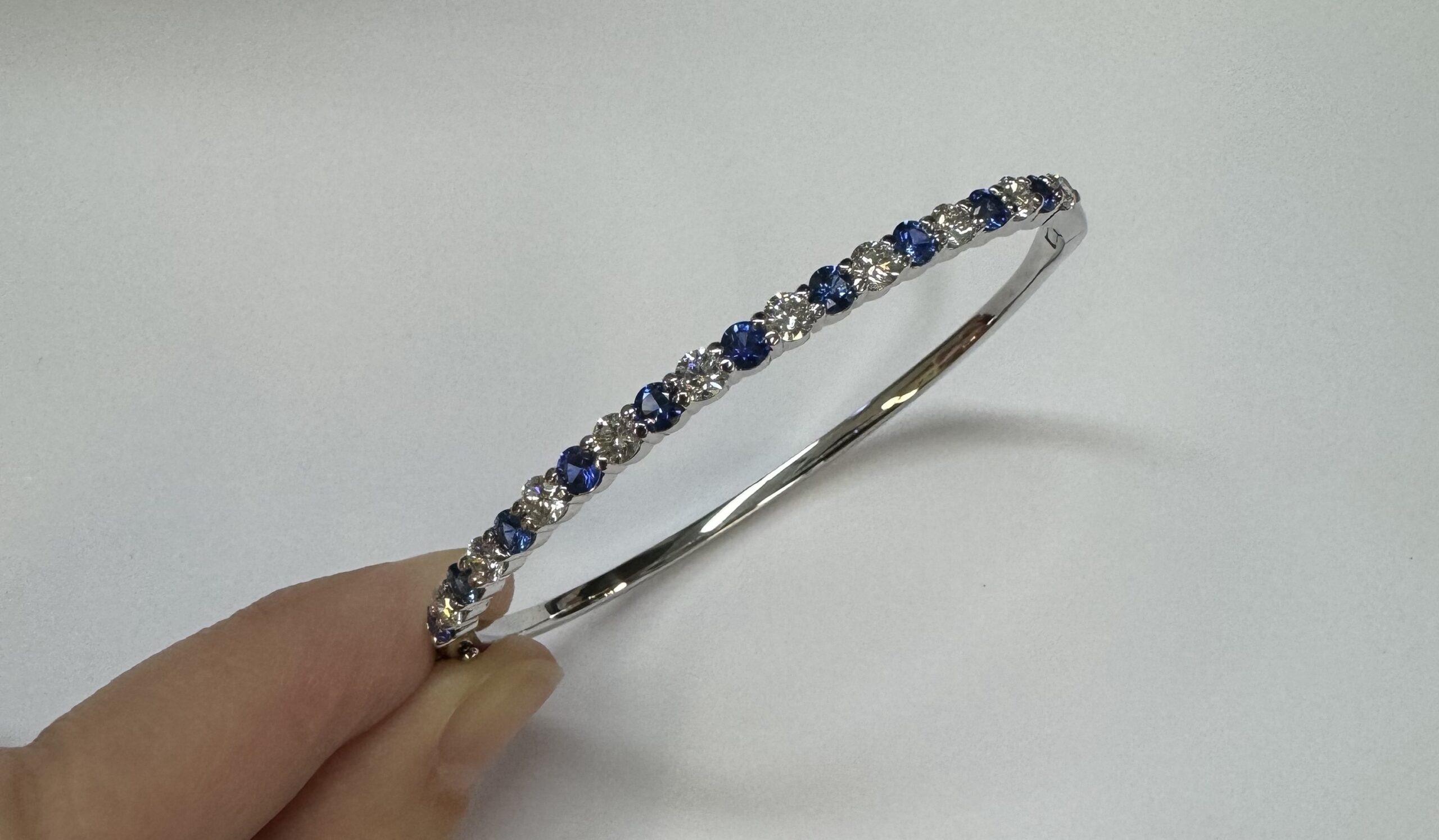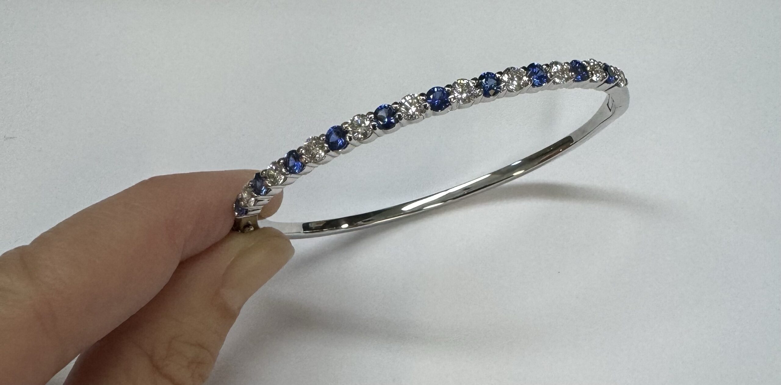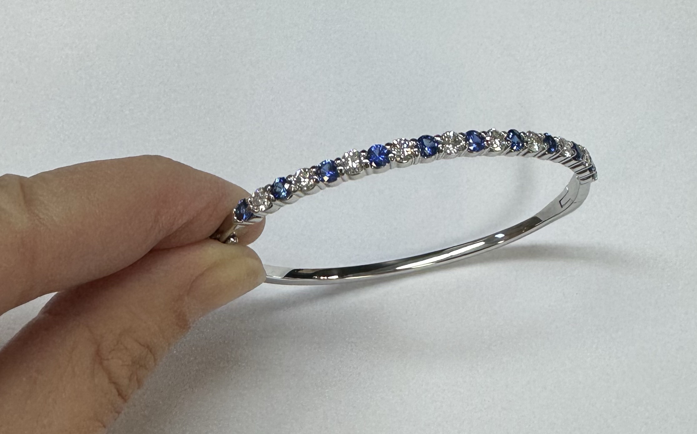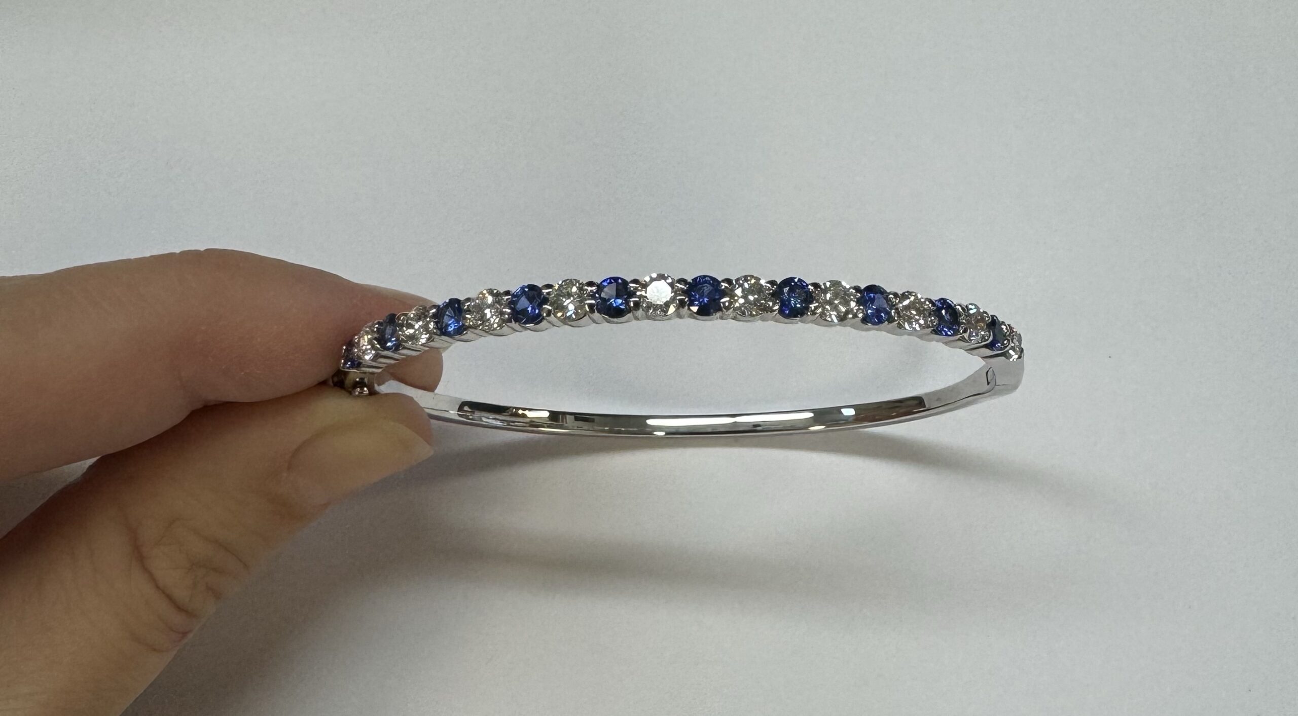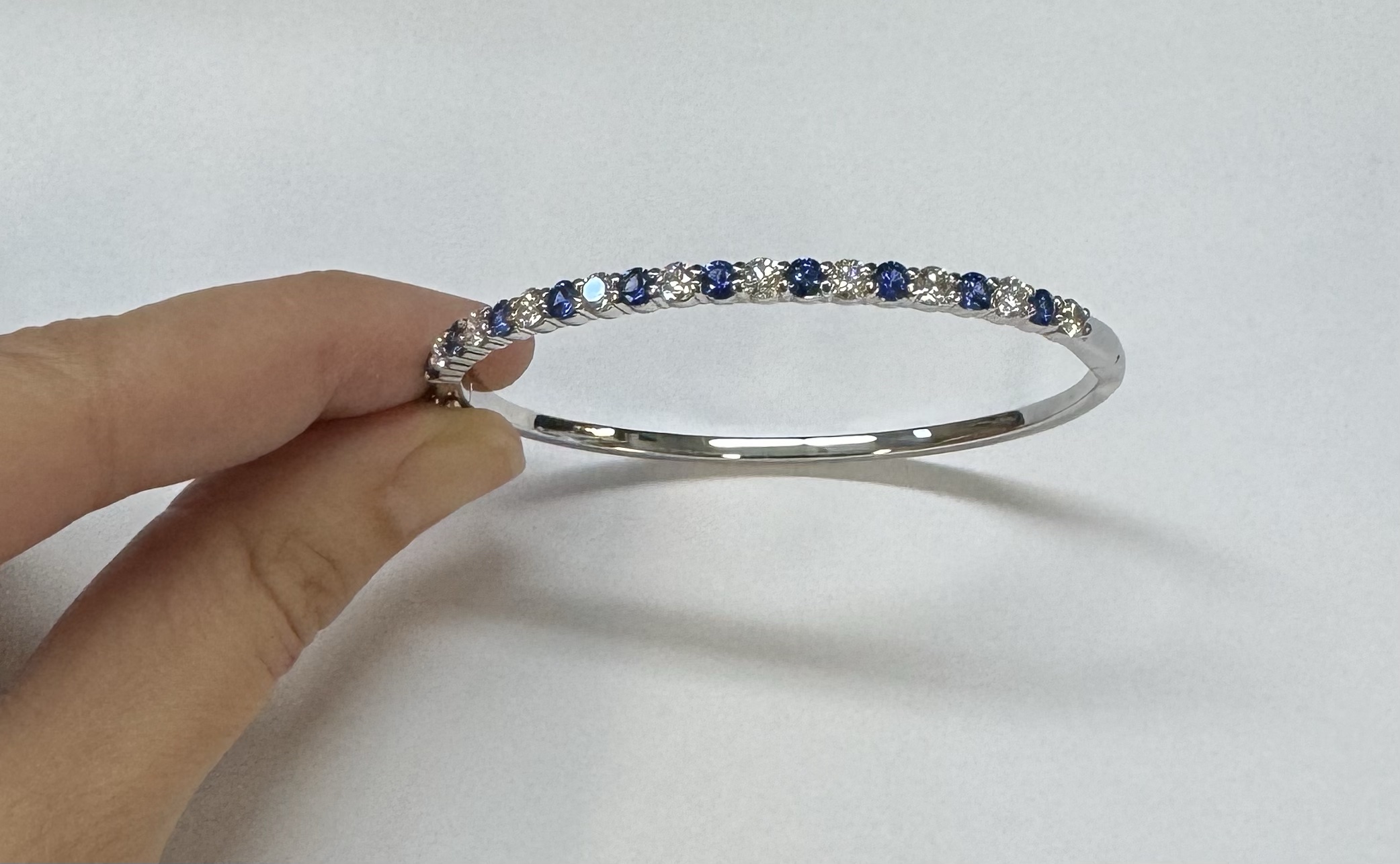 Lady’s 14k white gold oval shaped, hinged, genuine Sapphire & Diamond shared prong bangle bracelet with safety hinge. This bracelet consists of 10 genuine round, faceted Sapphires, which have a total combined weight of 1.50 carats. These Sapphires have vivid medium blue color with very good clarity. The Sapphires are set alternately with 10 genuine Round Brilliant Cut diamonds, which have a total combined weight of 1.39 carats. These diamonds average (H-I) in color, and SI1 in clarity. These diamonds are nicely proportioned and well finished. This bracelet has an entire weight of 14.6 grams, and it measures 7.5″ all of the way around the outside.