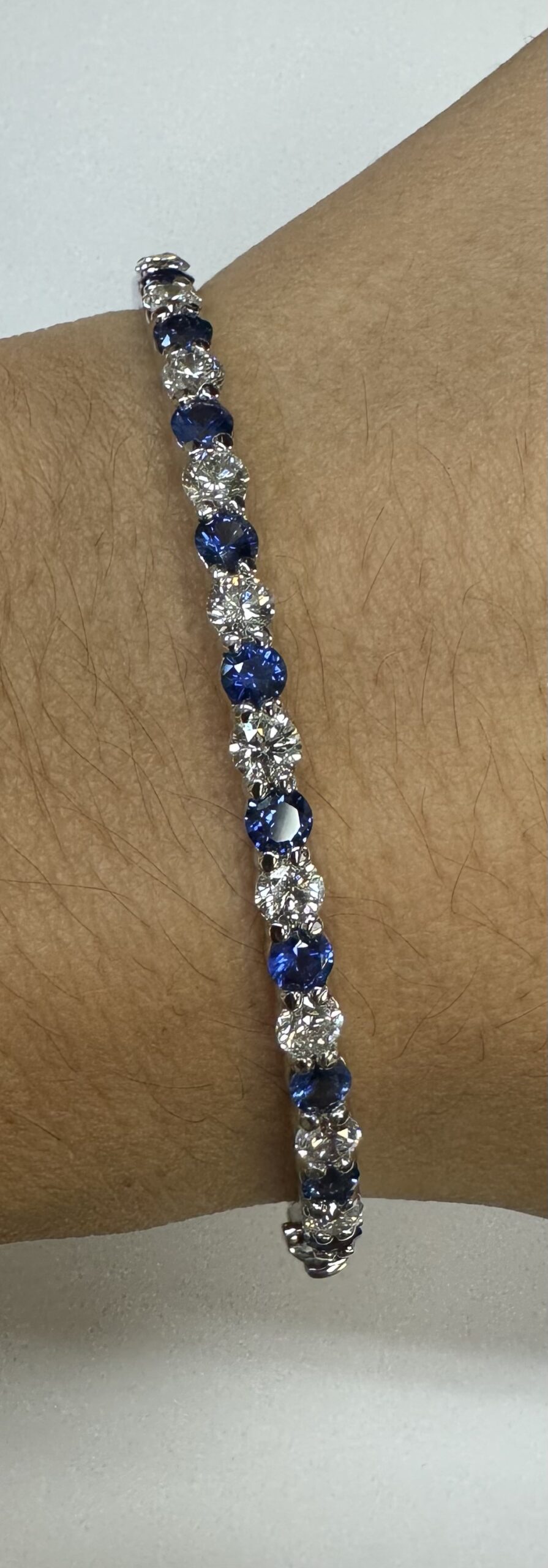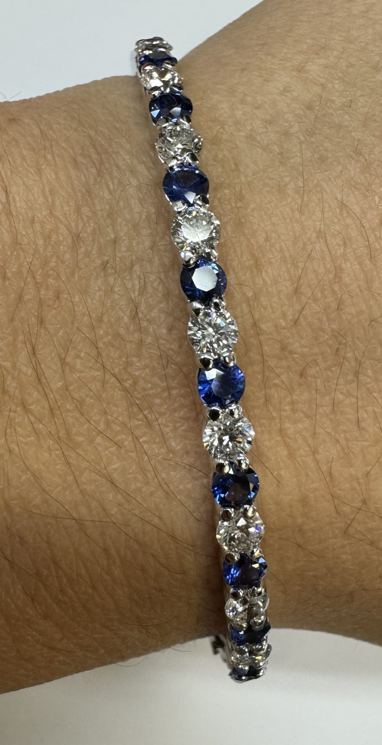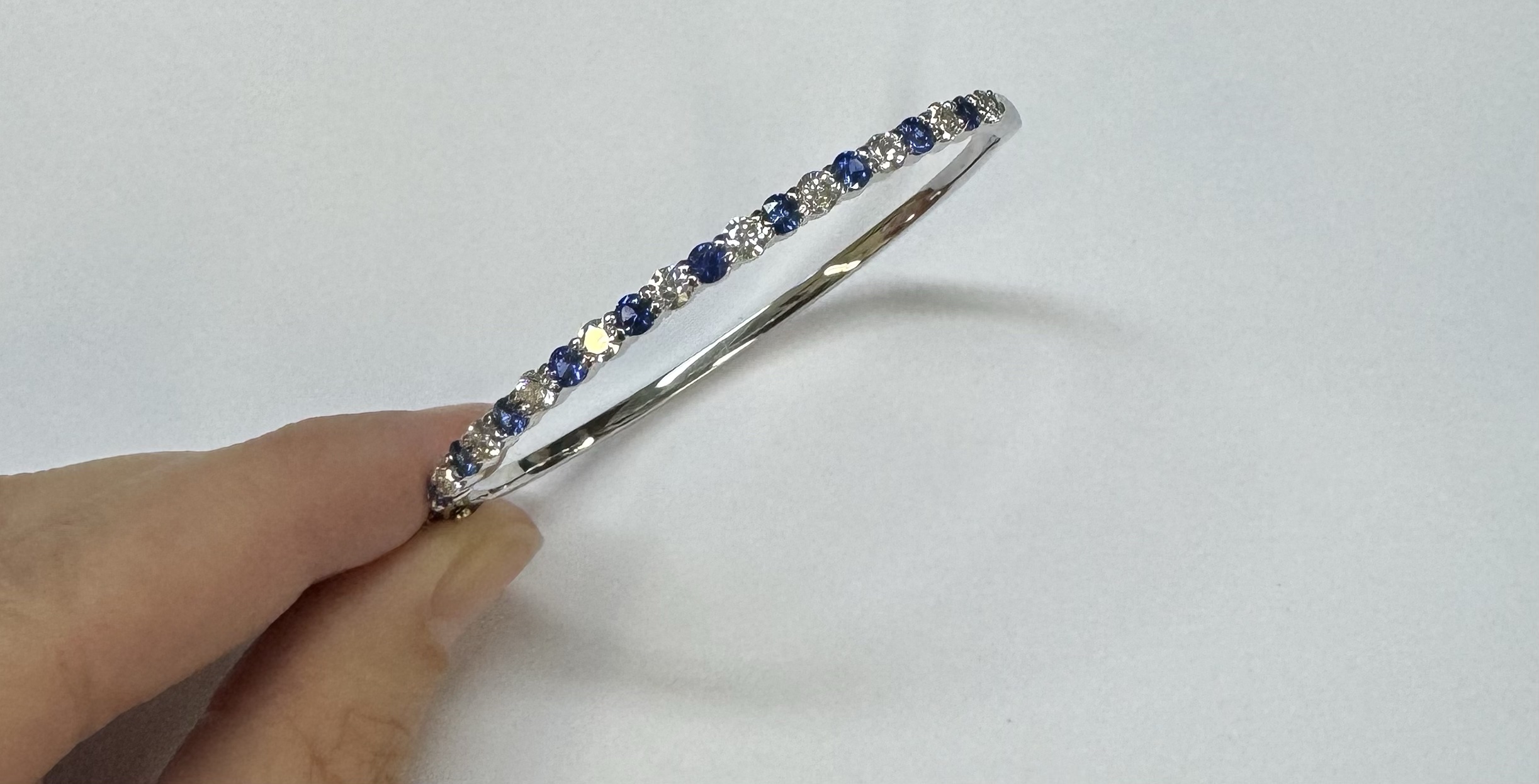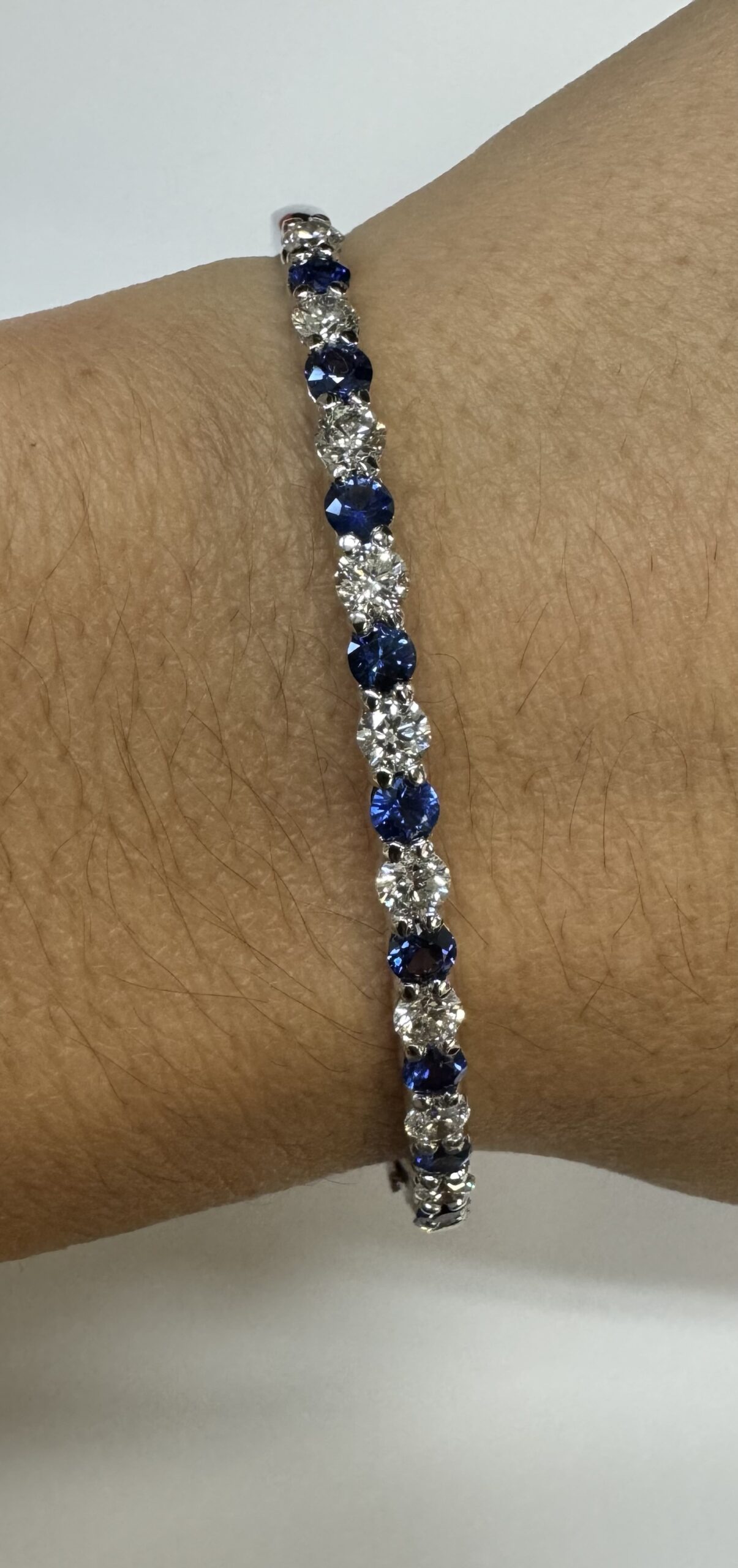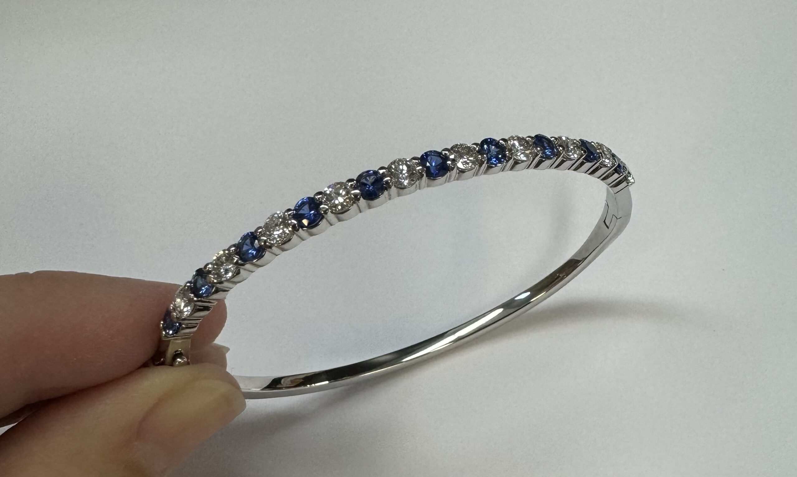 Lady’s 14k white gold oval shaped, hinged, genuine Sapphire & Diamond shared prong bangle bracelet with safety hinge. This bracelet consists of 10 genuine round, faceted Sapphires, which have a total combined weight of 1.50 carats. These Sapphires have vivid medium blue color with very good clarity. The Sapphires are set alternately with 10 genuine Round Brilliant Cut diamonds, which have a total combined weight of 1.39 carats. These diamonds average (H-I) in color, and SI1 in clarity. These diamonds are nicely proportioned and well finished. This bracelet has an entire weight of 14.6 grams, and it measures 7.5″ all of the way around the outside.