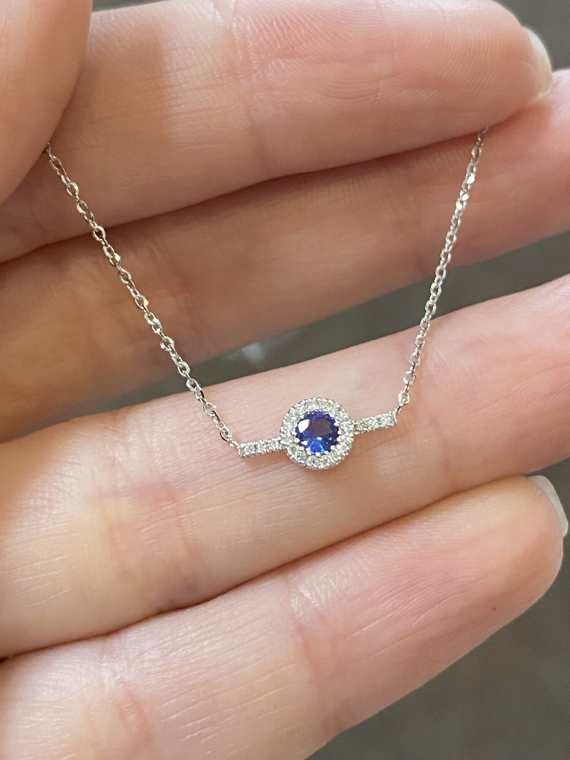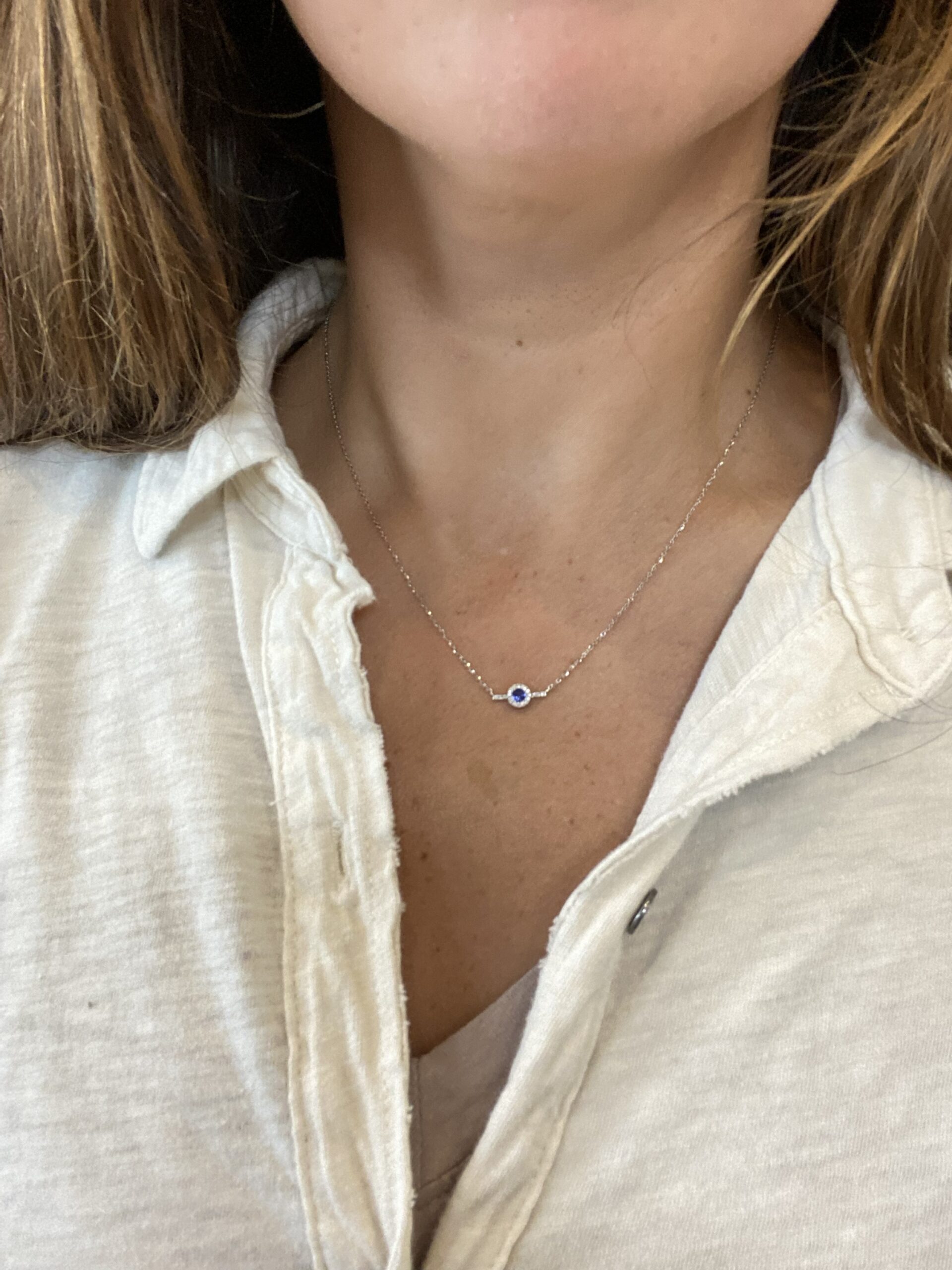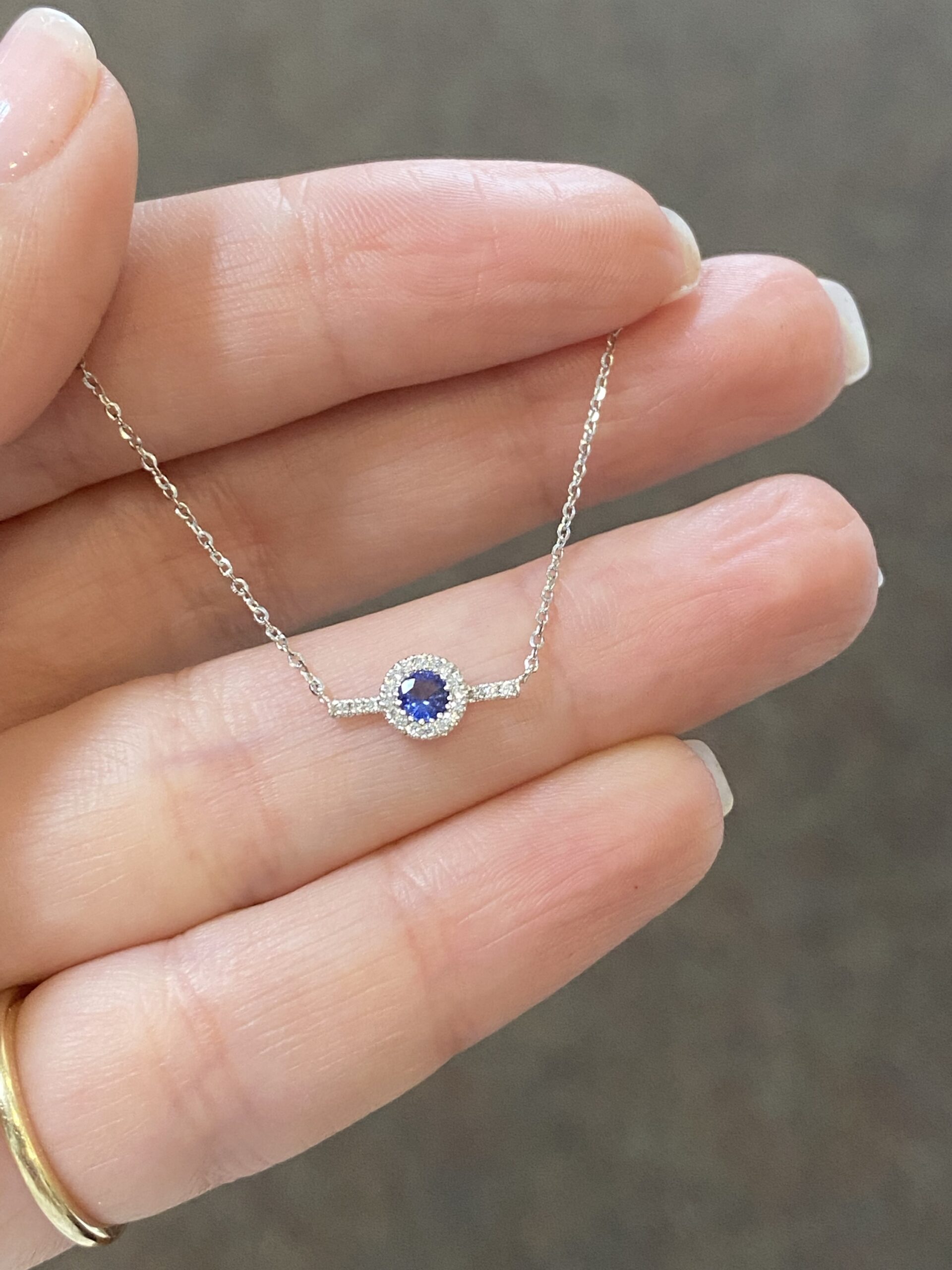 14k white gold genuine Round Brilliant Cut, faceted .16 cttw Sapphire & genuine Round Brilliant Cut diamond delicate halo pendant on an adjustable 15.5-17.5″ chain. These diamonds average G-H in color, SI in clarity.