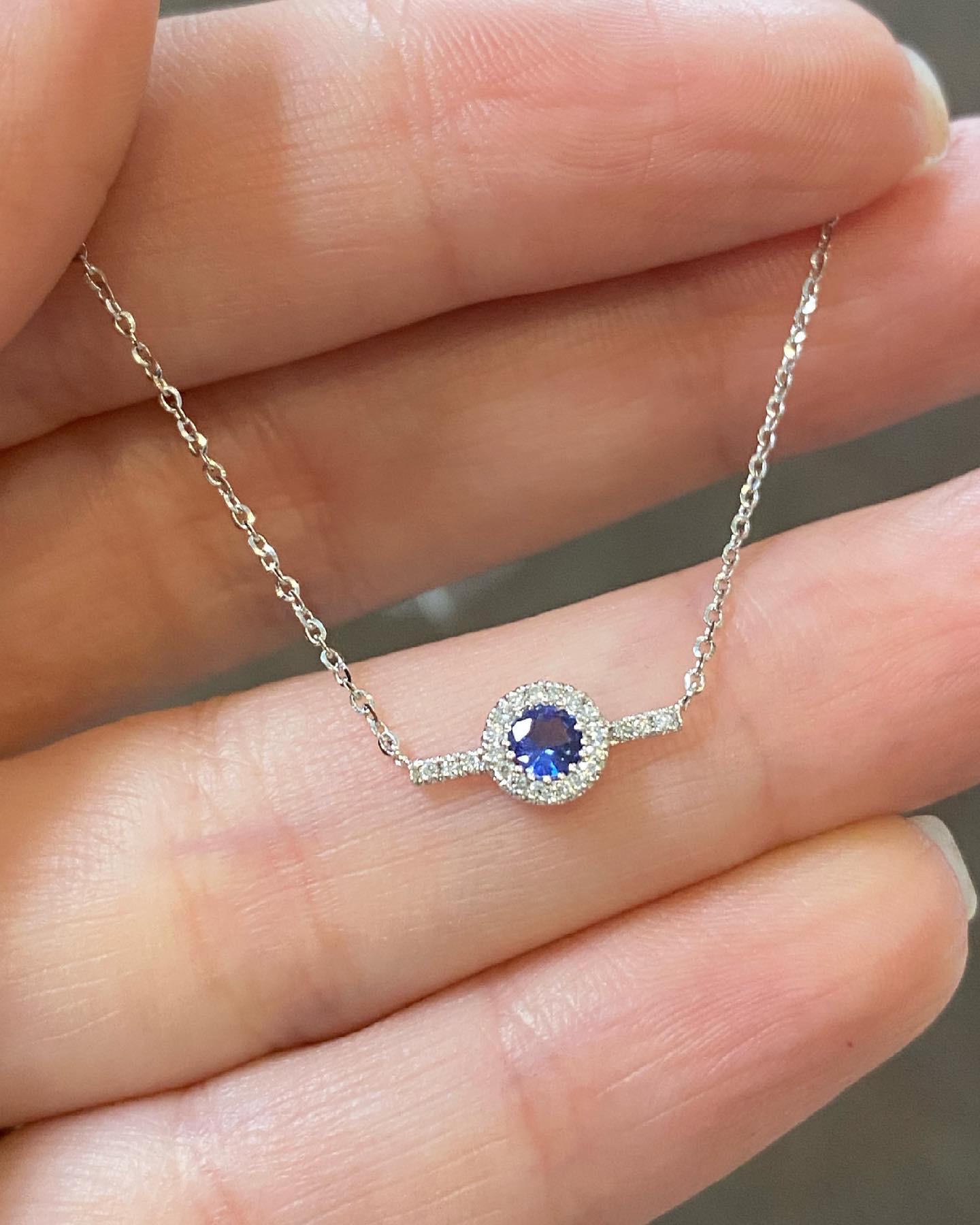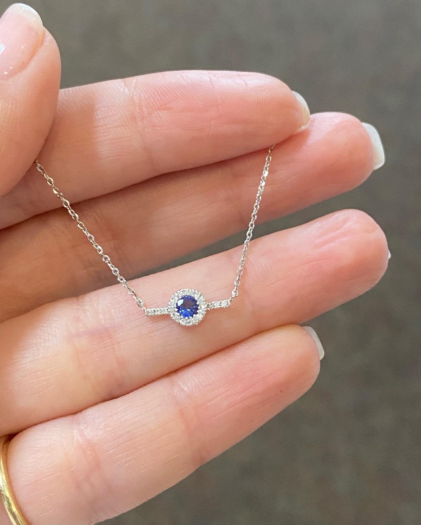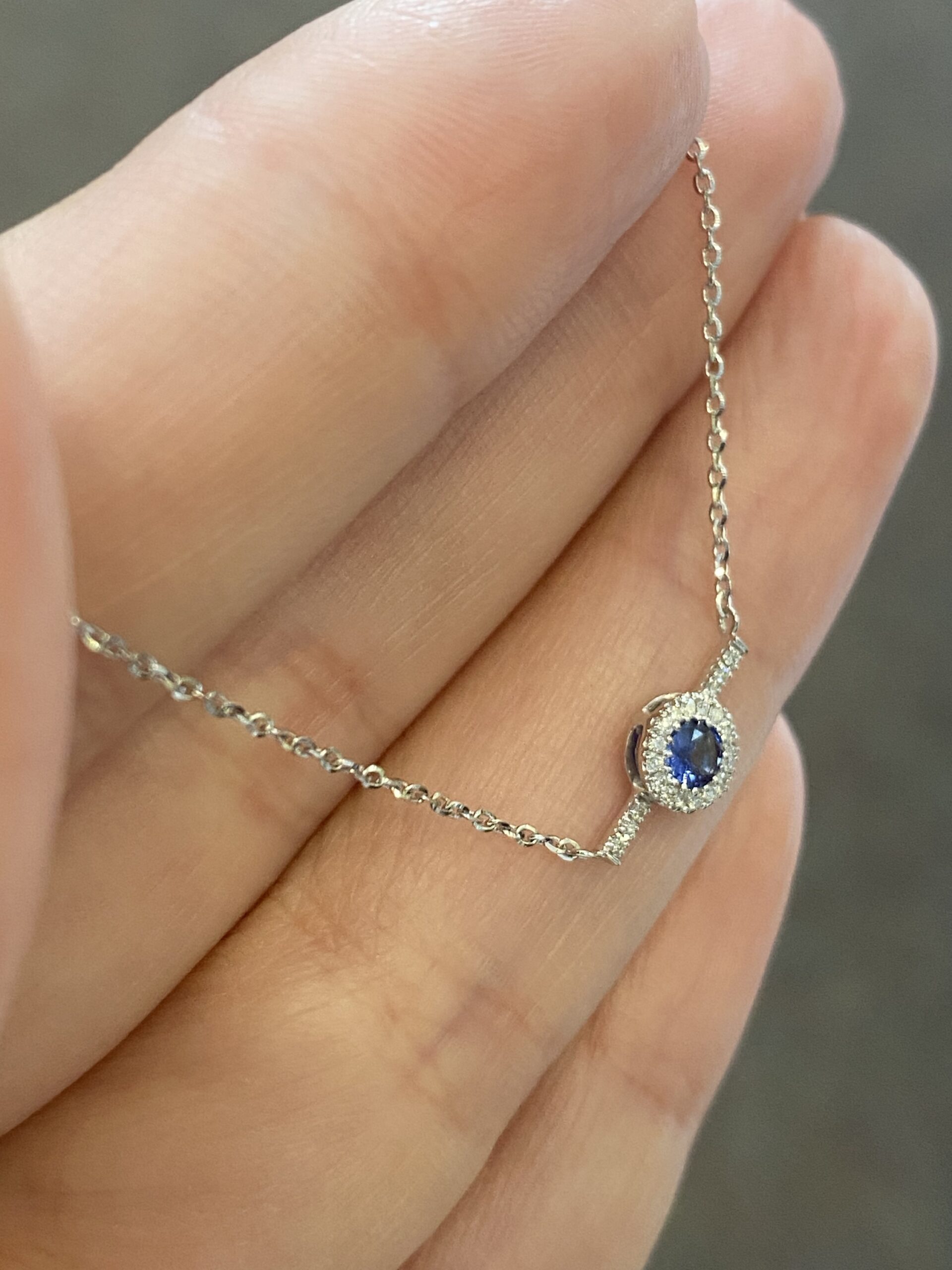 14k white gold genuine Round Brilliant Cut, faceted .16 cttw Sapphire & genuine Round Brilliant Cut diamond delicate halo pendant on an adjustable 15.5-17.5″ chain. These diamonds average G-H in color, SI in clarity.