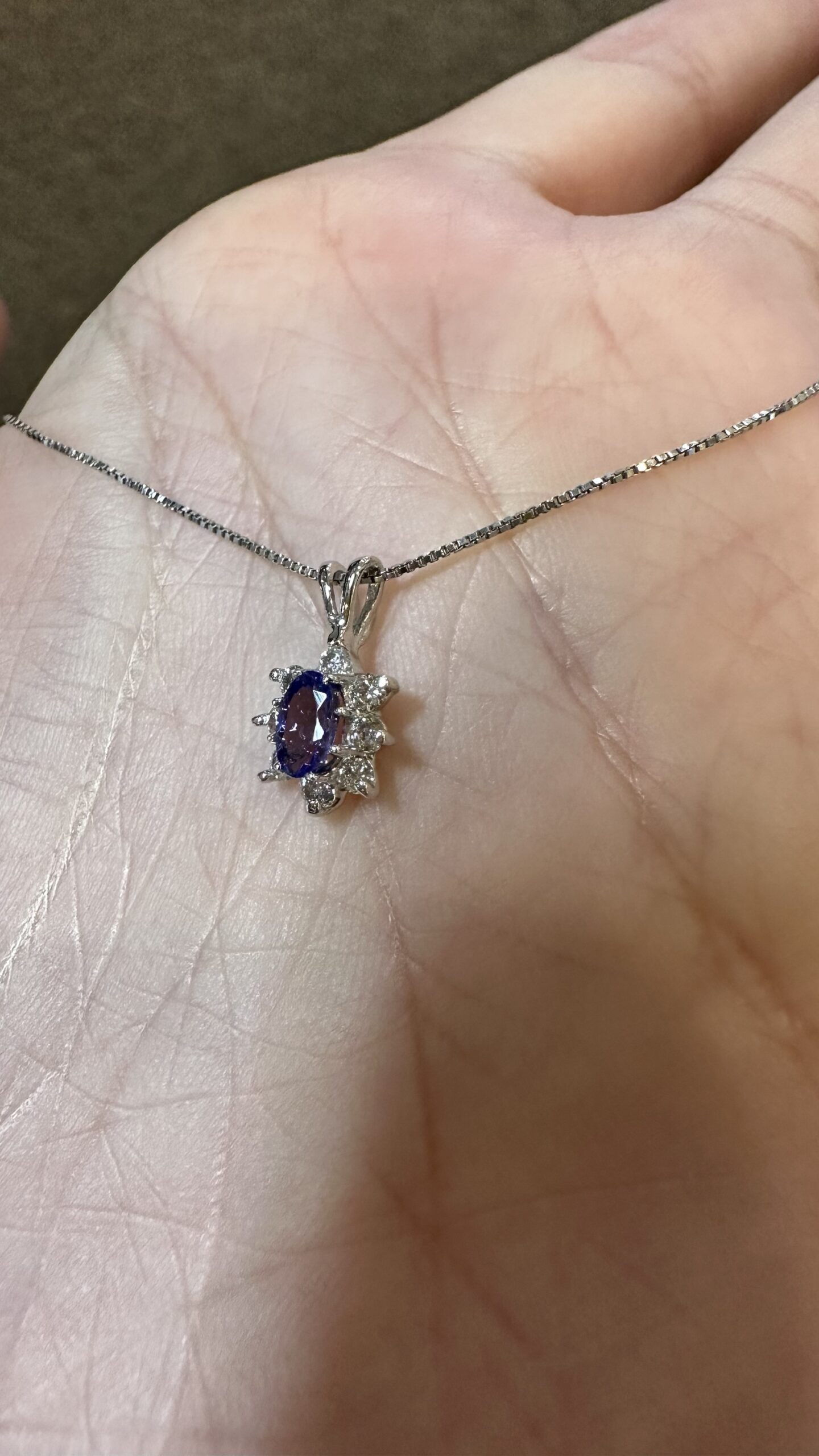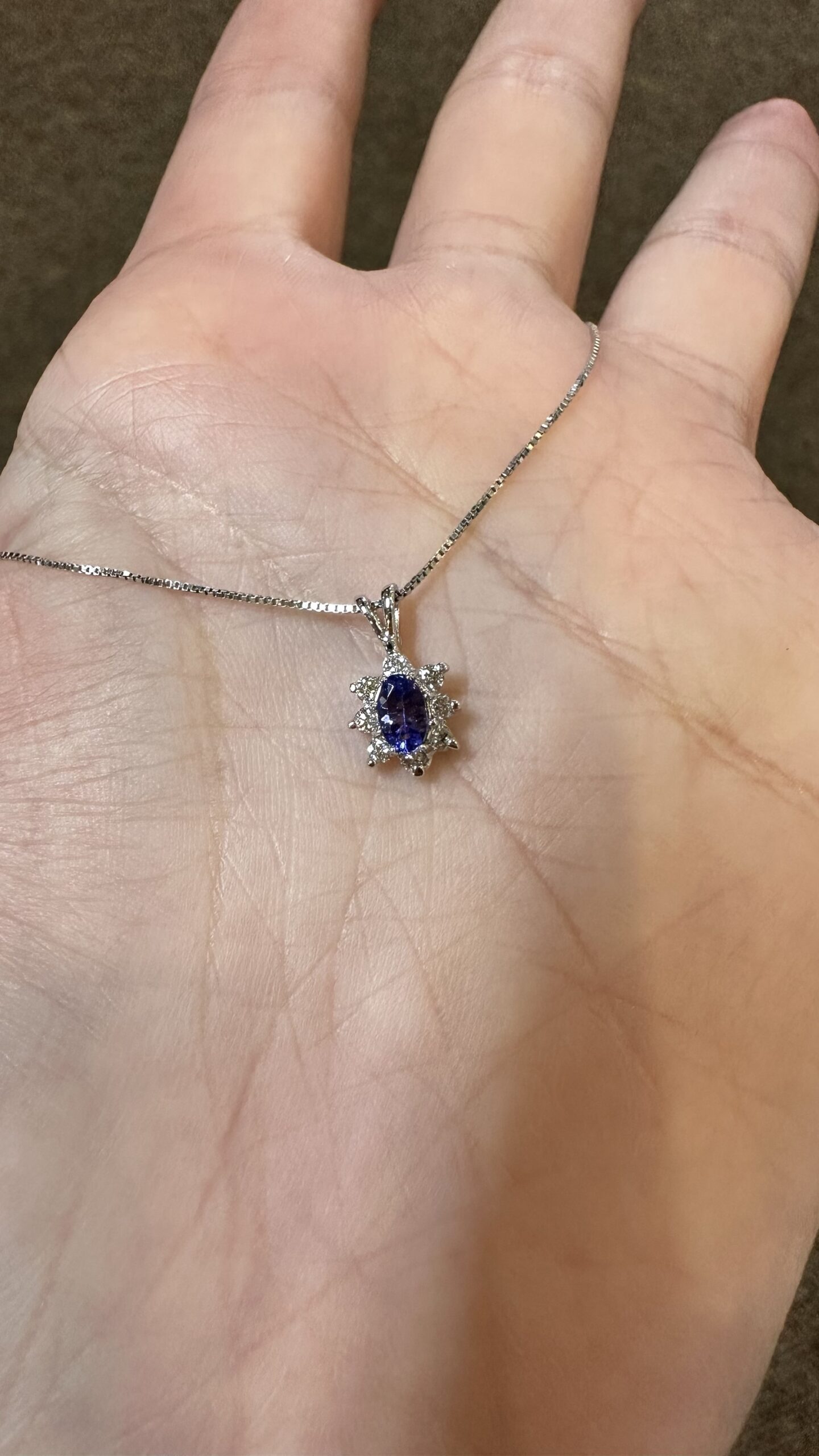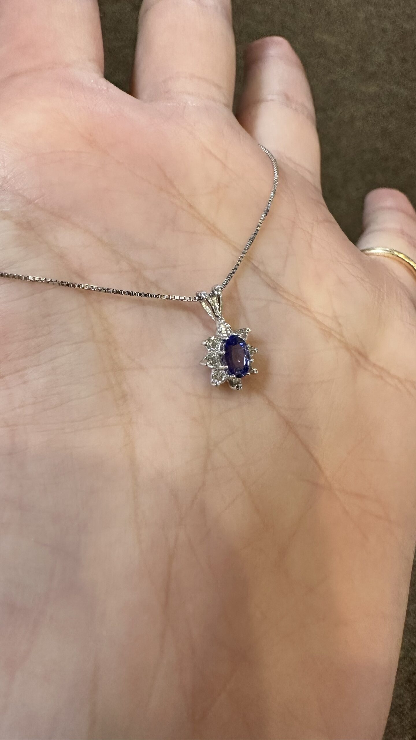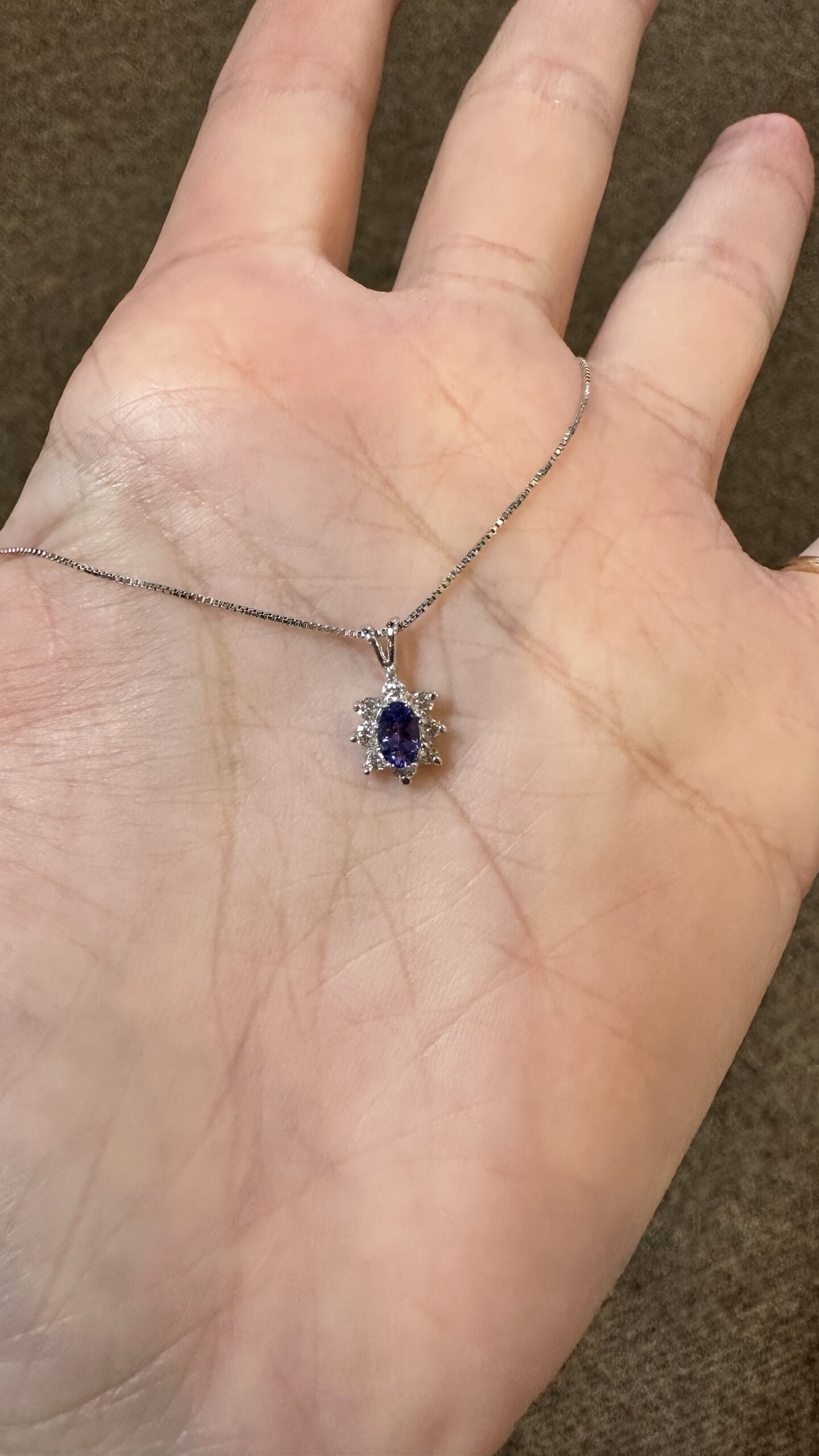 14k white gold genuine oval shaped, faceted 5 x 3 mm Tanzanite & .16 cttw genuine Round Brilliant Cut diamond cluster pendant. These diamonds average H-I in color and SI2 in clarity. This pendant is suspended from an 18k white gold 17.5″ box chain with spring ring clasp. This piece has an entire weight of 1.8 grams.