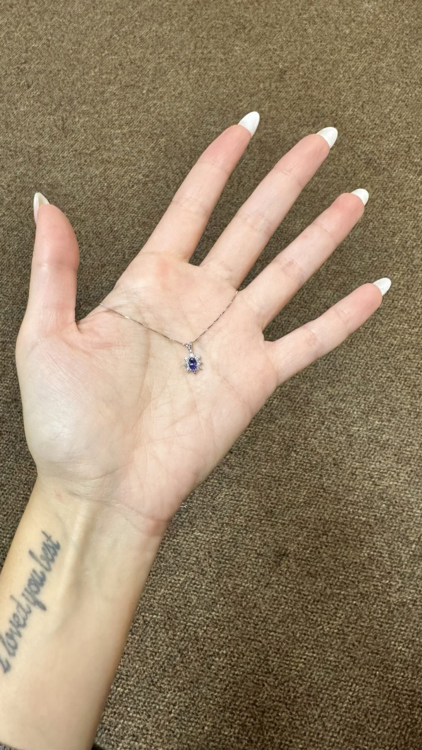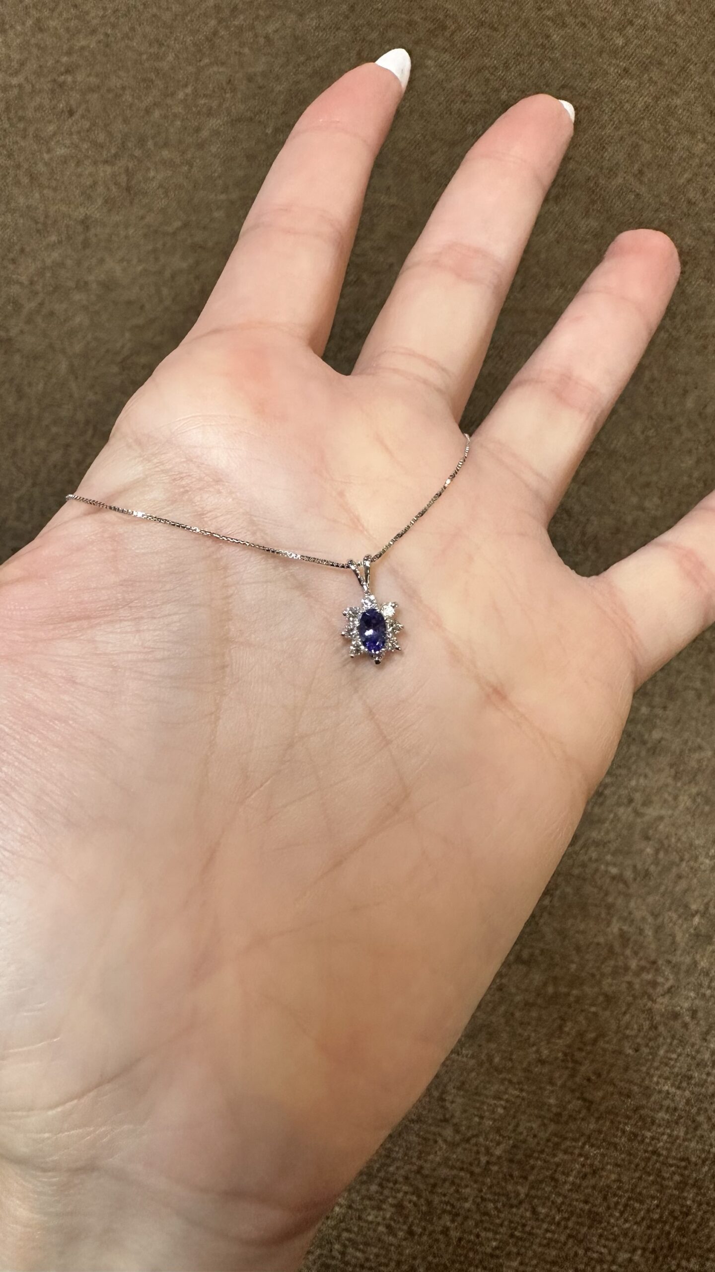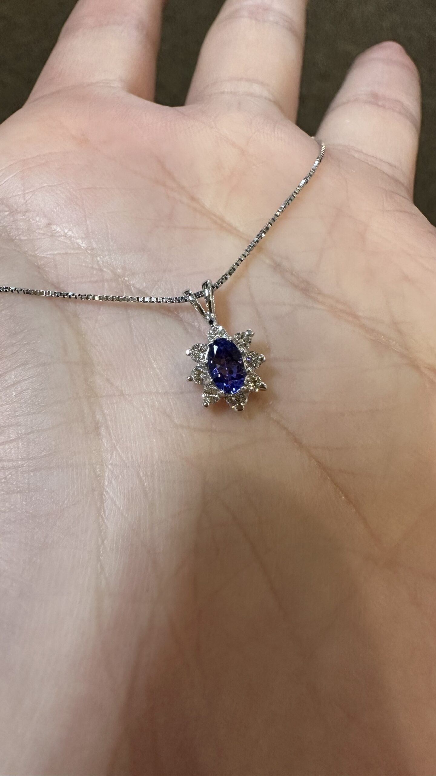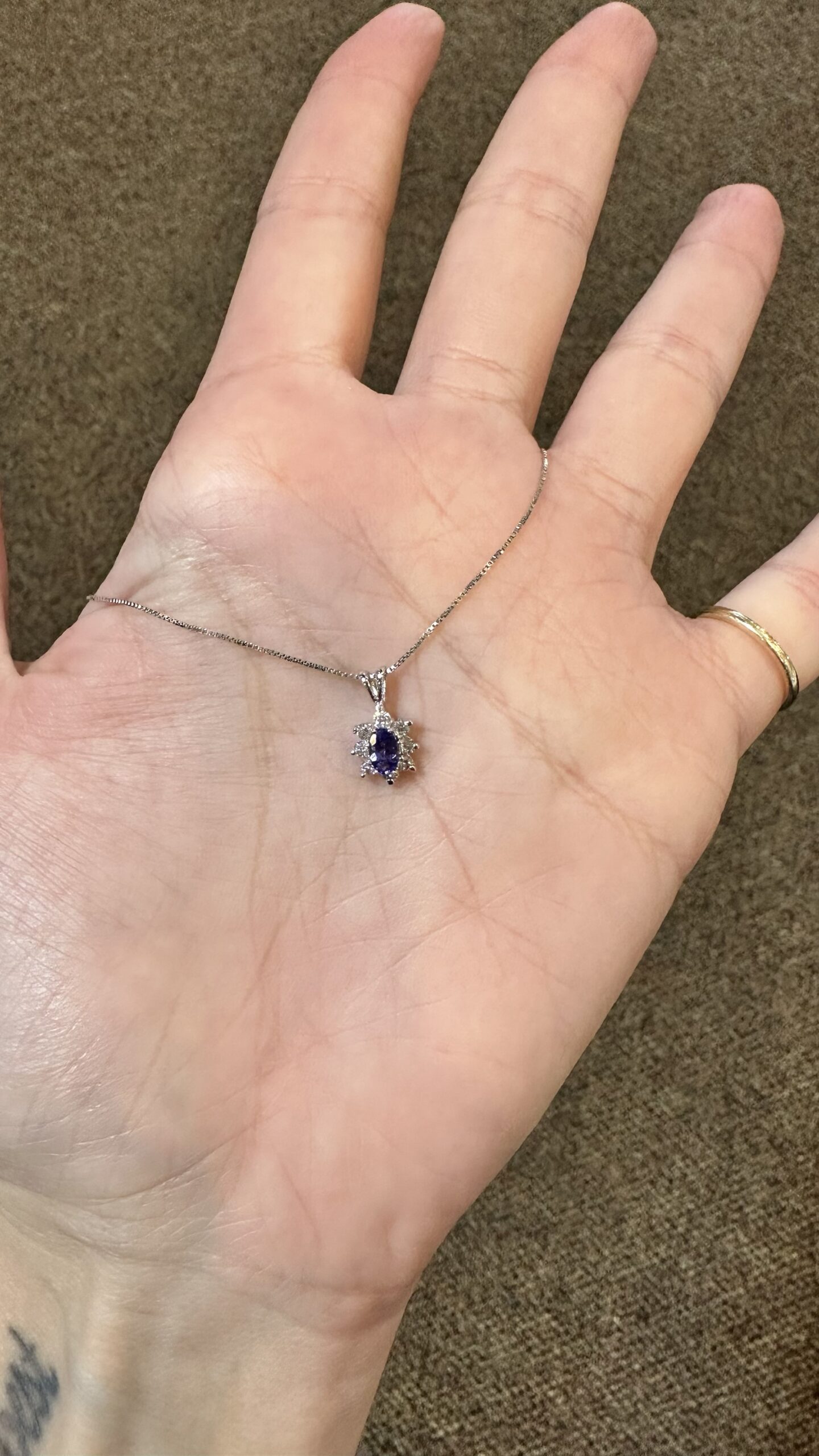 14k white gold genuine oval shaped, faceted 5 x 3 mm Tanzanite & .16 cttw genuine Round Brilliant Cut diamond cluster pendant. These diamonds average H-I in color and SI2 in clarity. This pendant is suspended from an 18k white gold 17.5″ box chain with spring ring clasp. This piece has an entire weight of 1.8 grams.