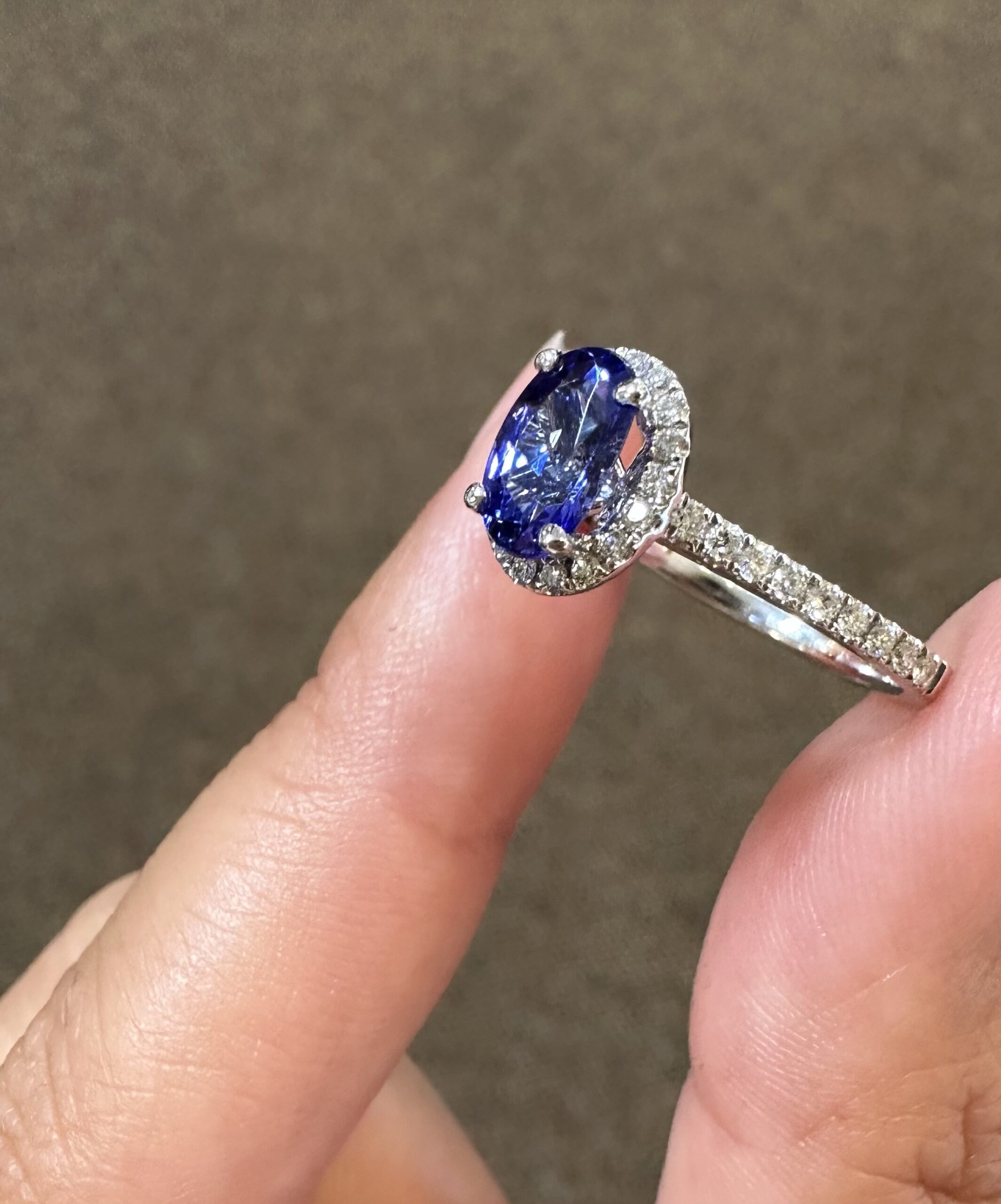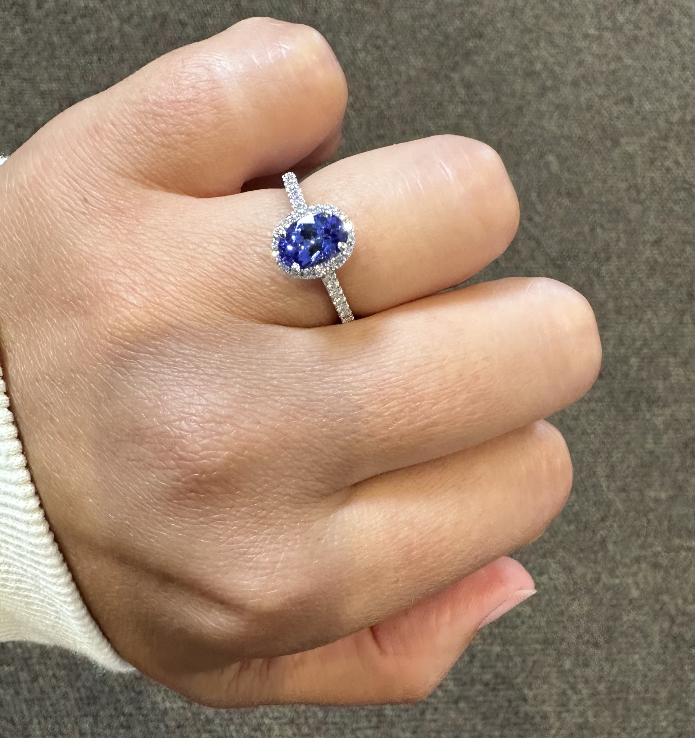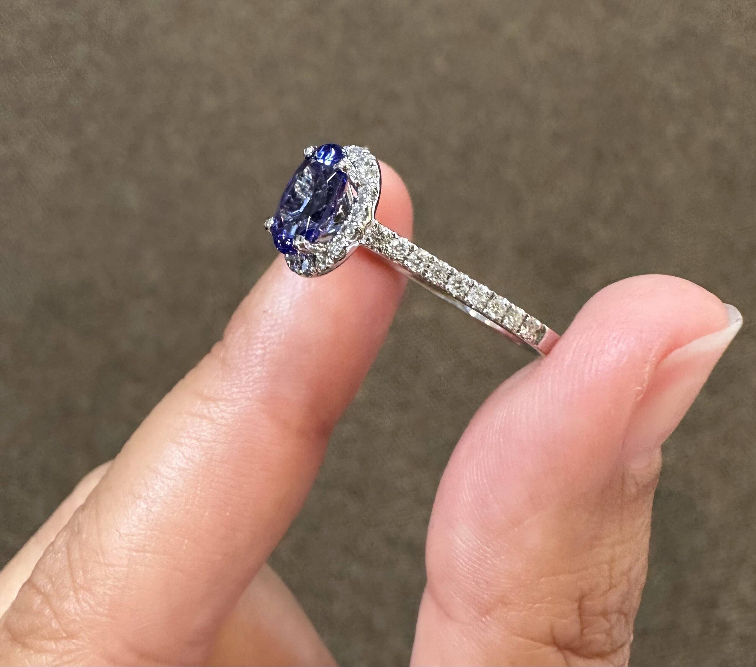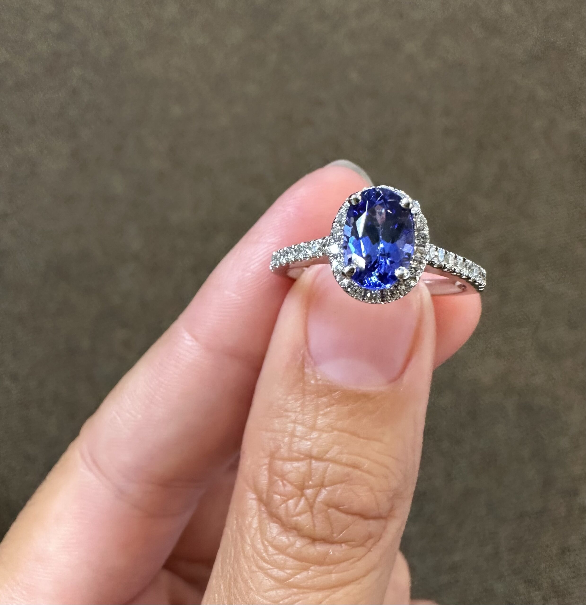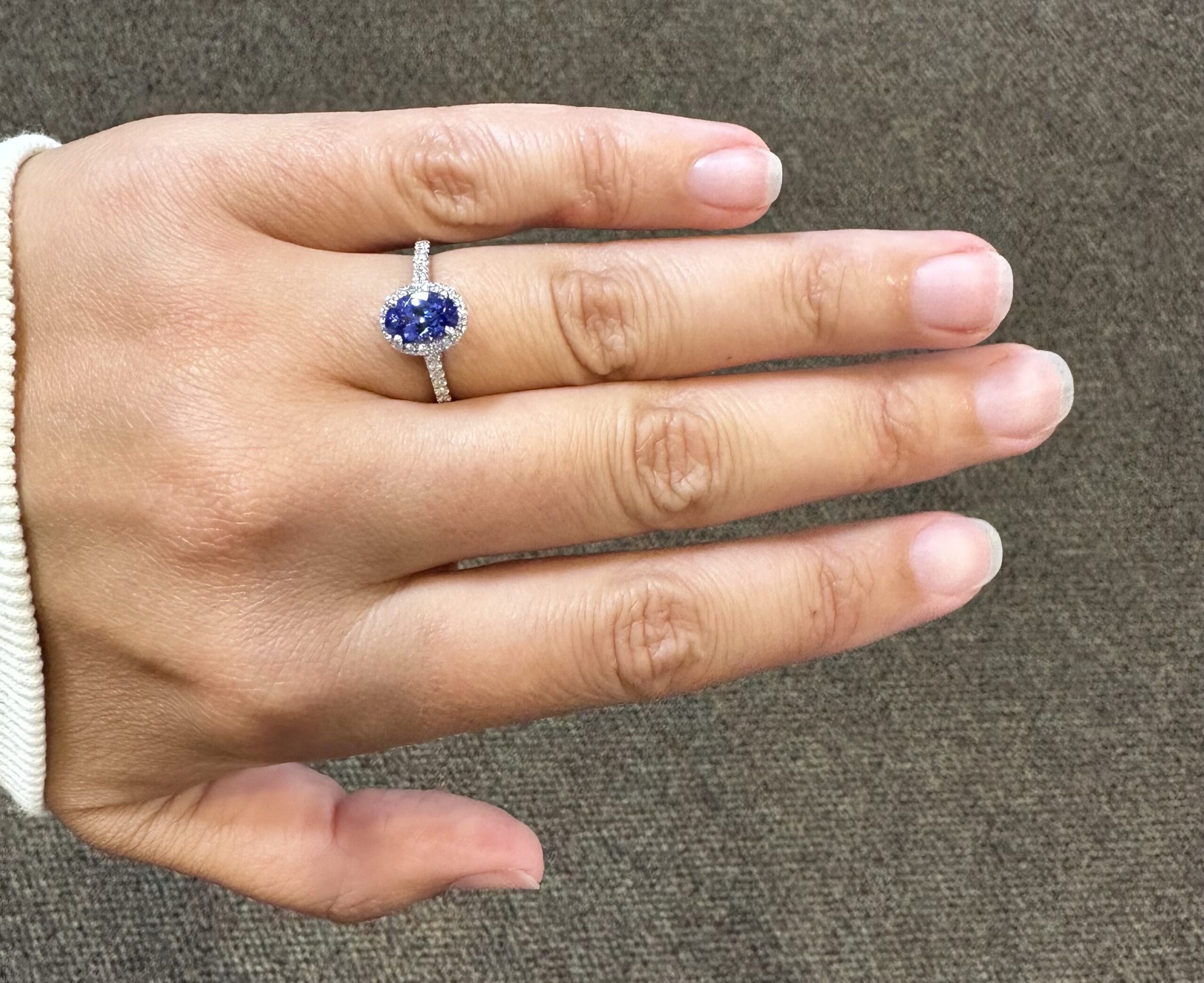 14k white gold genuine oval shaped, 1.07 carat faceted Tanzanite & .27 cttw Round Brilliant Cut diamond halo ring. These diamonds average G-H in color and SI1-SI2 in clarity. These diamonds are nicely proportioned and well finished. This ring has an entire weight of 3.0 grams. This ring is a finger size 6 1/4, but it can be slightly sized. Please make note of the finger size required in the comments section at checkout.