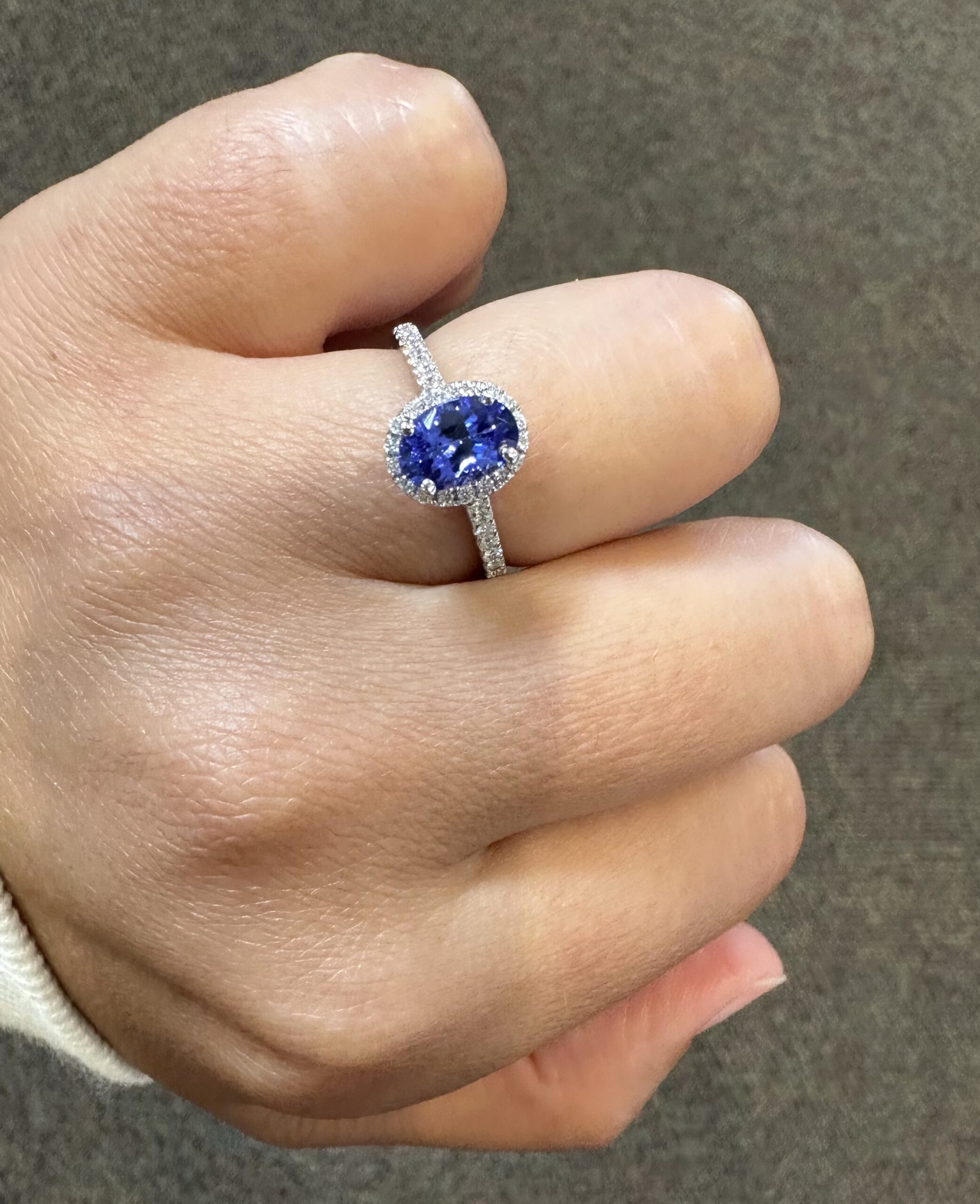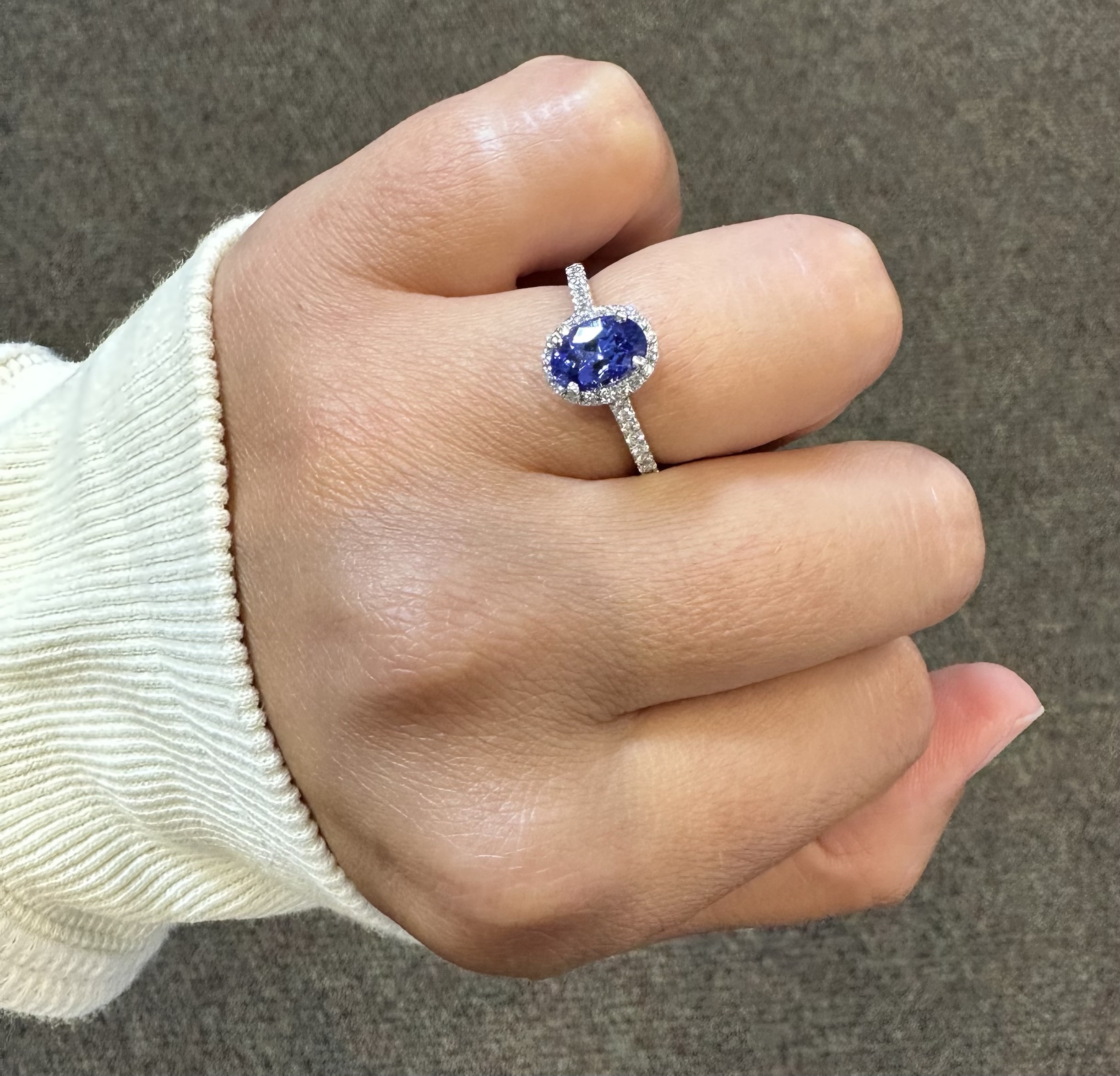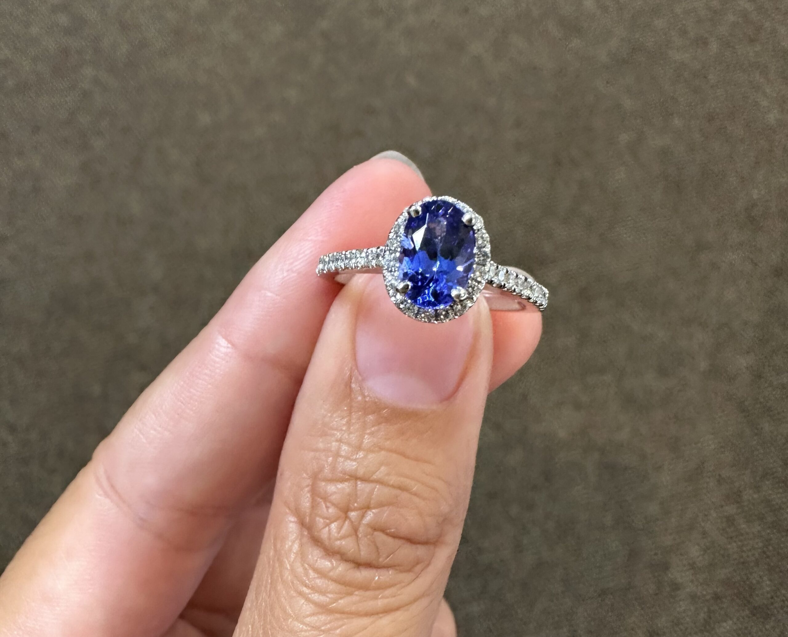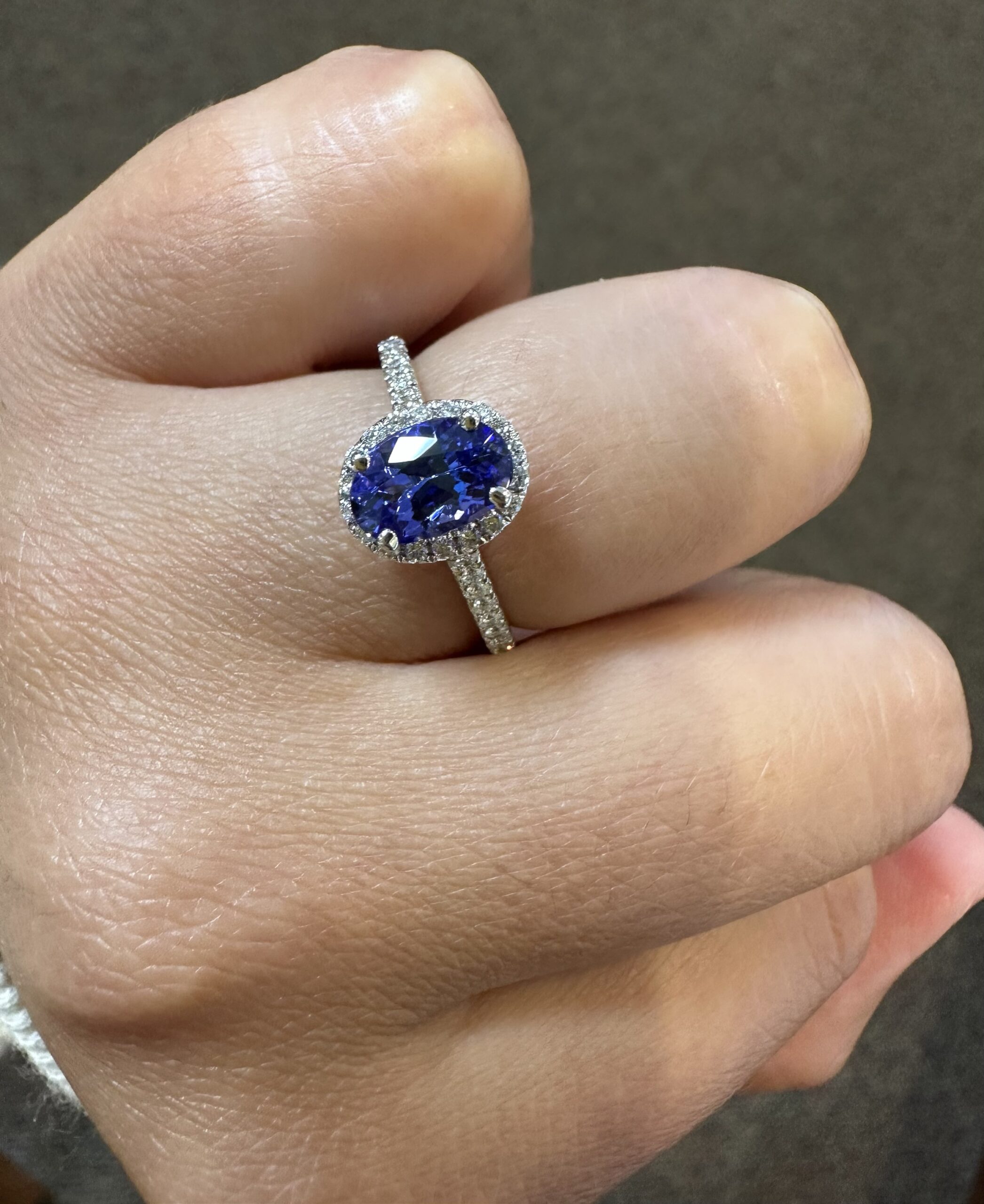 14k white gold genuine oval shaped, 1.07 carat faceted Tanzanite & .27 cttw Round Brilliant Cut diamond halo ring. These diamonds average G-H in color and SI1-SI2 in clarity. These diamonds are nicely proportioned and well finished. This ring has an entire weight of 3.0 grams. This ring is a finger size 6 1/4, but it can be slightly sized. Please make note of the finger size required in the comments section at checkout.