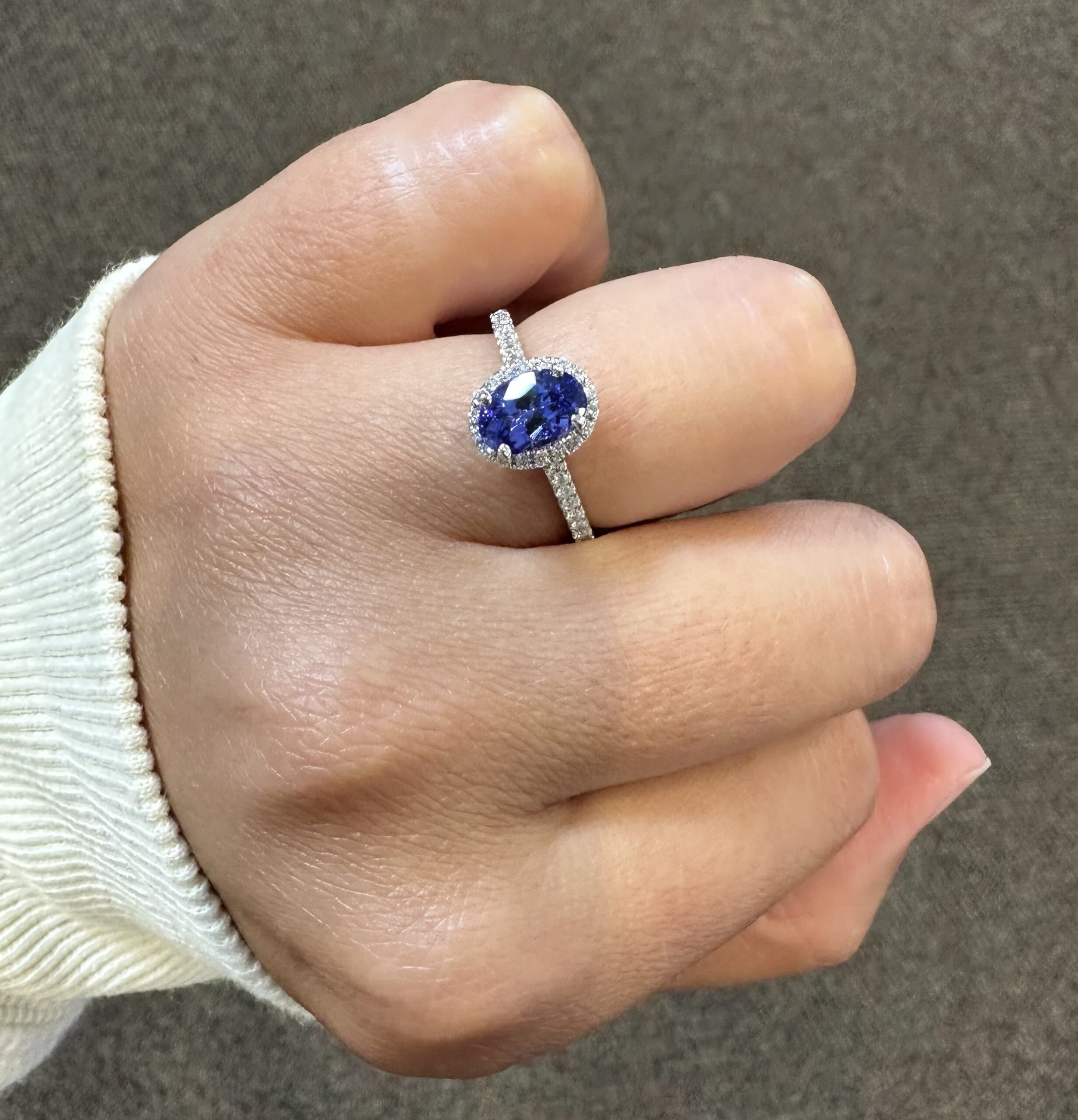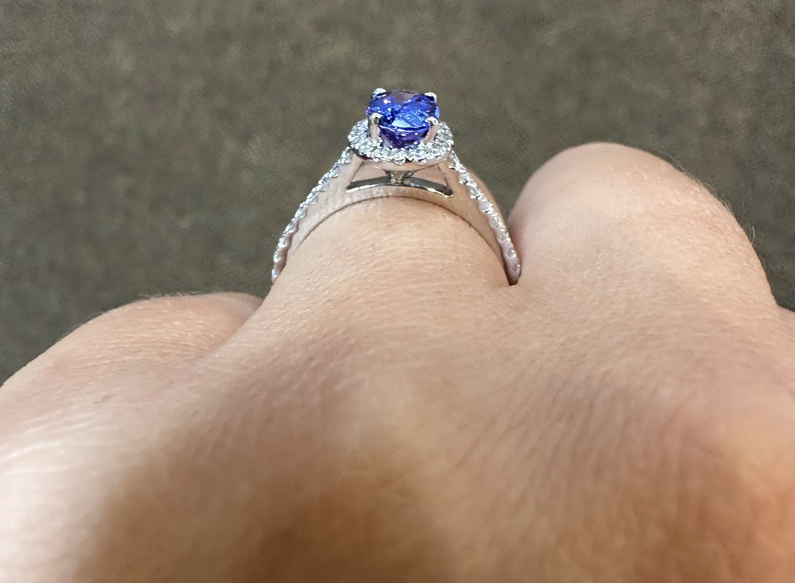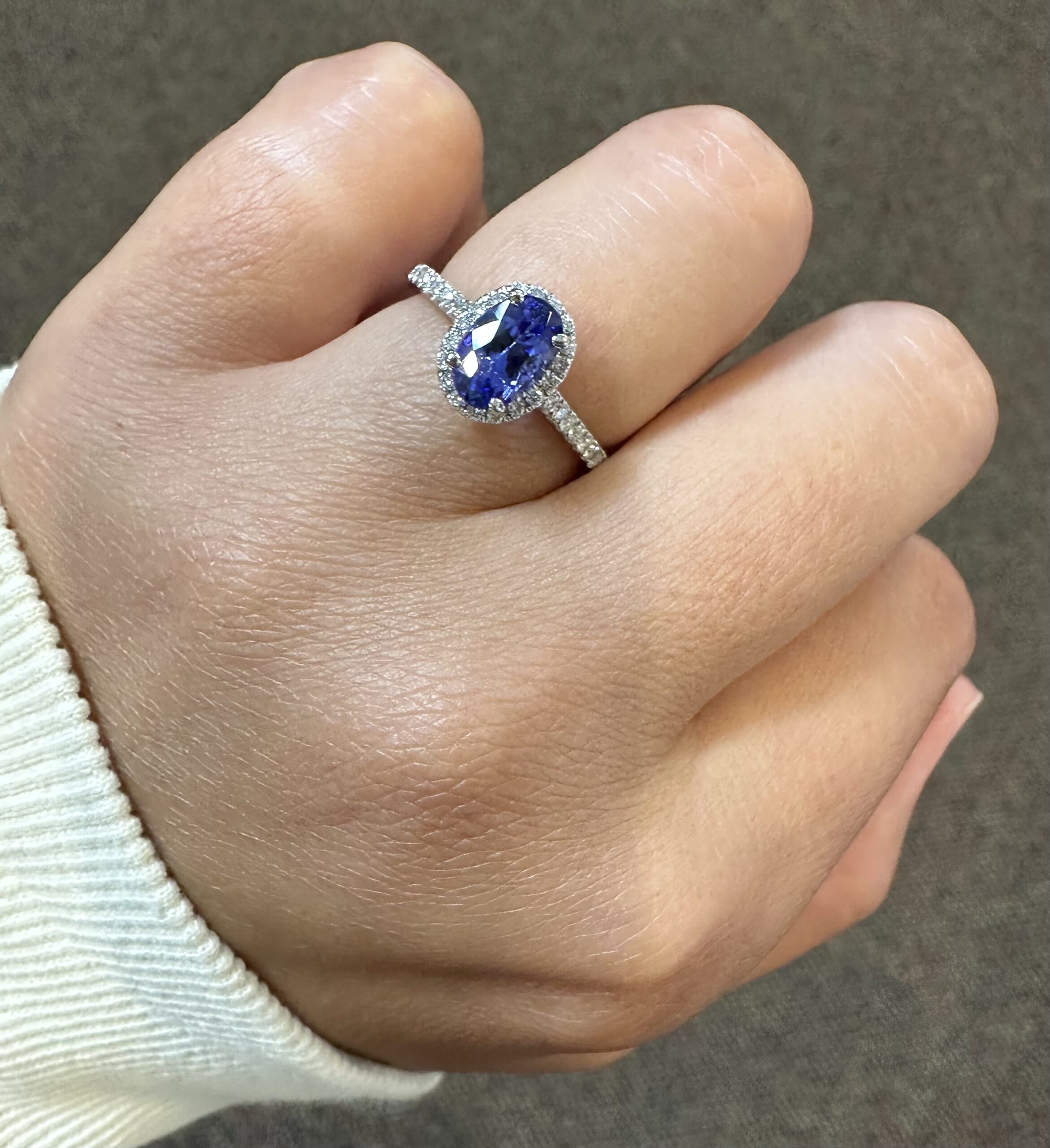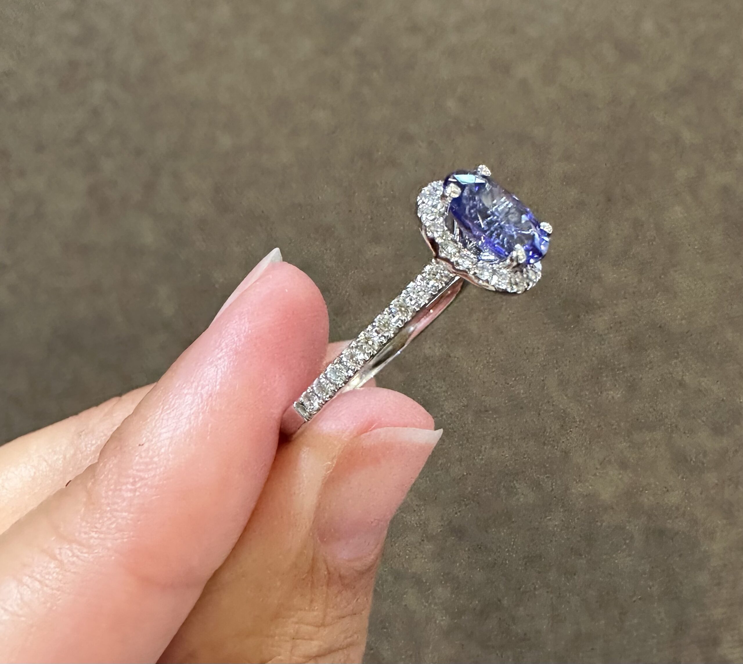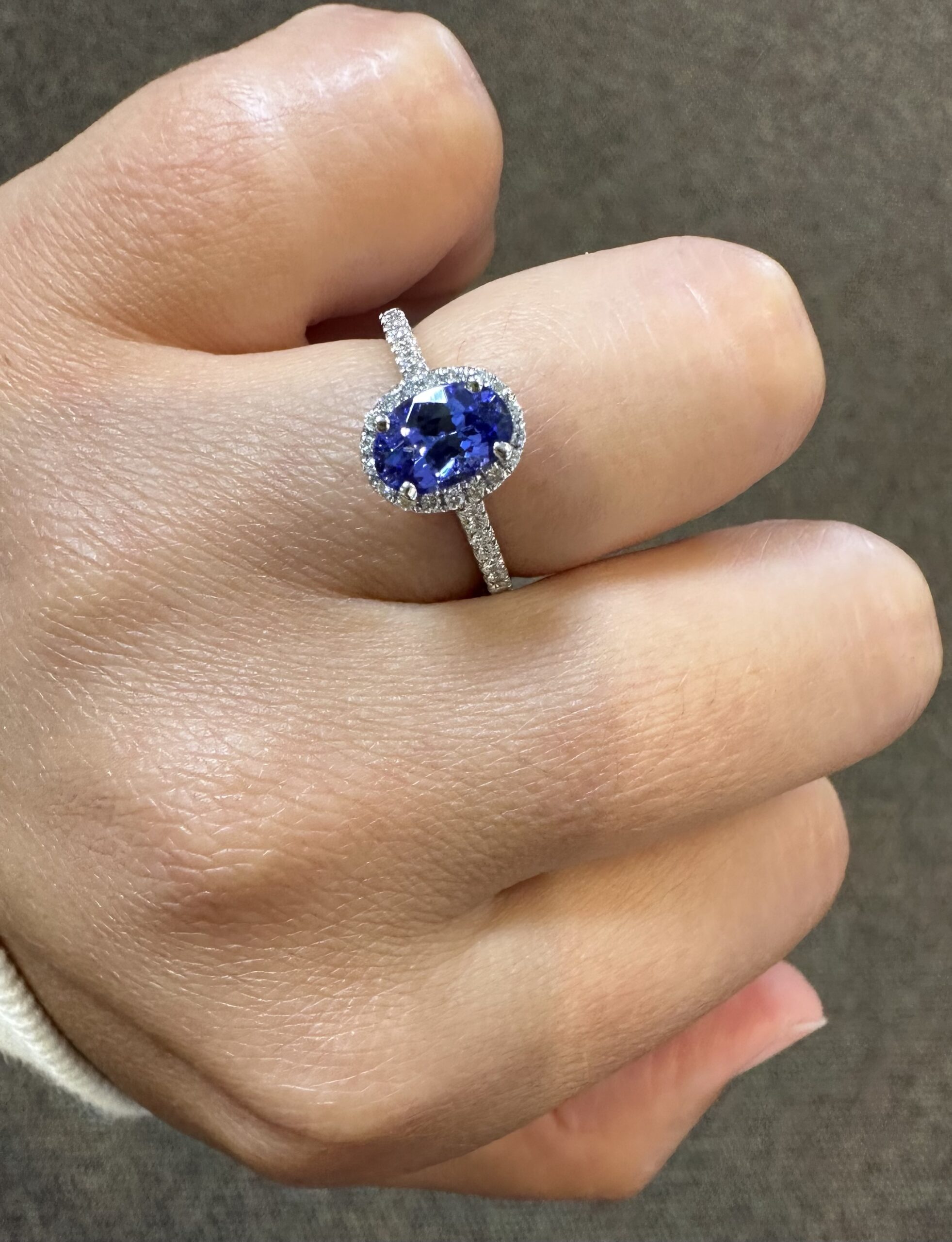 14k white gold genuine oval shaped, 1.07 carat faceted Tanzanite & .27 cttw Round Brilliant Cut diamond halo ring. These diamonds average G-H in color and SI1-SI2 in clarity. These diamonds are nicely proportioned and well finished. This ring has an entire weight of 3.0 grams. This ring is a finger size 6 1/4, but it can be slightly sized. Please make note of the finger size required in the comments section at checkout.