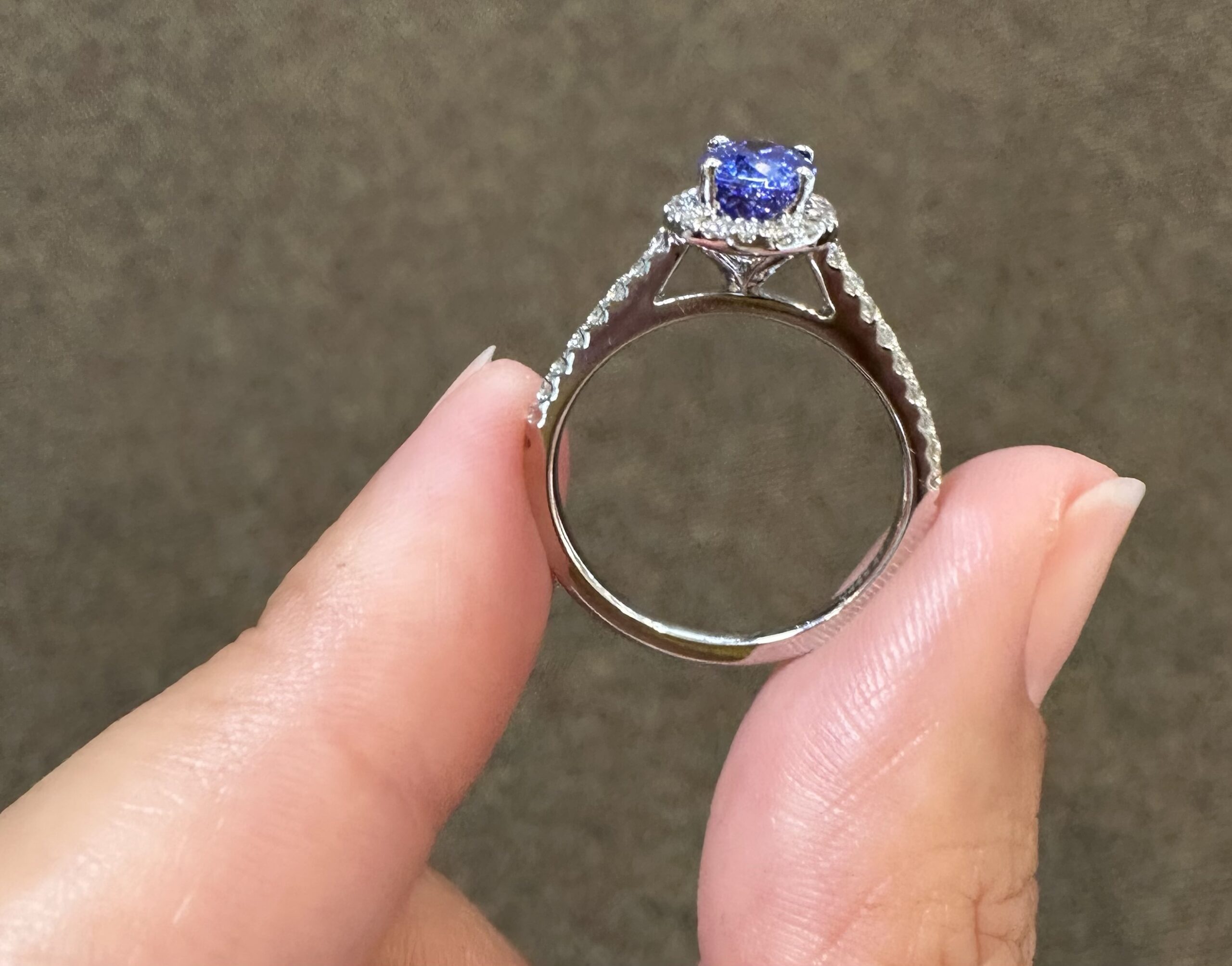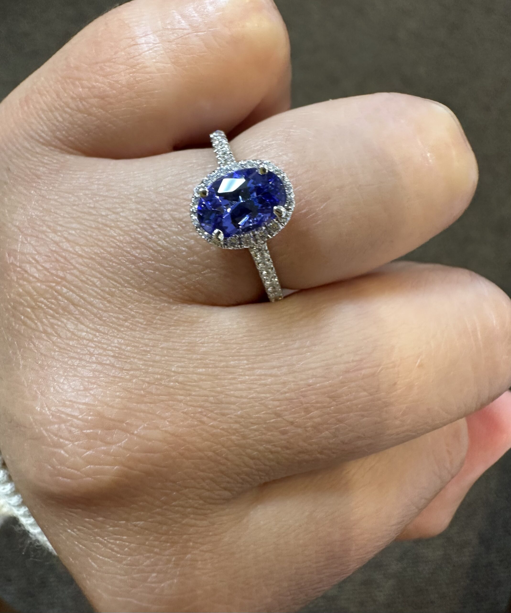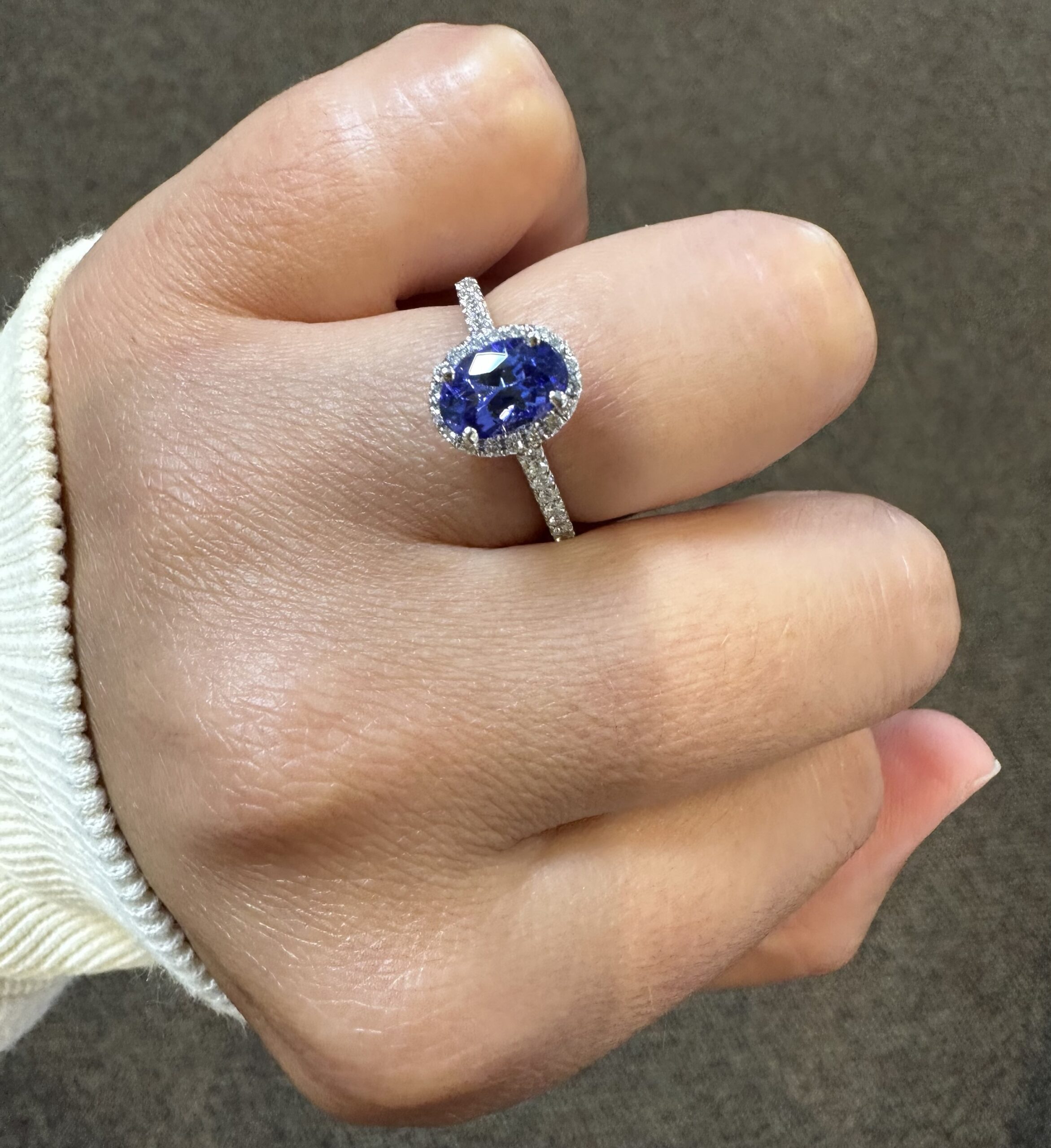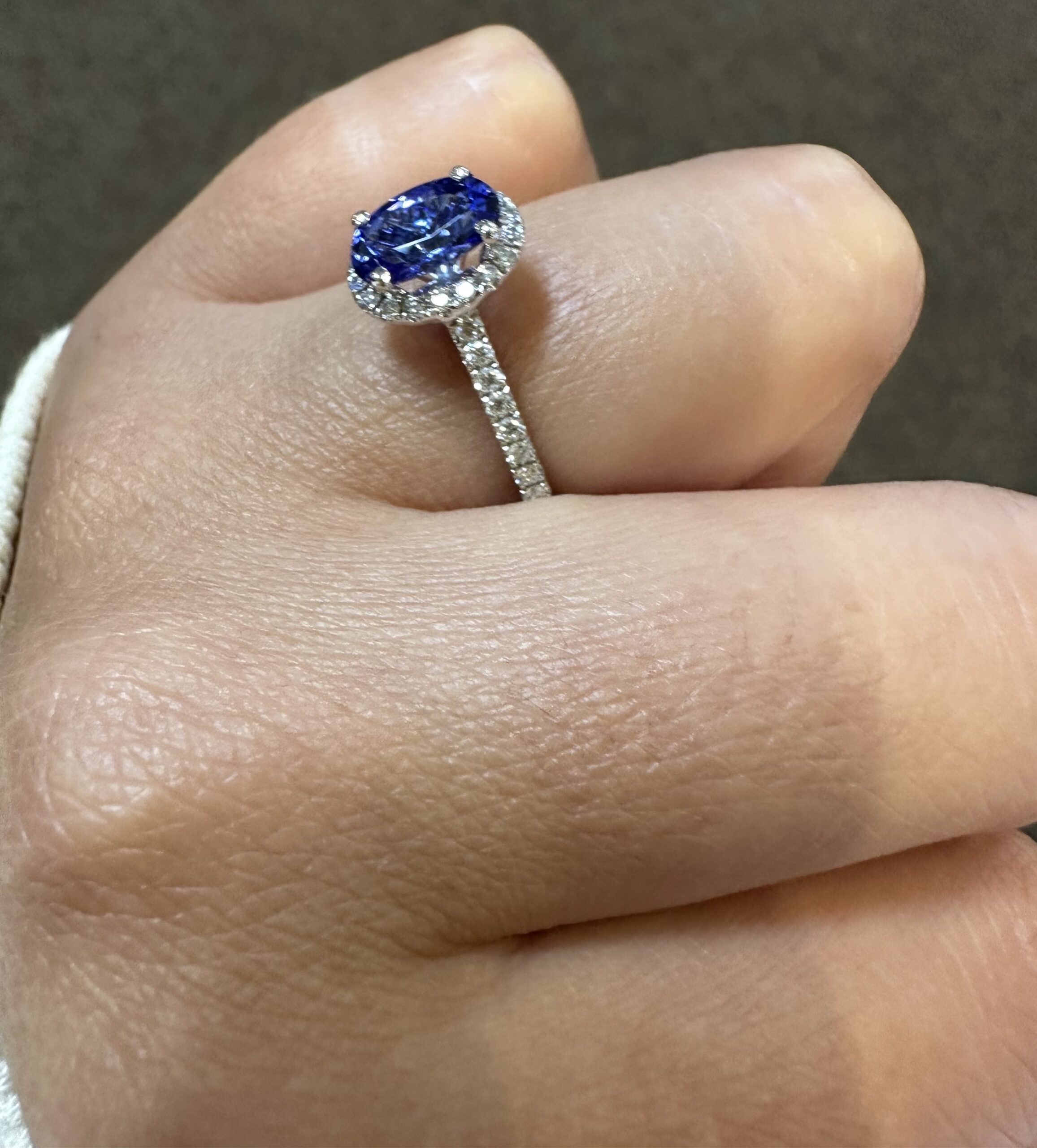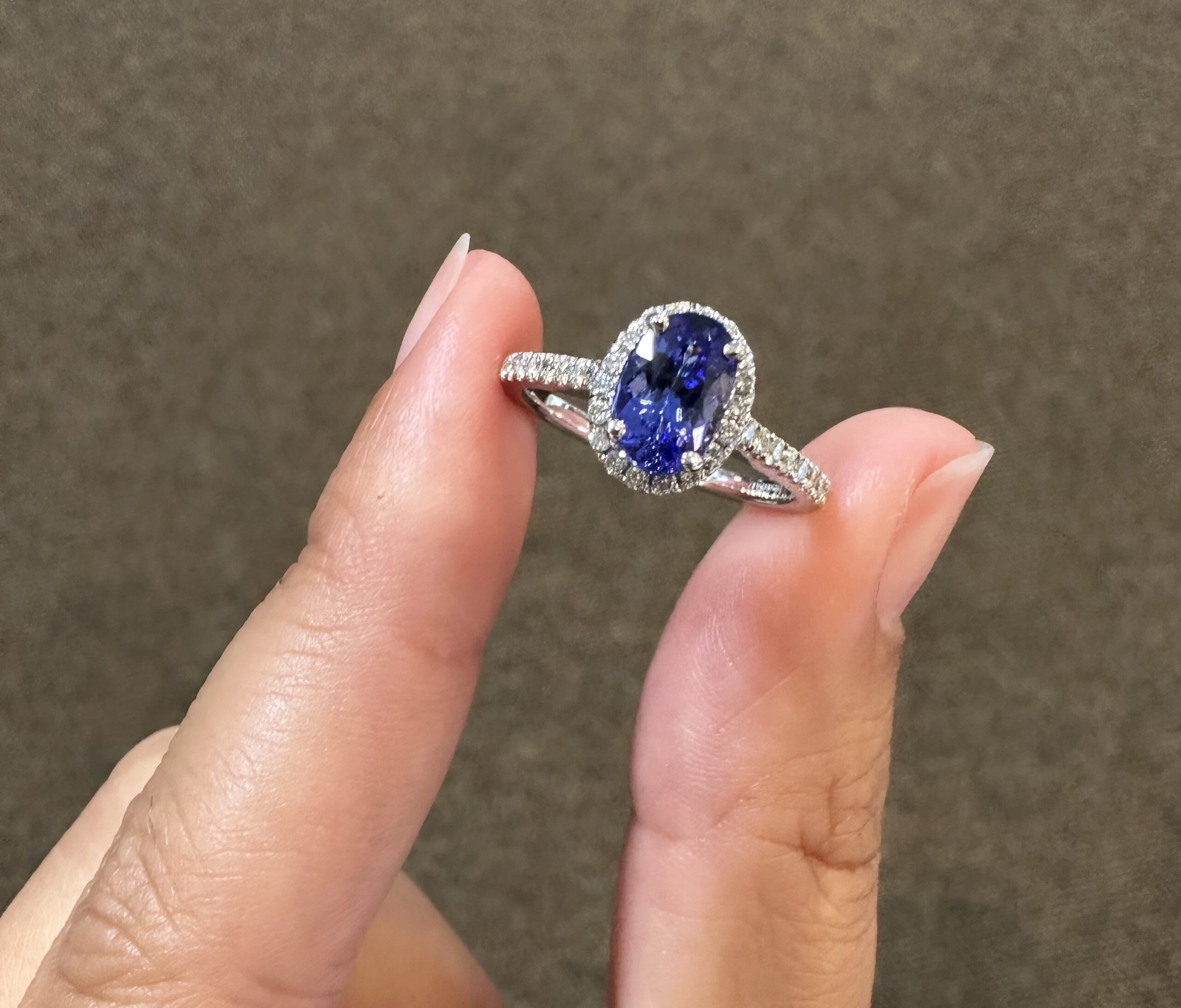 14k white gold genuine oval shaped, 1.07 carat faceted Tanzanite & .27 cttw Round Brilliant Cut diamond halo ring. These diamonds average G-H in color and SI1-SI2 in clarity. These diamonds are nicely proportioned and well finished. This ring has an entire weight of 3.0 grams. This ring is a finger size 6 1/4, but it can be slightly sized. Please make note of the finger size required in the comments section at checkout.