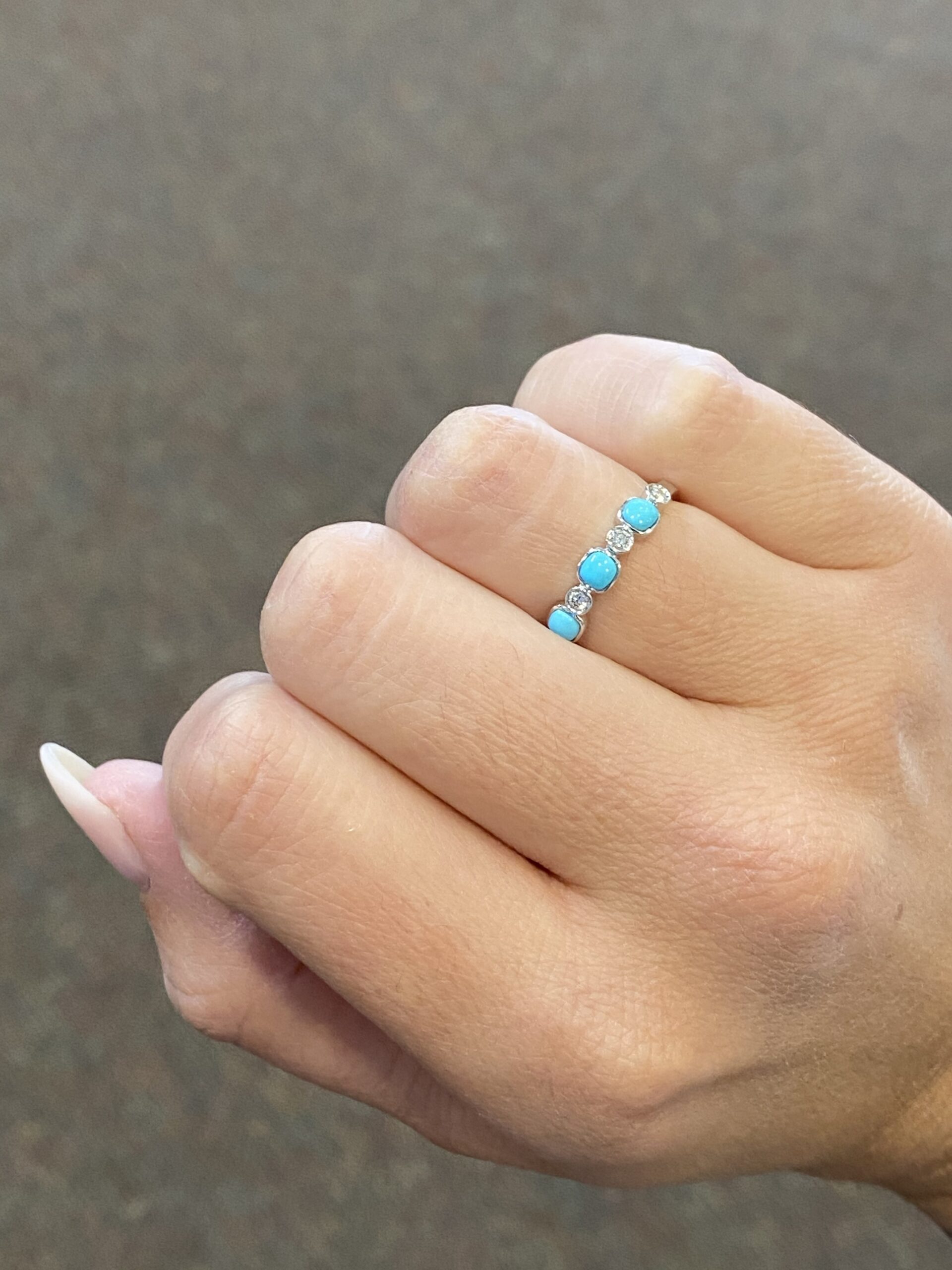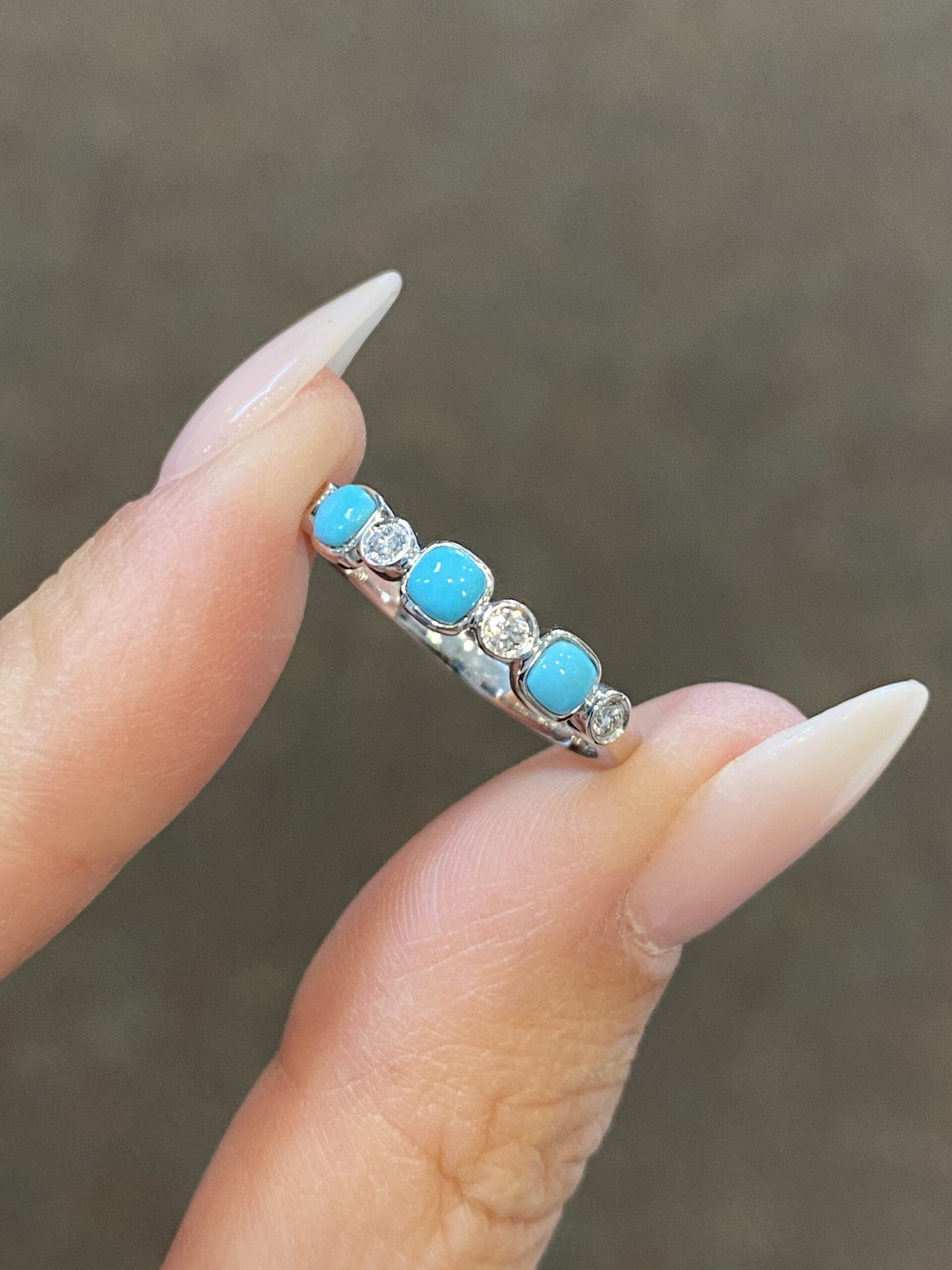 14k white gold bezel set genuine Turquoise & diamond band. This band consists of cushion shaped genuine Turquoise gemstones which have a total combined weight of .44 cttw. These gemstones are set alternately with genuine Round Brilliant Cut diamonds, which have a total combined weight of .10 cttw. These diamonds average G-H in color, and SI1 in clarity. This ring is a stock size 6 1/4, but it can be reasonably sized at no additional charge. If you require a specific size please make note in the comments section at checkout.