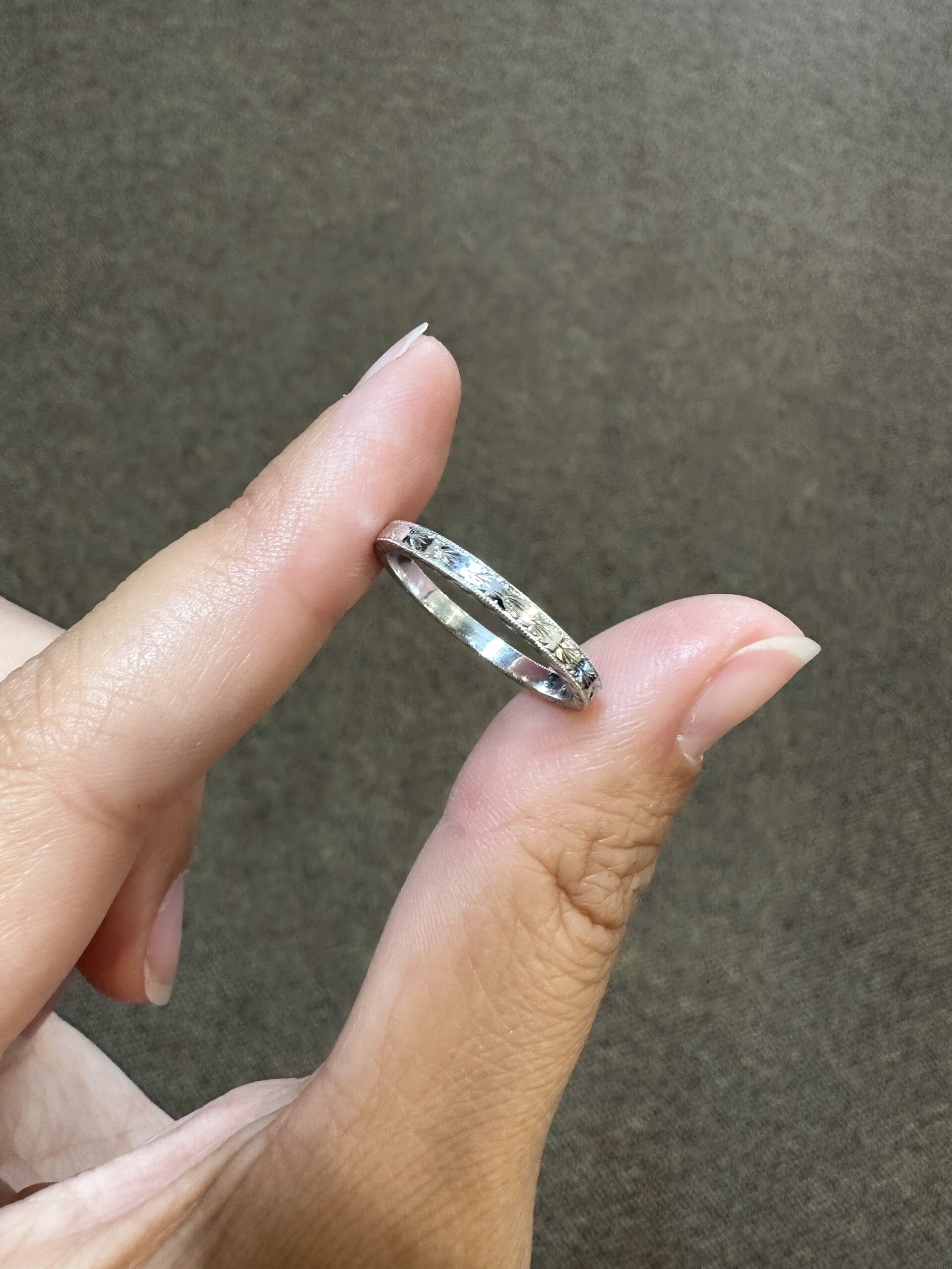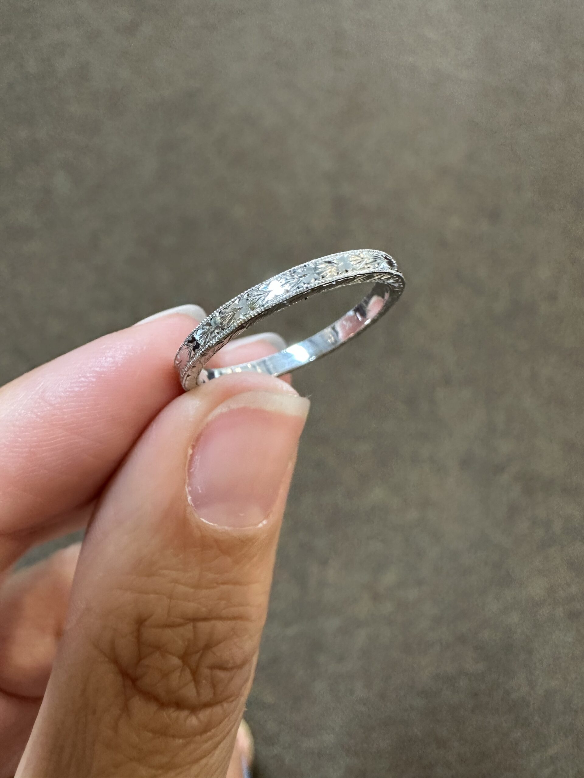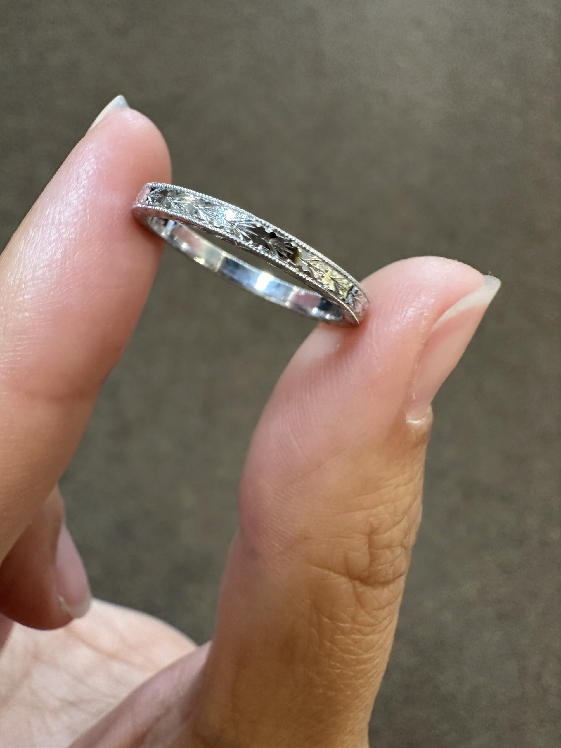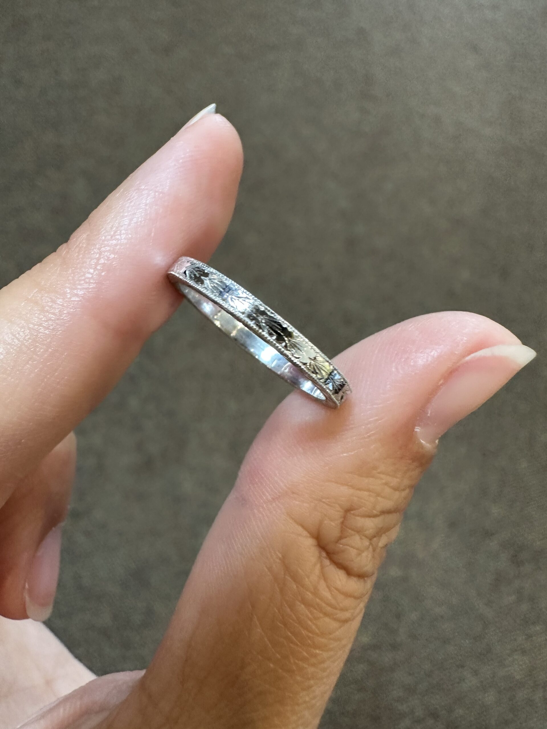 14k white gold 2.3 mm flat band with hand engraving on all three sides. This ring is a finger size 6, but it can be reasonably sized. This ring has an entire weight 2.3 of grams.