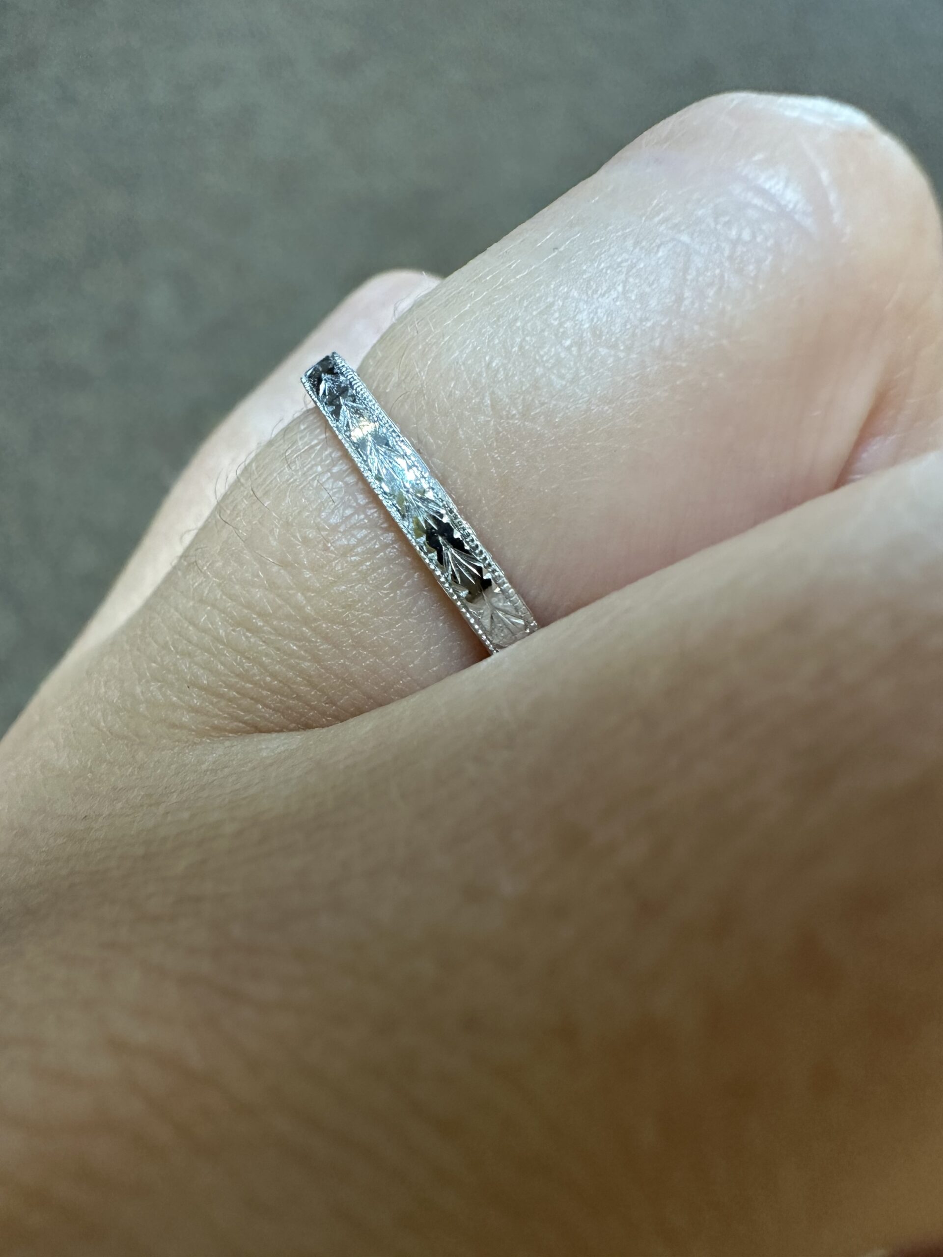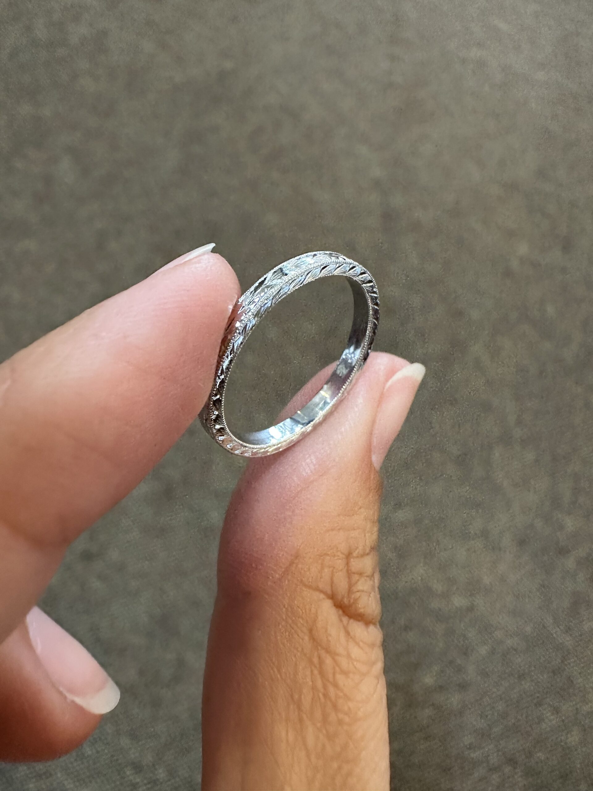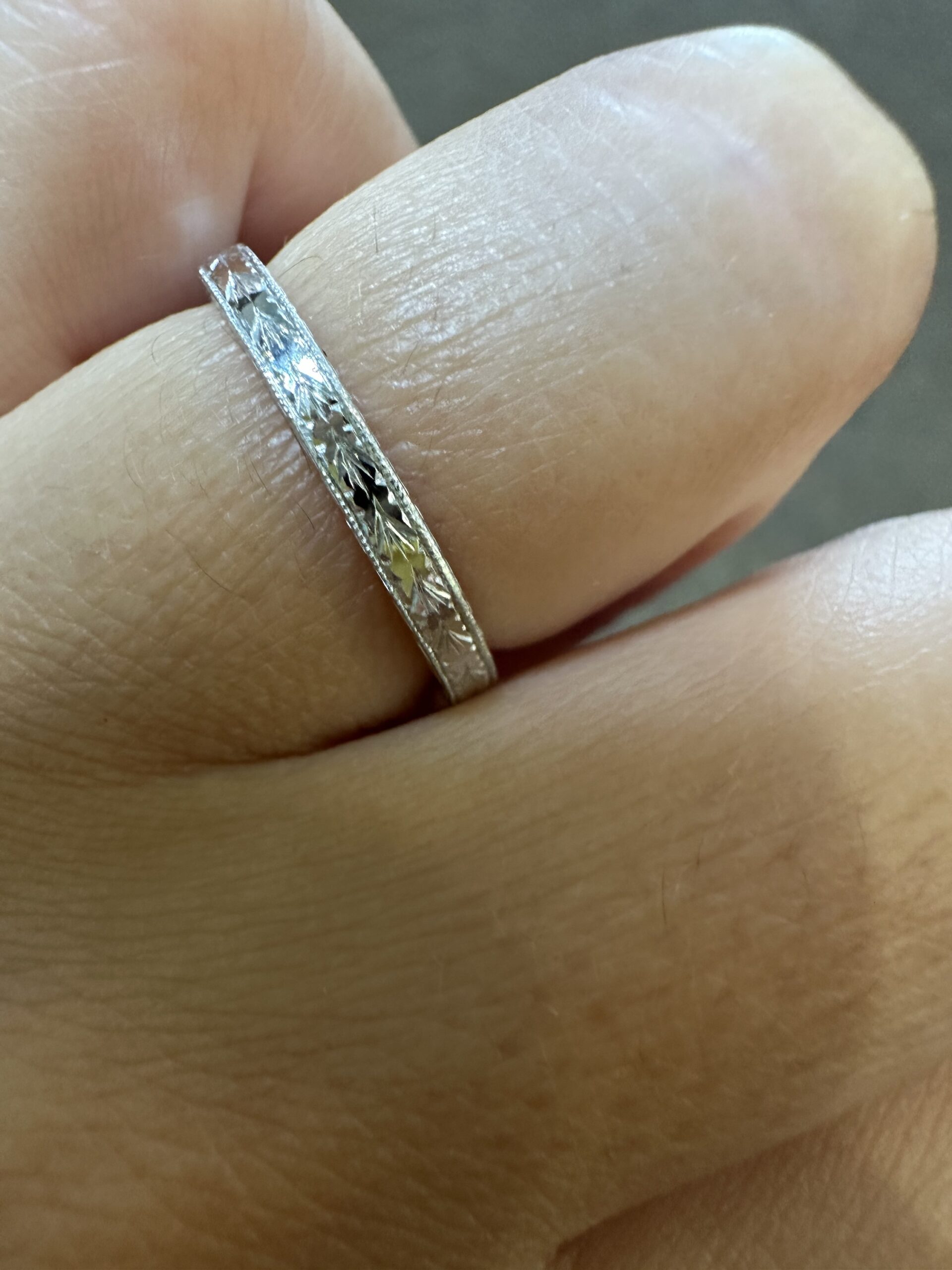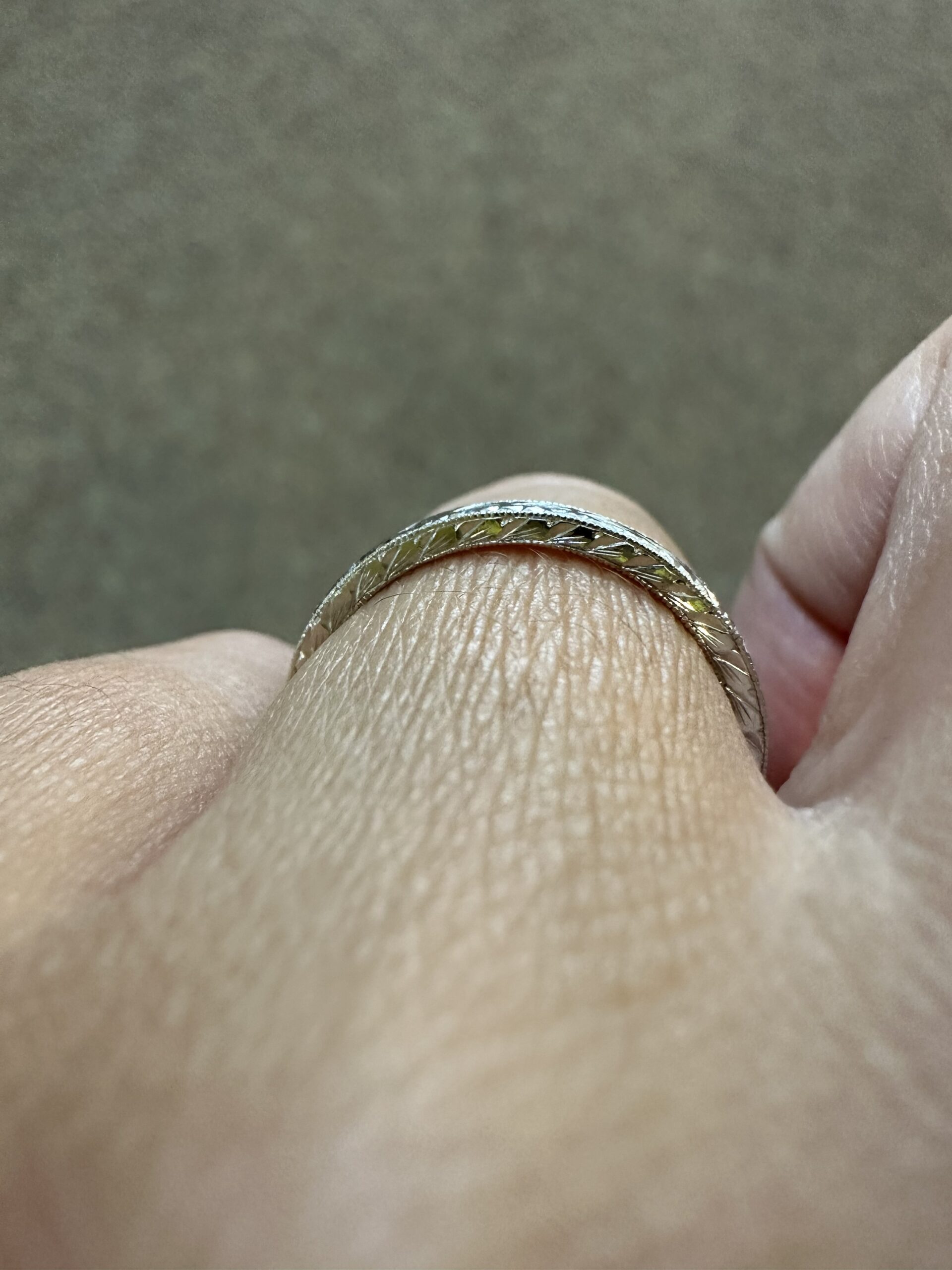 14k white gold 2.3 mm flat band with hand engraving on all three sides. This ring is a finger size 6, but it can be reasonably sized. This ring has an entire weight 2.3 of grams.