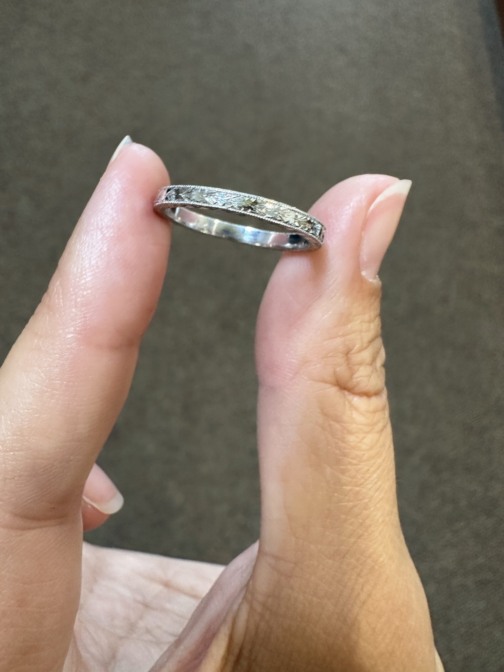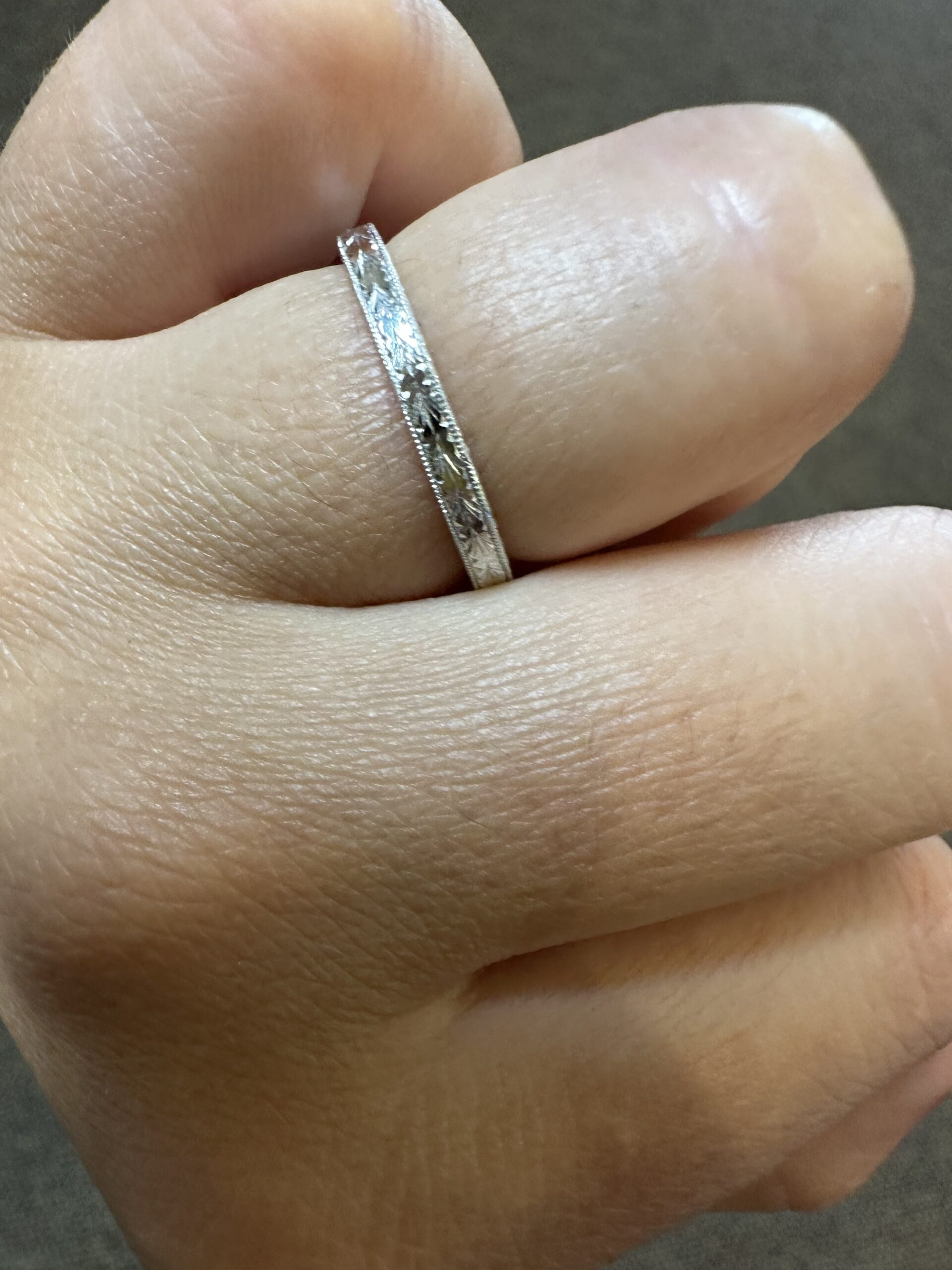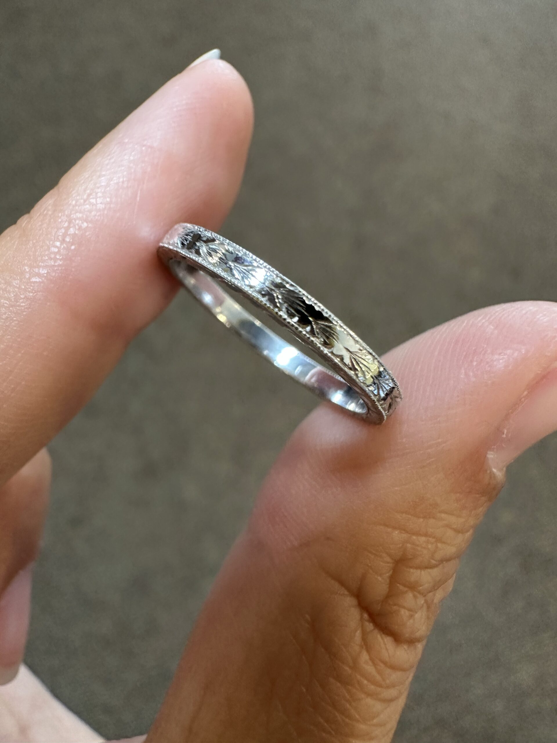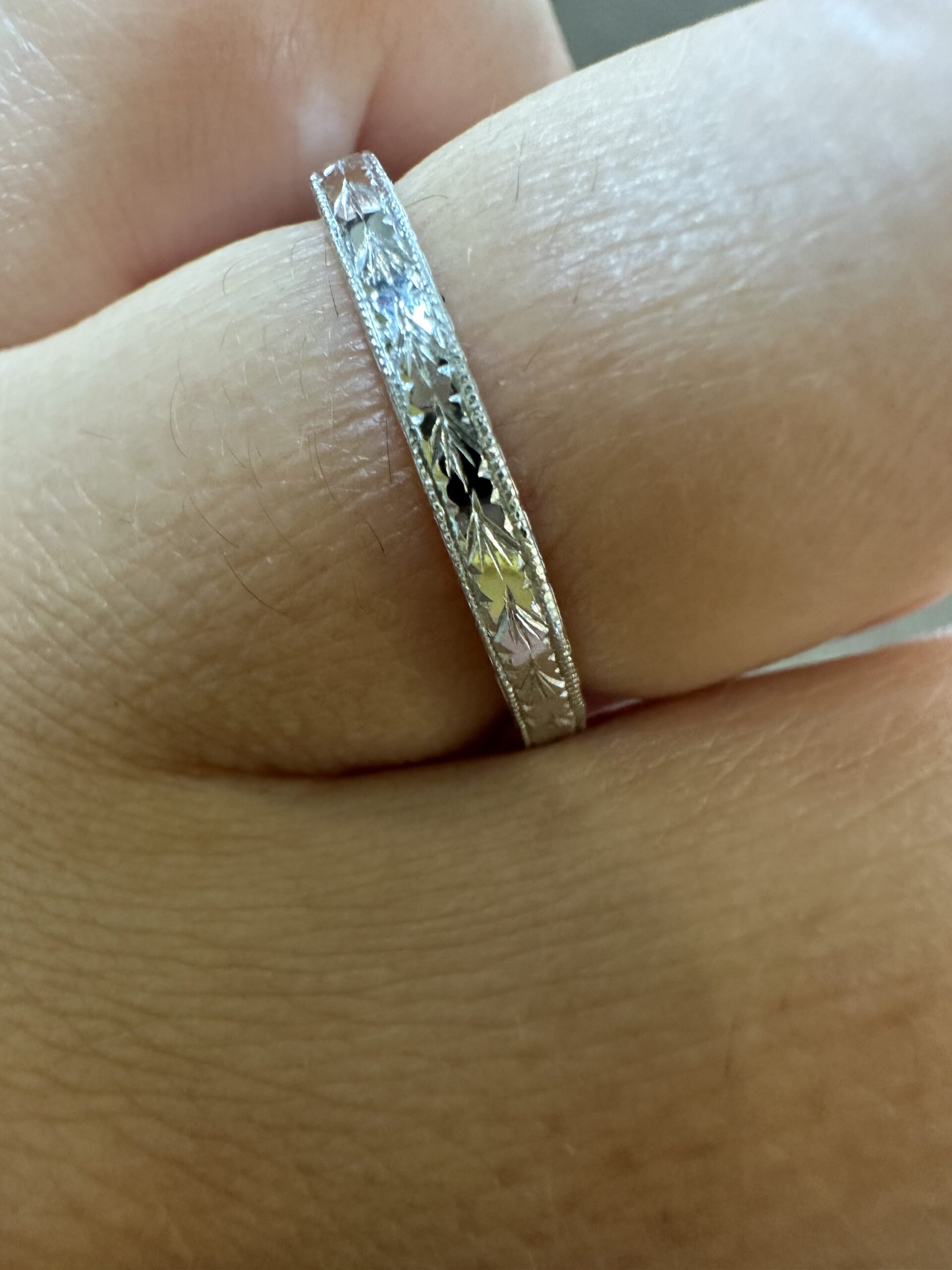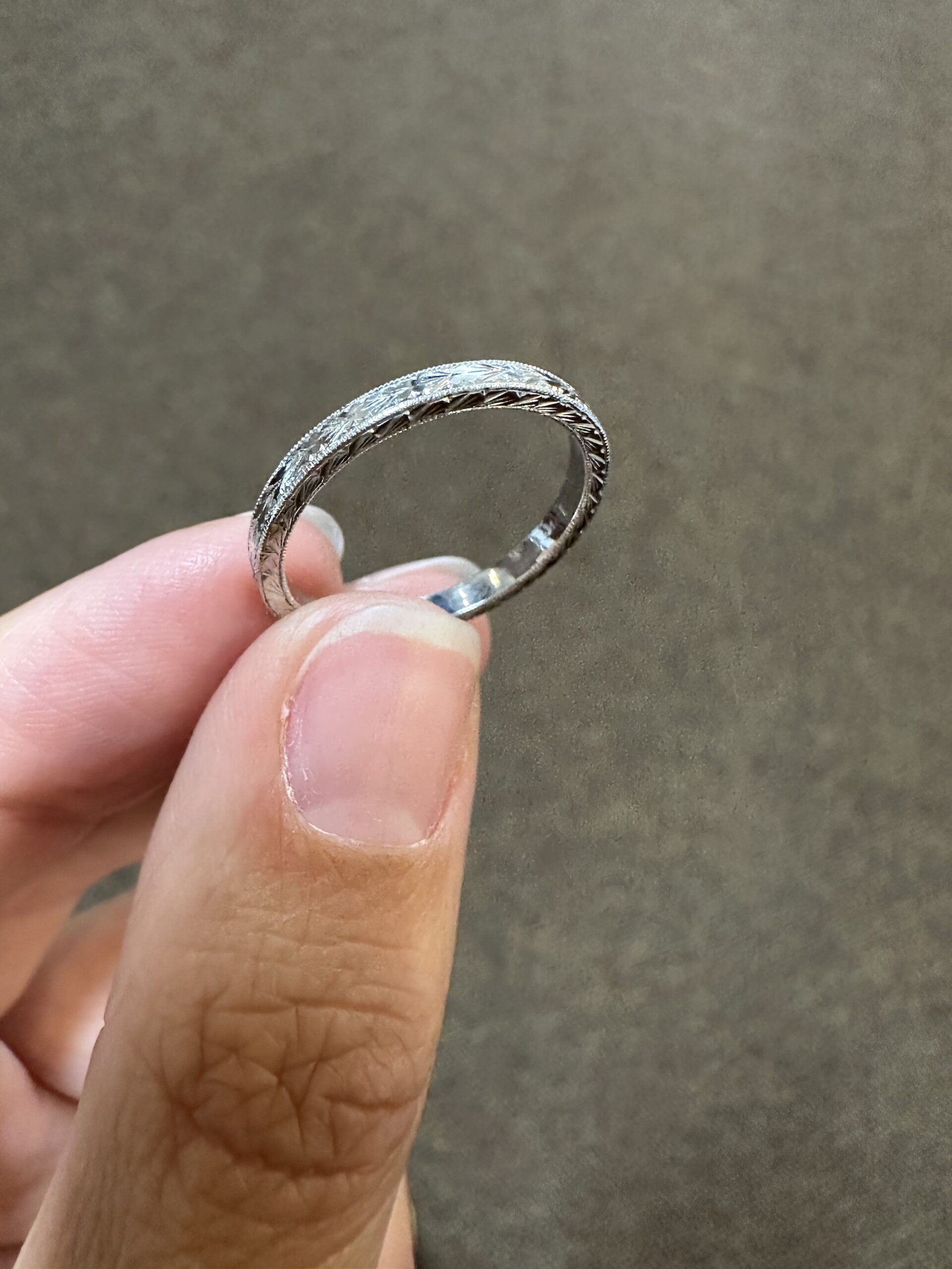 14k white gold 2.3 mm flat band with hand engraving on all three sides. This ring is a finger size 6, but it can be reasonably sized. This ring has an entire weight 2.3 of grams.