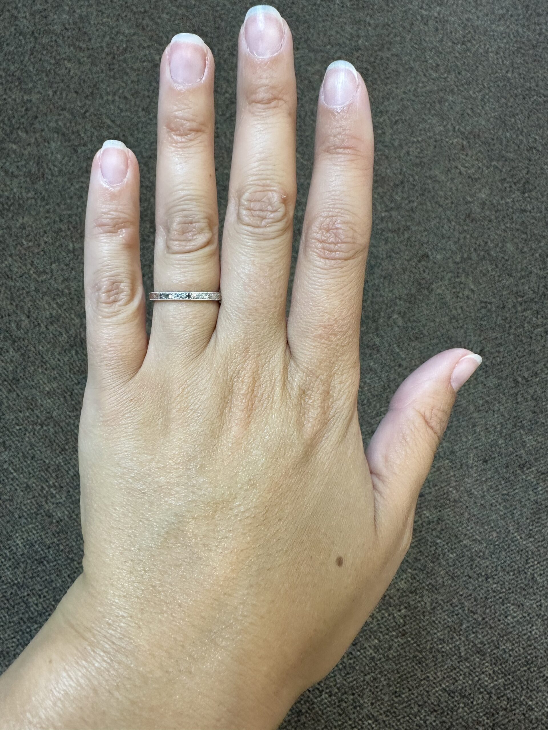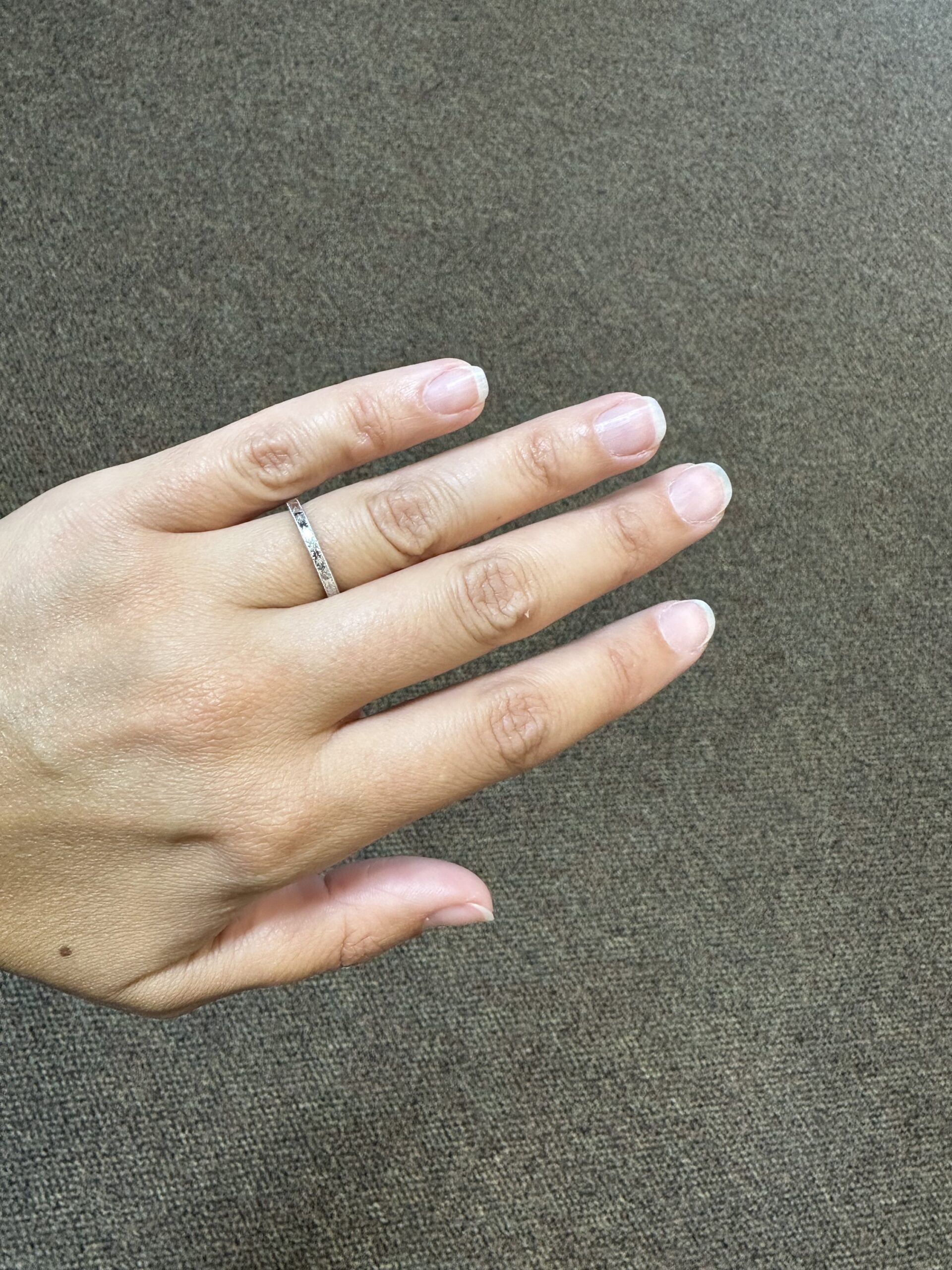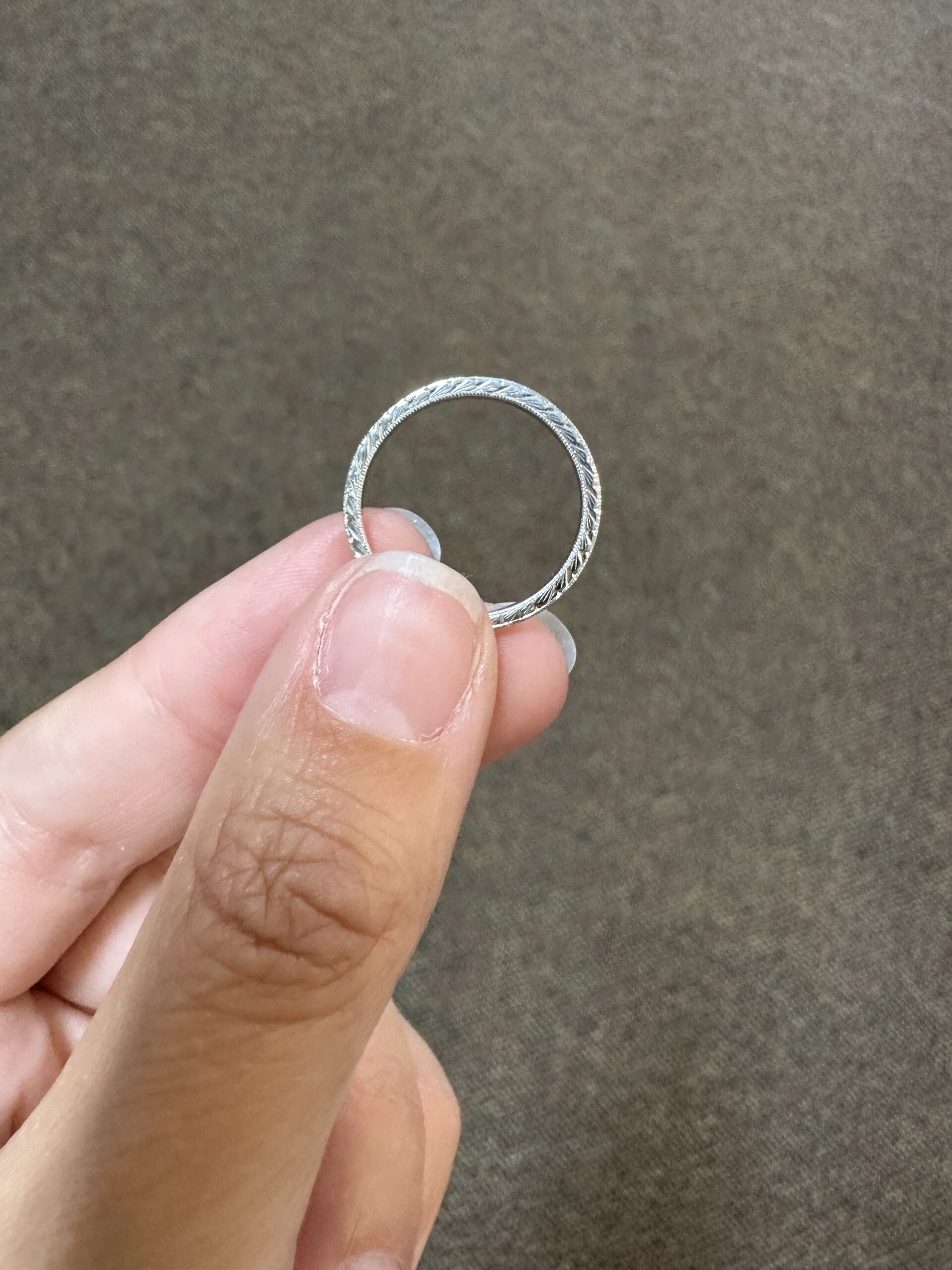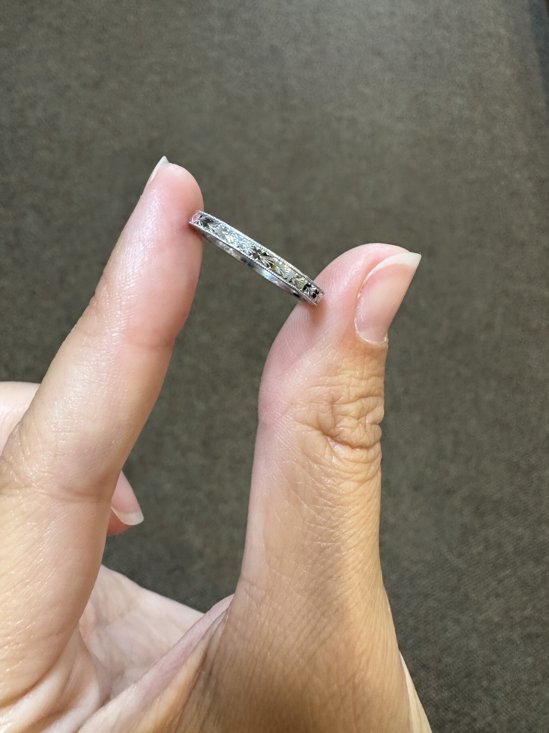 14k white gold 2.3 mm flat band with hand engraving on all three sides. This ring is a finger size 6, but it can be reasonably sized. This ring has an entire weight 2.3 of grams.