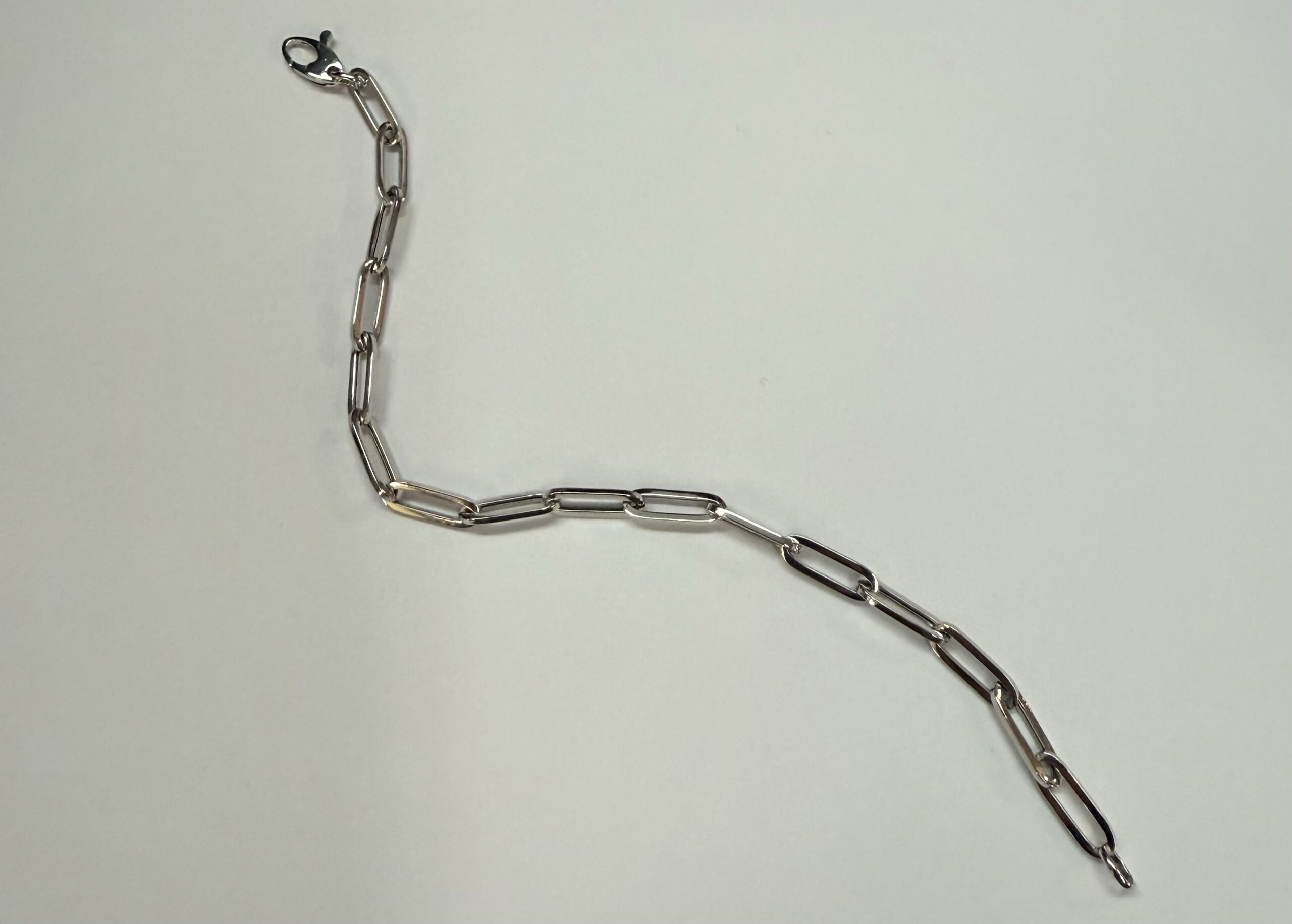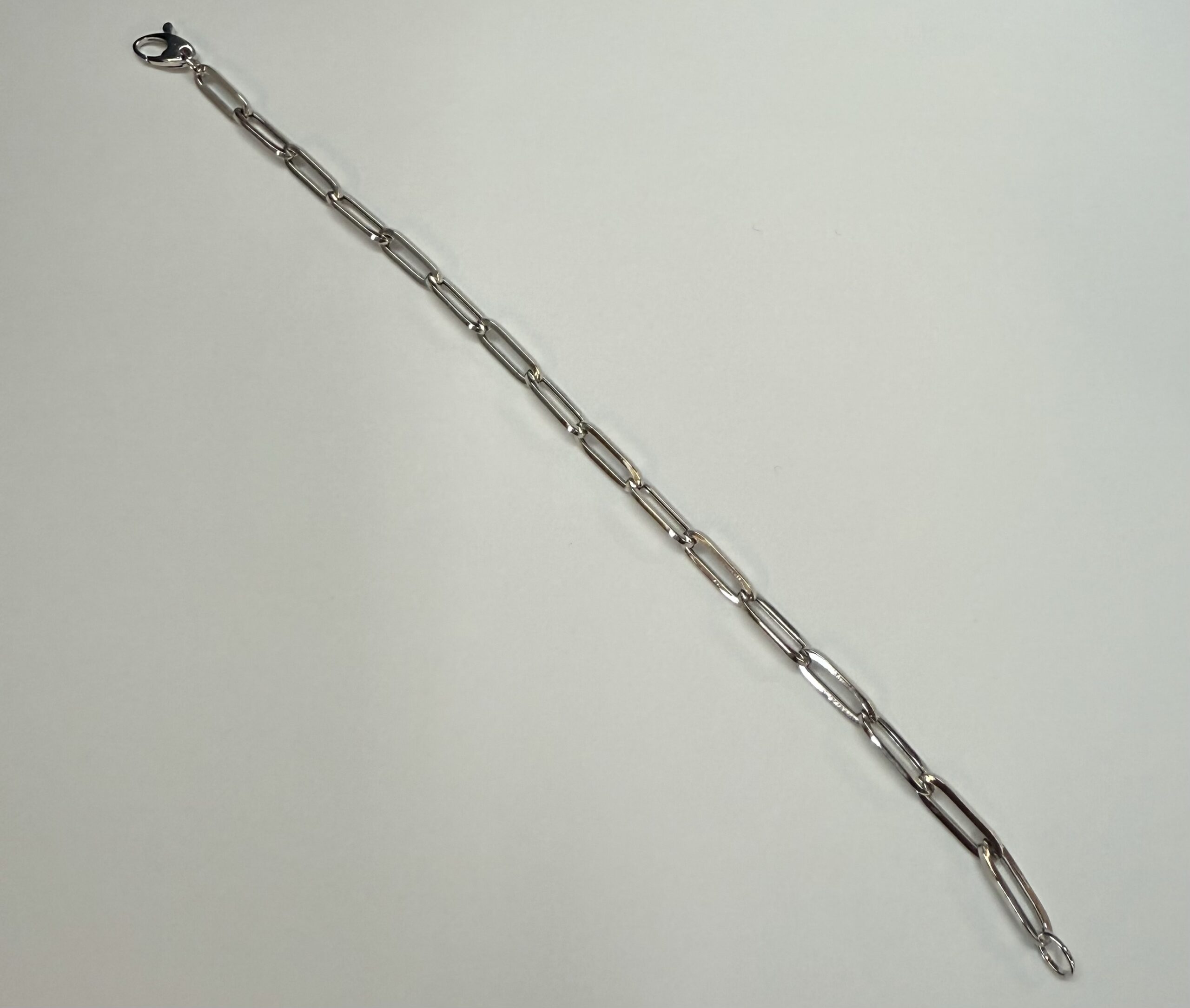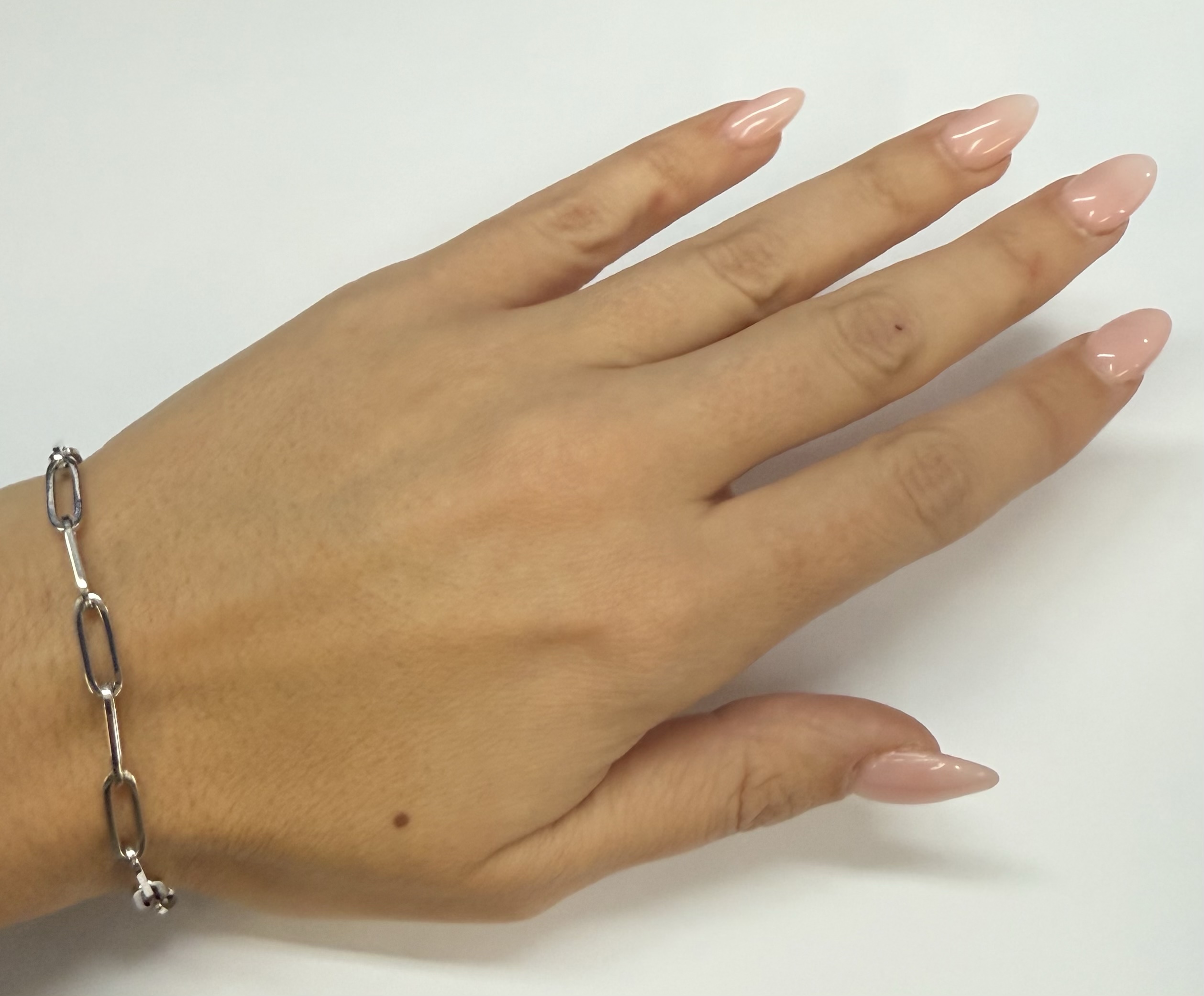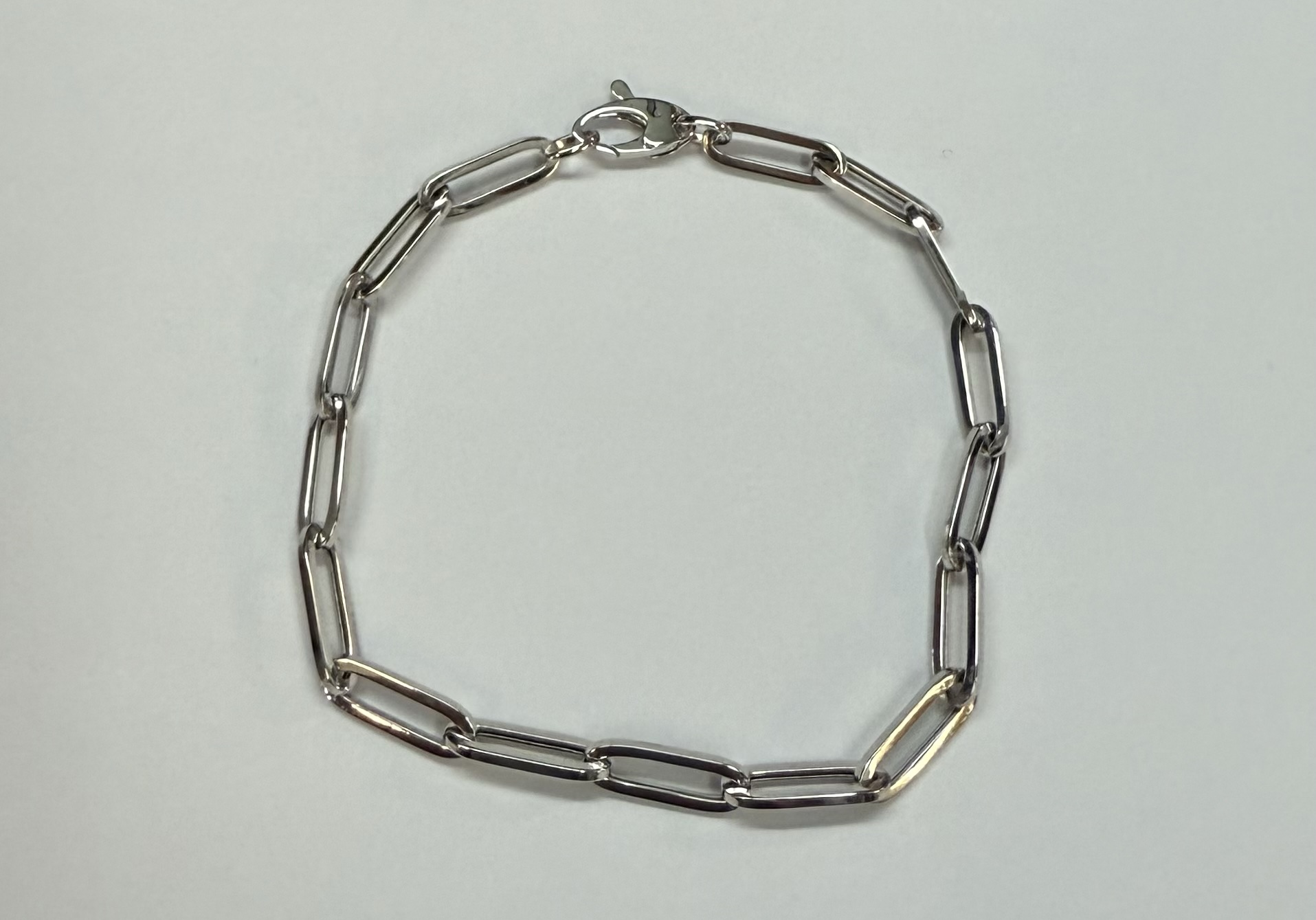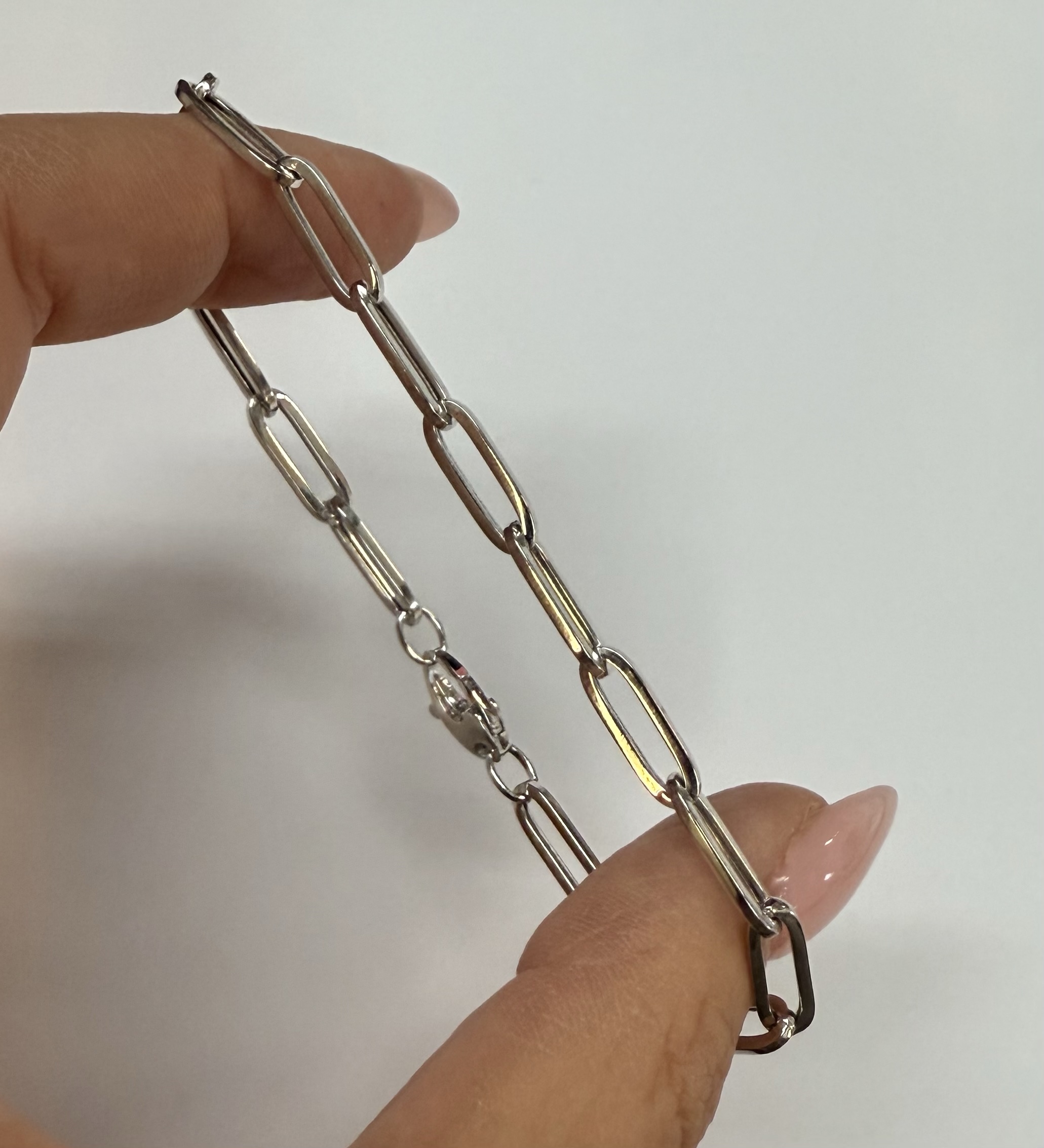 14k white gold 7″ paperclip link bracelet with a lobster claw clasp. This bracelet has an entire weight of 2.2 grams.