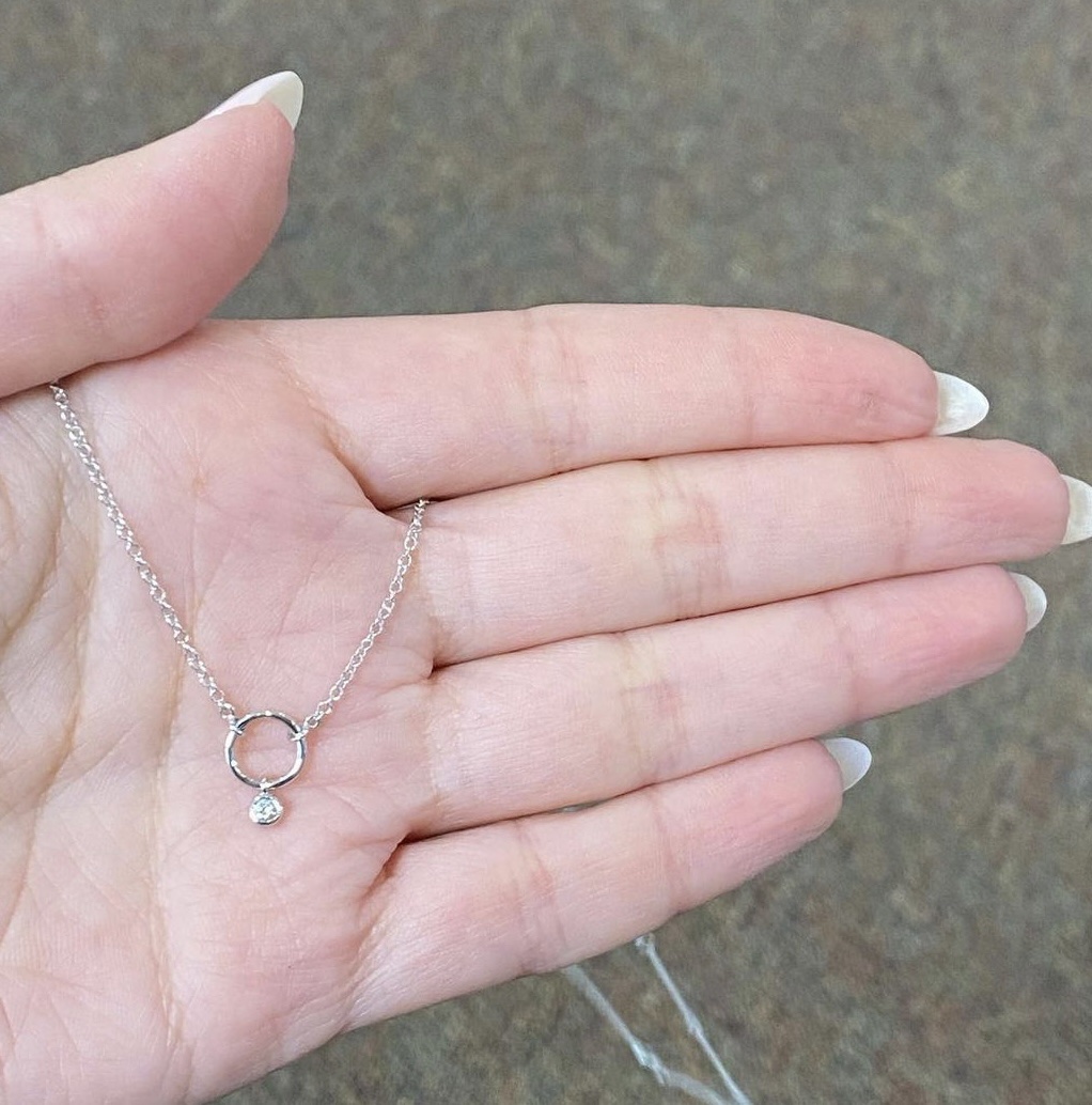 14k white gold open circle bezel set genuine .05 cttw Round Brilliant Cut diamond dangle pendant on and adjustable 16-18″ 14k white gold chain. This diamond has a color grade of H-I, and a clarity grade of SI.