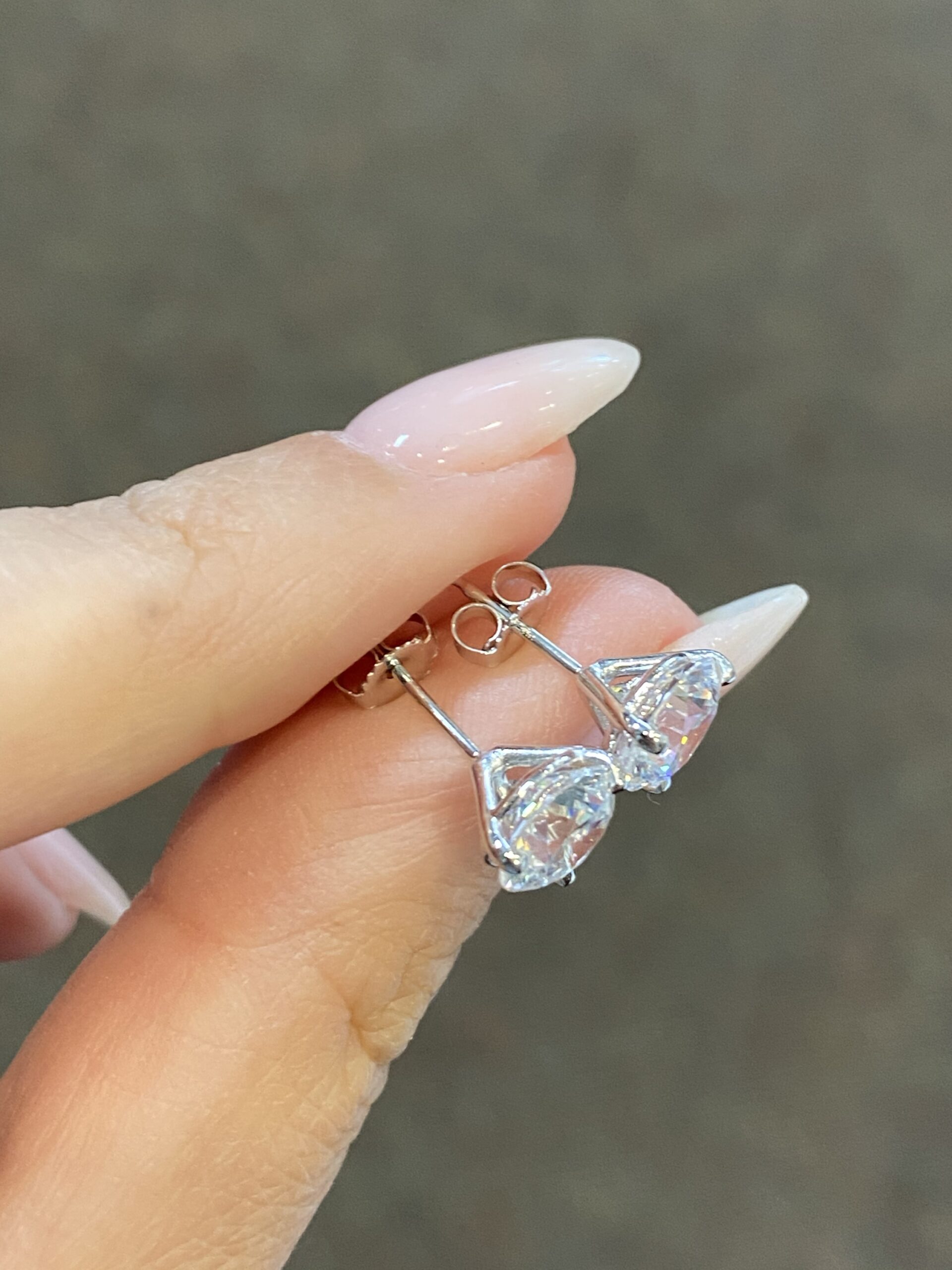 14k white (or yellow gold) 7.5 mm CZ (3 CTTW) 3 prong martini style stud earrings. Please specify in the comments section at checkout if you prefer 14k white gold or 14k yellow gold.